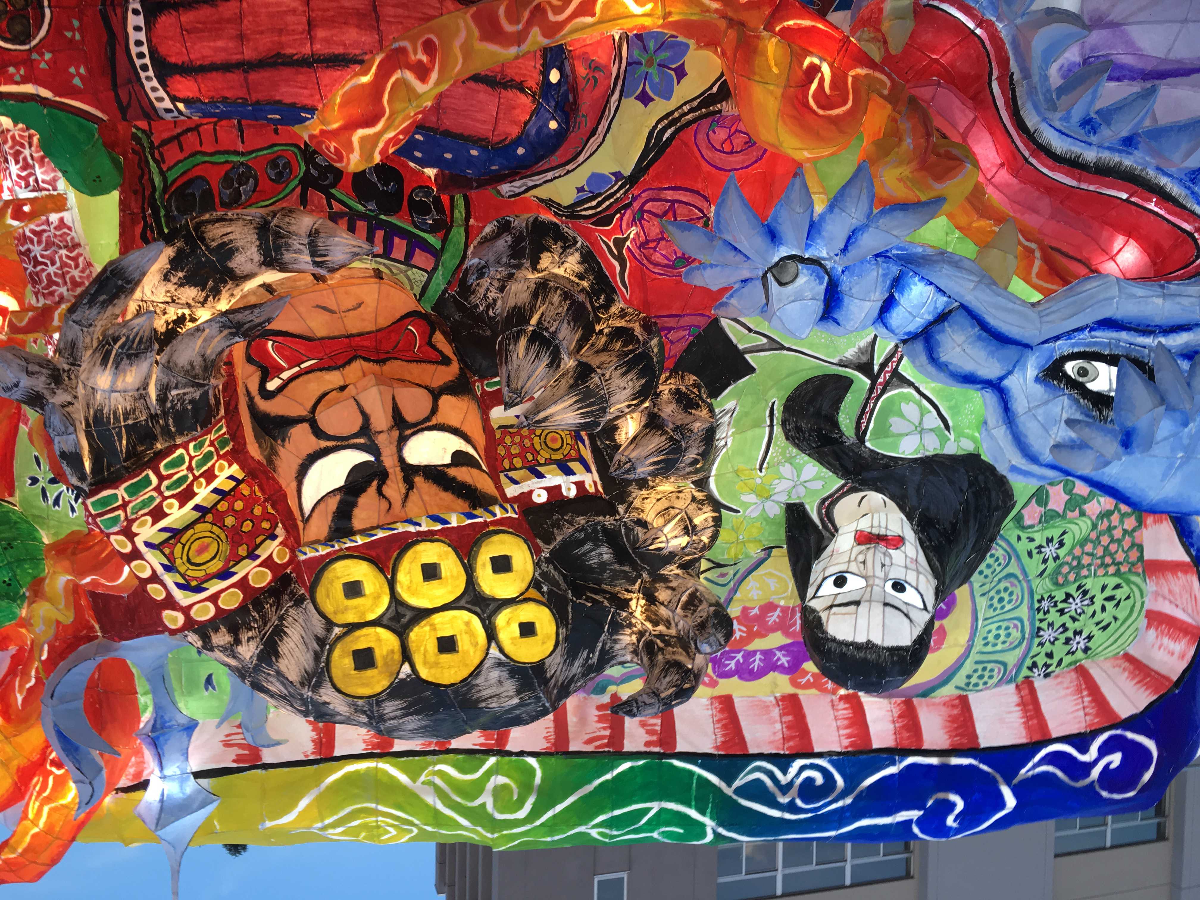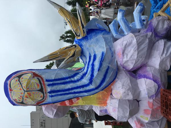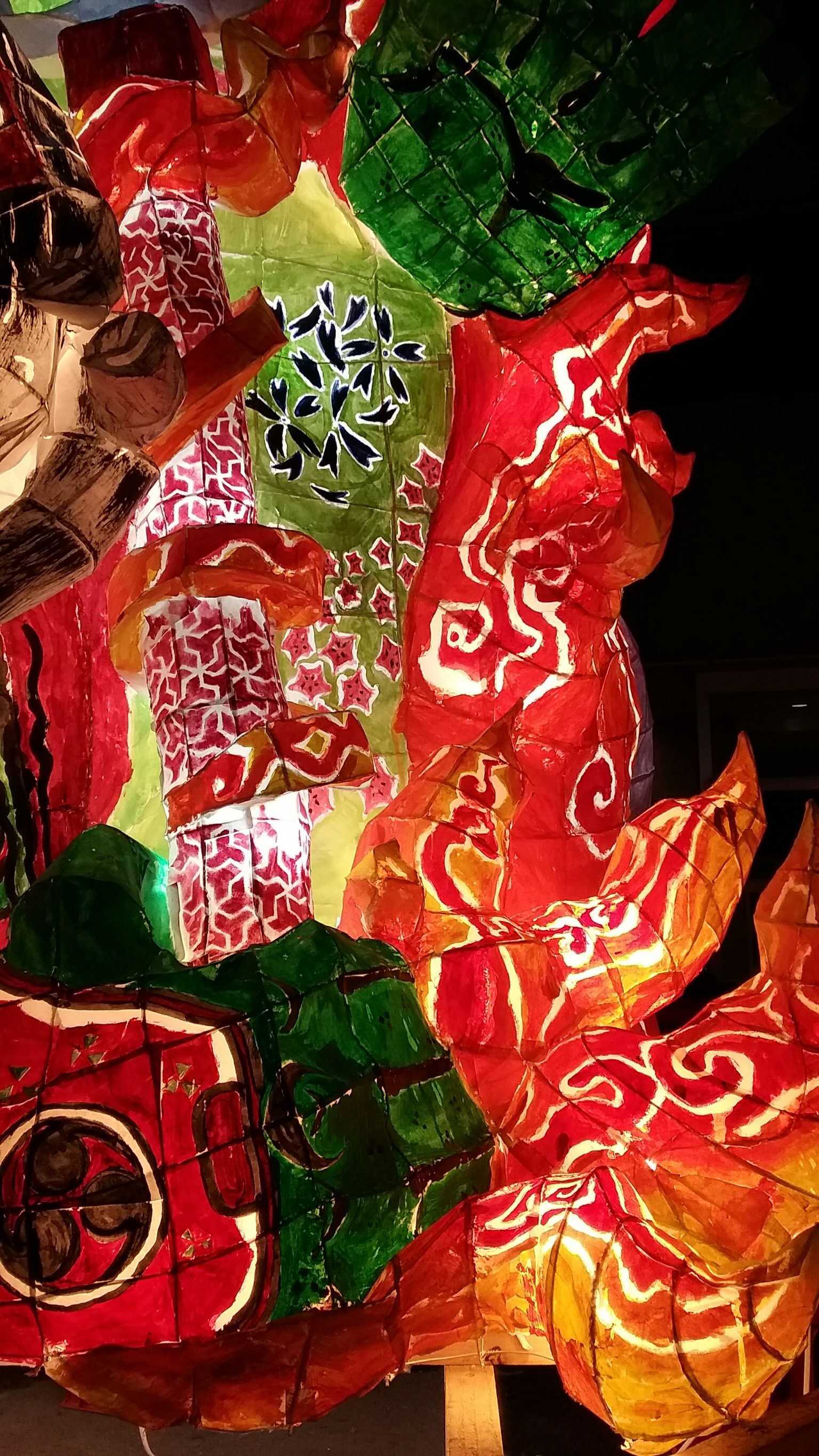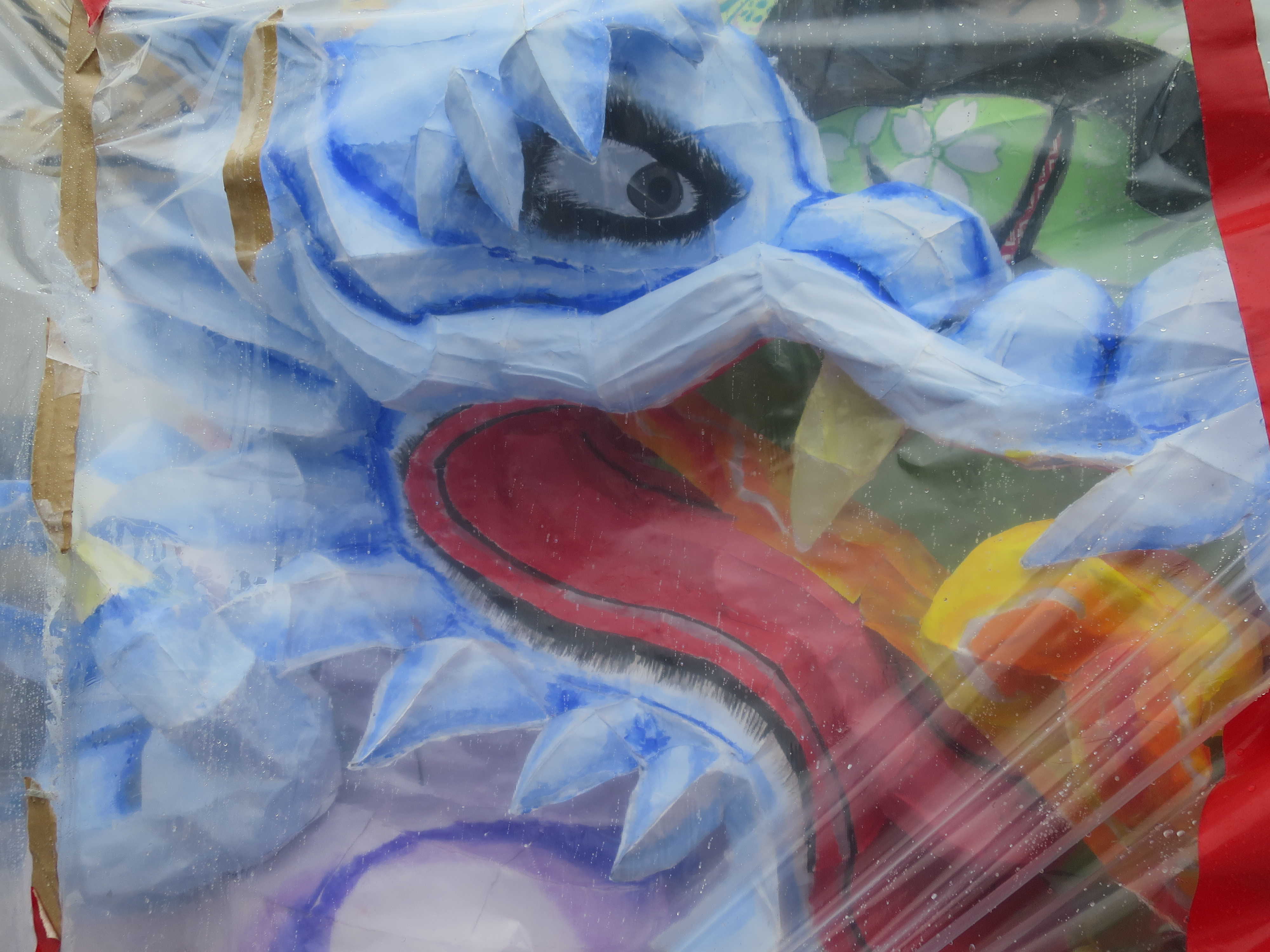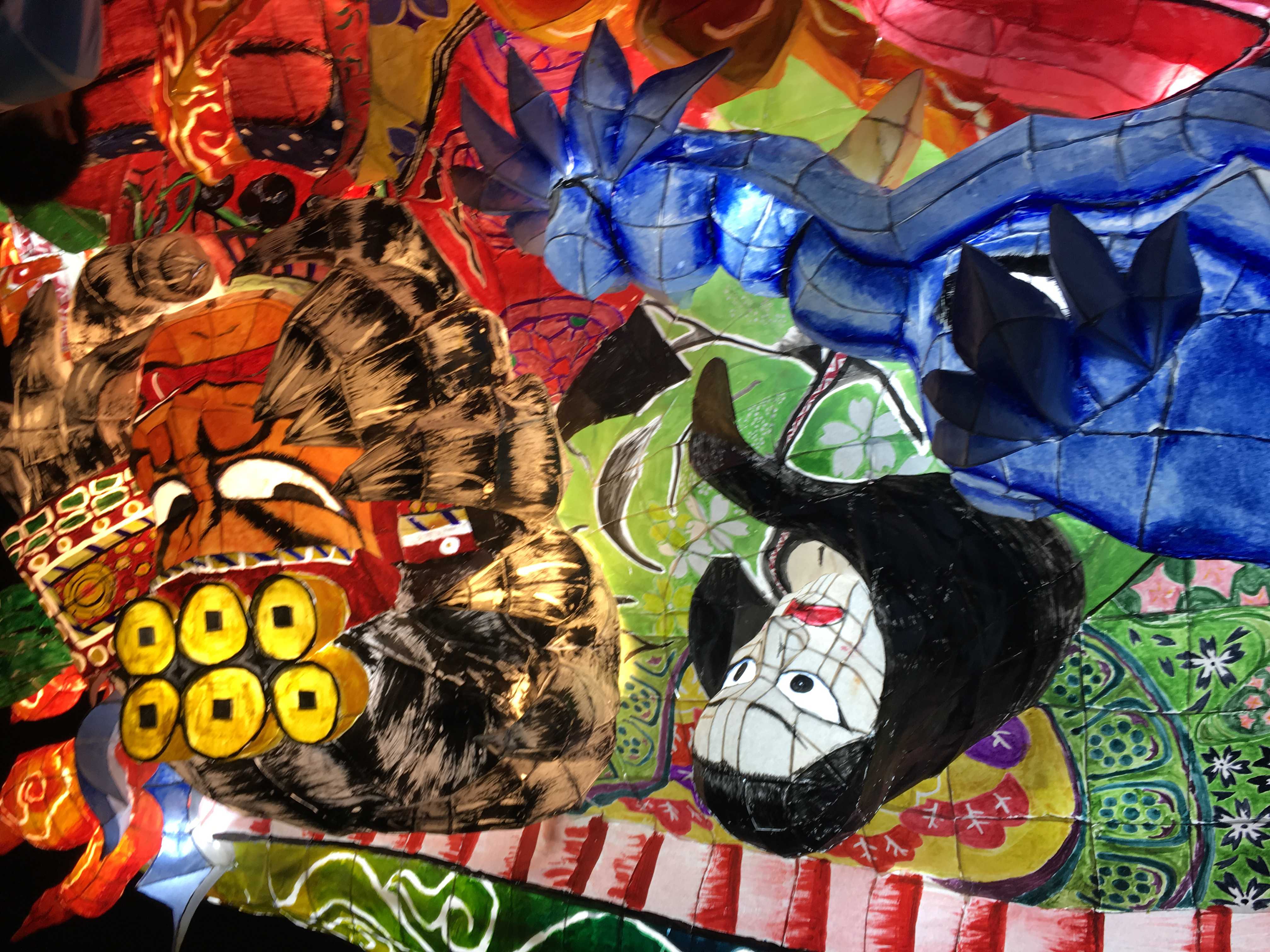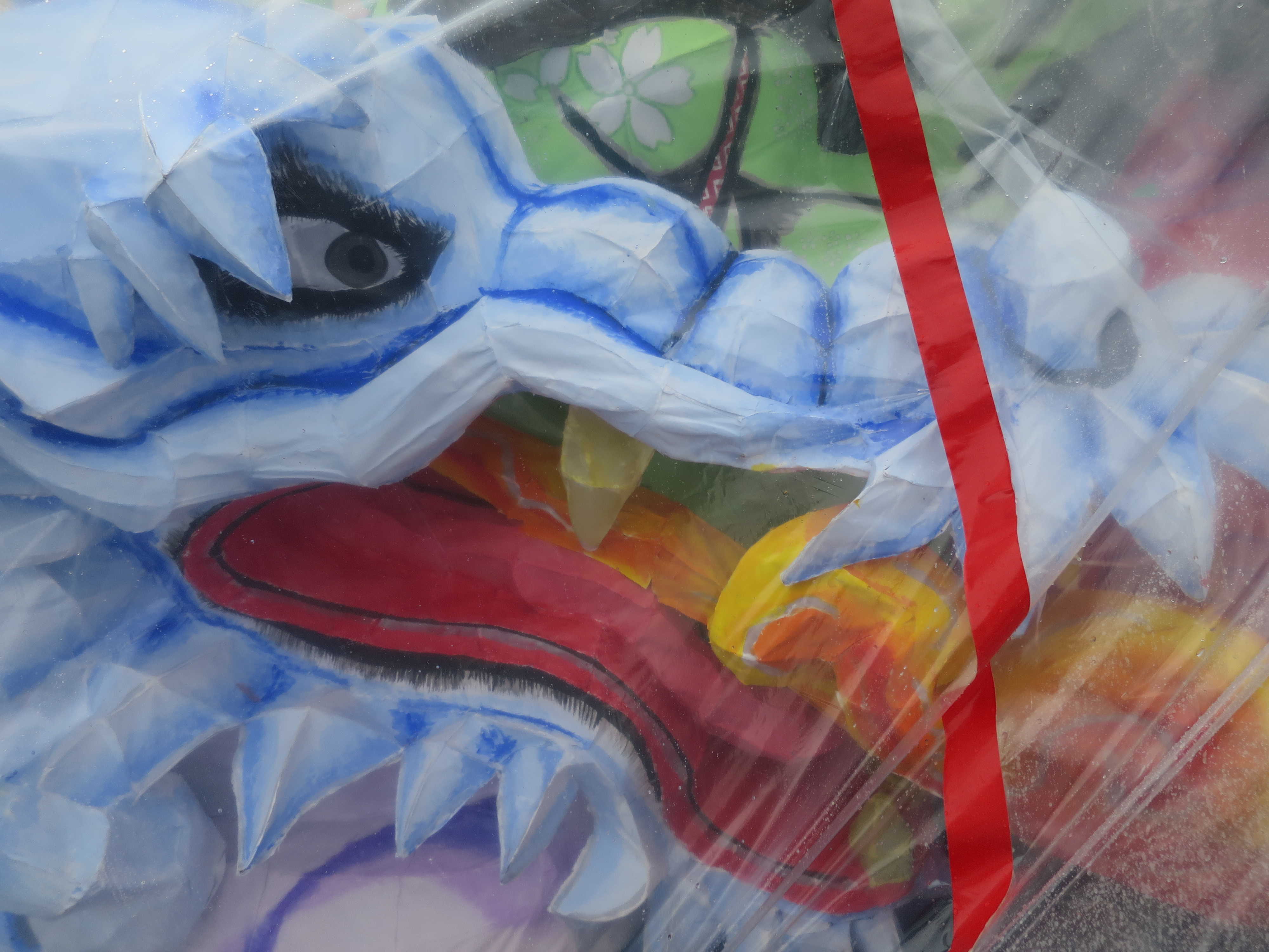 次に龍!北高行灯の中では最高の龍なのでは?という感想です。私のクラスの龍と作り方や塗り方など似ていますが (参考にしていただいたと聞きました)、こちらのほうが全然いいです笑 大きさのバランスもよく針金も丁寧ですし、色塗りもいい (随所にロウが引かれていてみずみずしさを感じます) し電飾もいいです。素晴らしい。
