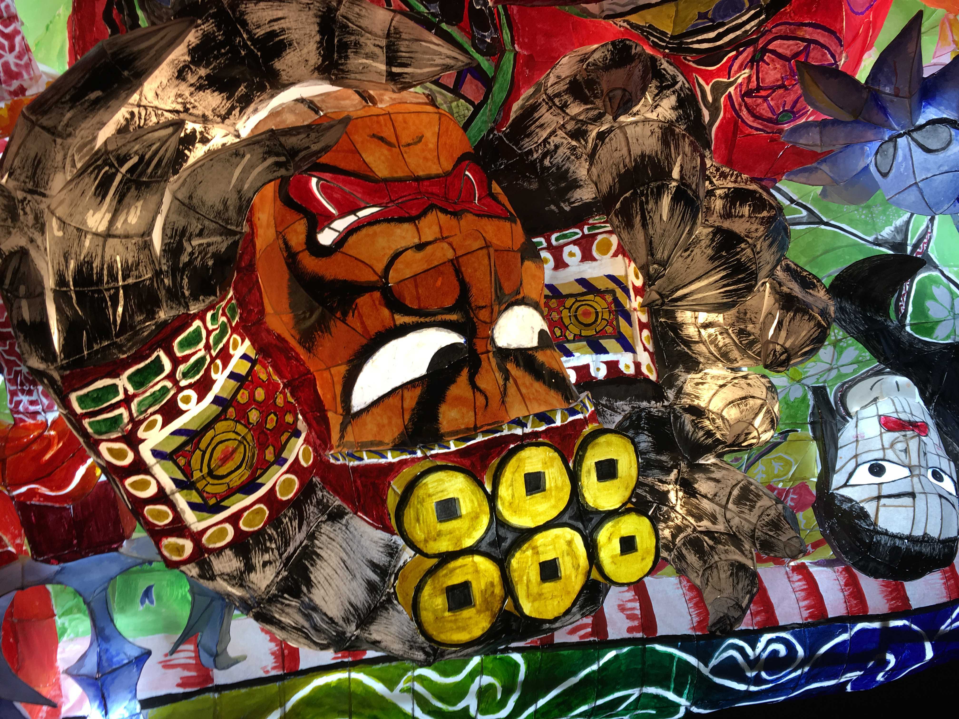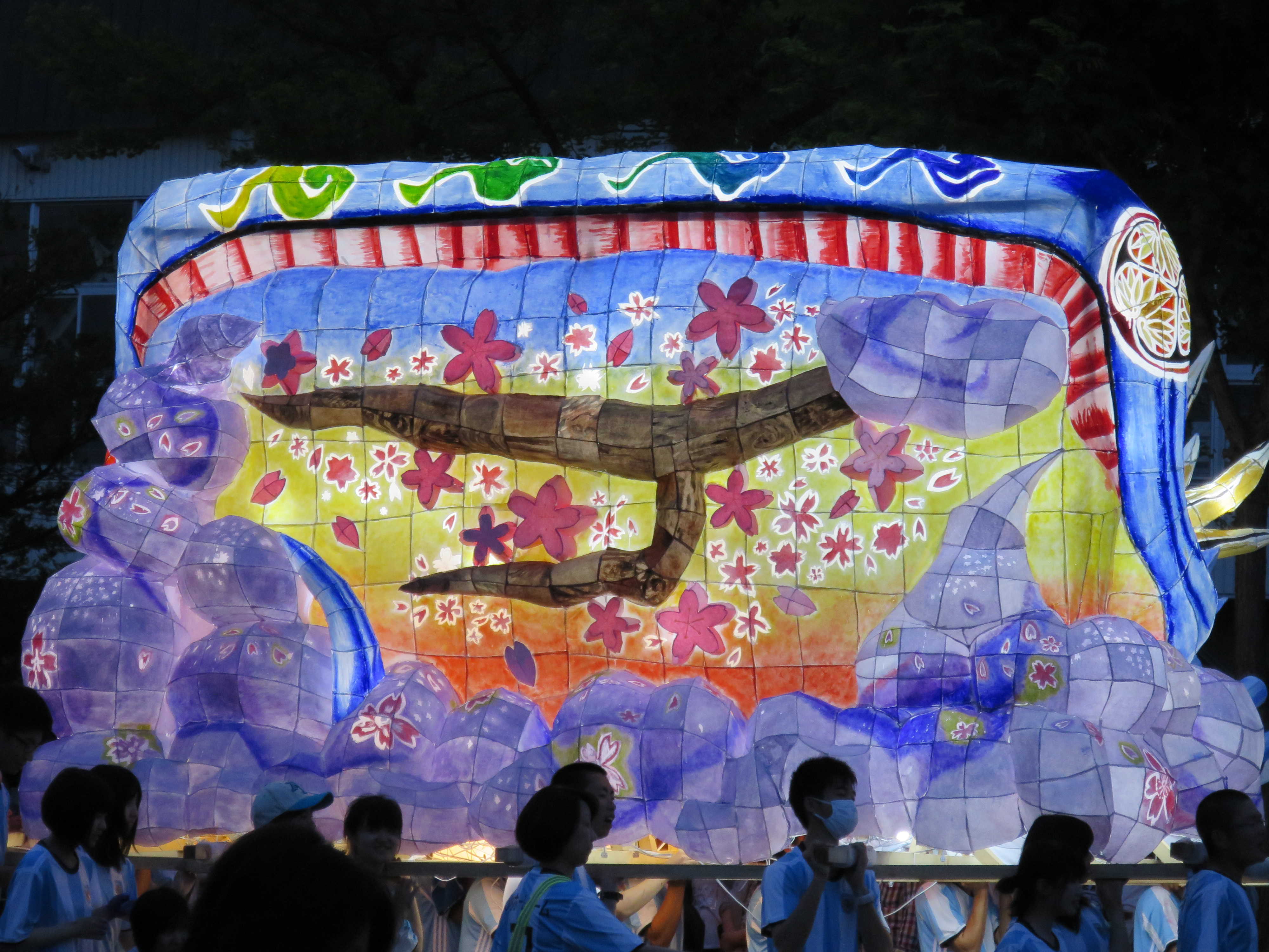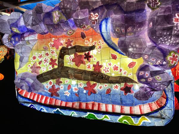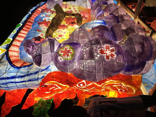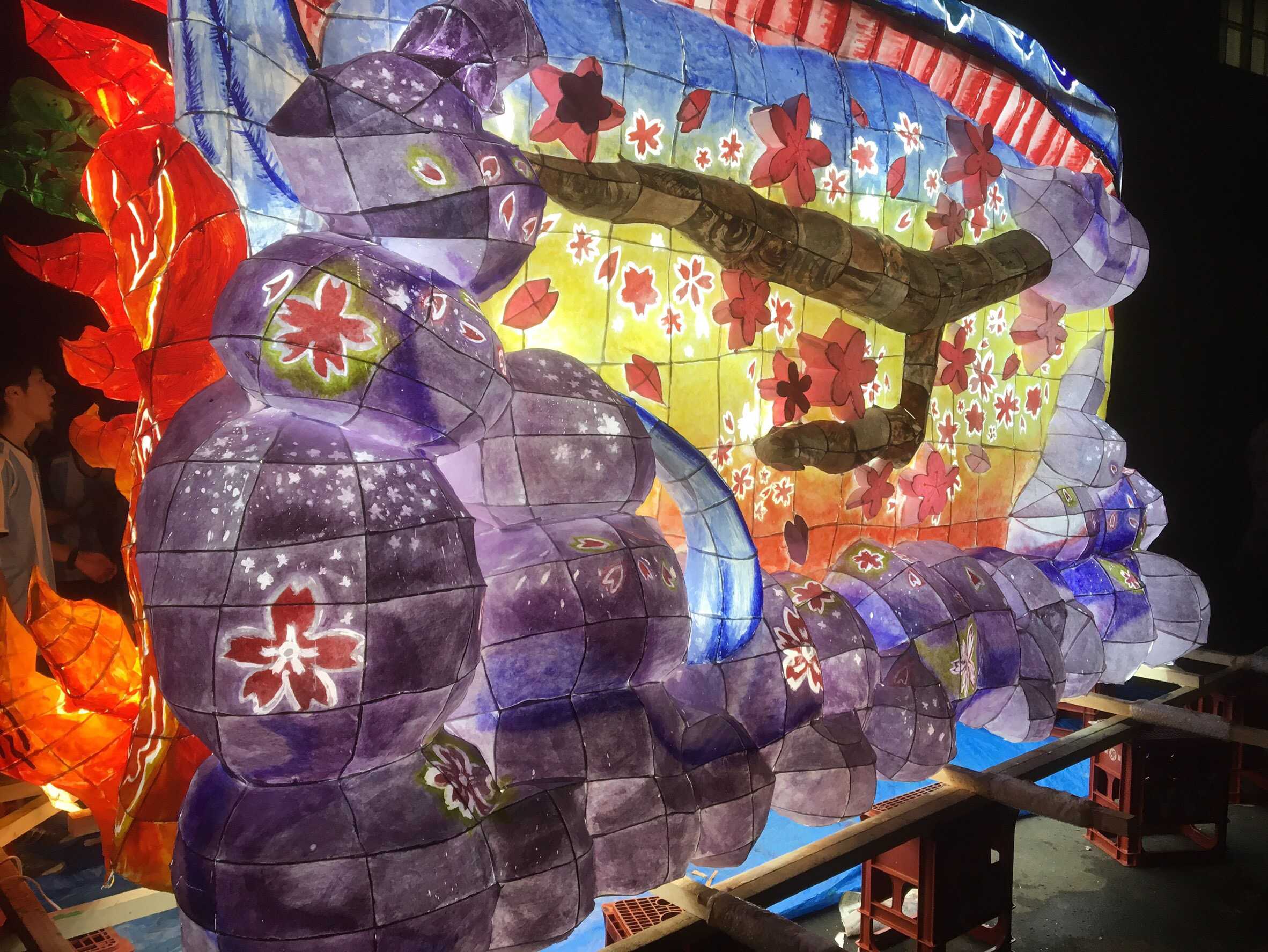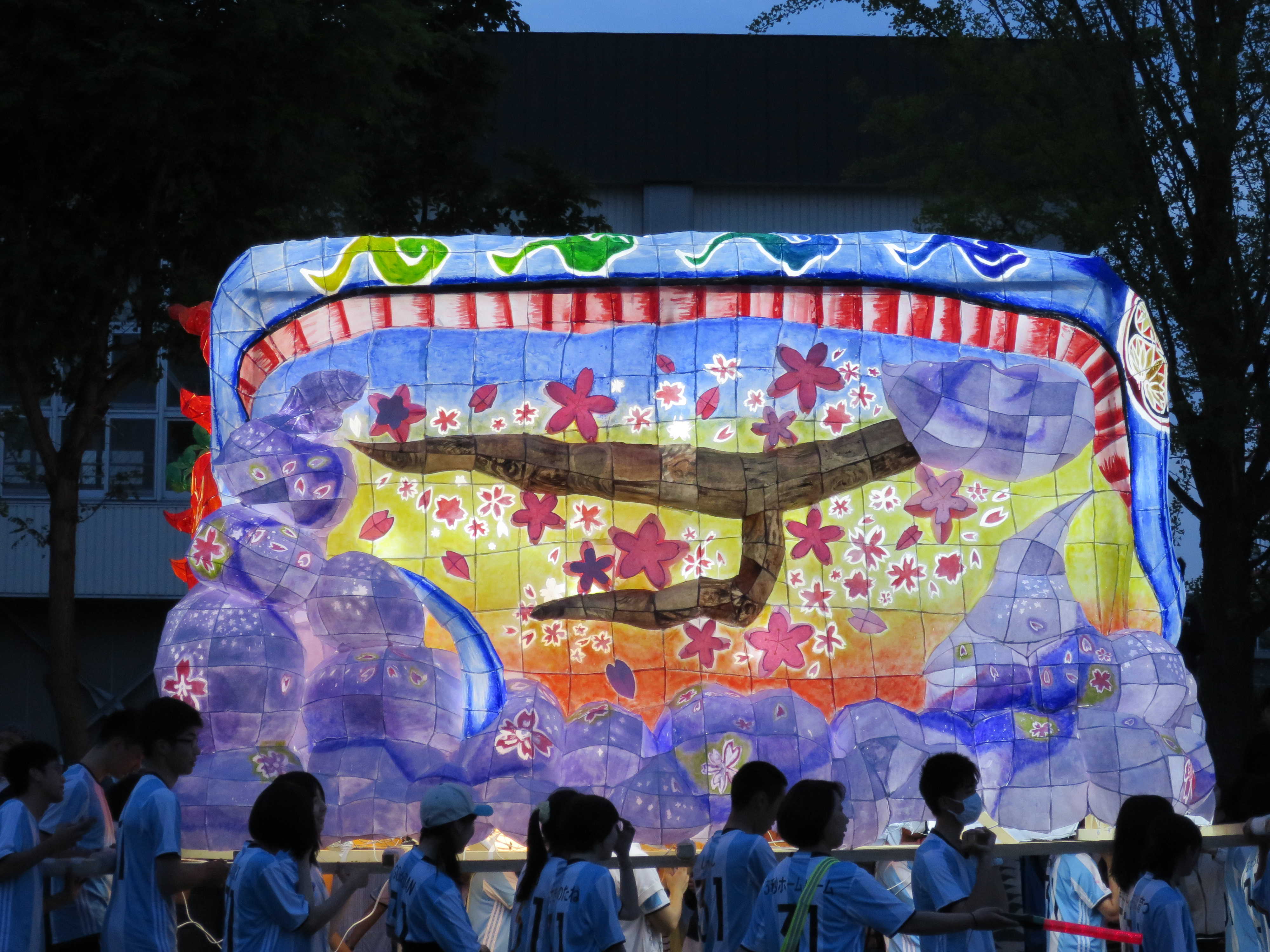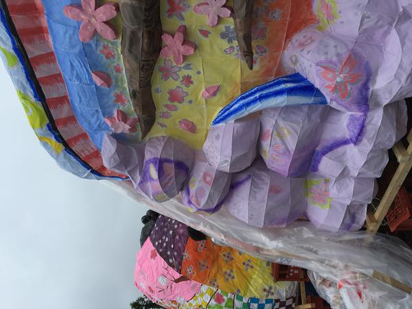 次に龍!北高行灯の中では最高の龍なのでは?という感想です。私のクラスの龍と作り方や塗り方など似ていますが (参考にしていただいたと聞きました)、こちらのほうが全然いいです笑 大きさのバランスもよく針金も丁寧ですし、色塗りもいい (随所にロウが引かれていてみずみずしさを感じます) し電飾もいいです。素晴らしい。