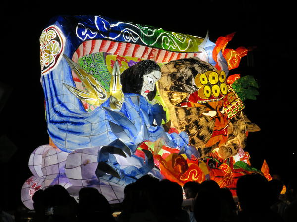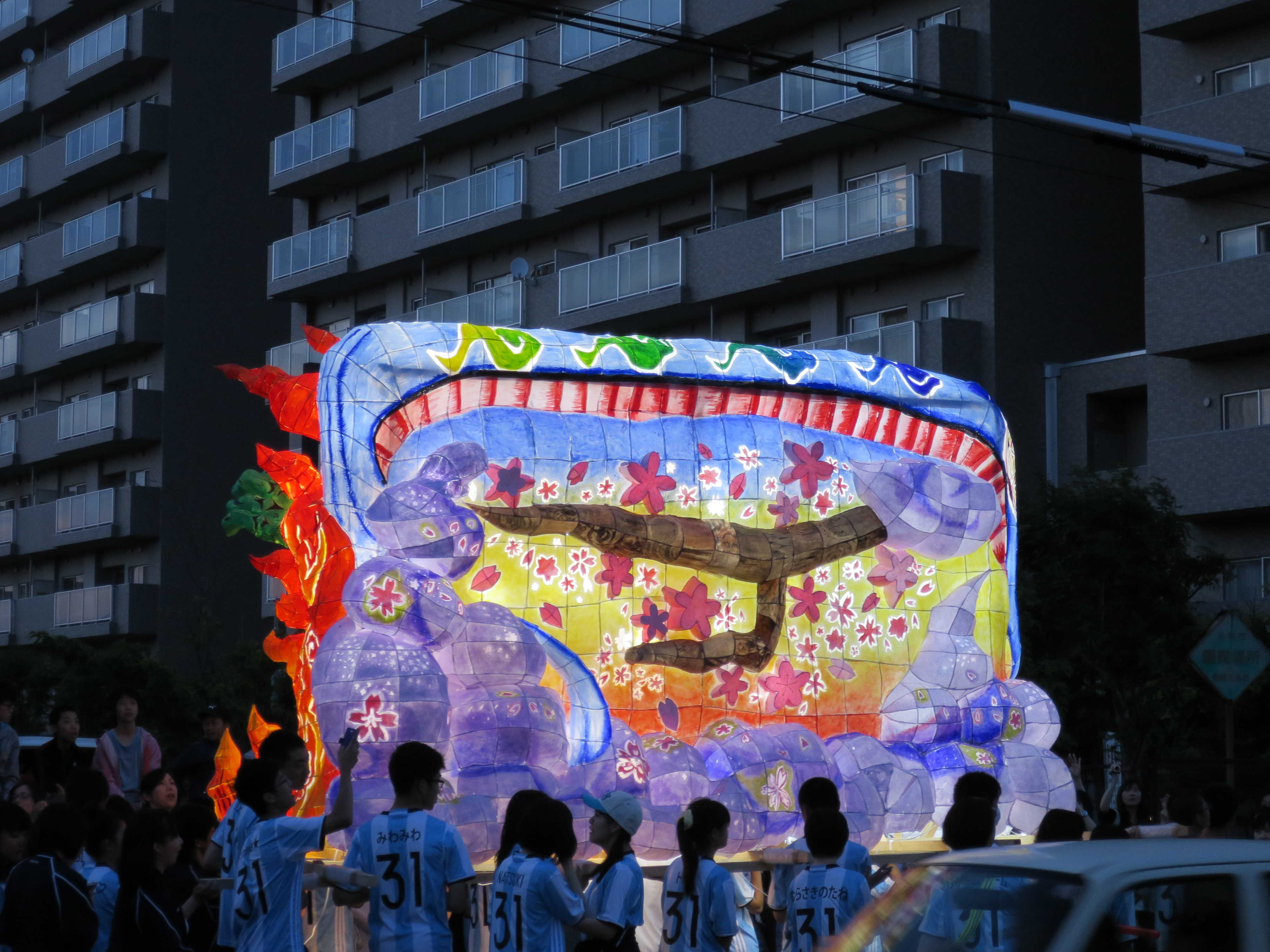 まずはなんといっても色塗りがとても綺麗です。 昨年度の大賞の色もすごかったですが、こちらの行灯もこれまでの行灯とはまったく違った塗りで、新しい伝統になりそうな気がします。グラデーションもとても綺麗で、そしてロウもとても効果的に使っています。正しいロウの使い方という感じです。個人的に色塗りがいい行灯が大賞を取るのはとても嬉しいので今後も続いて欲しいです。