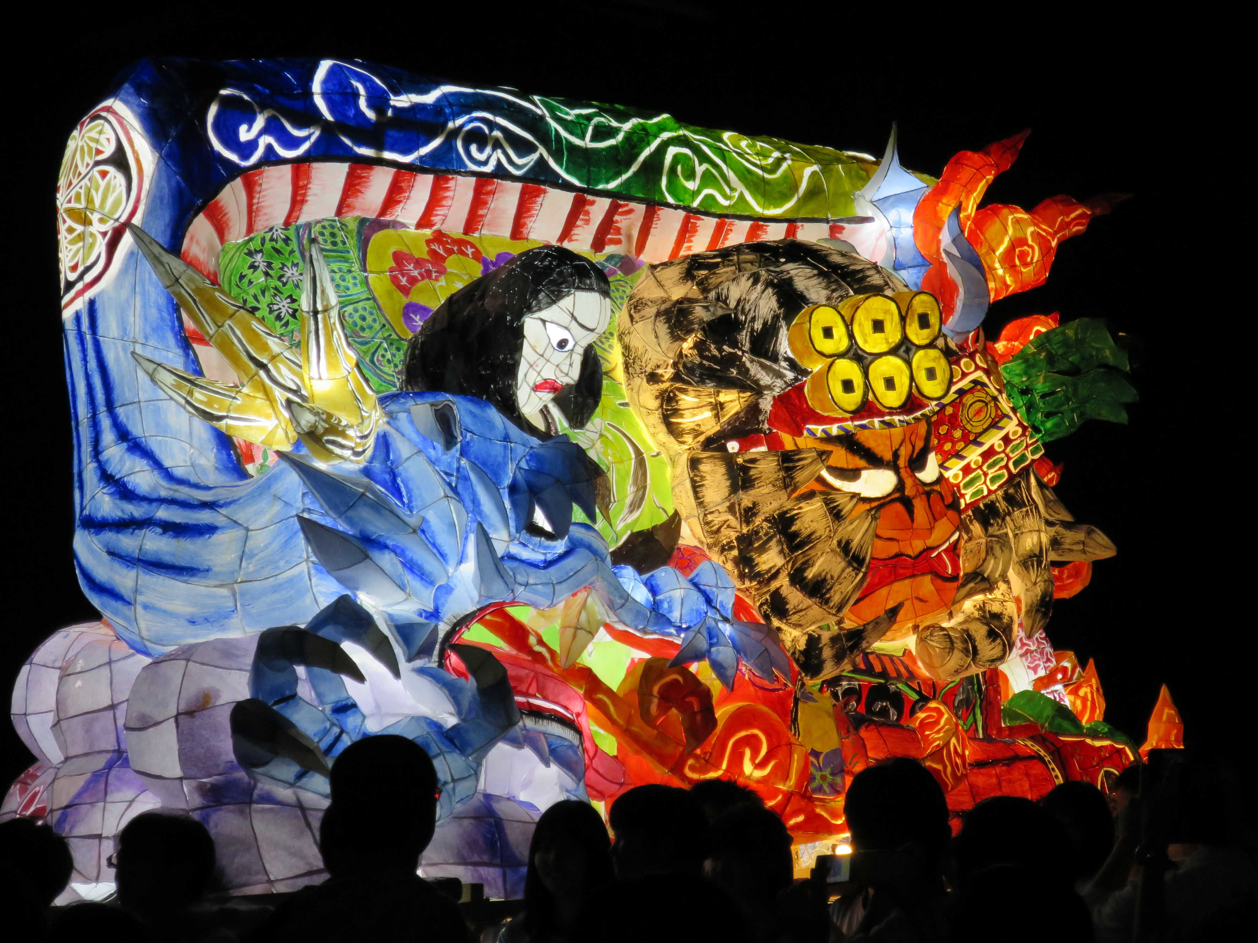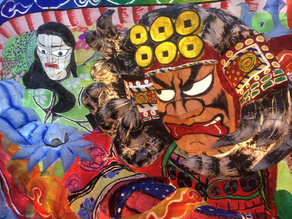 この行灯は壁のメリットをとてもうまく使っていますし、背面の表現もとてもよかったので大成功だと思います。が、やはり立体感のなさや壁との同化は感じてしまいます。ぱっと見だと、「顔と龍がいるな。お、女性の顔もある。他はどうなってるのかわからないけど綺麗だな」という印象になってしまいます。特に人物の腕、武器、は良く出来ているのに全然目立たないです。これはもったいない。この行灯は書き割りが少ないので書き割りをするともう少しは同化を感じなくなるかもしれませんが、同化のリスクを分かった上での行灯だと思うので、それはしょうがないという感じかもしれません。