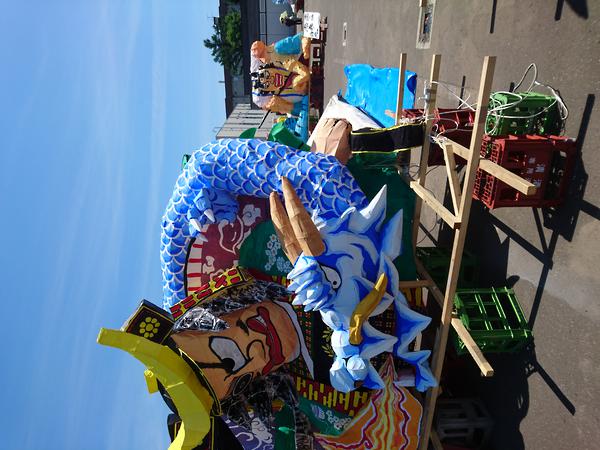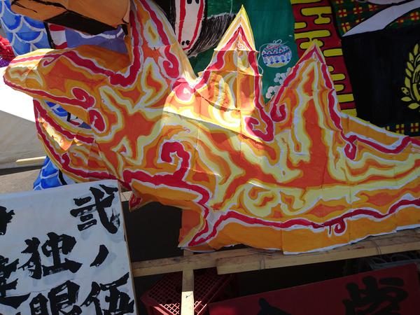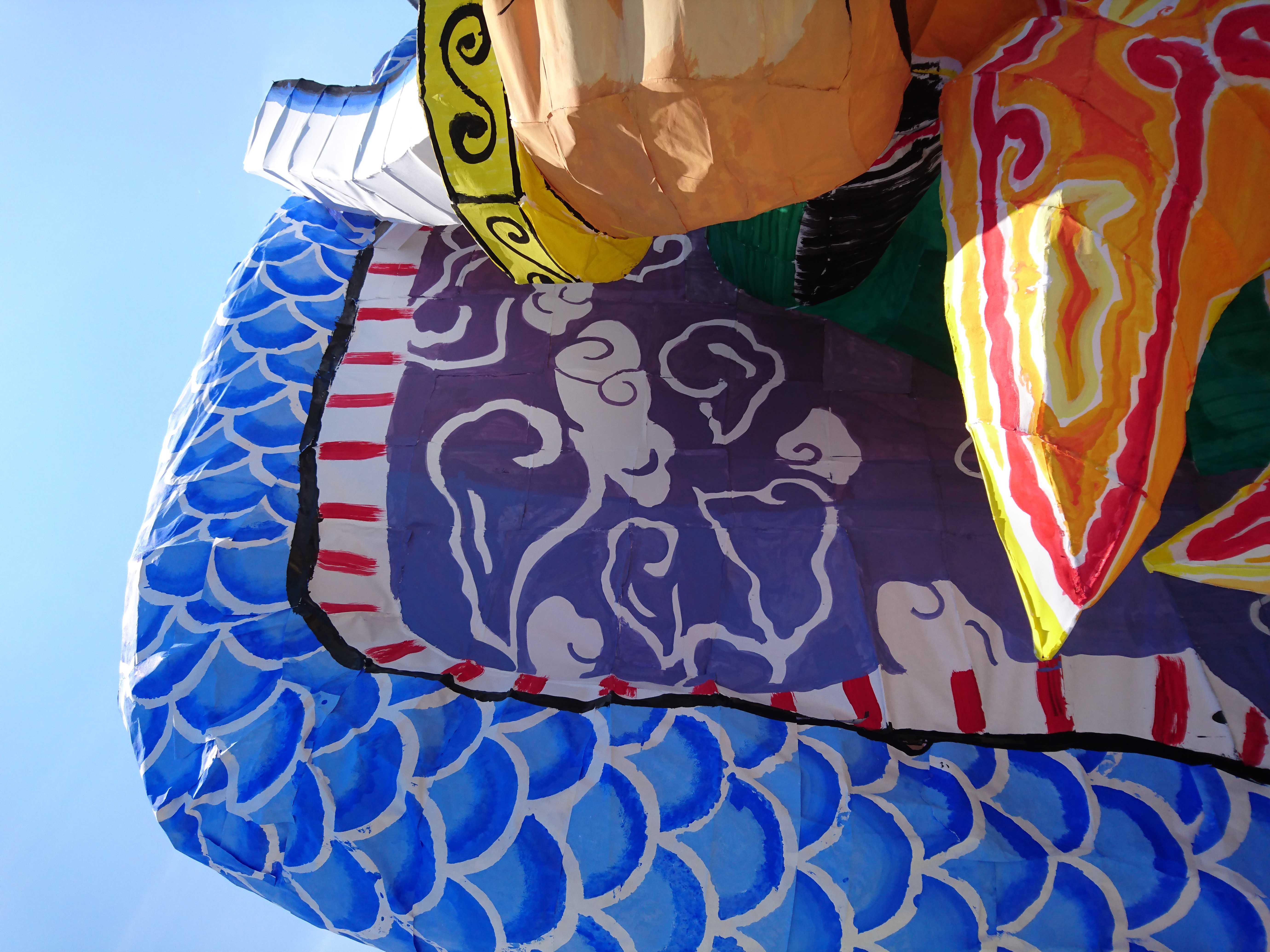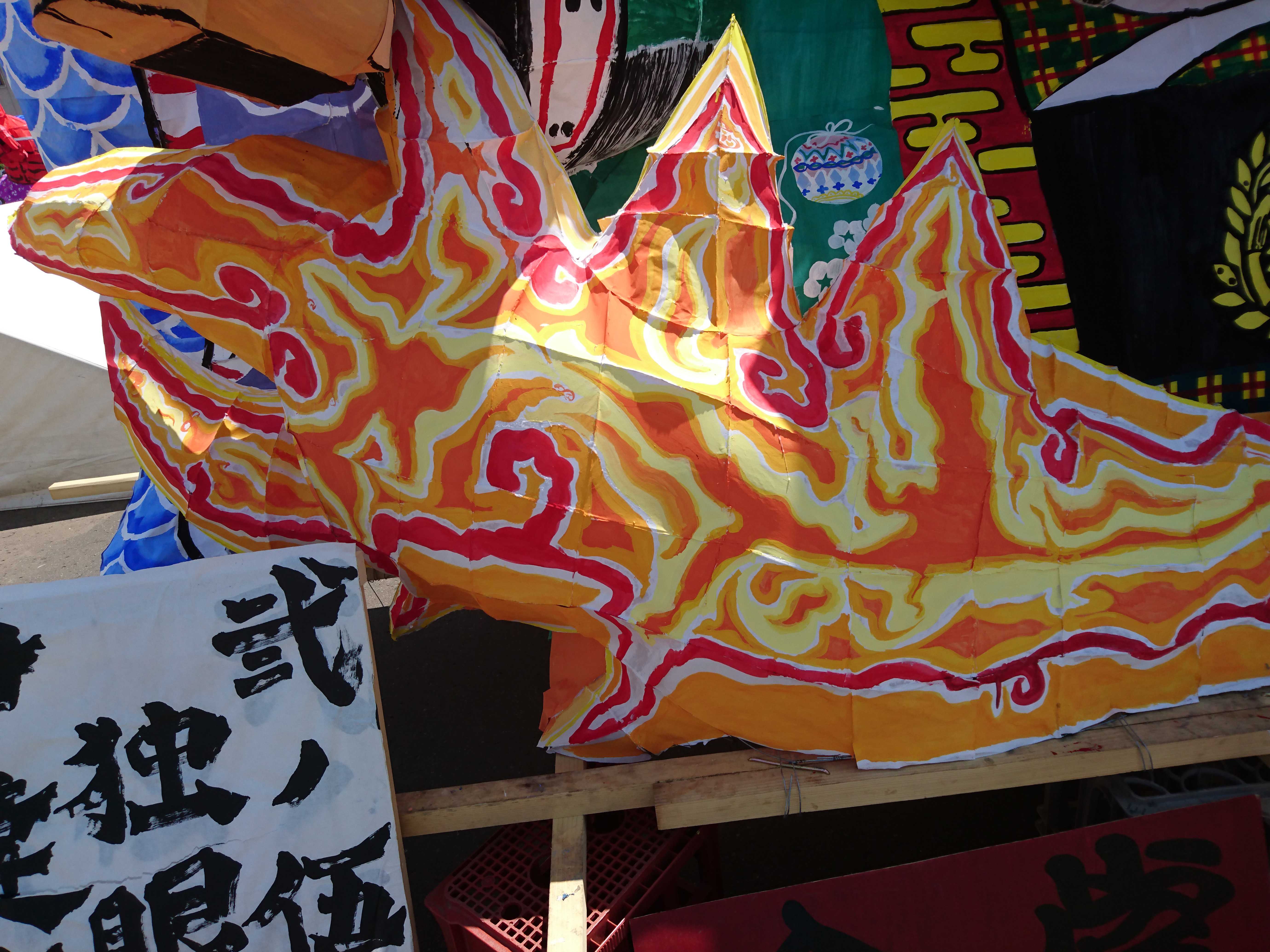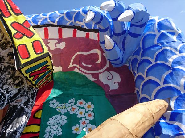 龍は、クラスの方からも聞きましたが、夏陣の構図をかなり参考にして作られていました。顔は針金・色塗り共に上手かったのですが、位置をもう少し右下にして、しっかり左向きにさせるとさらによくなったと思います。そうすることで、空いたスペースを埋められる上に、正面から見たときに横向きの龍を見せることができます(個人的にその向きの方が好きです)。 吐き出された炎が大きなかたまりのようになっているのが印象に残りました。