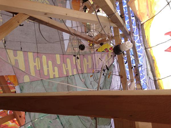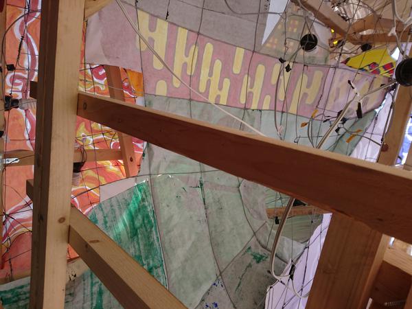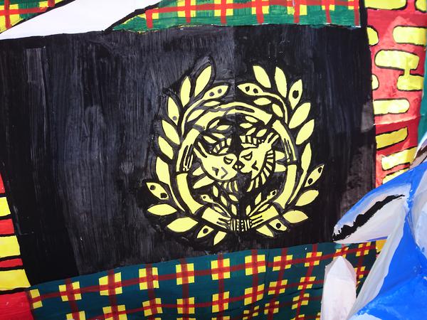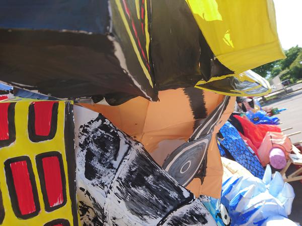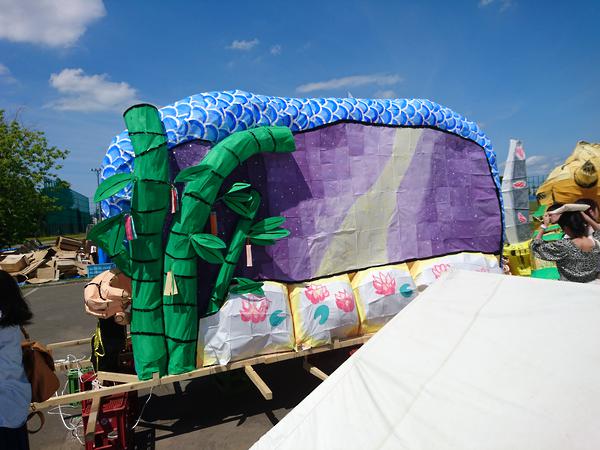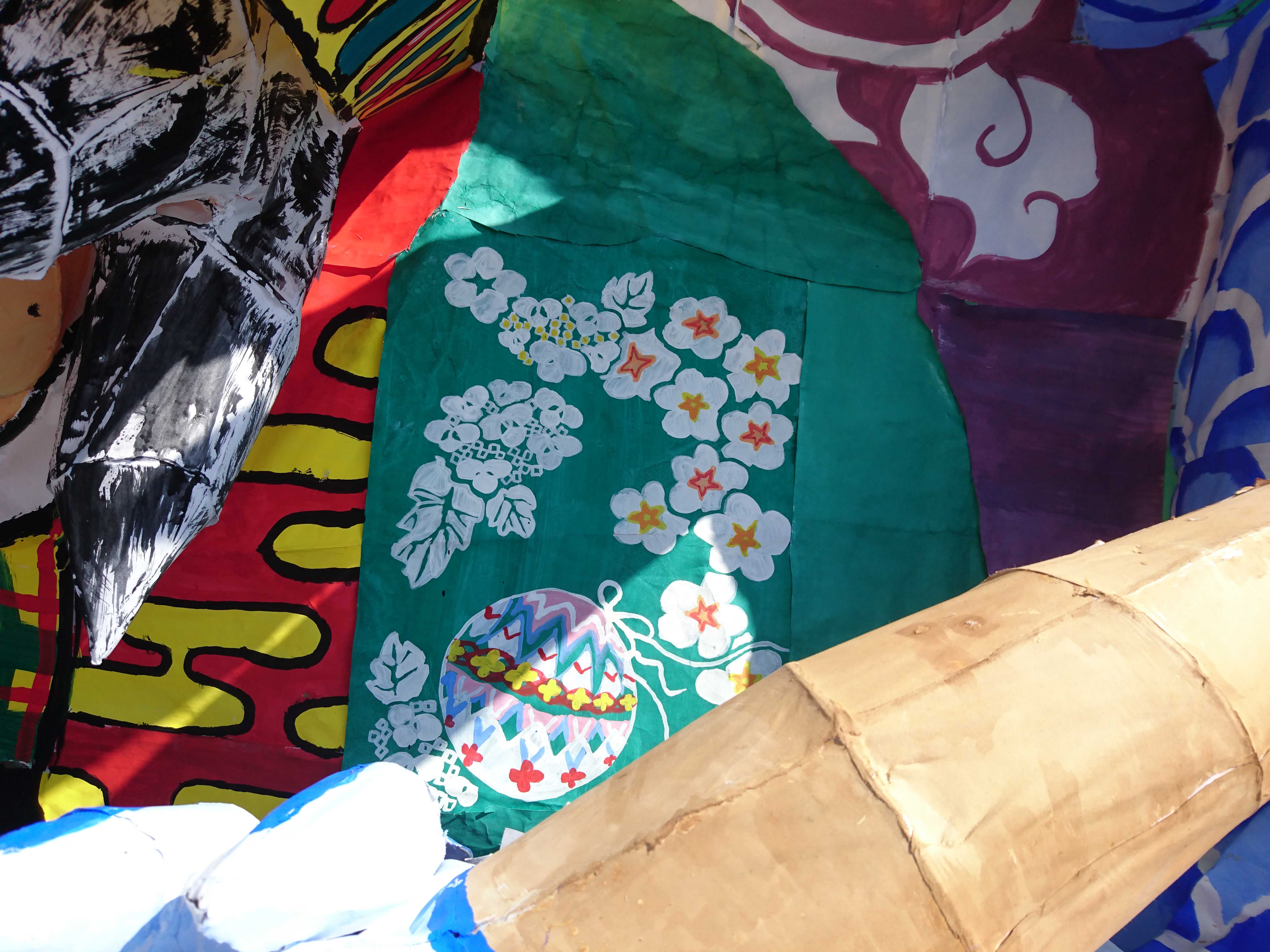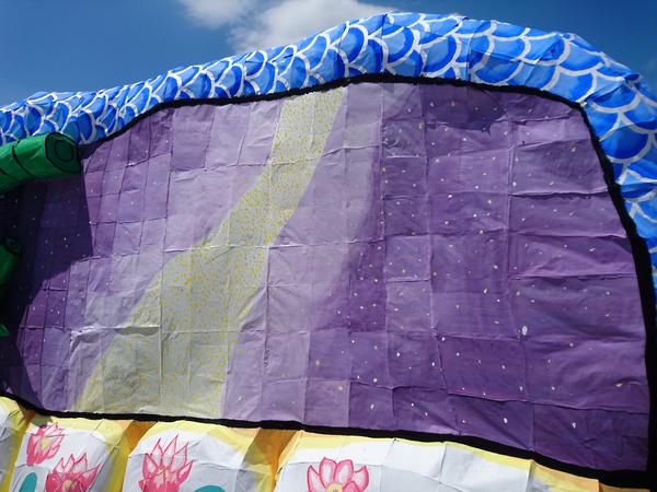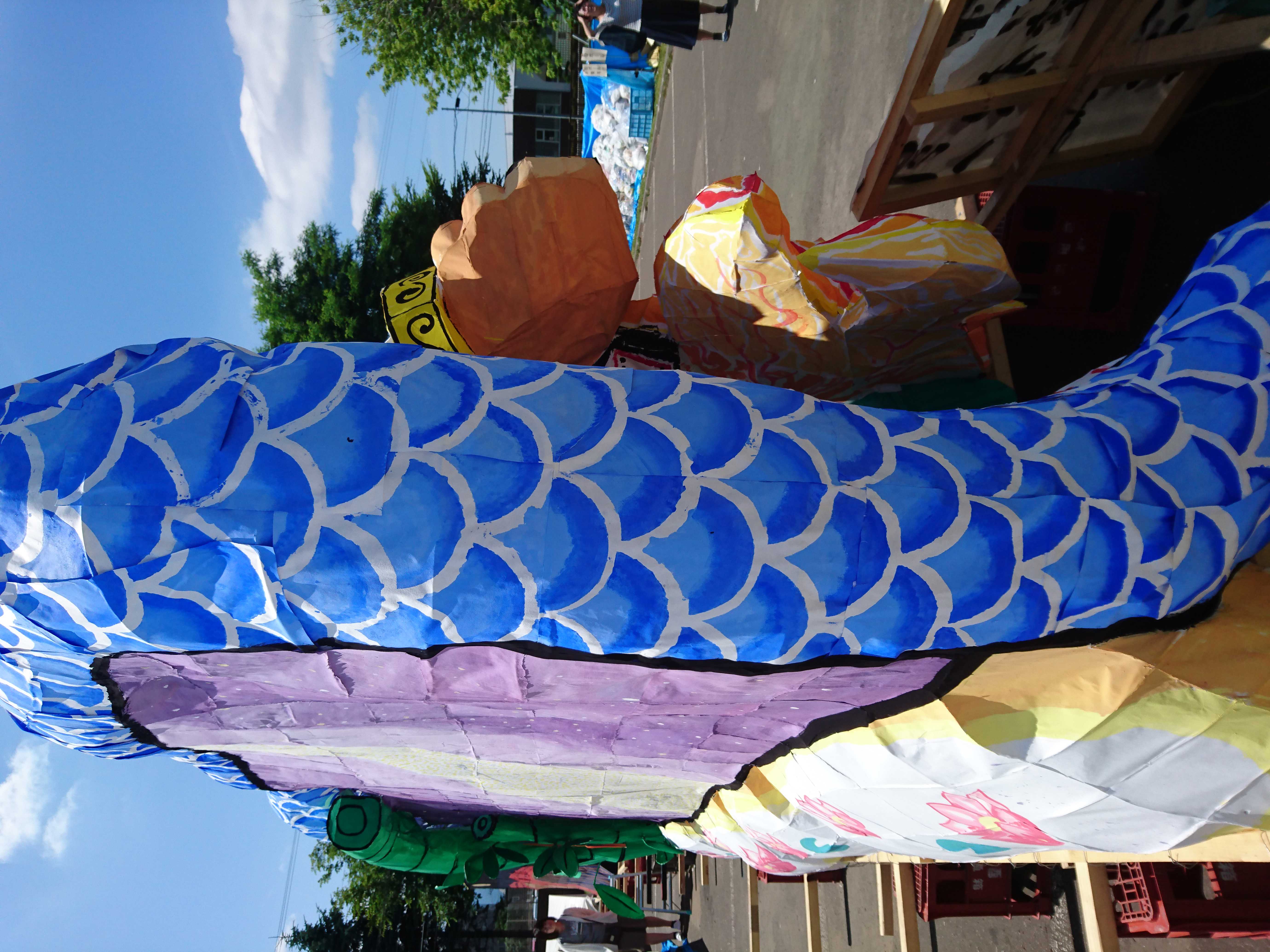 龍は、クラスの方からも聞きましたが、夏陣の構図をかなり参考にして作られていました。顔は針金・色塗り共に上手かったのですが、位置をもう少し右下にして、しっかり左向きにさせるとさらによくなったと思います。そうすることで、空いたスペースを埋められる上に、正面から見たときに横向きの龍を見せることができます(個人的にその向きの方が好きです)。 吐き出された炎が大きなかたまりのようになっているのが印象に残りました。