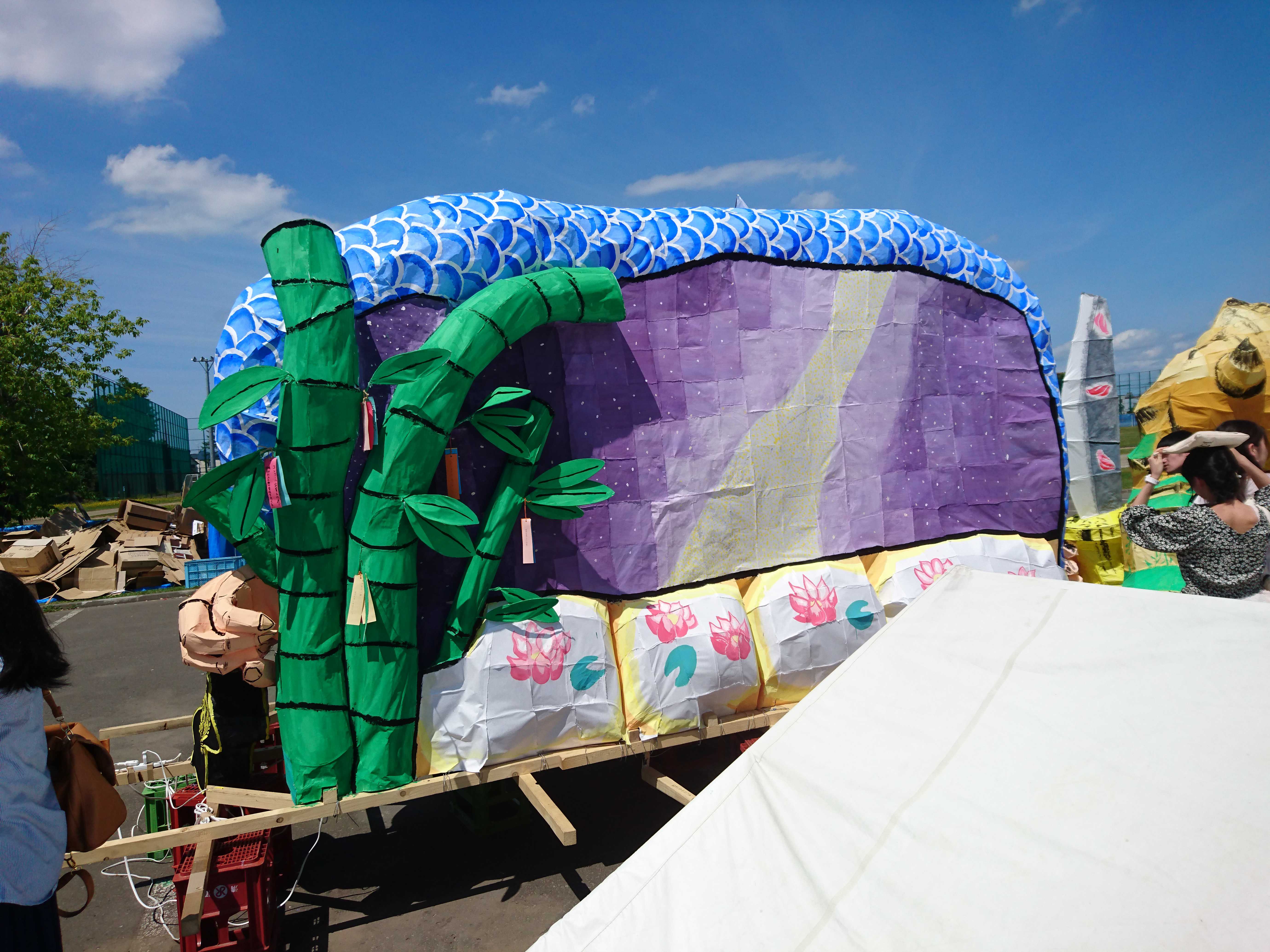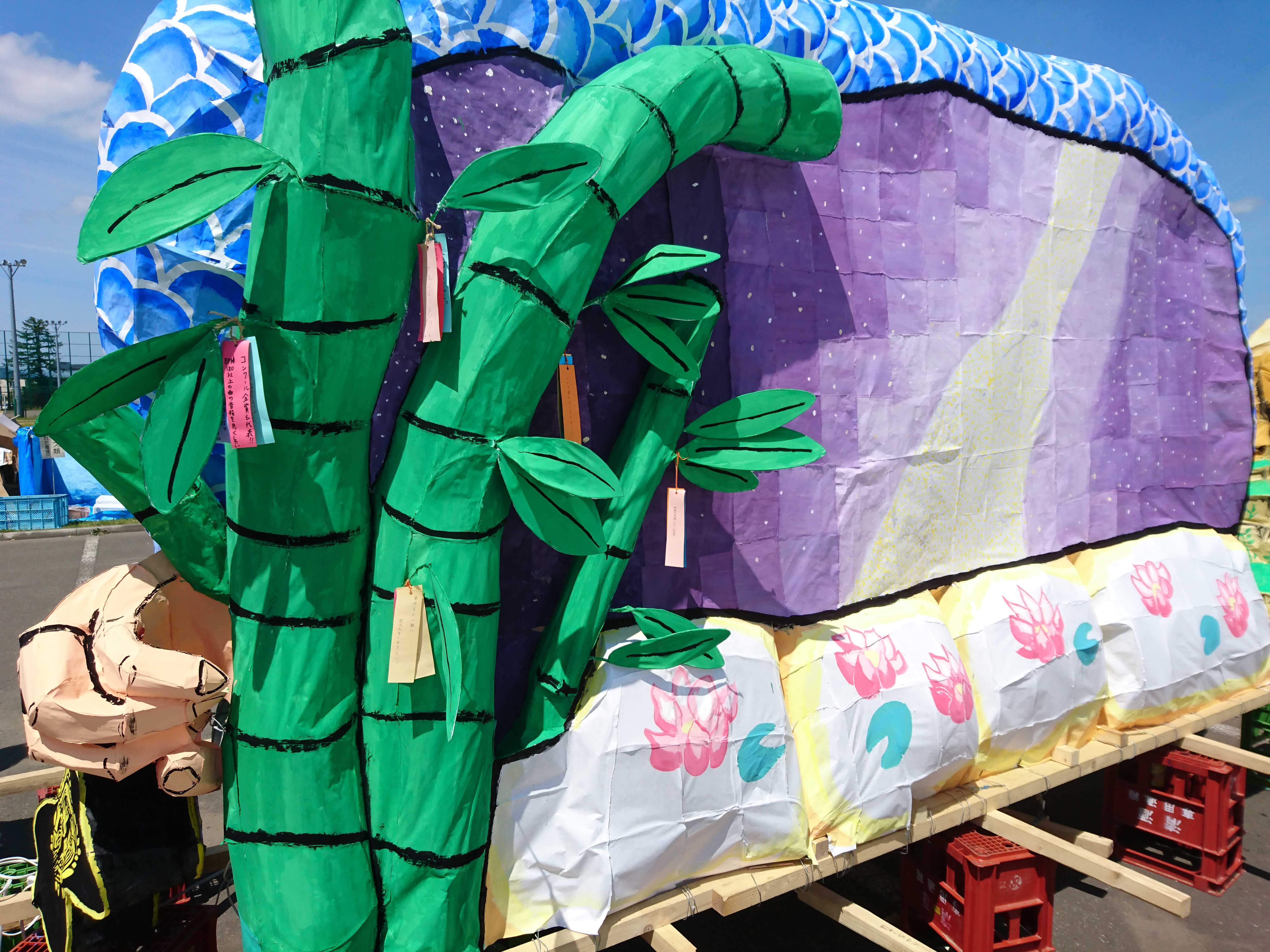驚かされたのが裏面です。行灯行列が行なわれたのが七夕の日ということで、それをモチーフにしただけでなく、影になっている織姫と彦星が動いて、近付いたり離れたりしていました。このような行灯はおそらく2年生では初めて(3年生だと48th大賞が動いていたらしい)です。また、学プロの日に竹についている短冊を見ると、クラスのメンバーの願い事が書かれていて、学祭らしくていいなと思いました。 ただ、これは個人によって好みが分かれる所だと思いますが、行灯の表裏で全く話の繋がりがないことが気になりました。