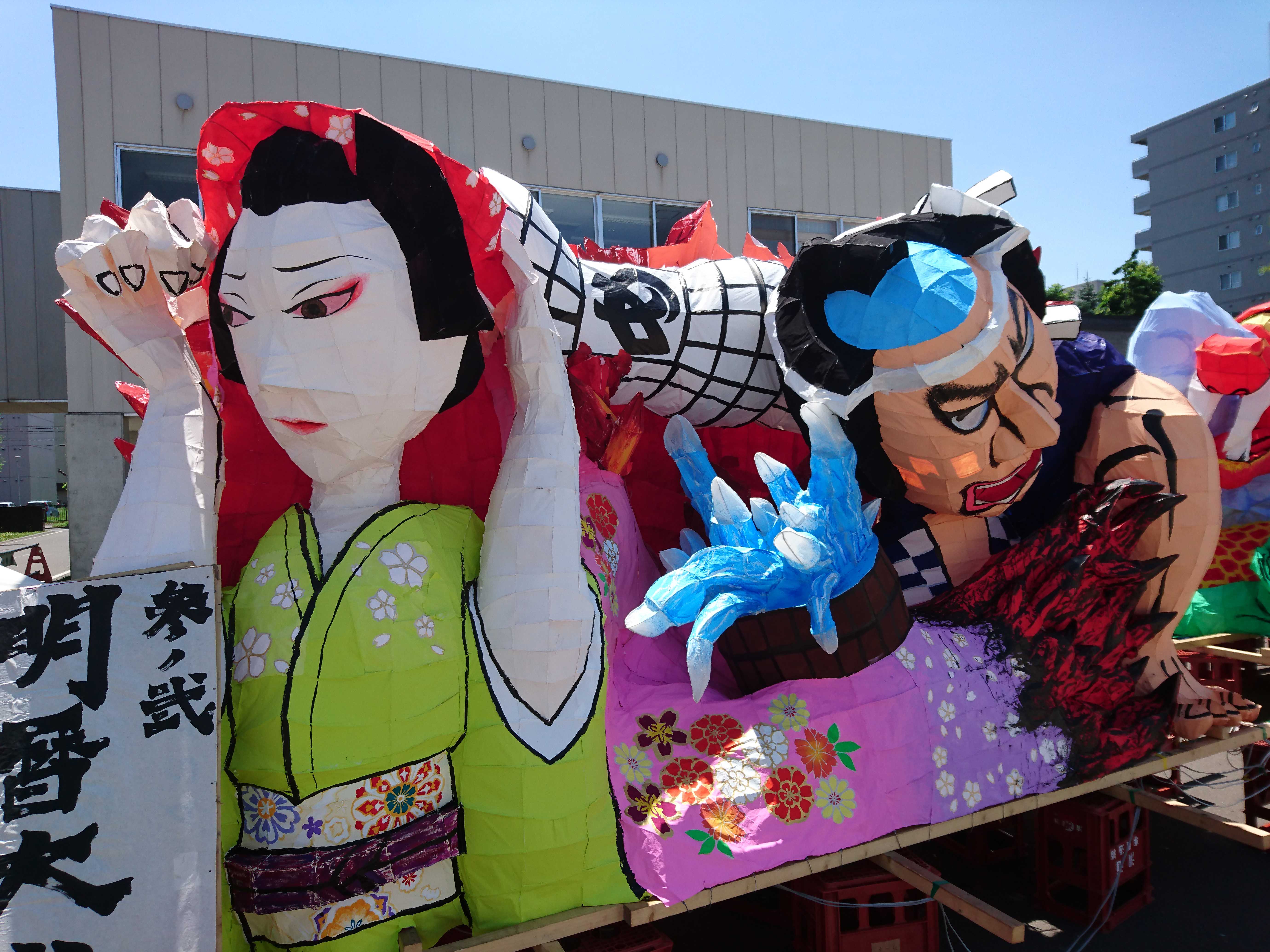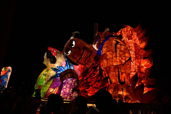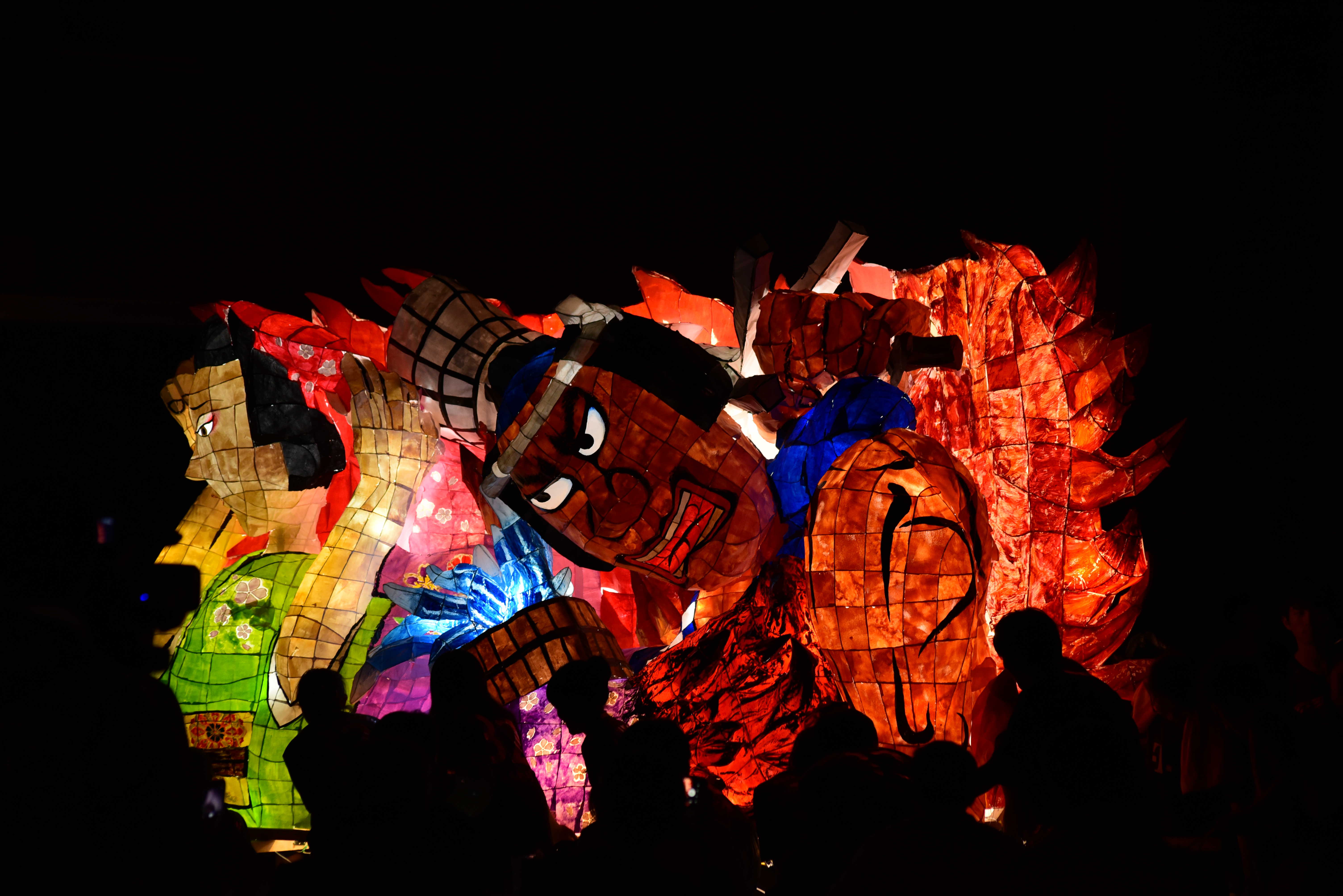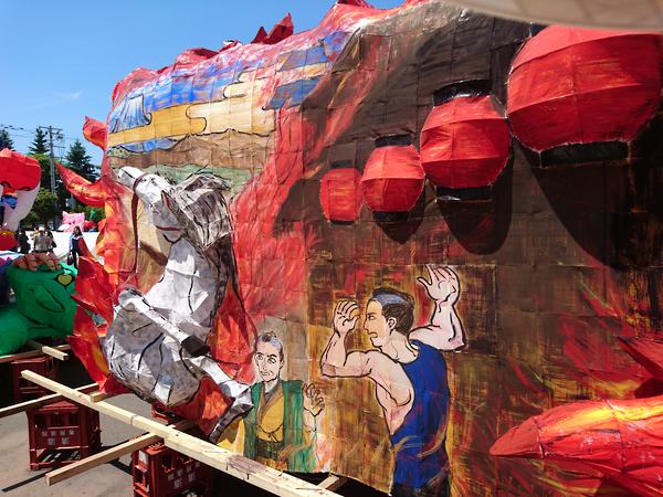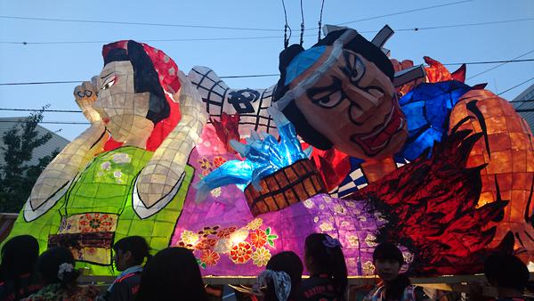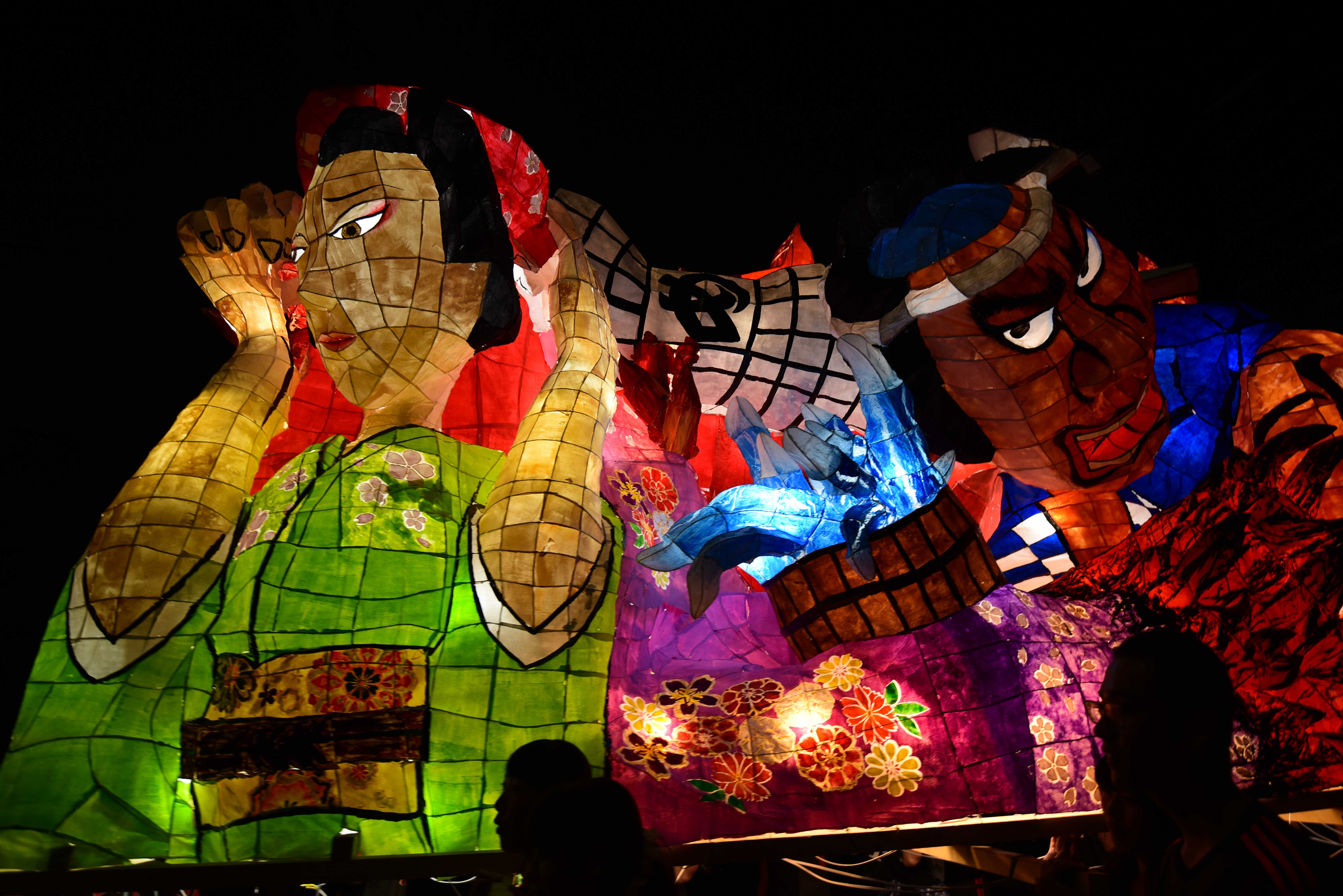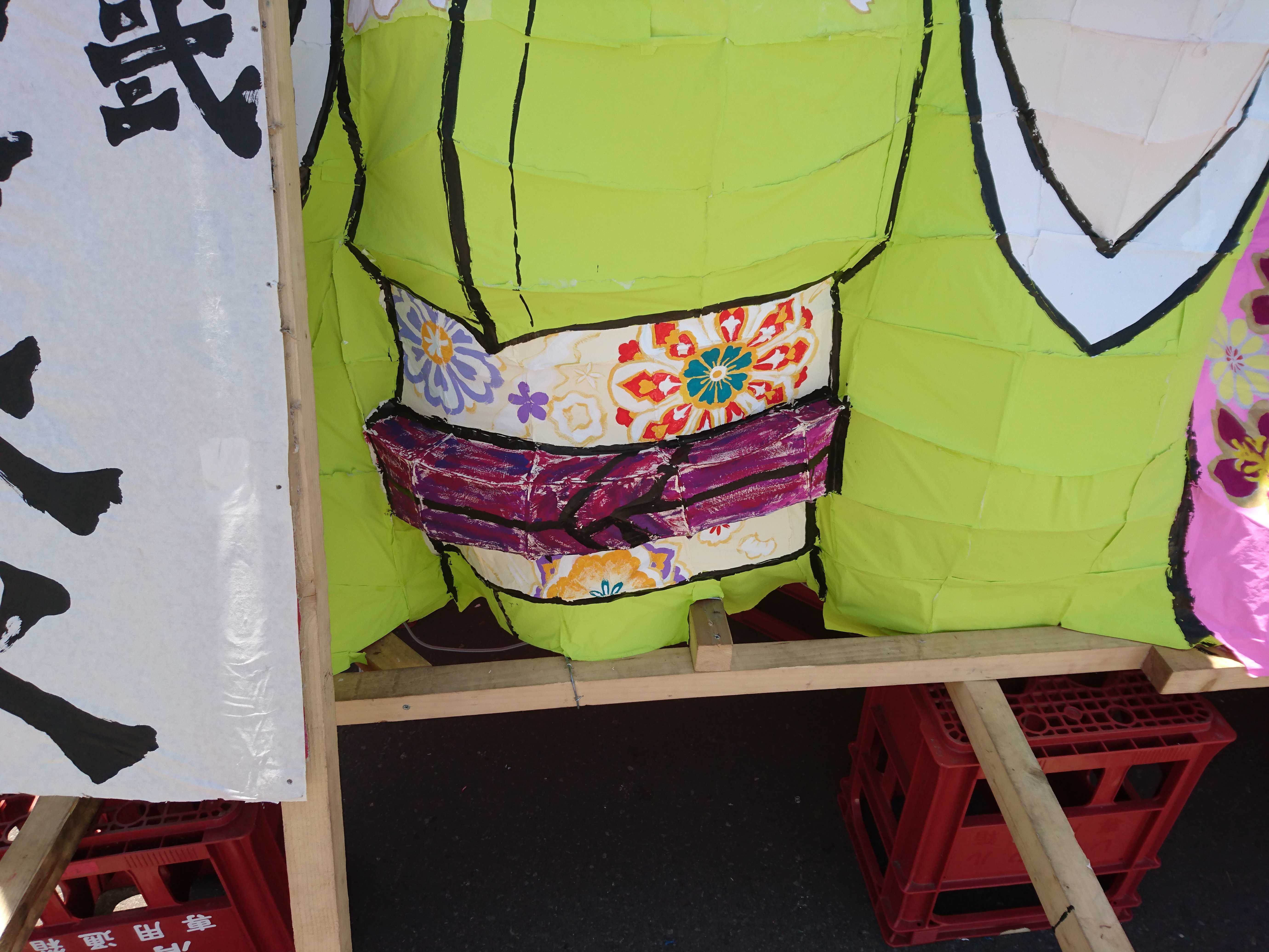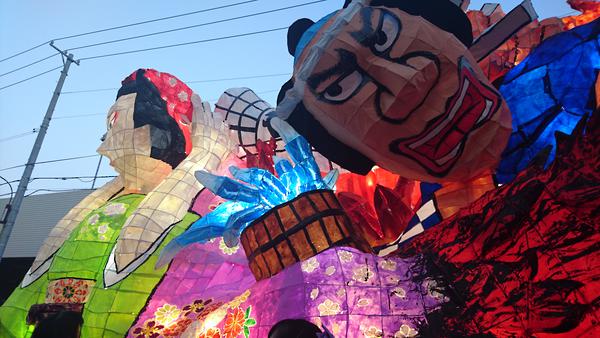 男性は顔・体が傾いていて、左足も作られているので、非常に躍動感が伝わってきました。 女性を男性と同じ大きさで作る行灯はあまりないように思いますが、特に違和感はないと思いました。逆に小さく作っていた方が変な感じになっていたのではないでしょうか。 ともに顔・胴体の針金が綺麗でした。