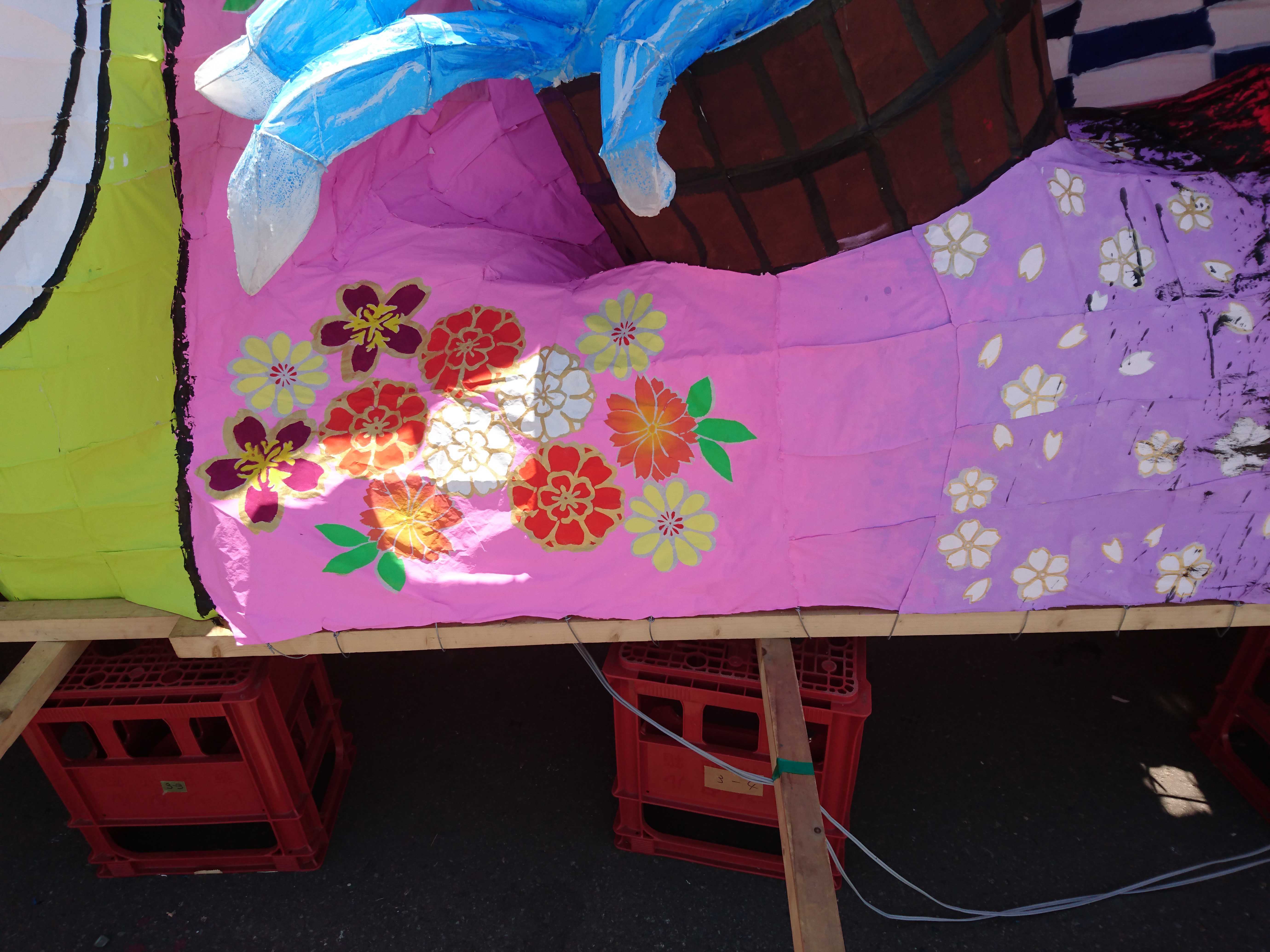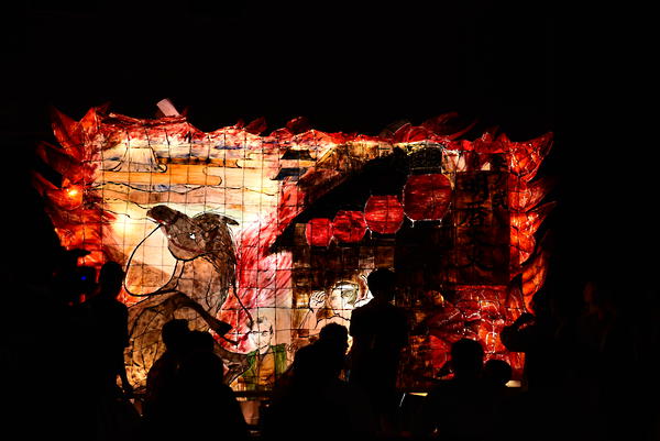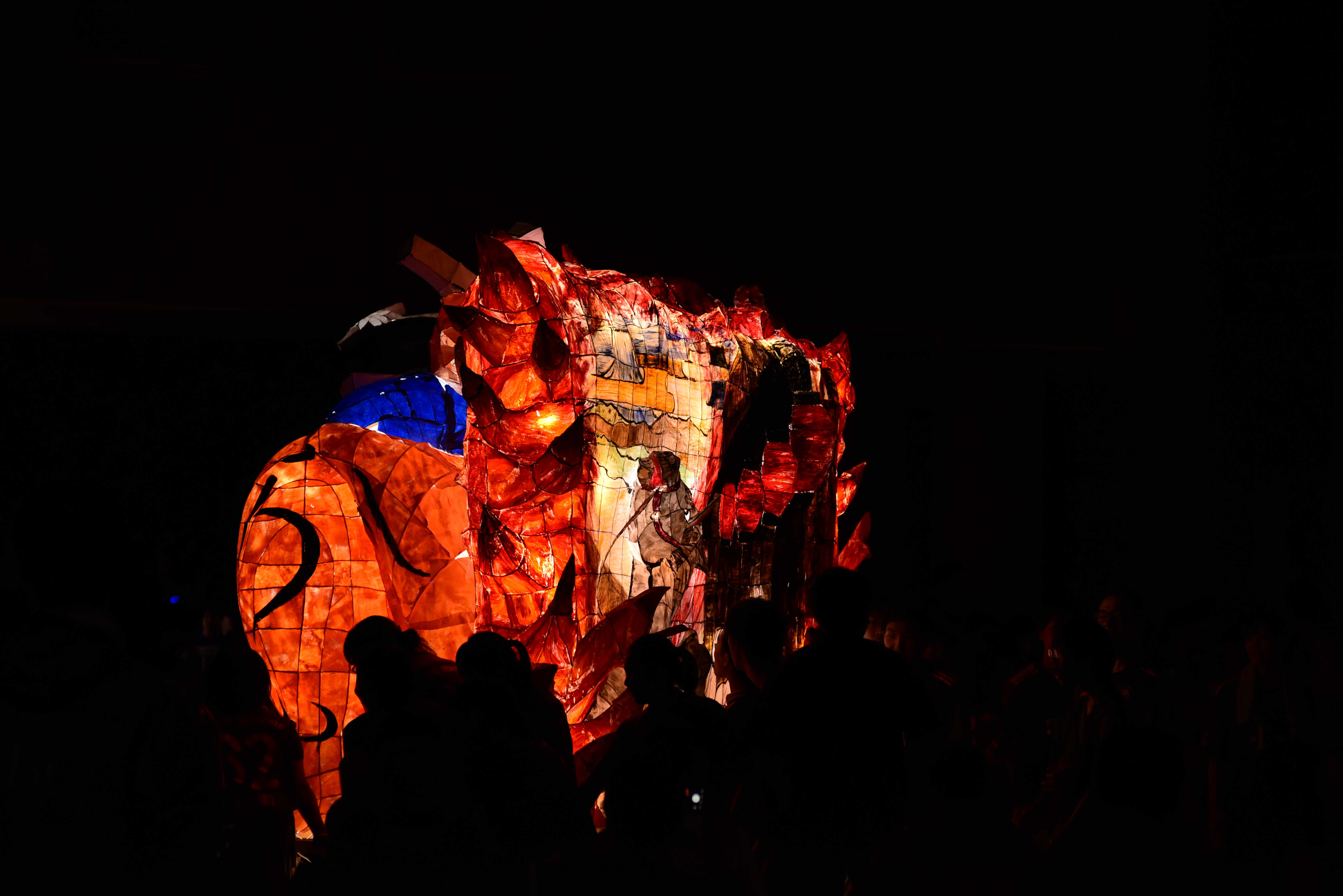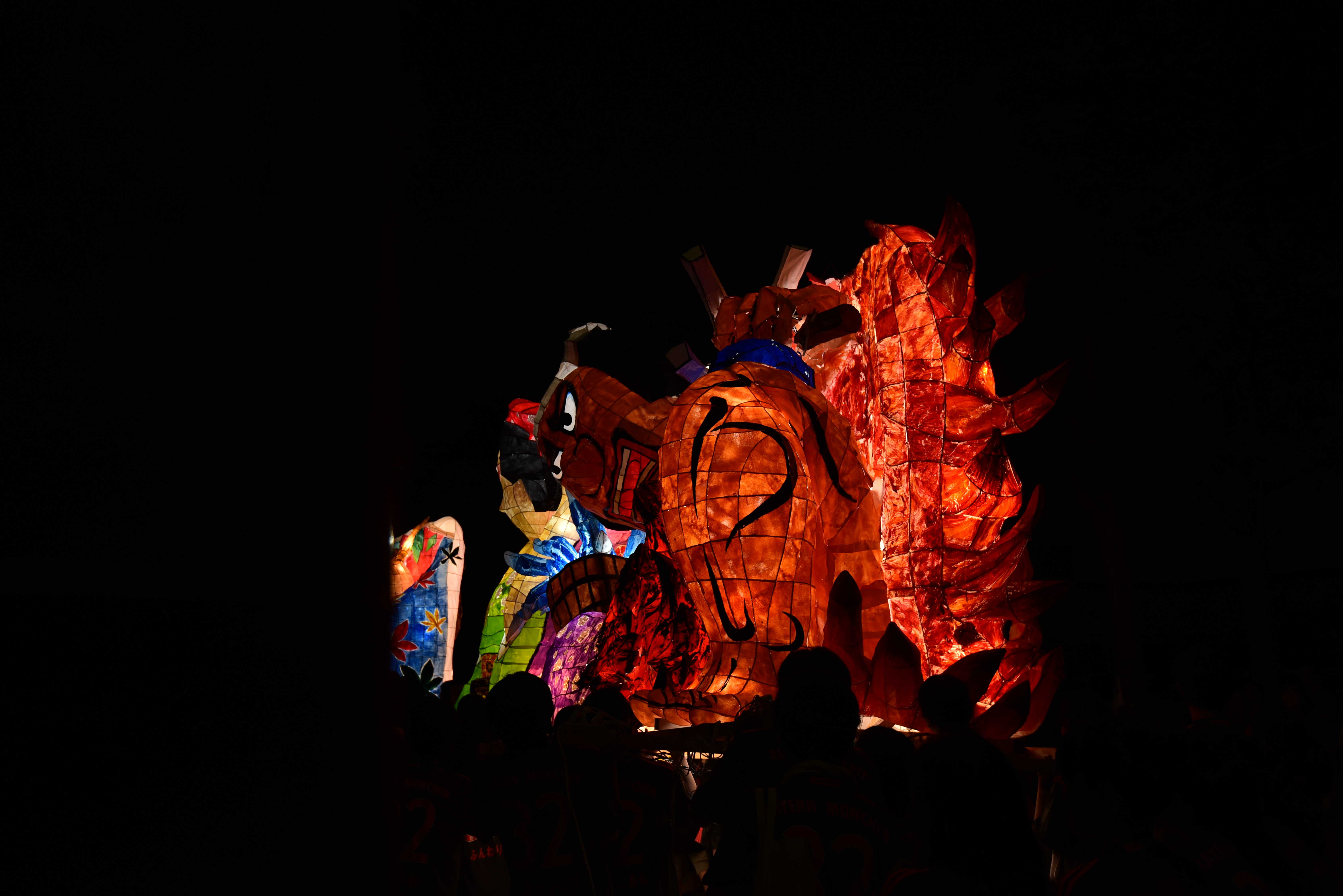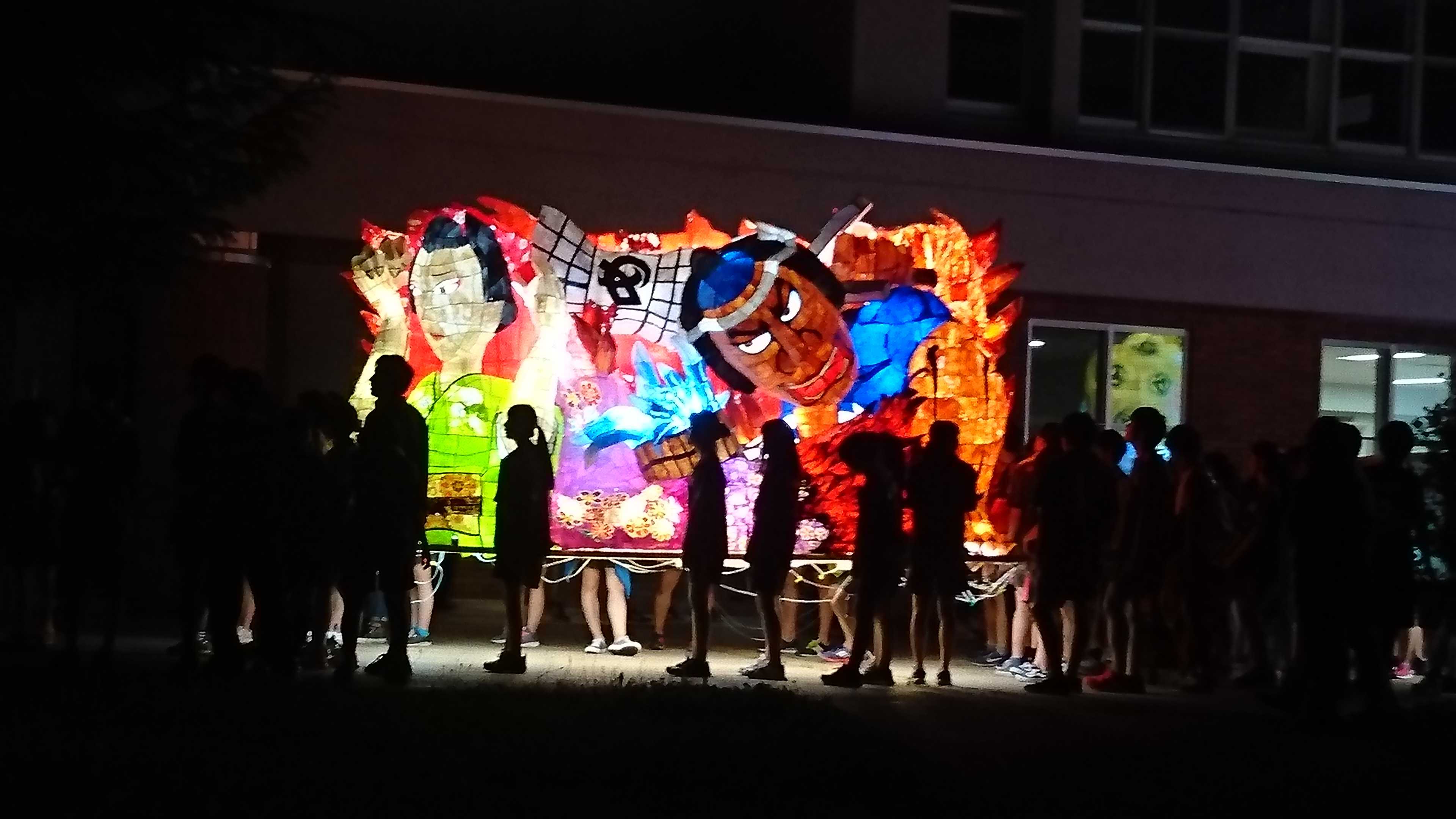 近くで見ると裏の立体になっている馬の針金の精度がすごかったです。 全体的に濃い色が多かったので、光らせたときに暗くなってしまったのがもったいなかったです。電球を増やして解決できればいいのですが、数にも制限があるので、事前にどのくらいの濃さだとどれくらい光を通すのかを実験する必要があるのかななんて思いました。
