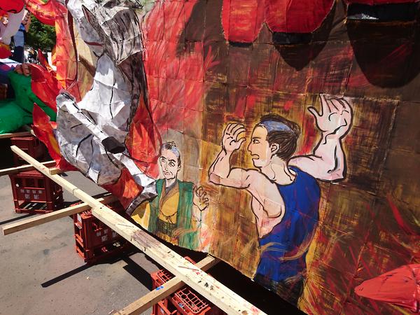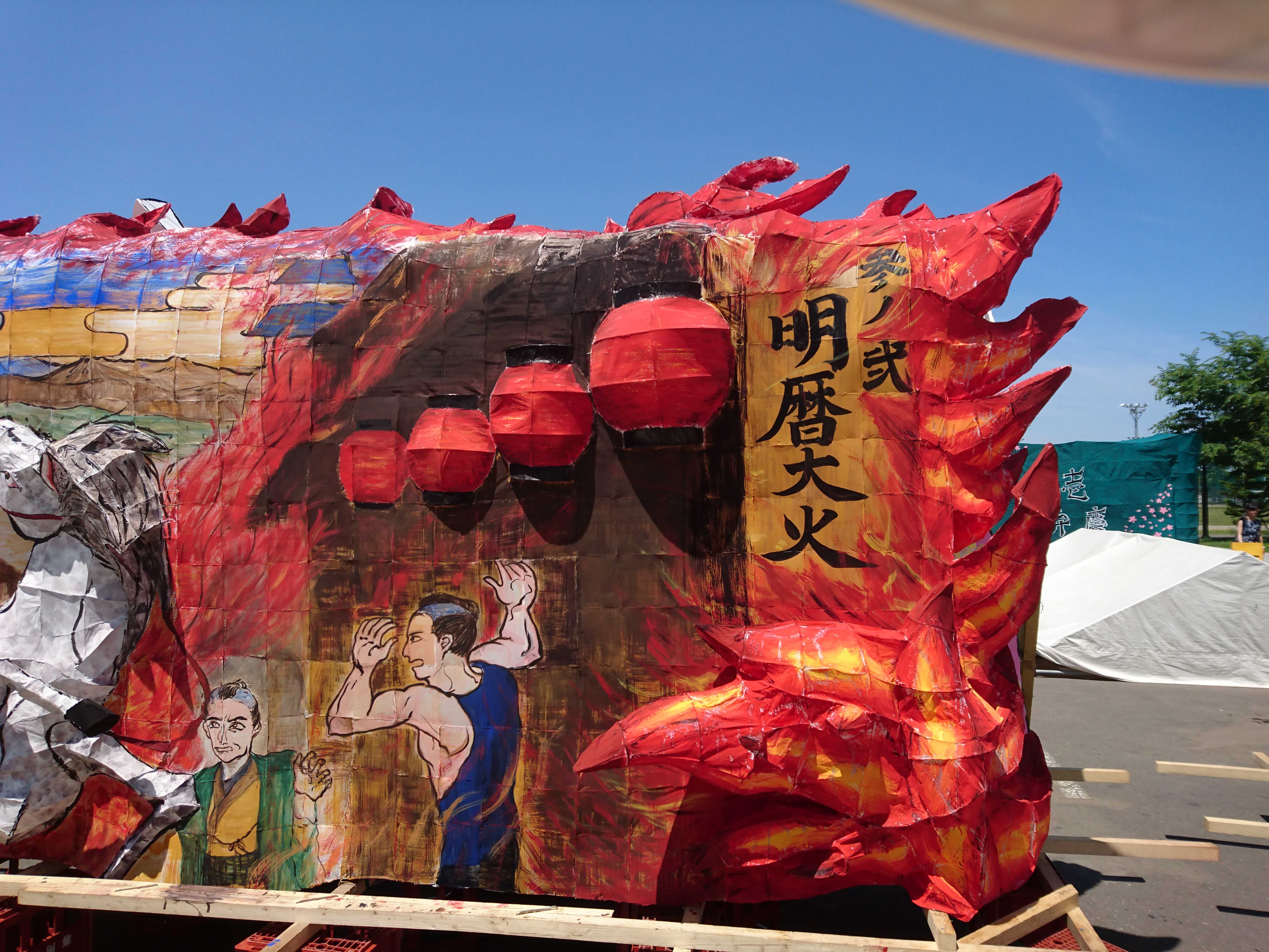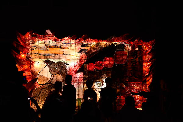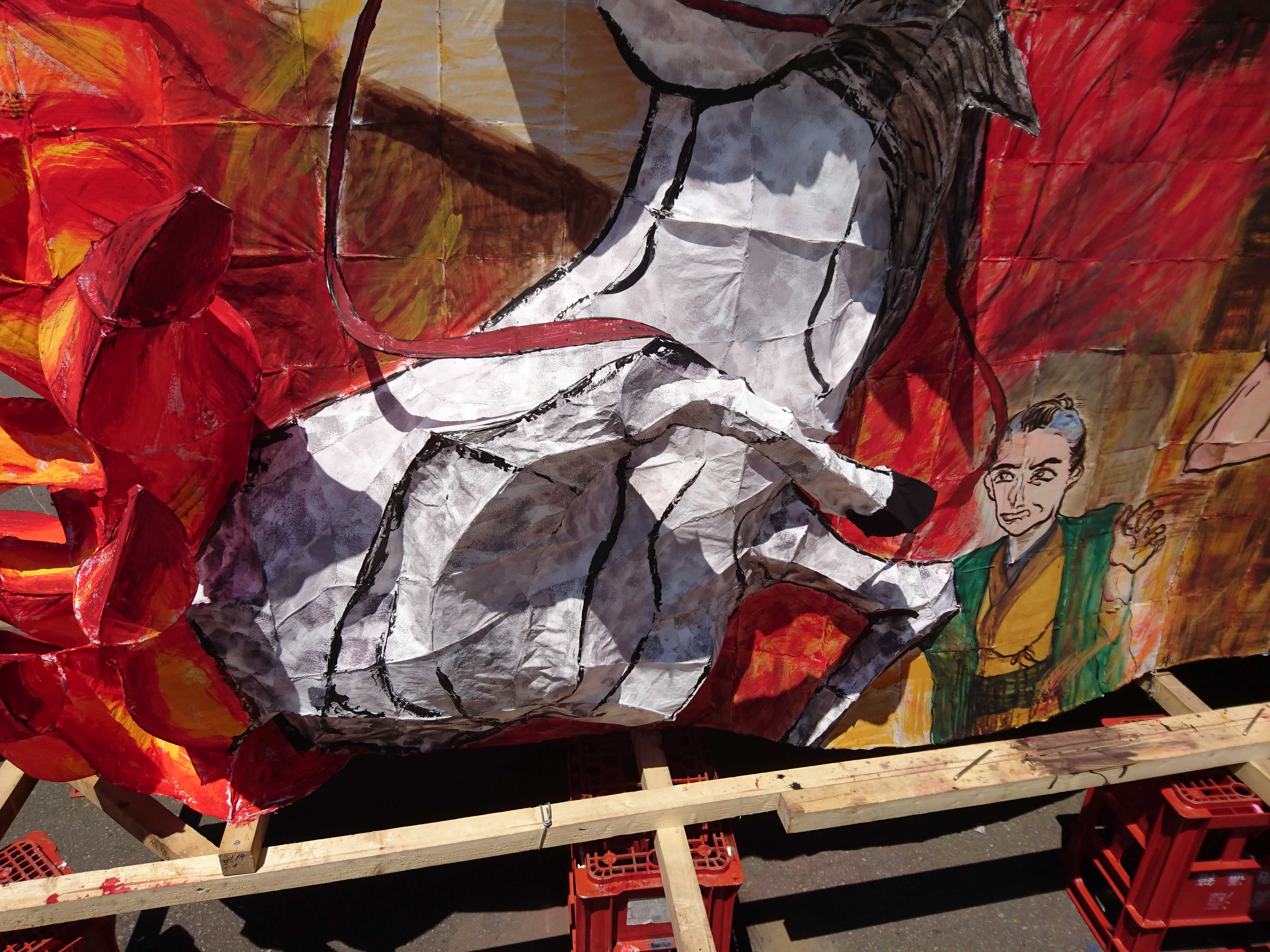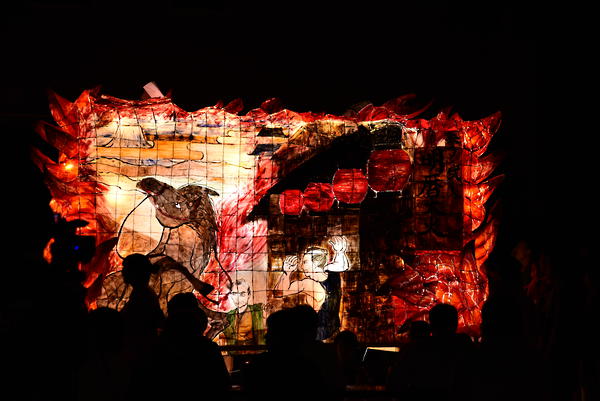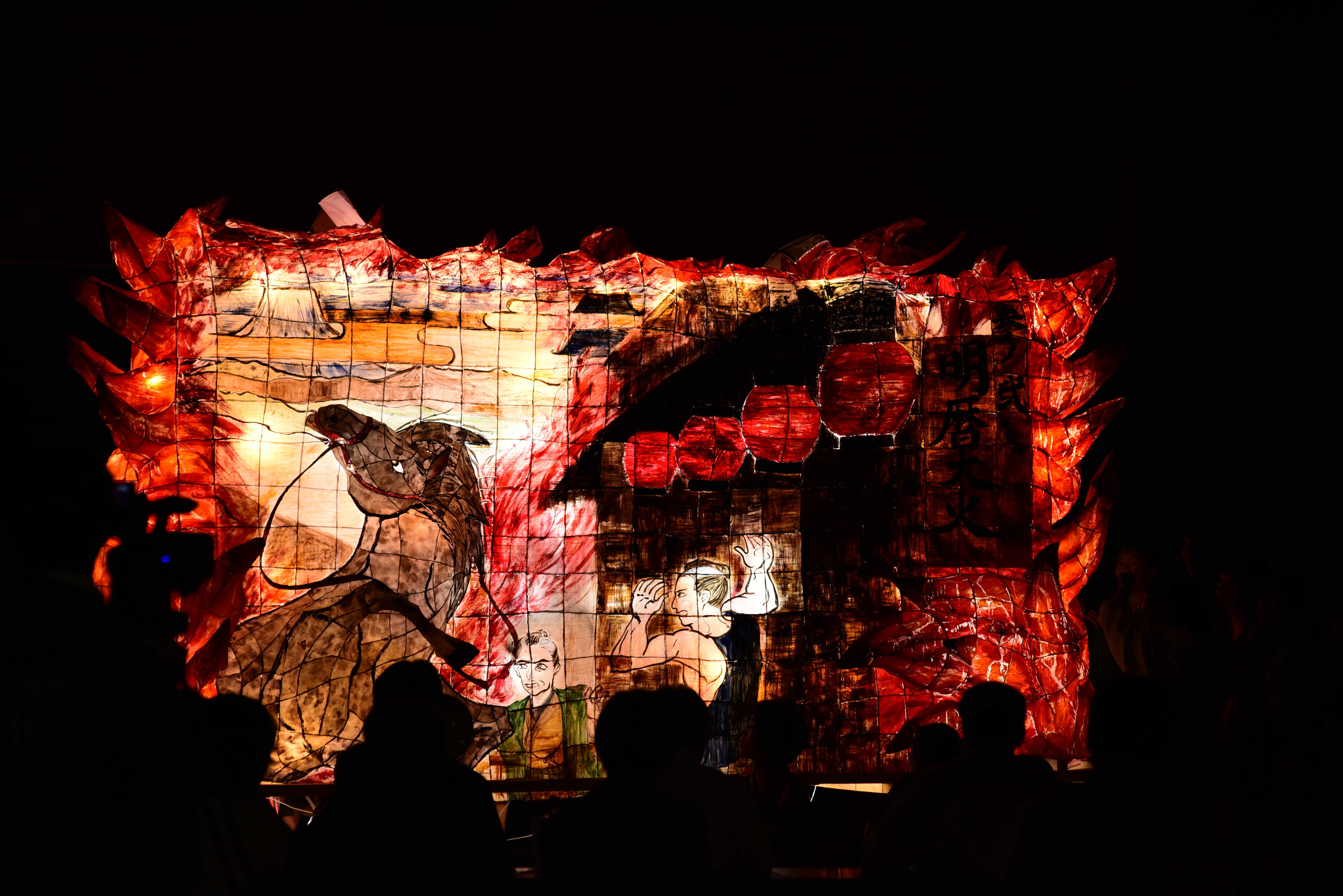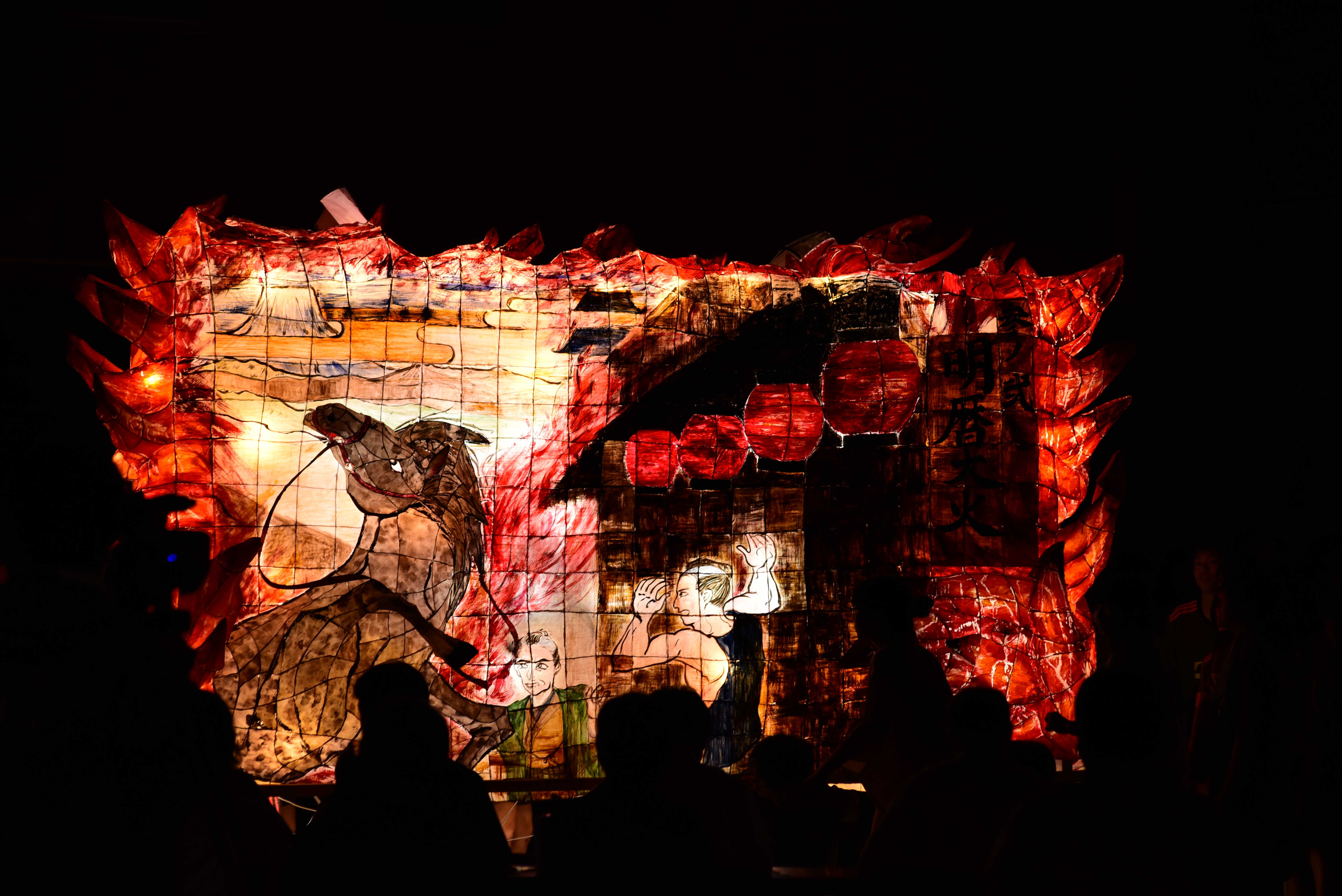 - 大火事の中で火消しの男性が必死に女性を救う様子が一瞬で理解できるような構図になっていました。観客がすぐに理解できるように行灯を作るのは難しいことなので、素晴らしいです。特に、右下で布(?)が燃え始めている所や、また中央で桶から水が勢いよく飛び出している所の表現がよかったです。