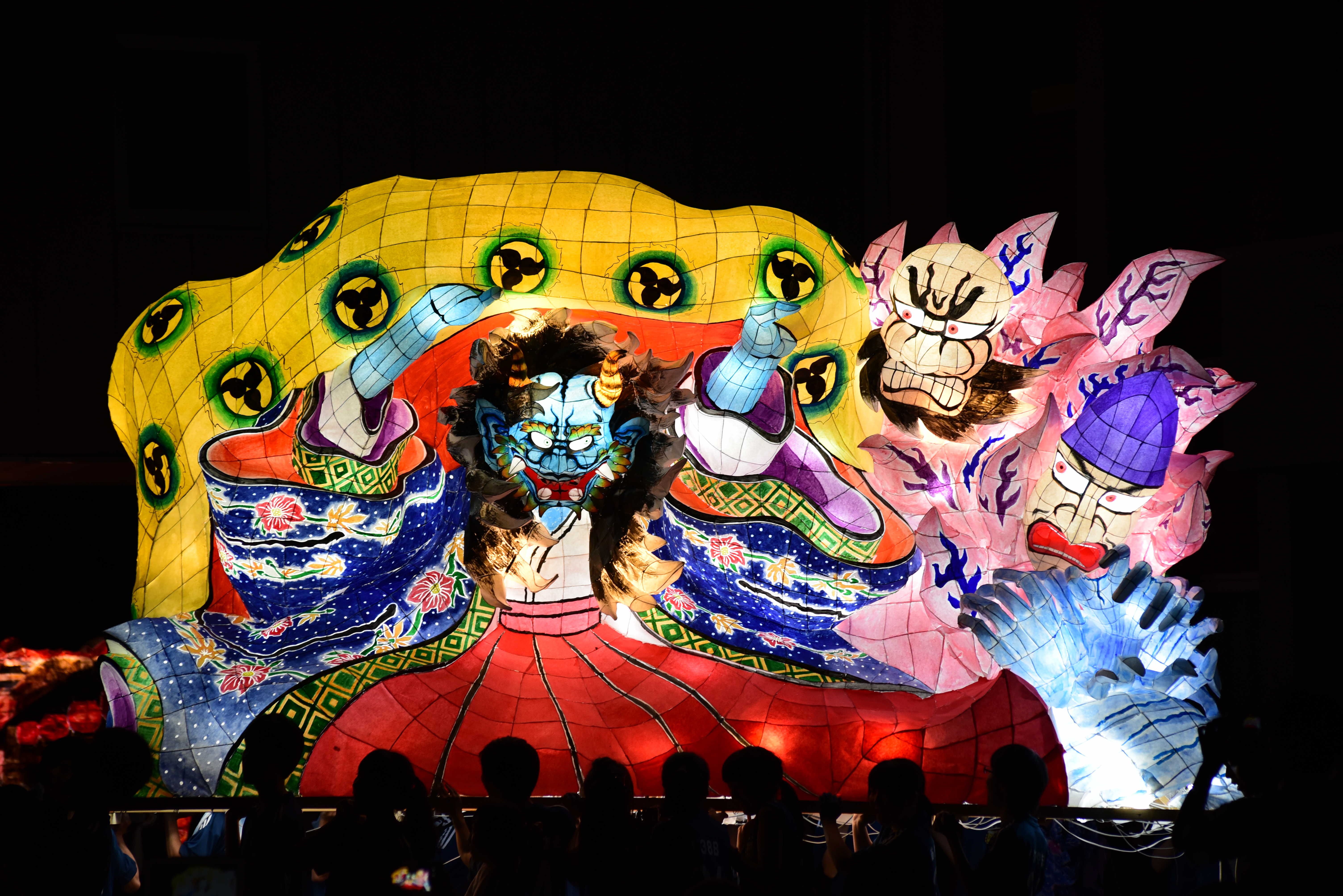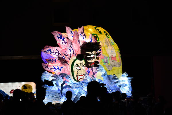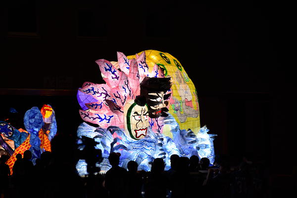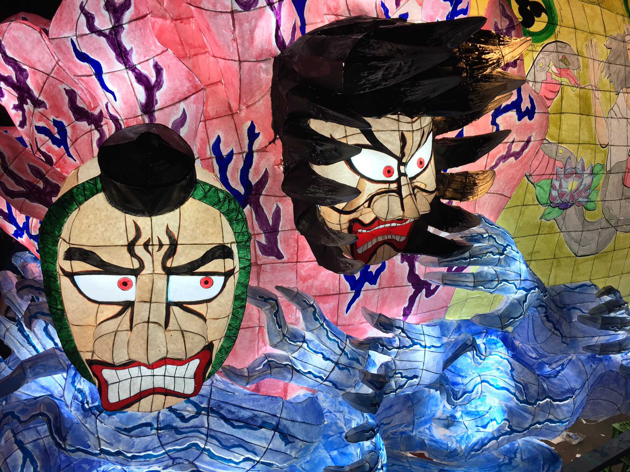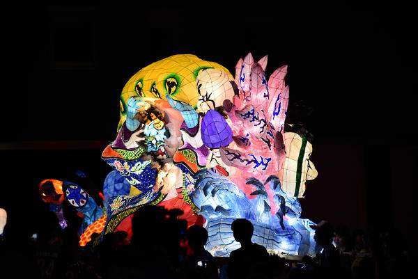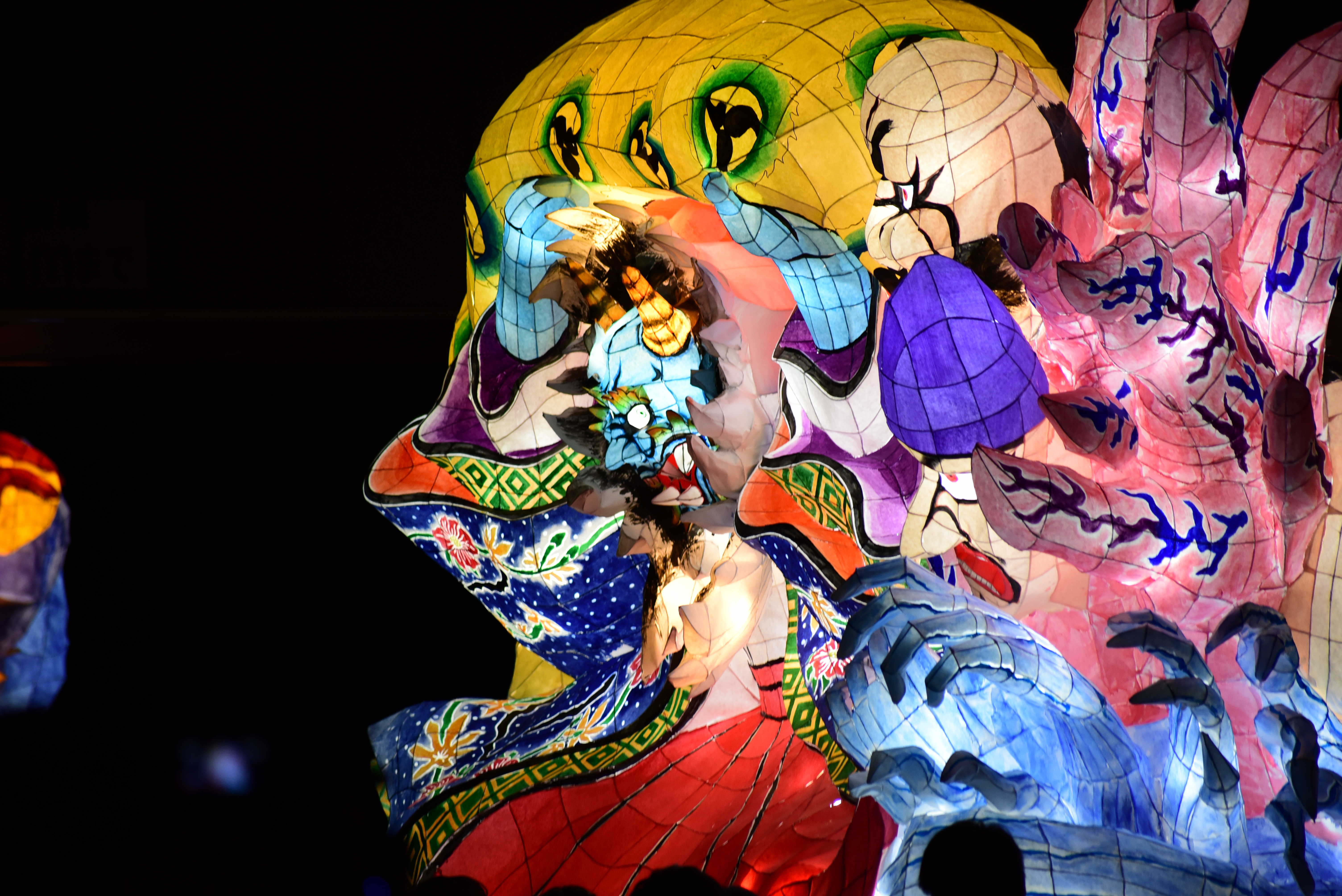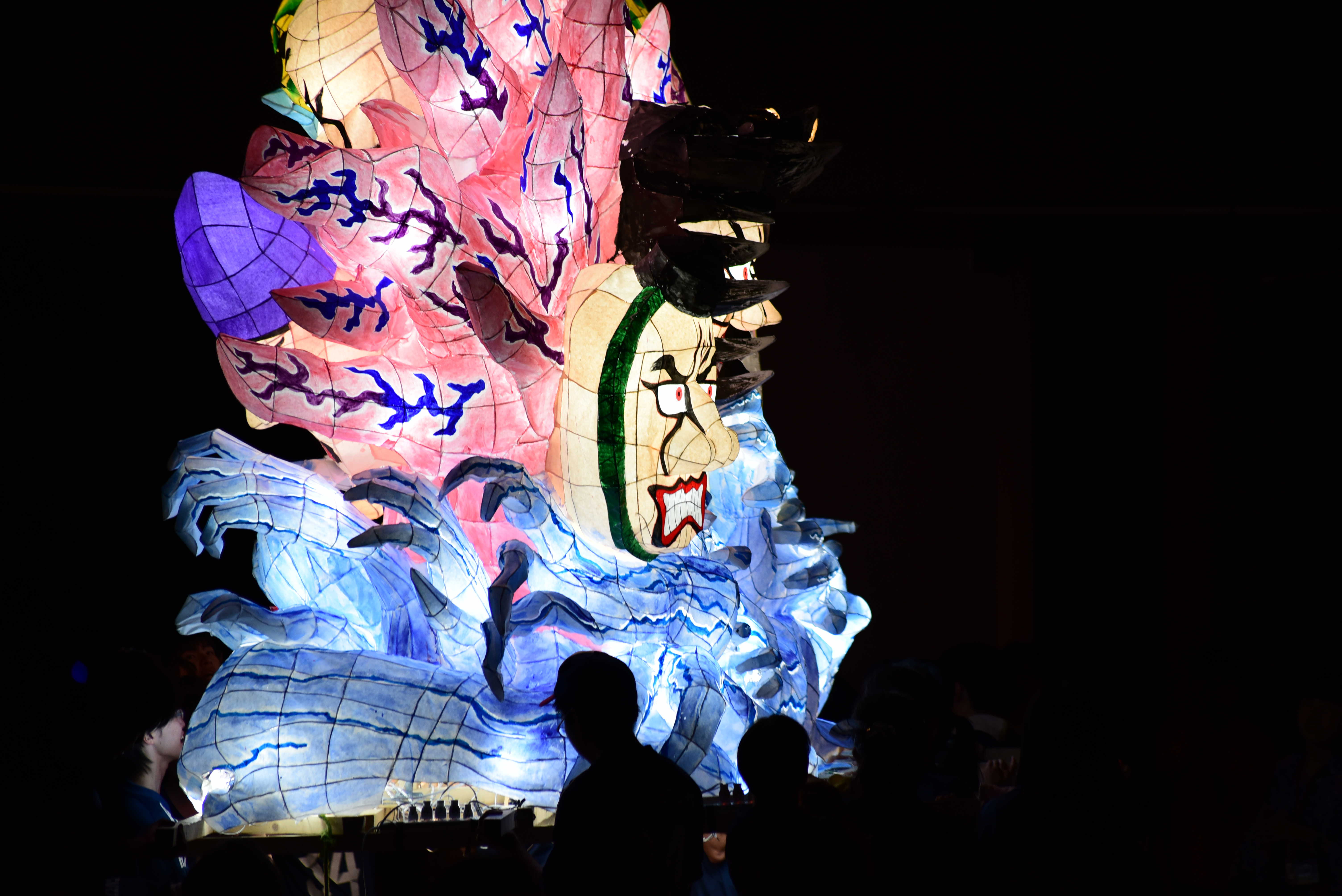 特筆すべきは鬼で、顔の針金はもちろん、色塗りや墨入れ技術が素晴らしかったです。髪の長さからしっかり女性らしさも感じられました。歯にロウを塗っていると思いますが(違ったらすみません)、これにより鬼の気迫ある表情がより表現できていてよかったです。 着物についてですが、ここまで立体感を表現できたもの(特に袖口)、そして紺といった暗い色に書き割り・ロウ書きをしっかり行なった行灯は過去にないと思います。ねぶたのようでした。