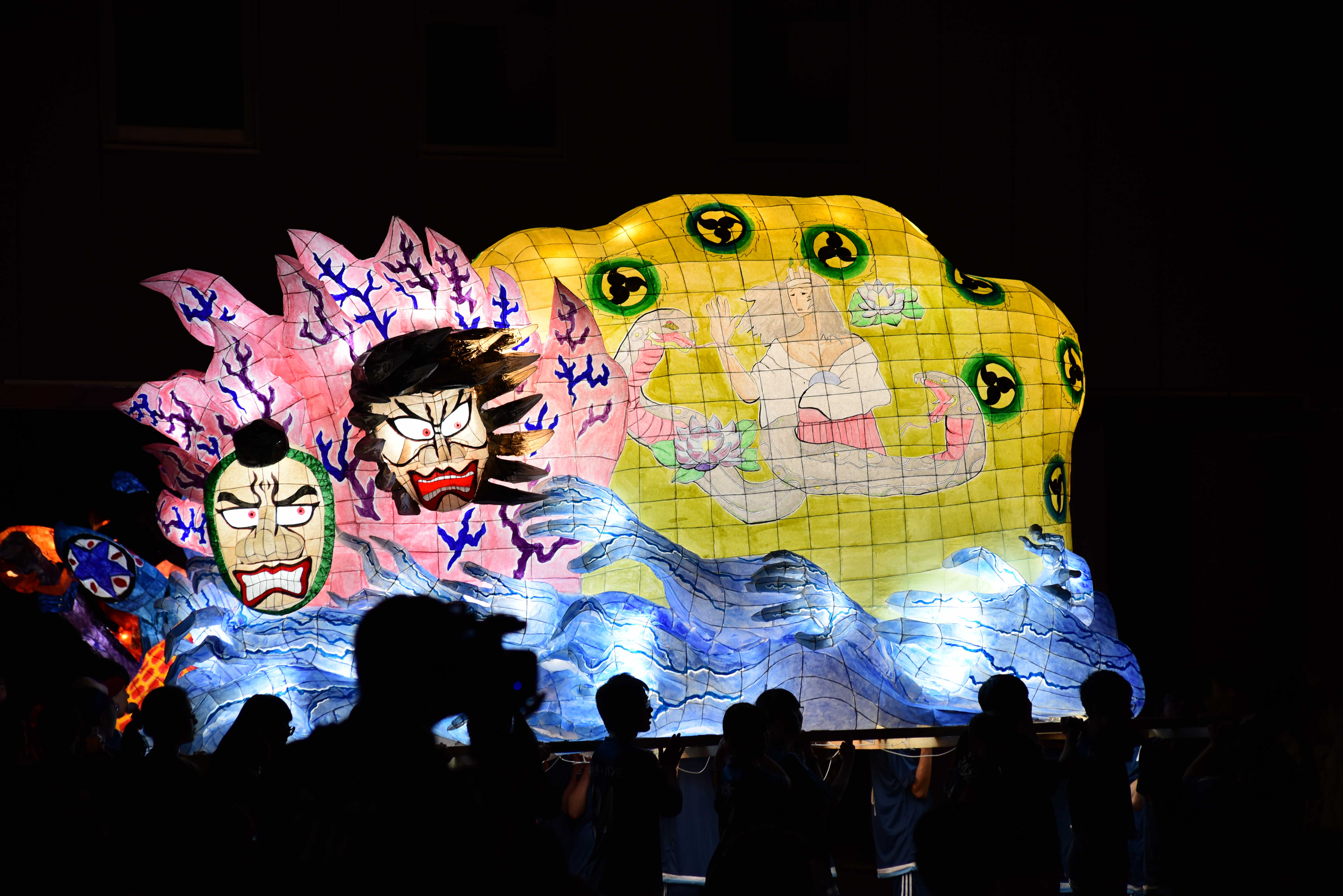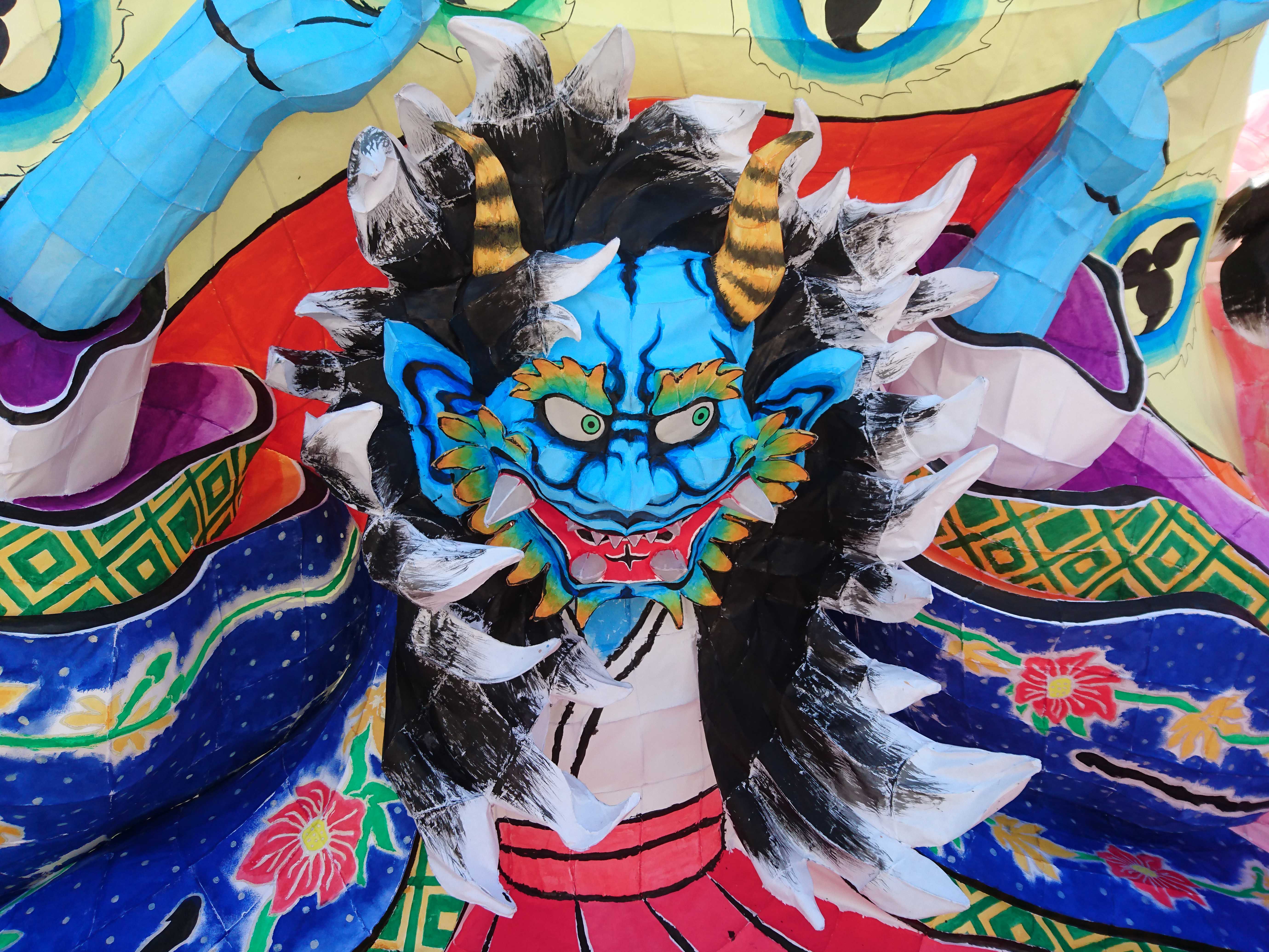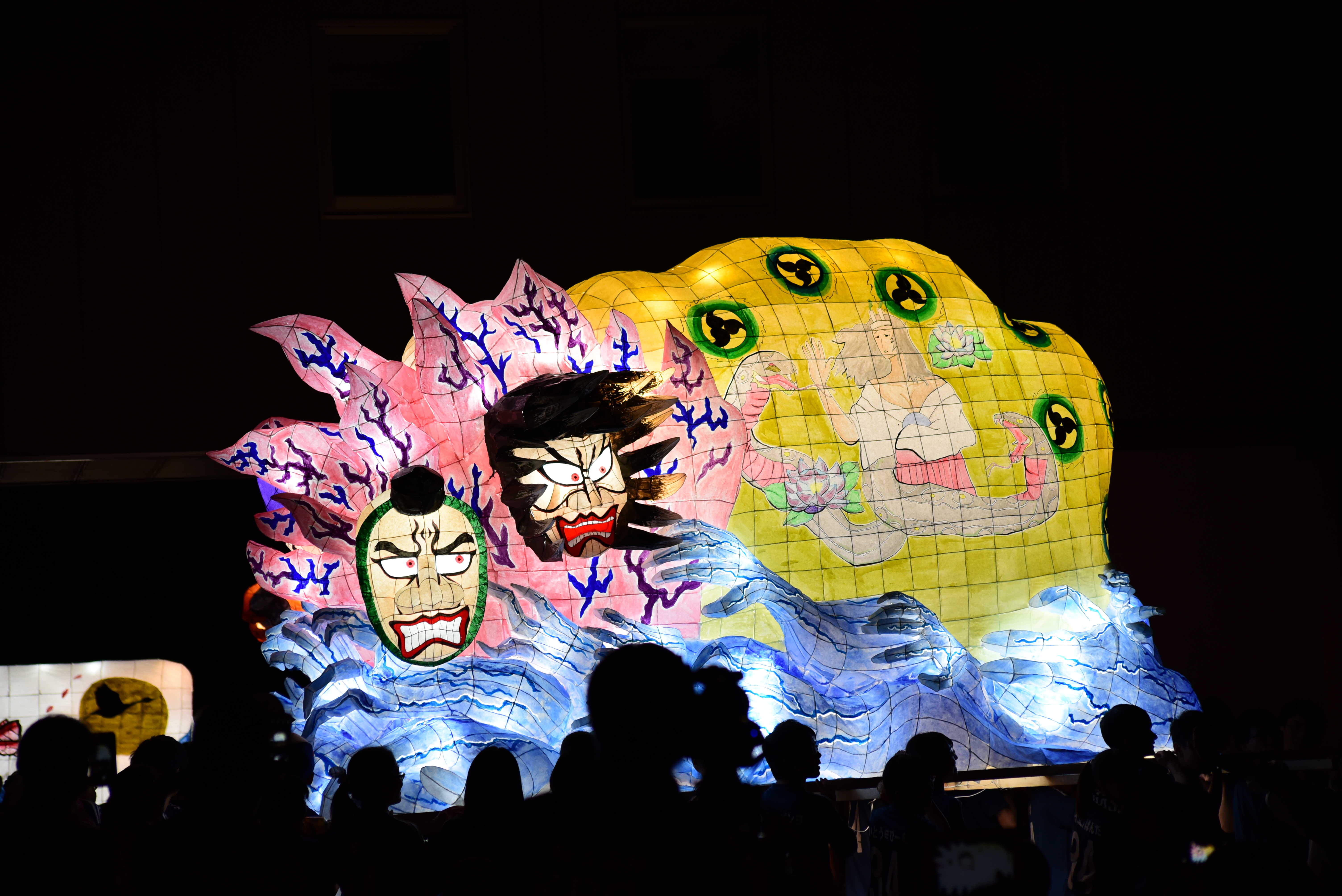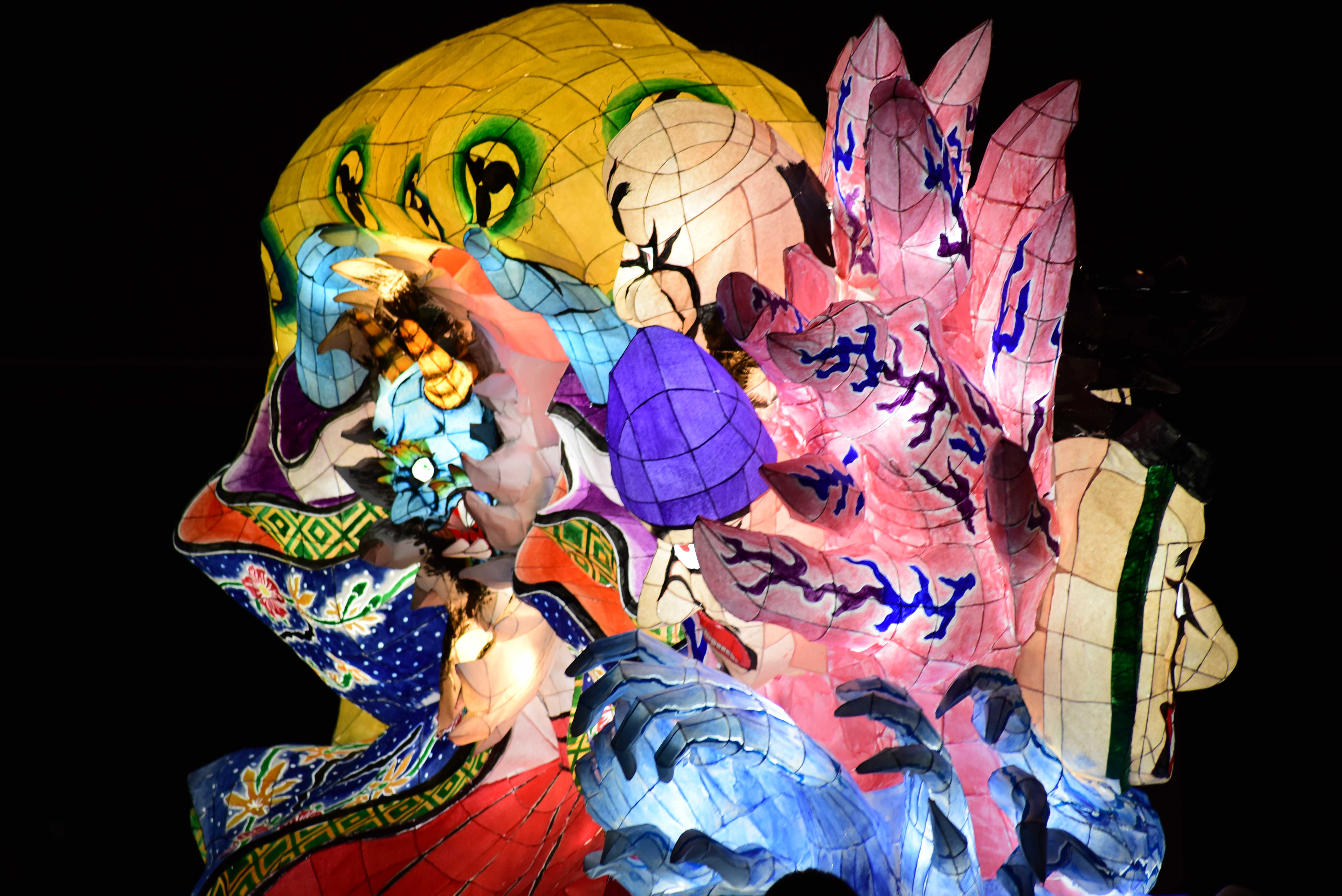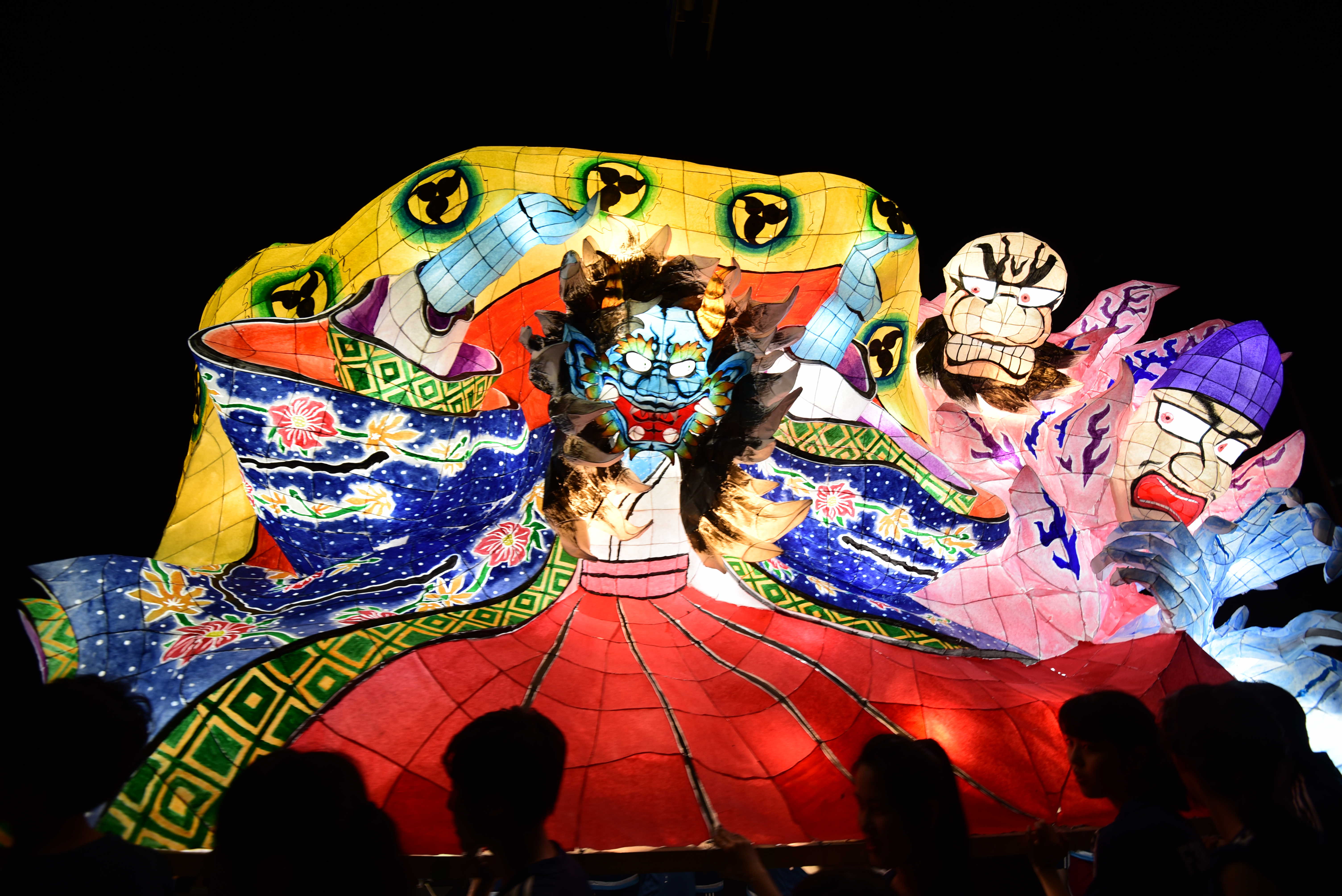 特筆すべきは鬼で、顔の針金はもちろん、色塗りや墨入れ技術が素晴らしかったです。髪の長さからしっかり女性らしさも感じられました。歯にロウを塗っていると思いますが(違ったらすみません)、これにより鬼の気迫ある表情がより表現できていてよかったです。 着物についてですが、ここまで立体感を表現できたもの(特に袖口)、そして紺といった暗い色に書き割り・ロウ書きをしっかり行なった行灯は過去にないと思います。ねぶたのようでした。