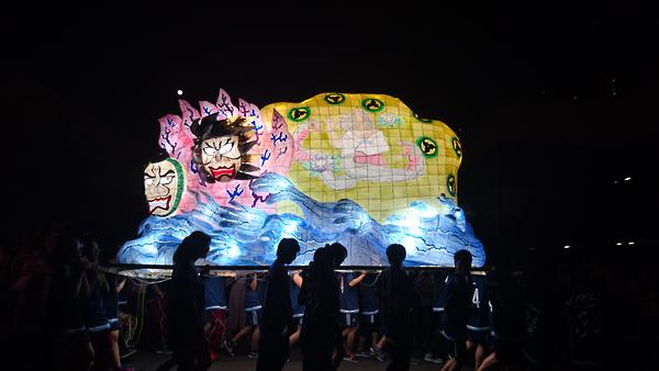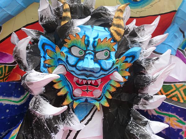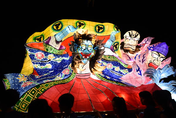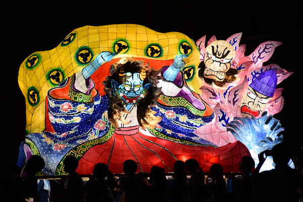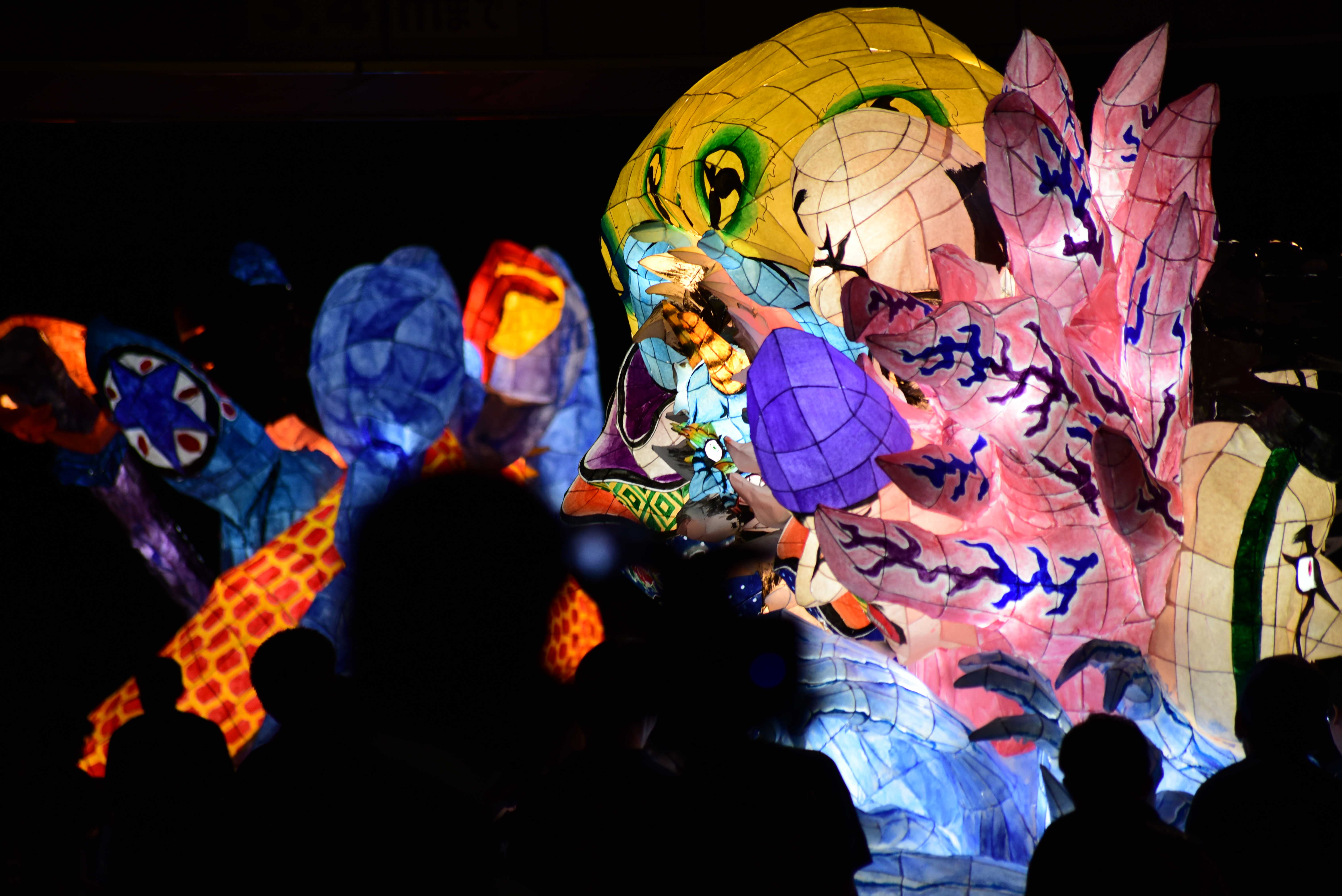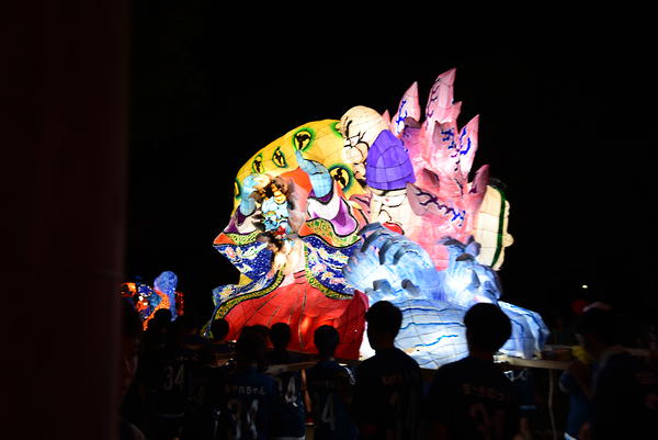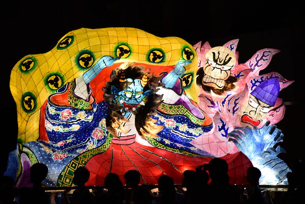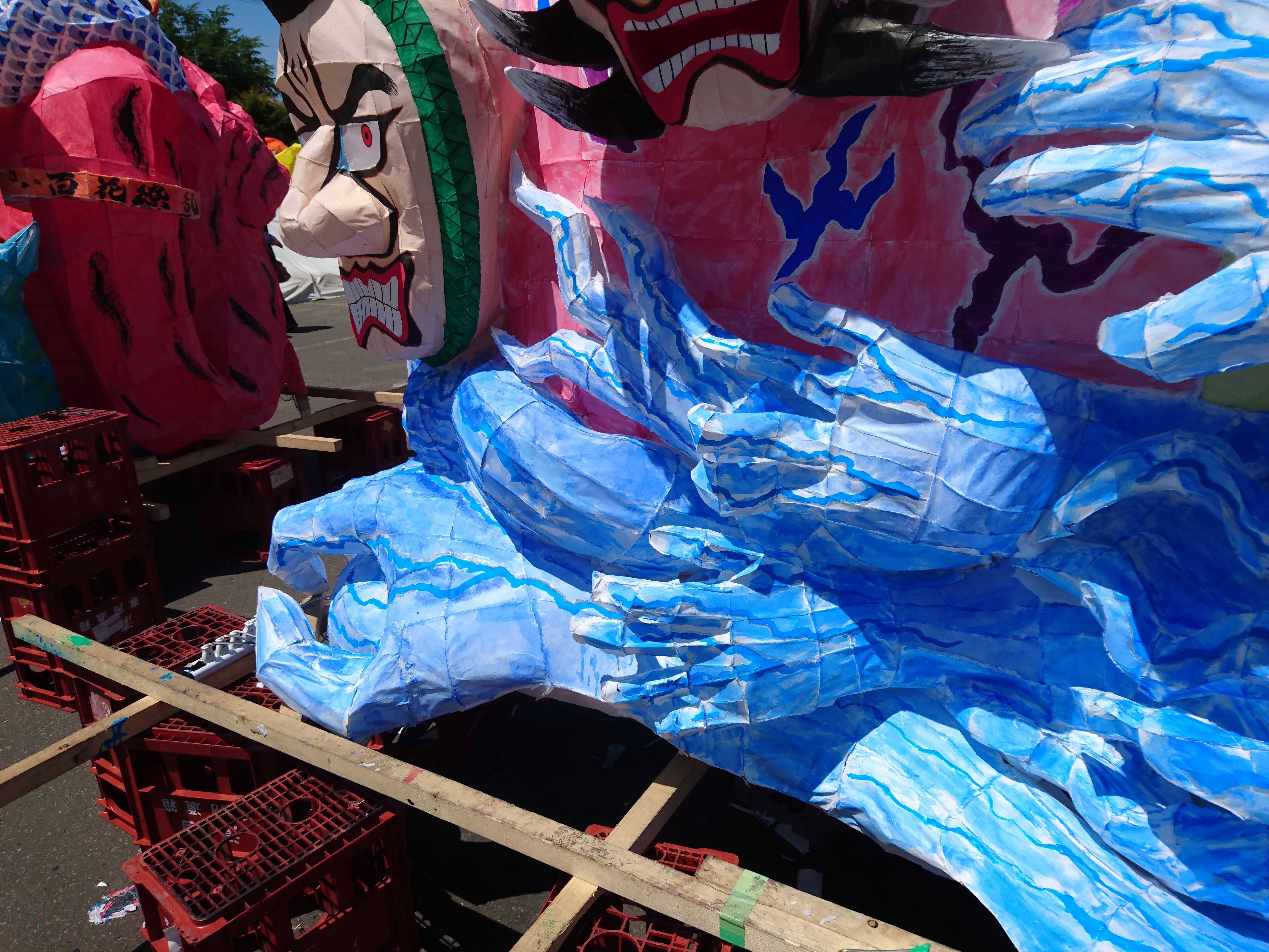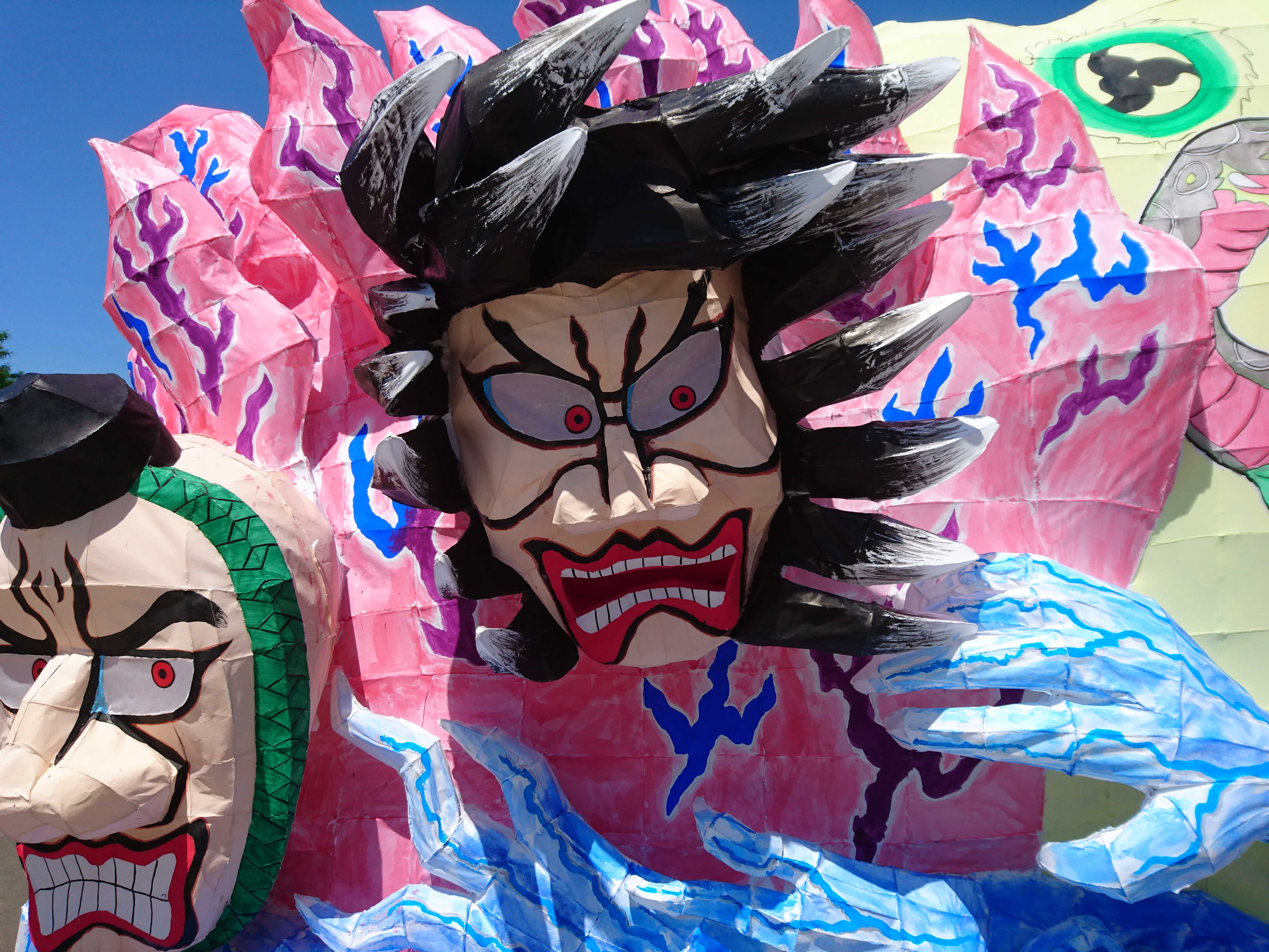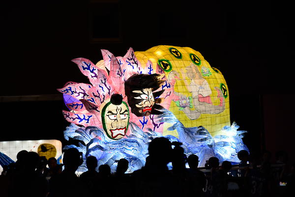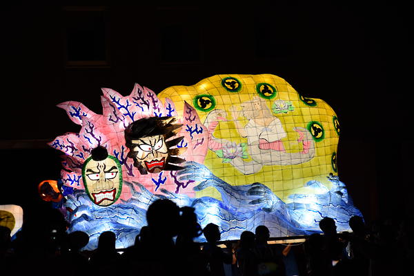 特筆すべきは鬼で、顔の針金はもちろん、色塗りや墨入れ技術が素晴らしかったです。髪の長さからしっかり女性らしさも感じられました。歯にロウを塗っていると思いますが(違ったらすみません)、これにより鬼の気迫ある表情がより表現できていてよかったです。 着物についてですが、ここまで立体感を表現できたもの(特に袖口)、そして紺といった暗い色に書き割り・ロウ書きをしっかり行なった行灯は過去にないと思います。ねぶたのようでした。