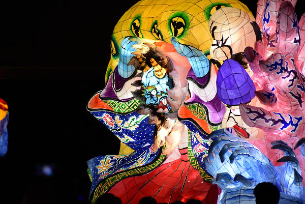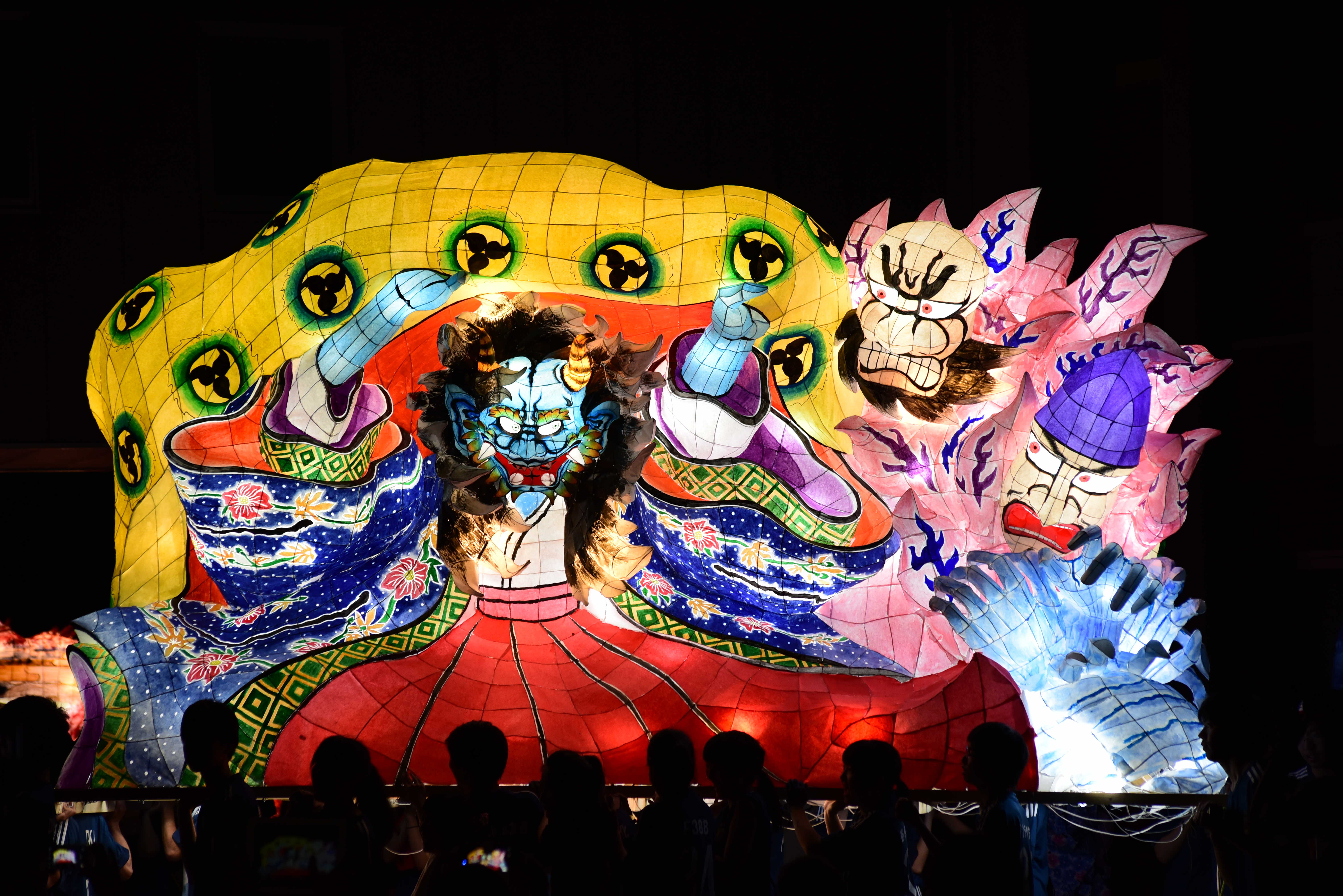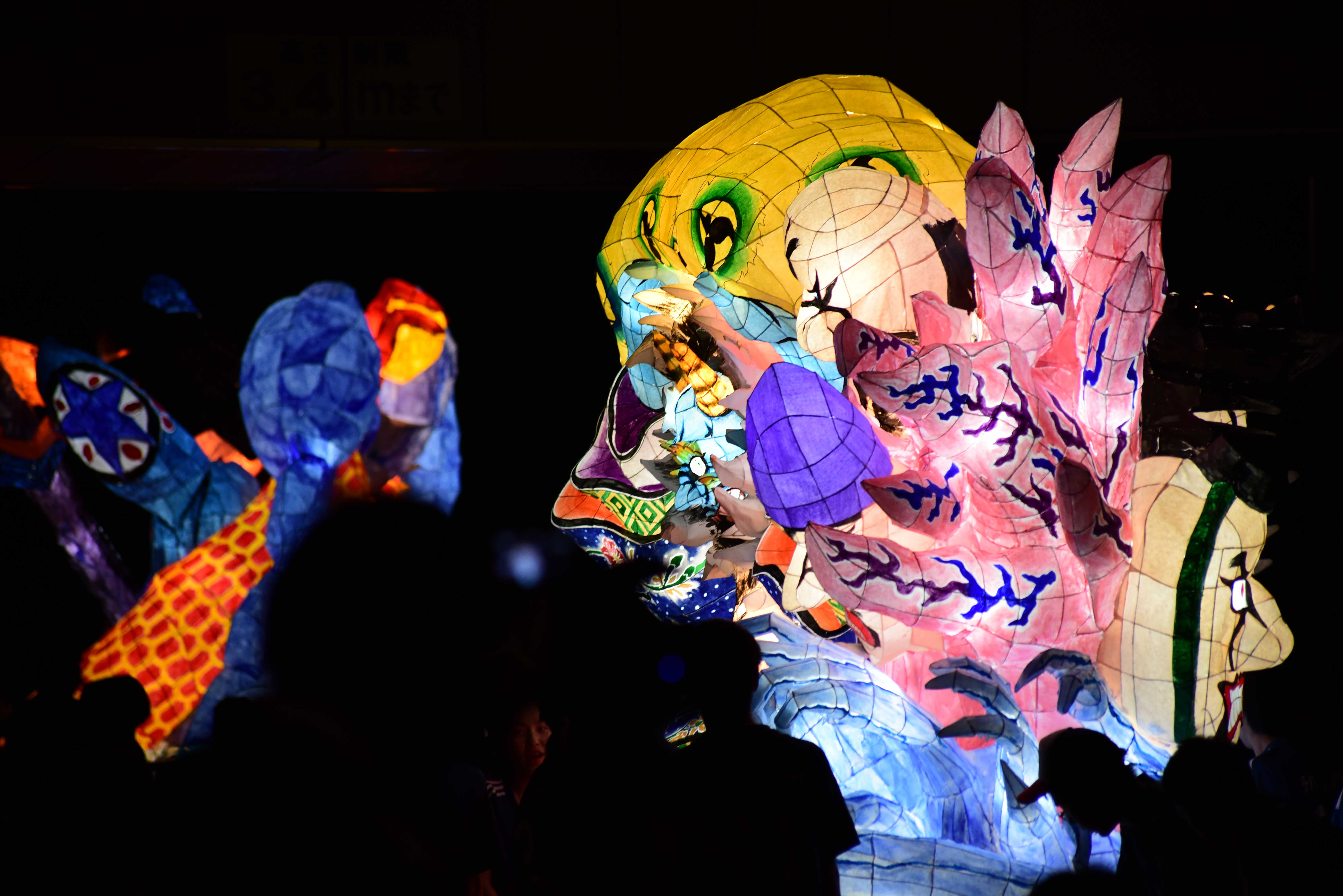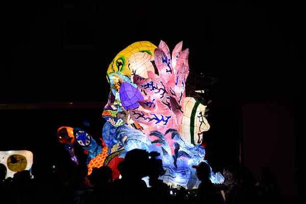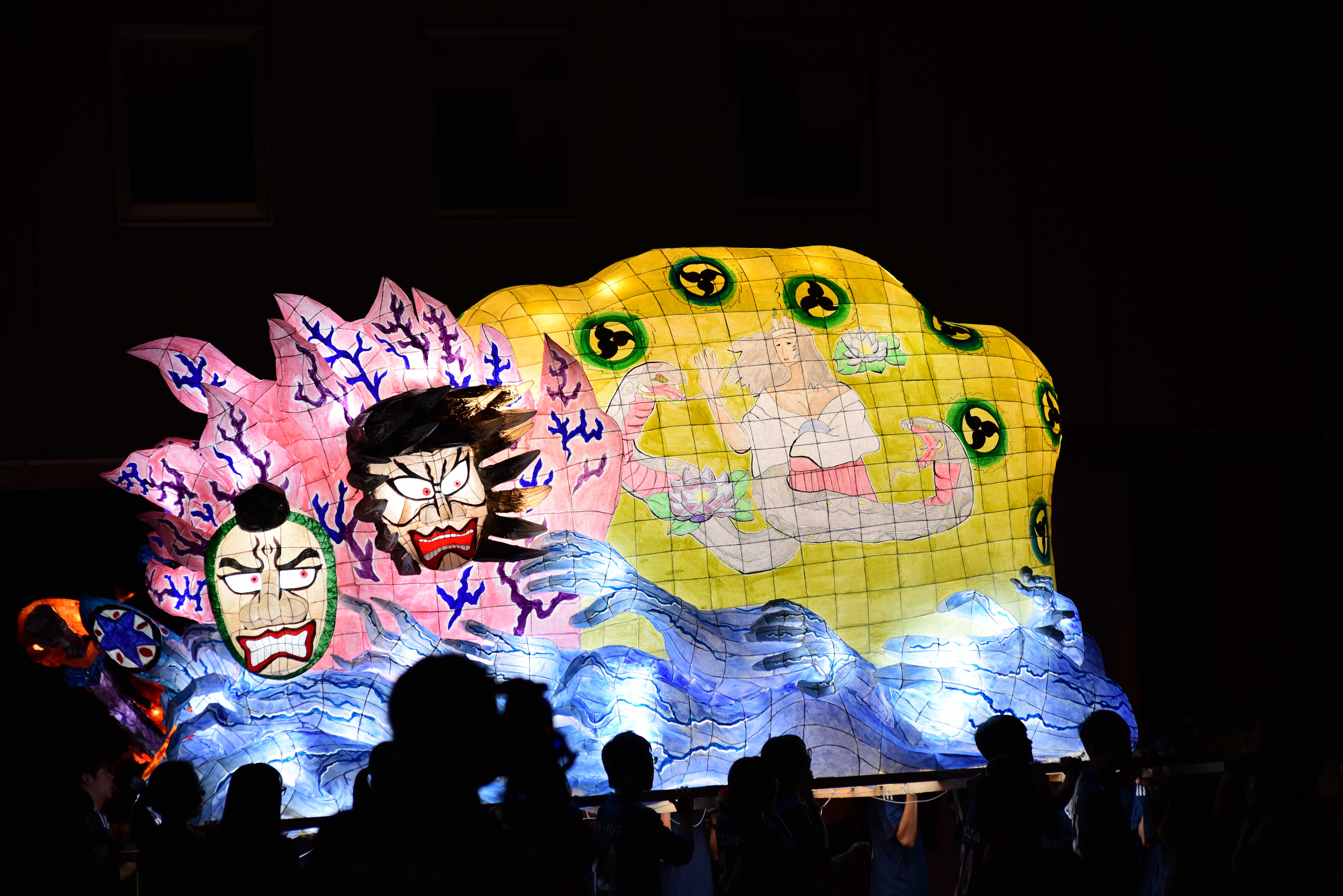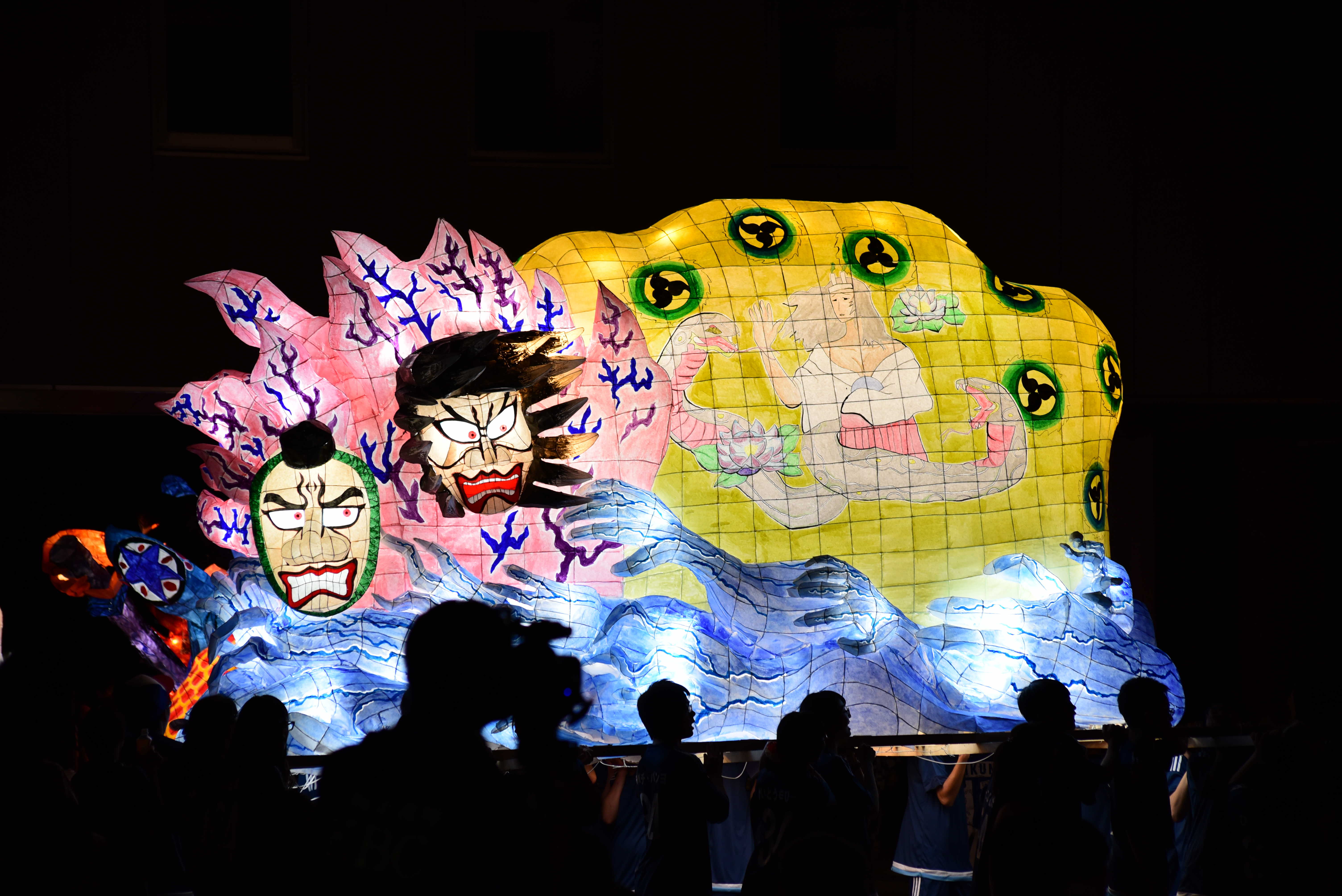 特筆すべきは鬼で、顔の針金はもちろん、色塗りや墨入れ技術が素晴らしかったです。髪の長さからしっかり女性らしさも感じられました。歯にロウを塗っていると思いますが(違ったらすみません)、これにより鬼の気迫ある表情がより表現できていてよかったです。 着物についてですが、ここまで立体感を表現できたもの(特に袖口)、そして紺といった暗い色に書き割り・ロウ書きをしっかり行なった行灯は過去にないと思います。ねぶたのようでした。