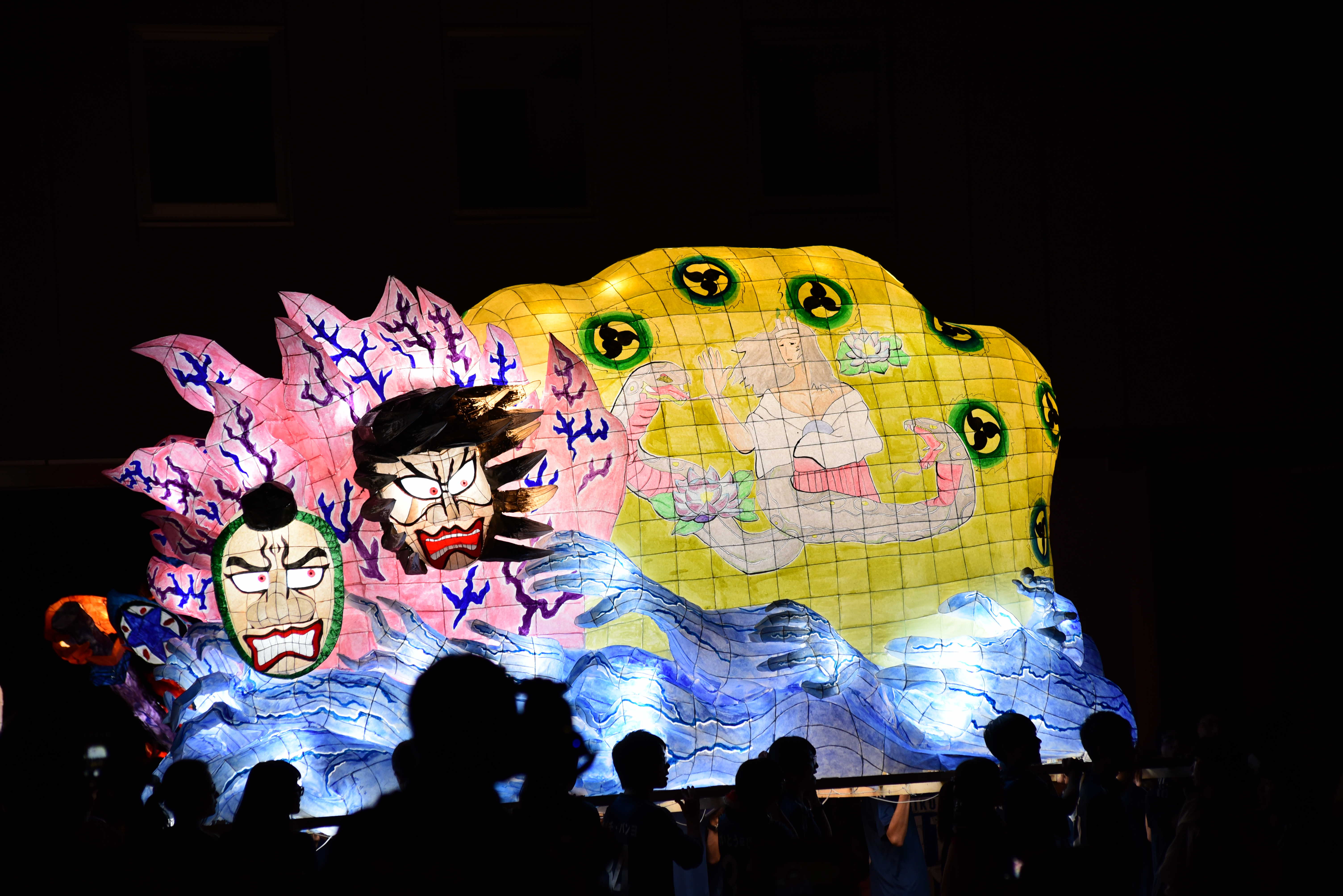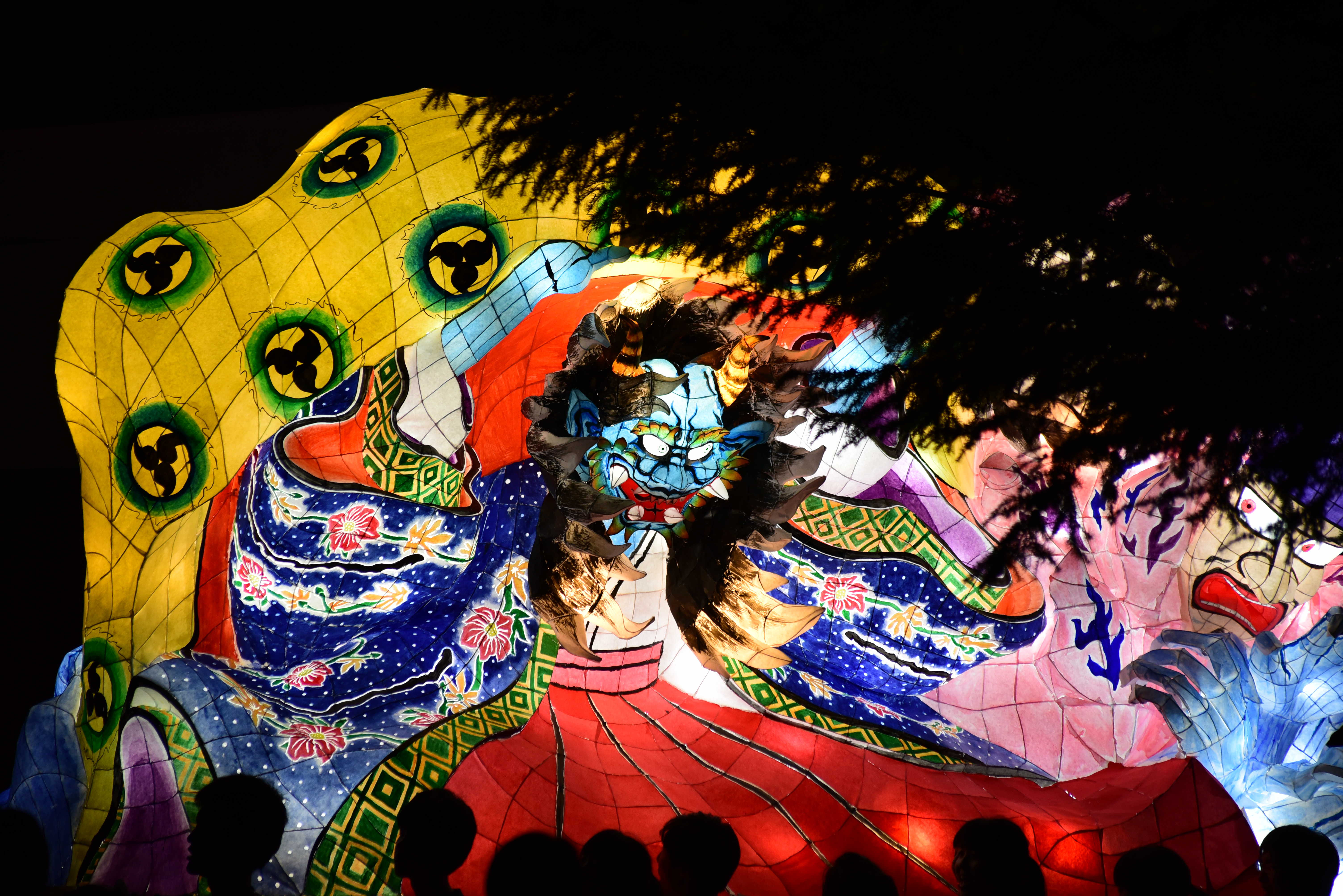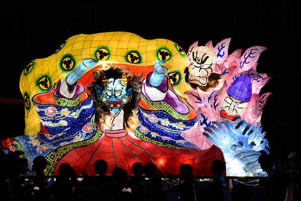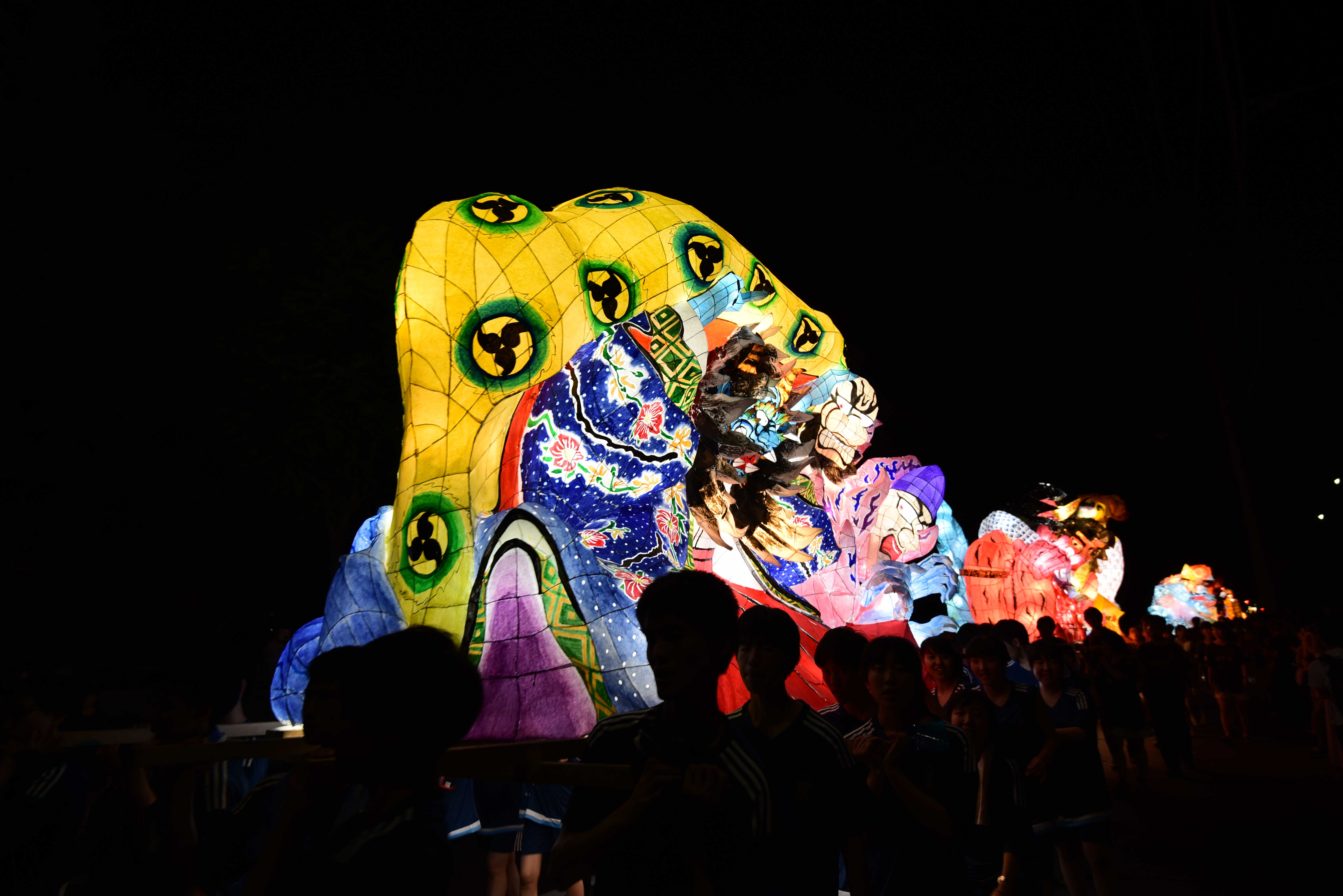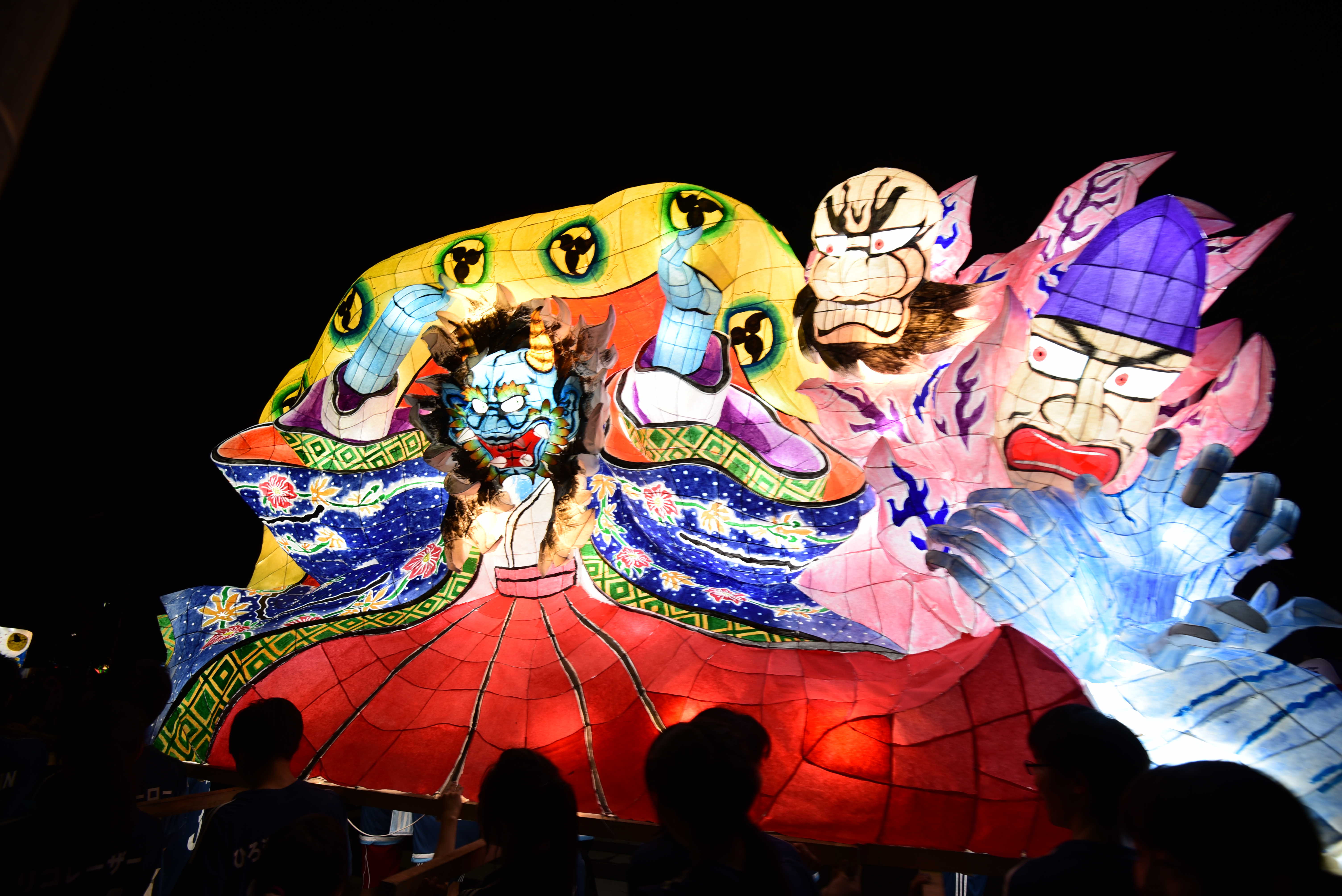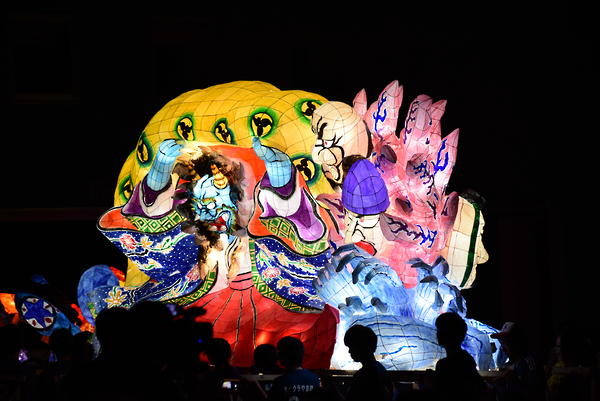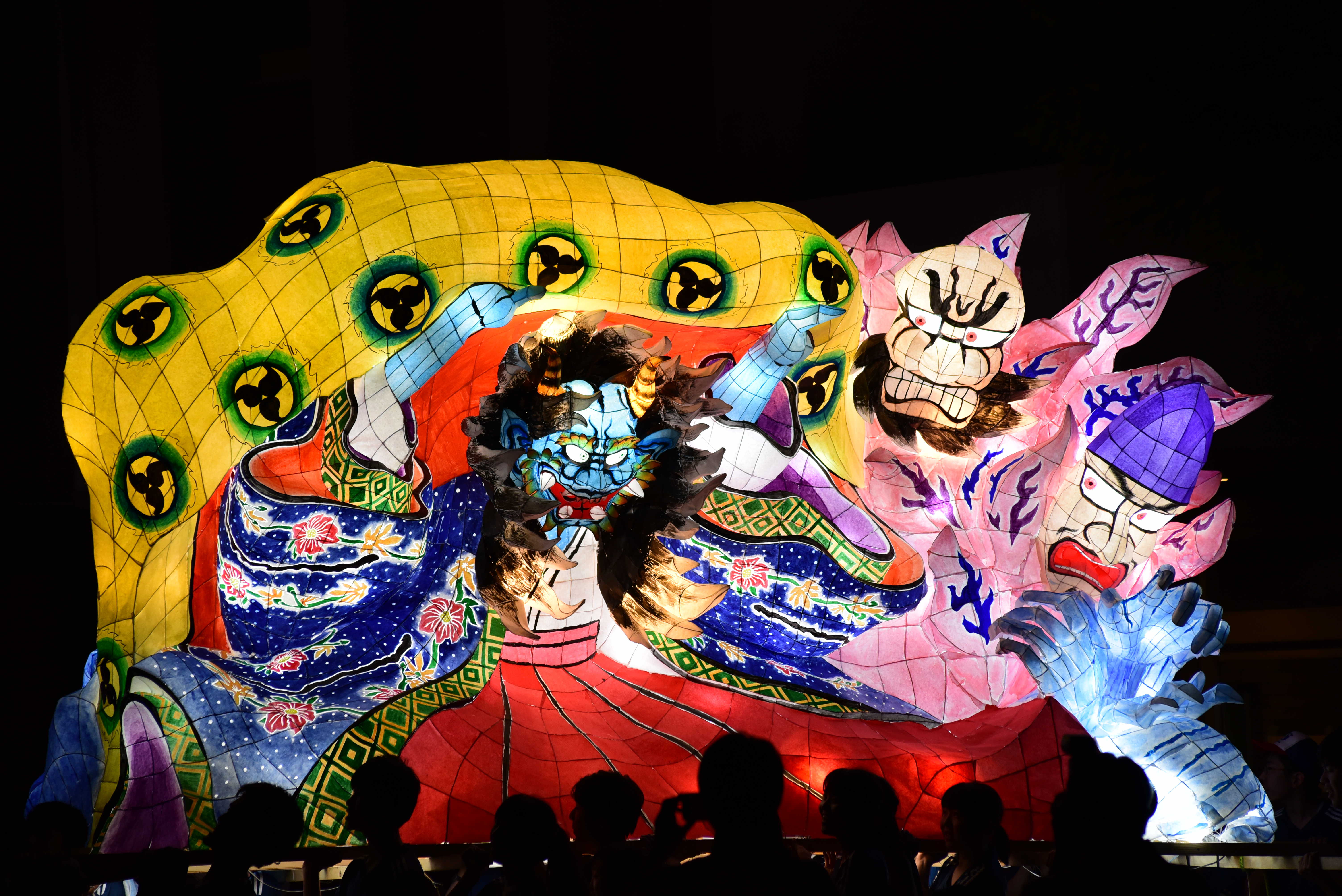 特筆すべきは鬼で、顔の針金はもちろん、色塗りや墨入れ技術が素晴らしかったです。髪の長さからしっかり女性らしさも感じられました。歯にロウを塗っていると思いますが(違ったらすみません)、これにより鬼の気迫ある表情がより表現できていてよかったです。 着物についてですが、ここまで立体感を表現できたもの(特に袖口)、そして紺といった暗い色に書き割り・ロウ書きをしっかり行なった行灯は過去にないと思います。ねぶたのようでした。