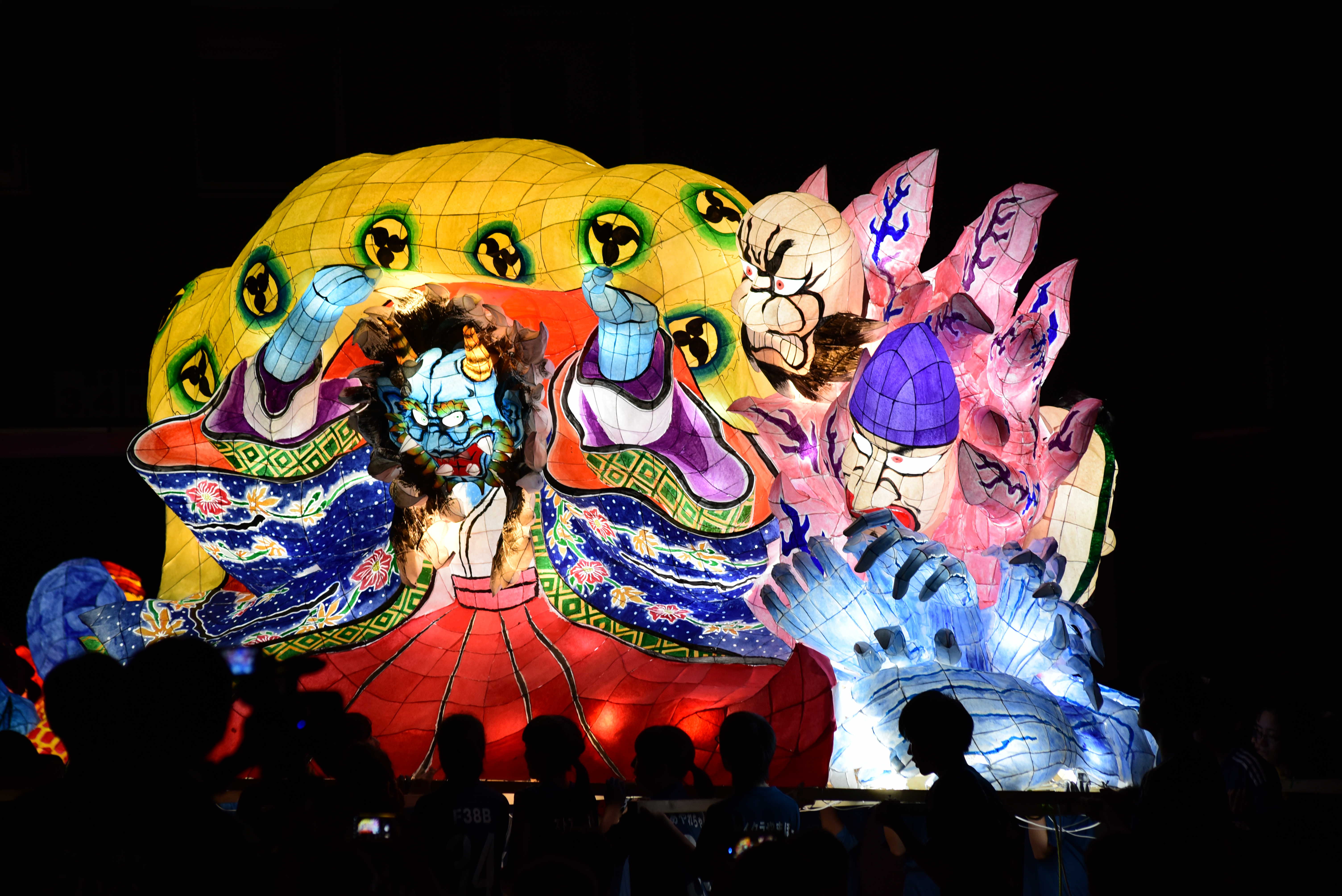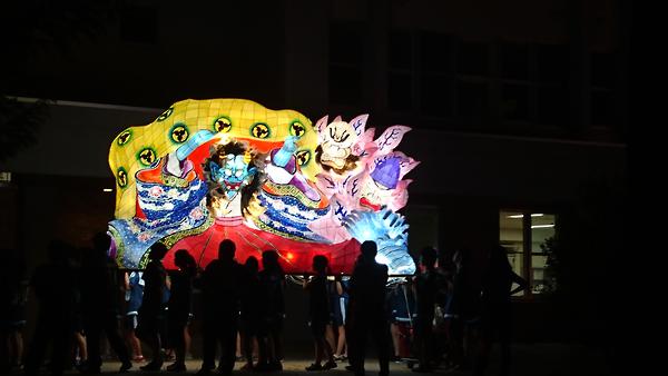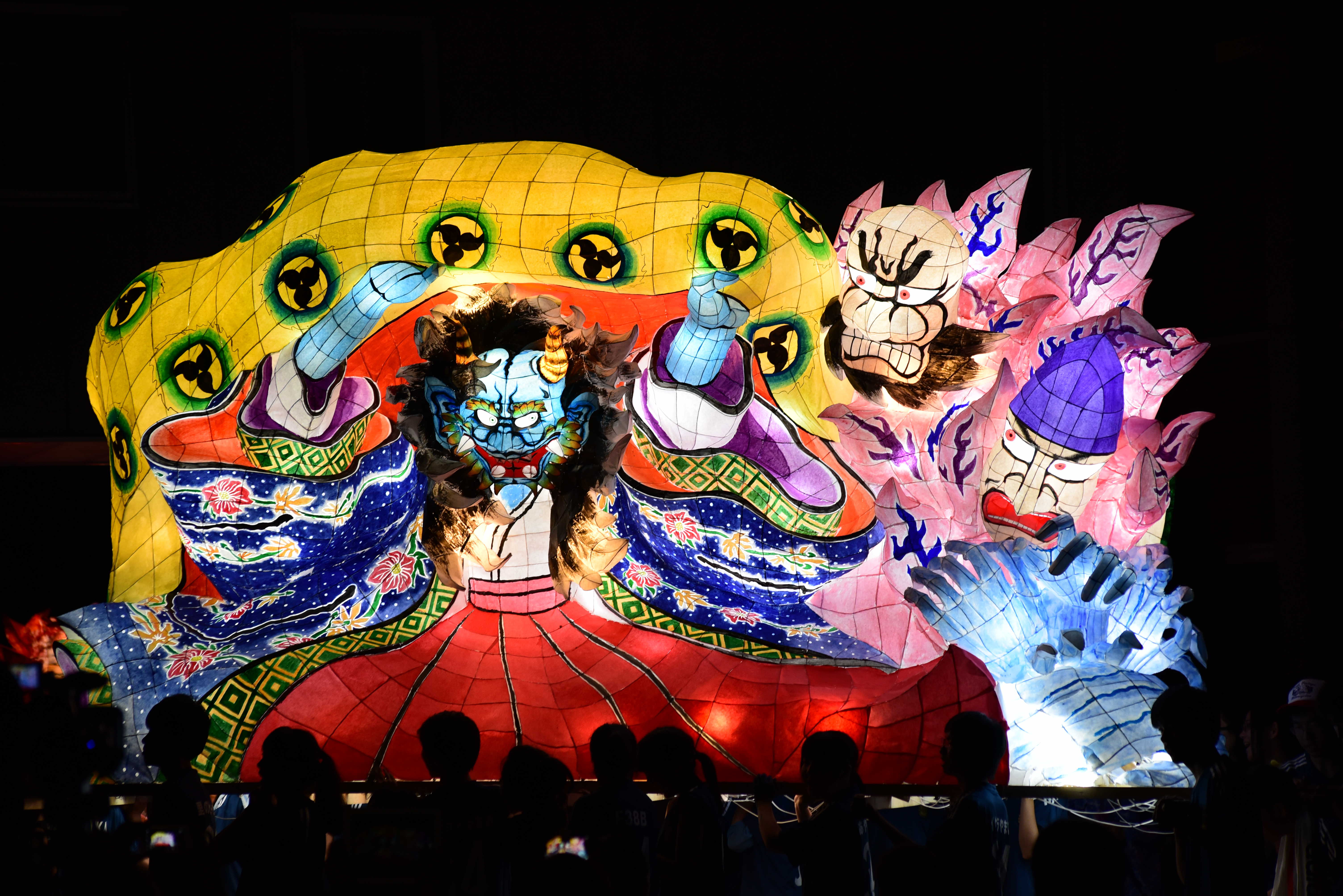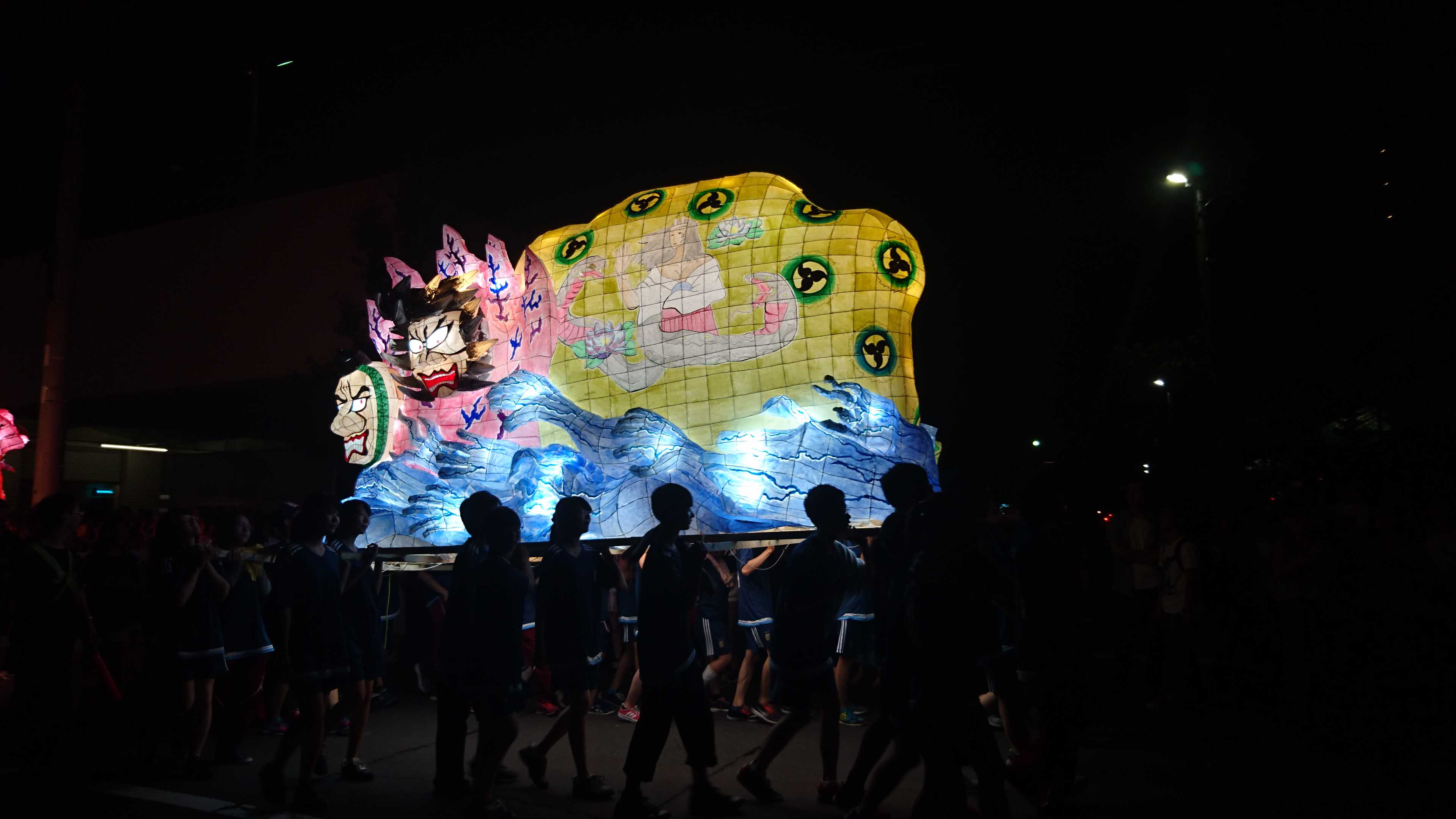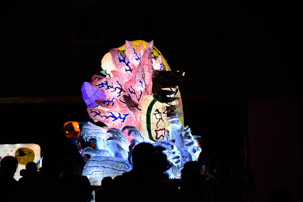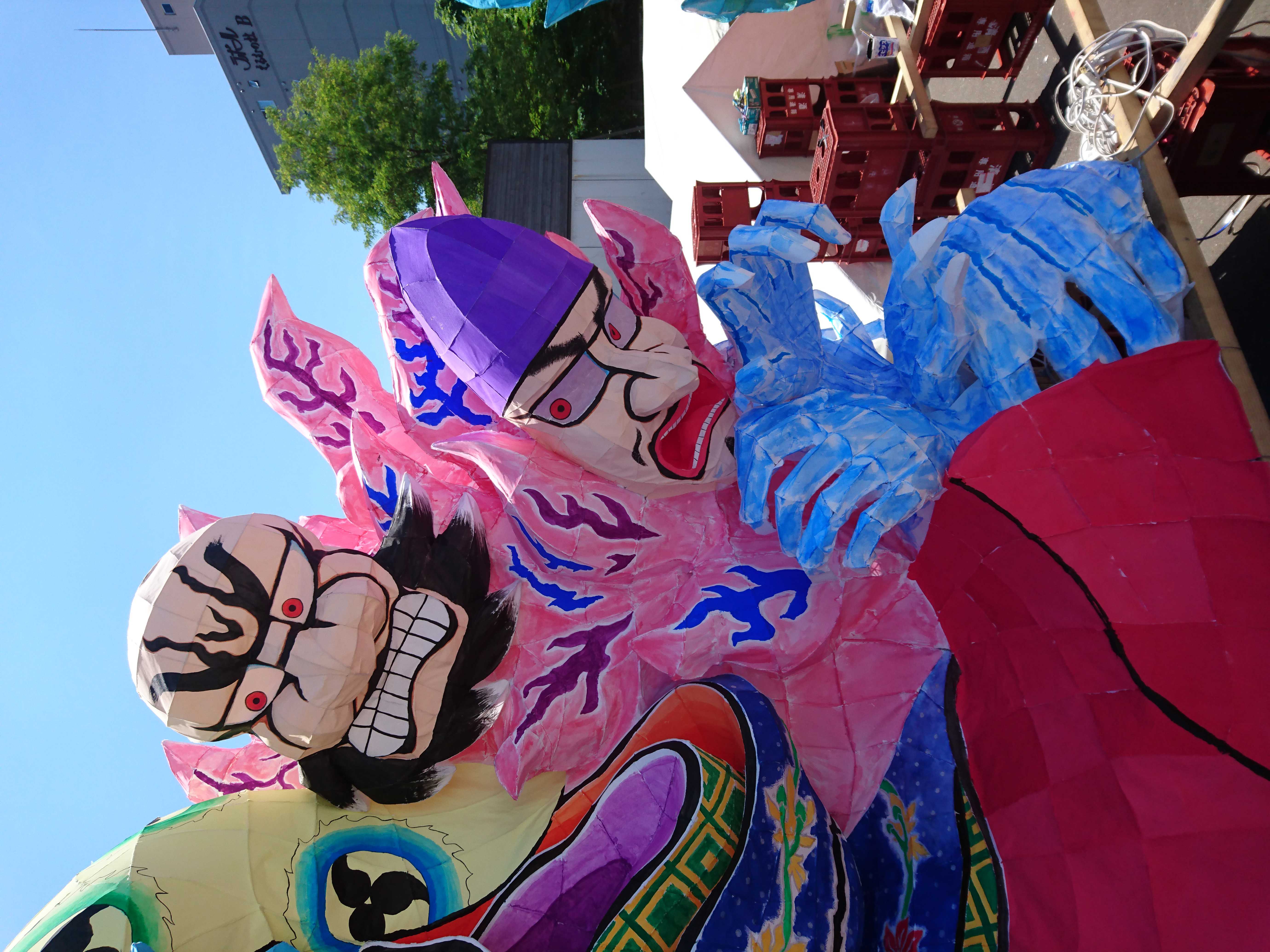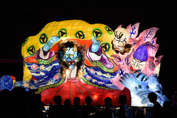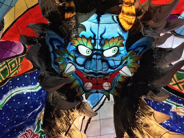 特筆すべきは鬼で、顔の針金はもちろん、色塗りや墨入れ技術が素晴らしかったです。髪の長さからしっかり女性らしさも感じられました。歯にロウを塗っていると思いますが(違ったらすみません)、これにより鬼の気迫ある表情がより表現できていてよかったです。 着物についてですが、ここまで立体感を表現できたもの(特に袖口)、そして紺といった暗い色に書き割り・ロウ書きをしっかり行なった行灯は過去にないと思います。ねぶたのようでした。