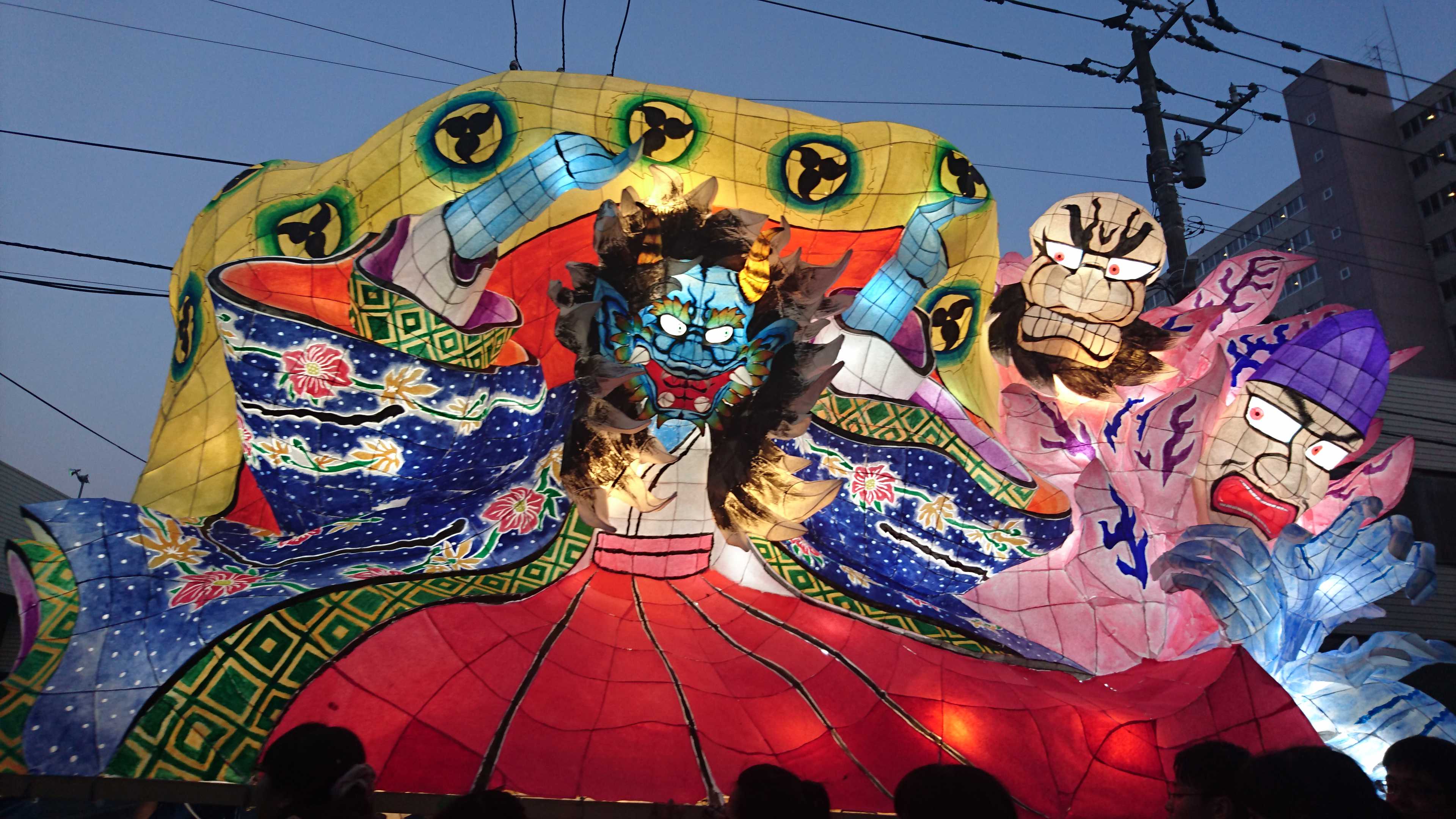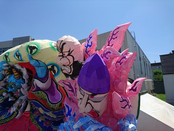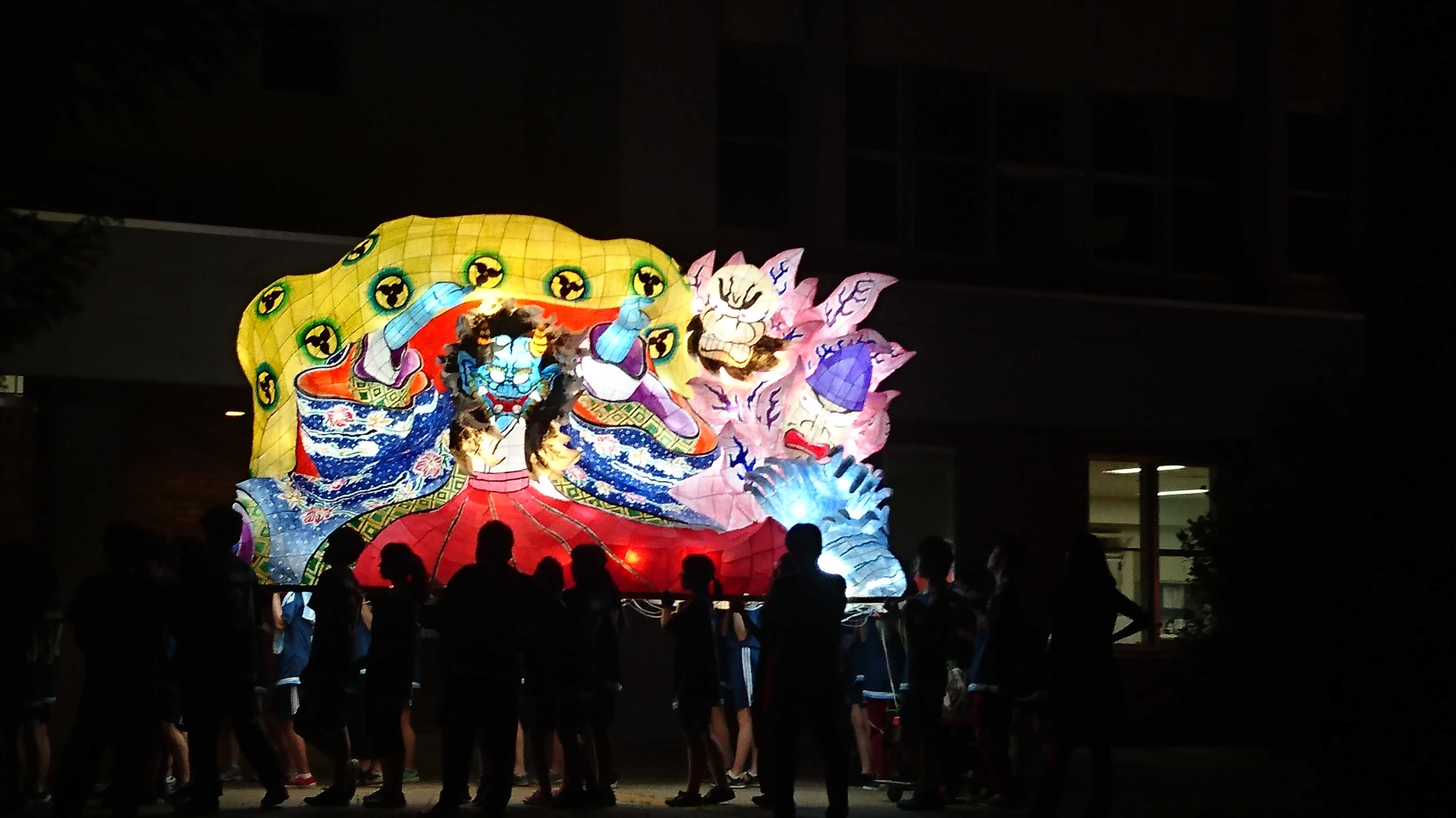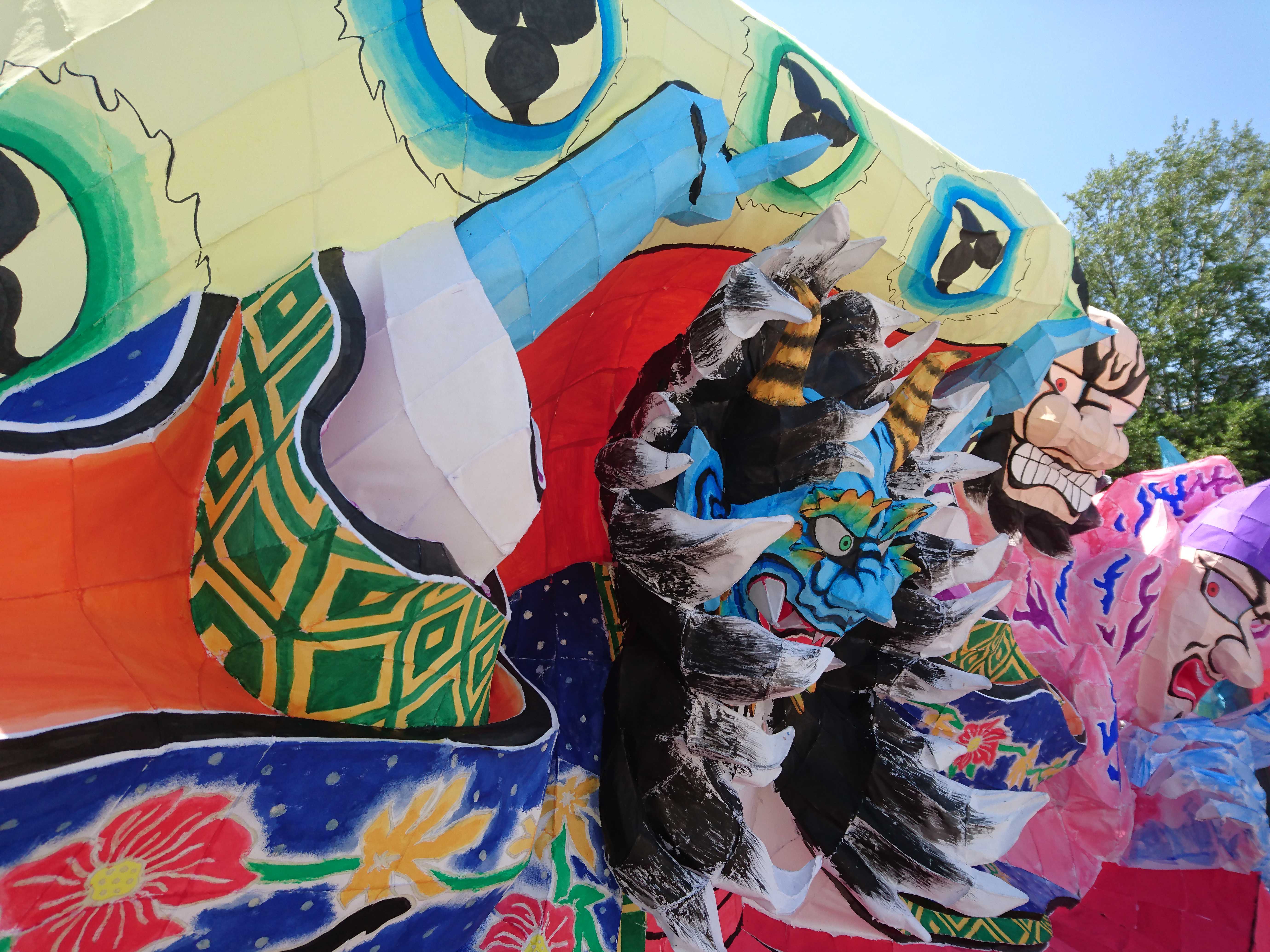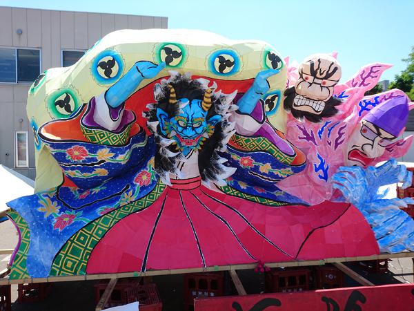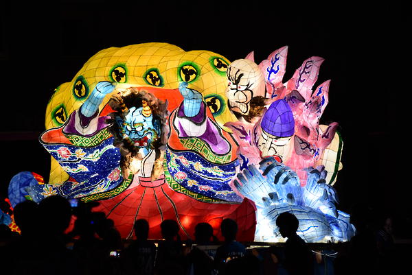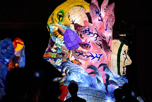 特筆すべきは鬼で、顔の針金はもちろん、色塗りや墨入れ技術が素晴らしかったです。髪の長さからしっかり女性らしさも感じられました。歯にロウを塗っていると思いますが(違ったらすみません)、これにより鬼の気迫ある表情がより表現できていてよかったです。 着物についてですが、ここまで立体感を表現できたもの(特に袖口)、そして紺といった暗い色に書き割り・ロウ書きをしっかり行なった行灯は過去にないと思います。ねぶたのようでした。