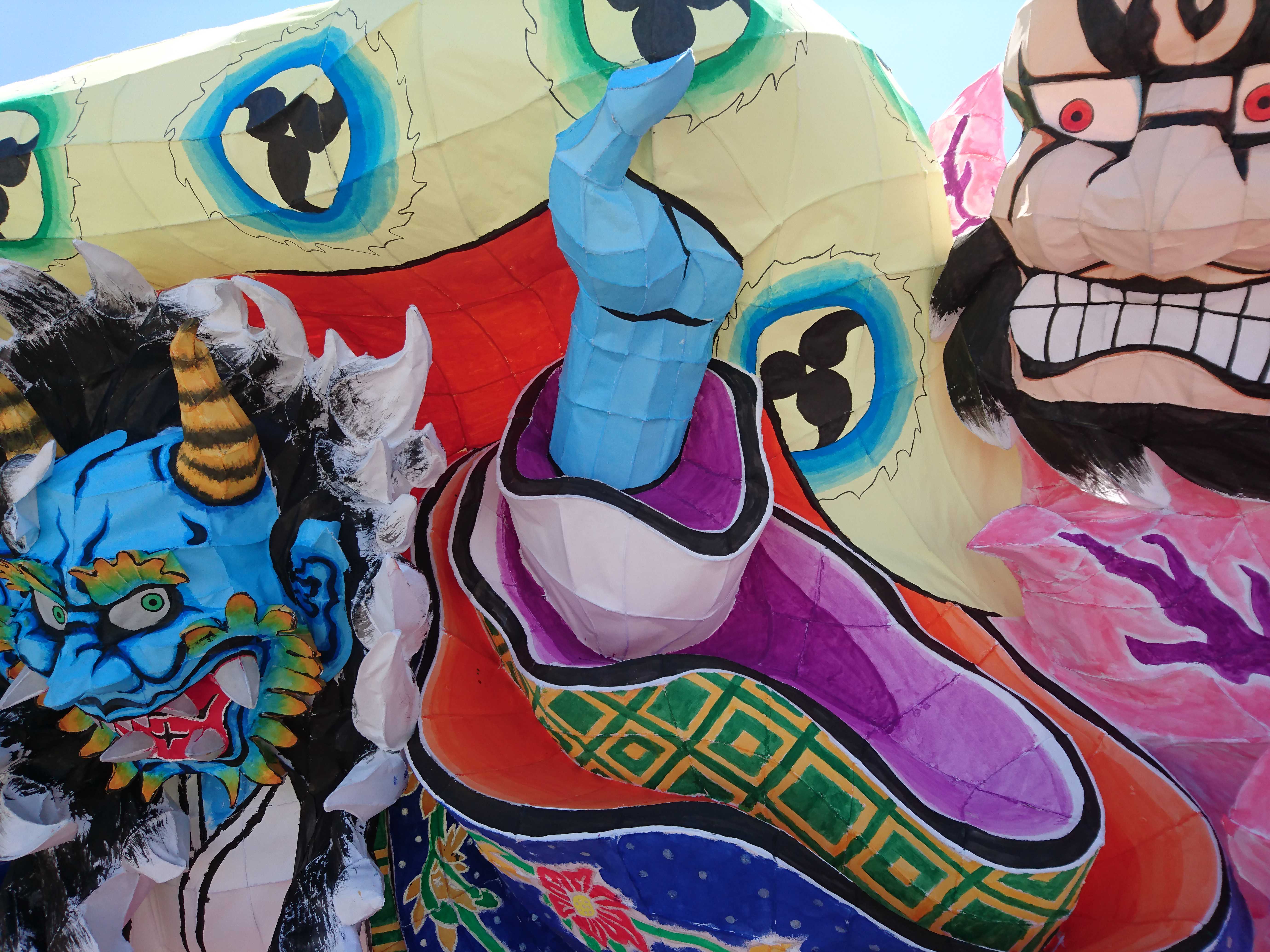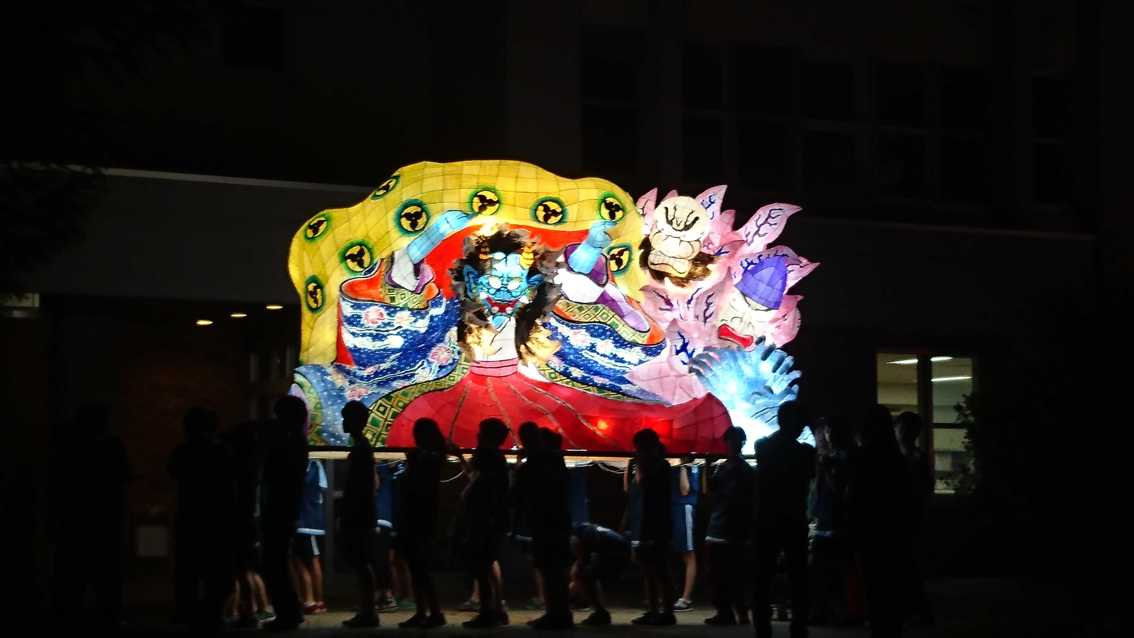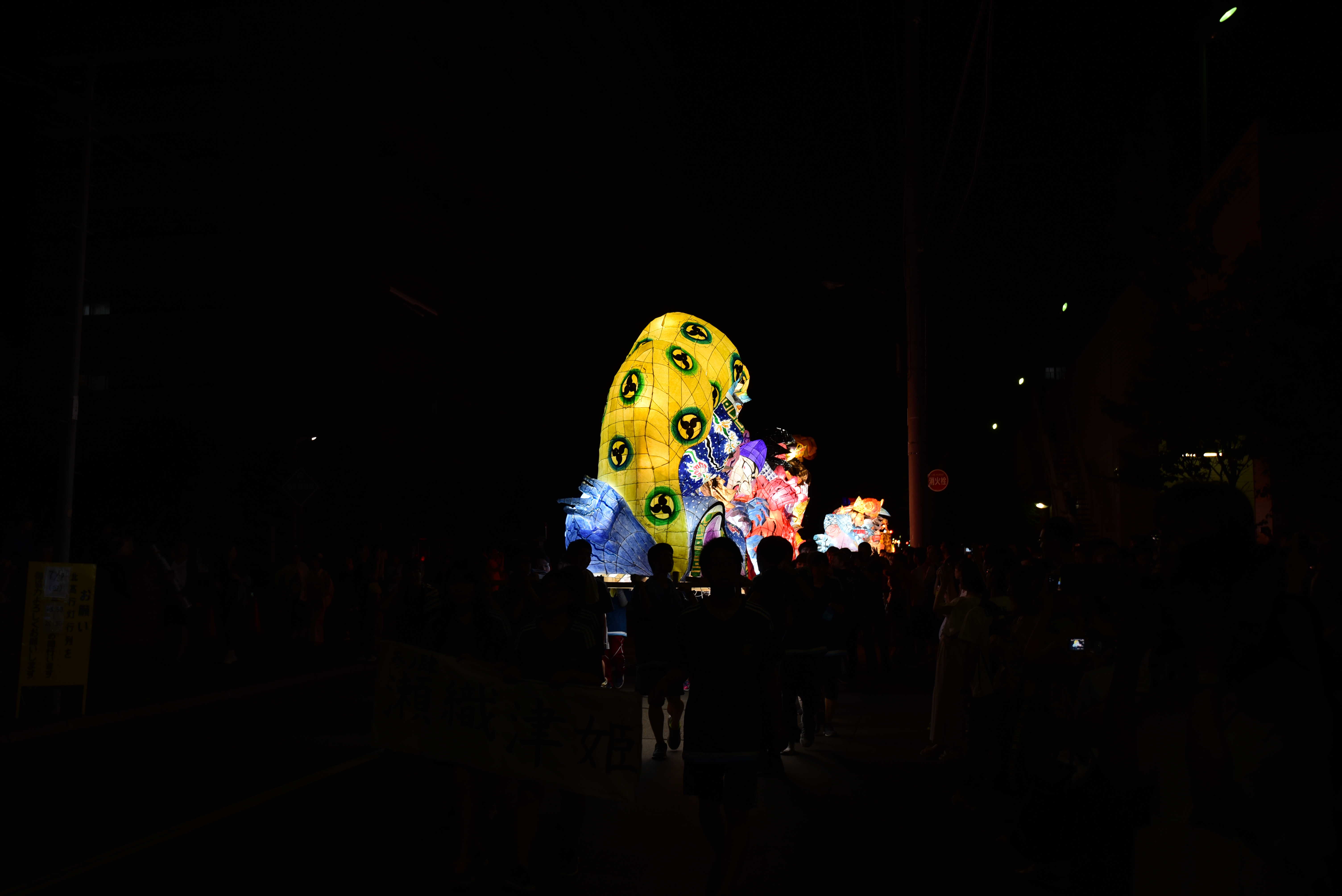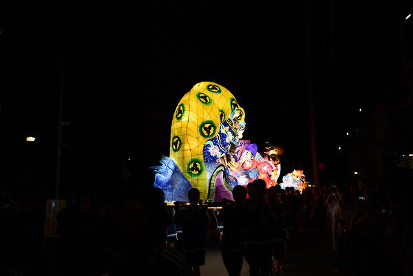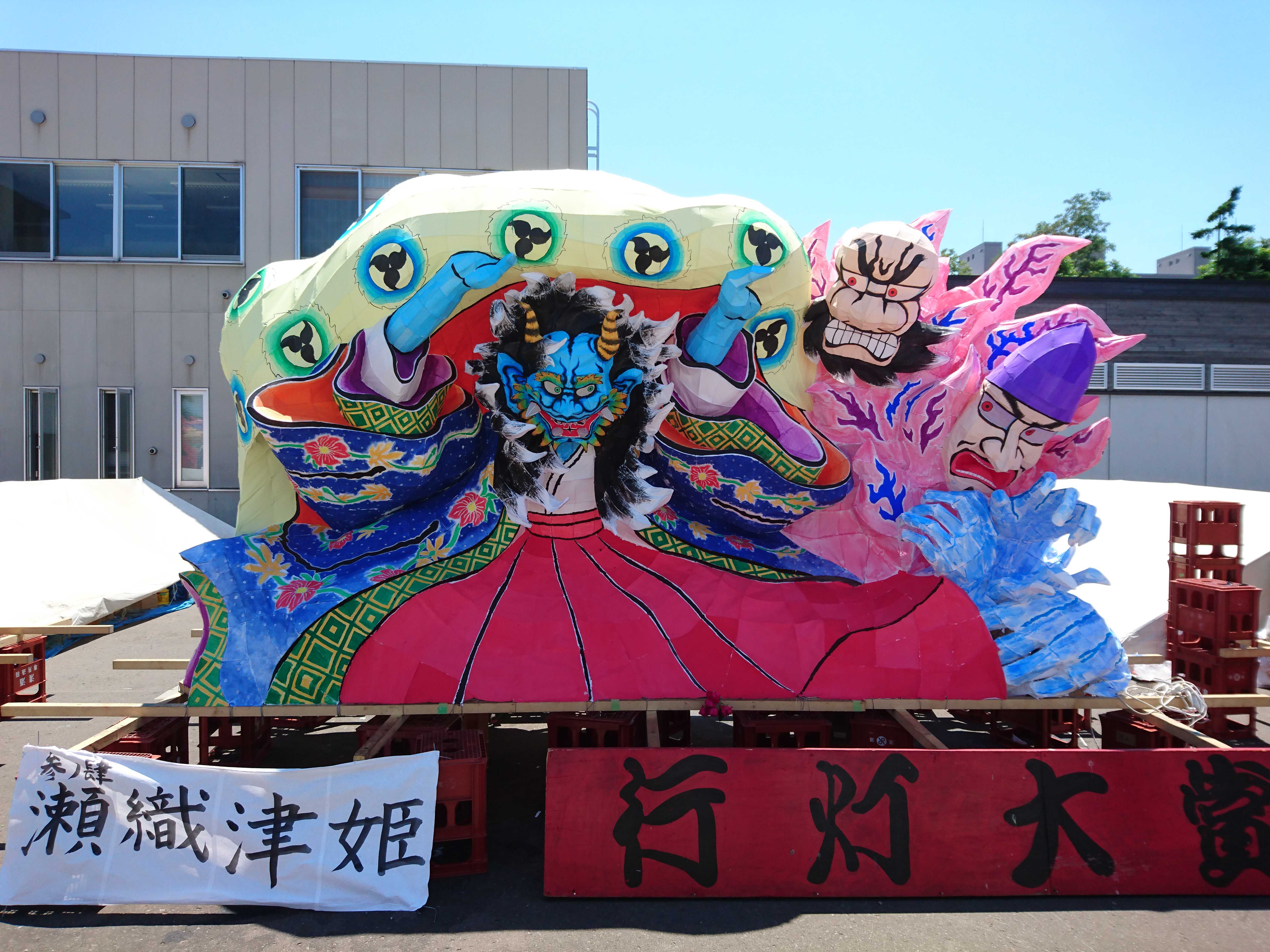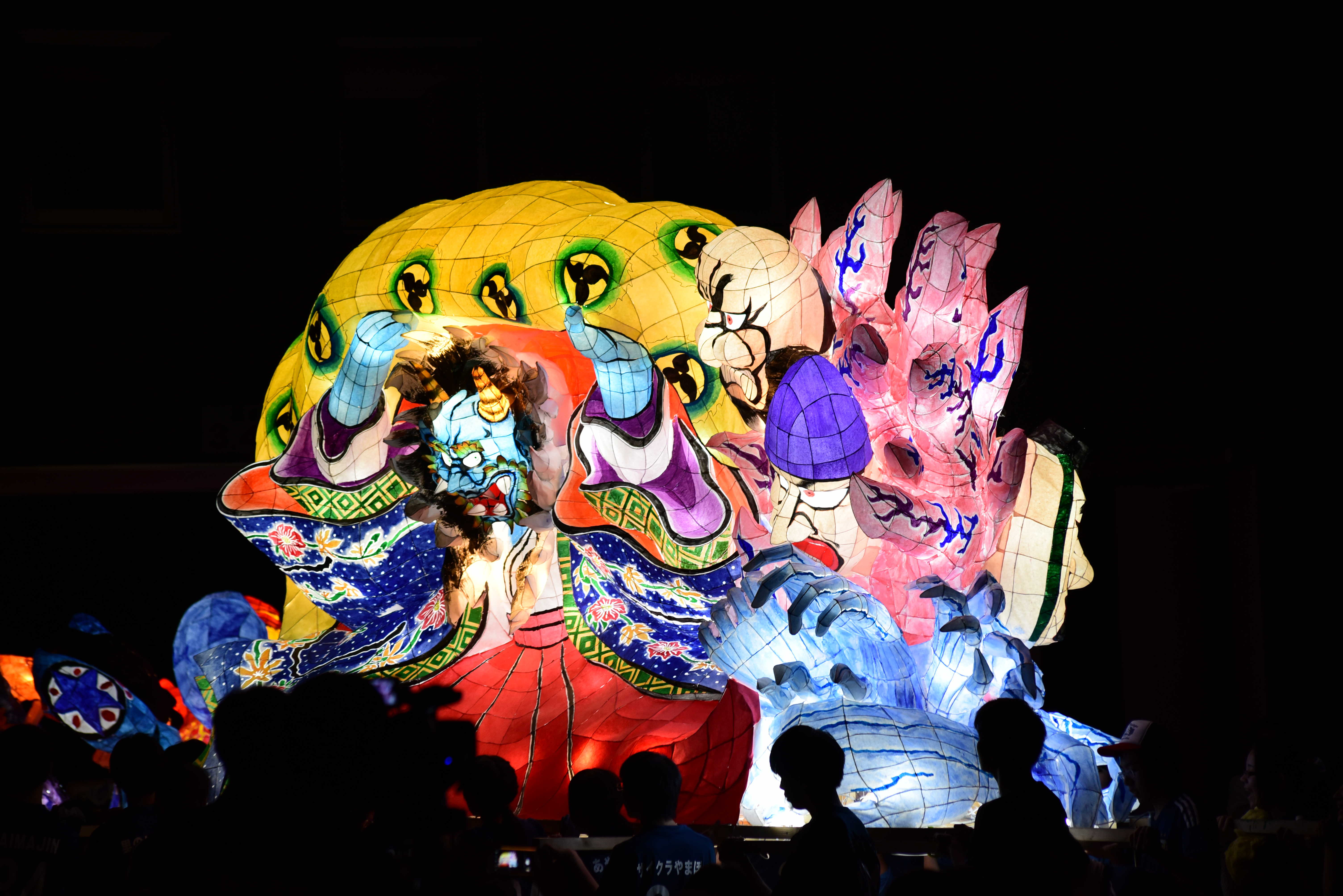 特筆すべきは鬼で、顔の針金はもちろん、色塗りや墨入れ技術が素晴らしかったです。髪の長さからしっかり女性らしさも感じられました。歯にロウを塗っていると思いますが(違ったらすみません)、これにより鬼の気迫ある表情がより表現できていてよかったです。 着物についてですが、ここまで立体感を表現できたもの(特に袖口)、そして紺といった暗い色に書き割り・ロウ書きをしっかり行なった行灯は過去にないと思います。ねぶたのようでした。