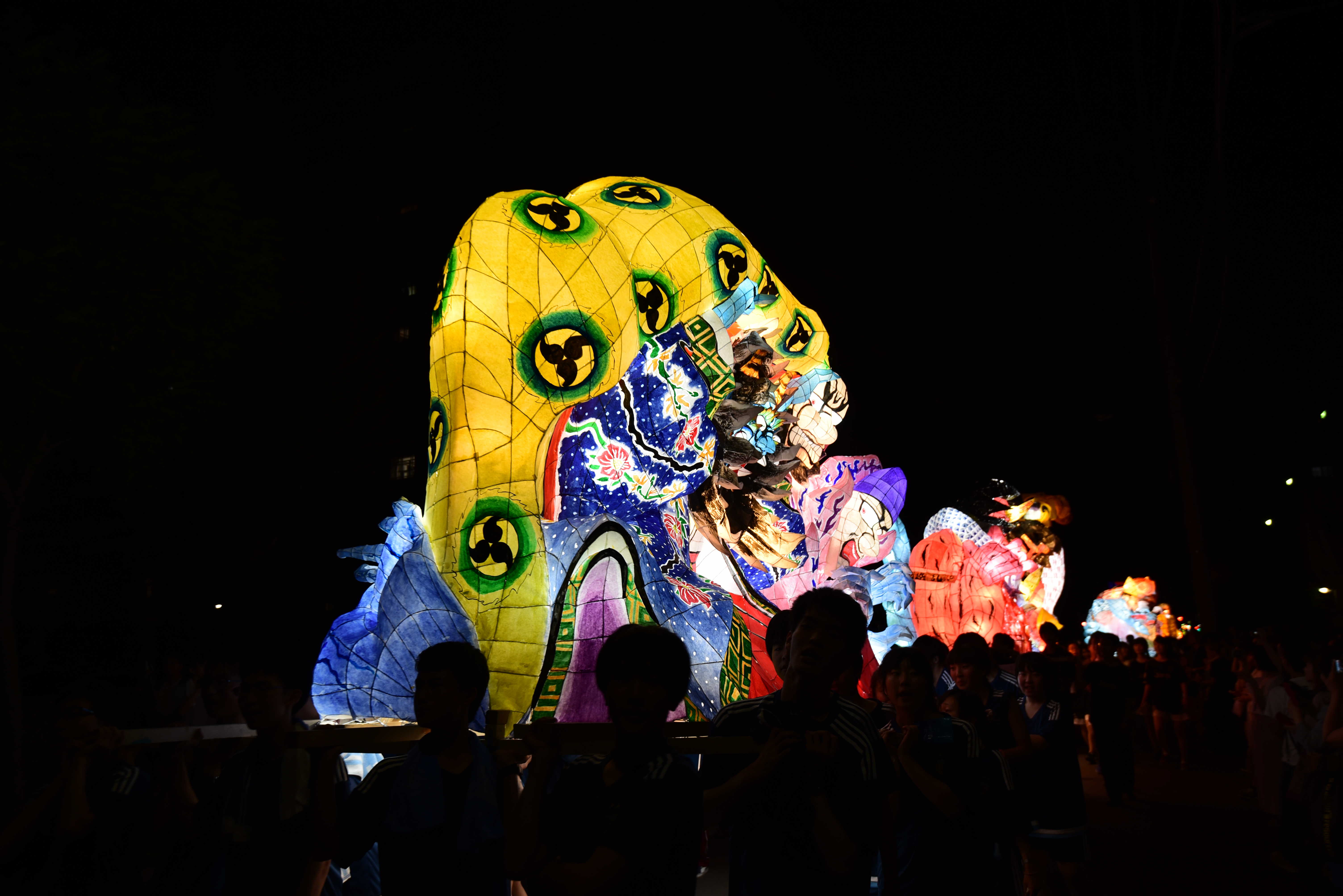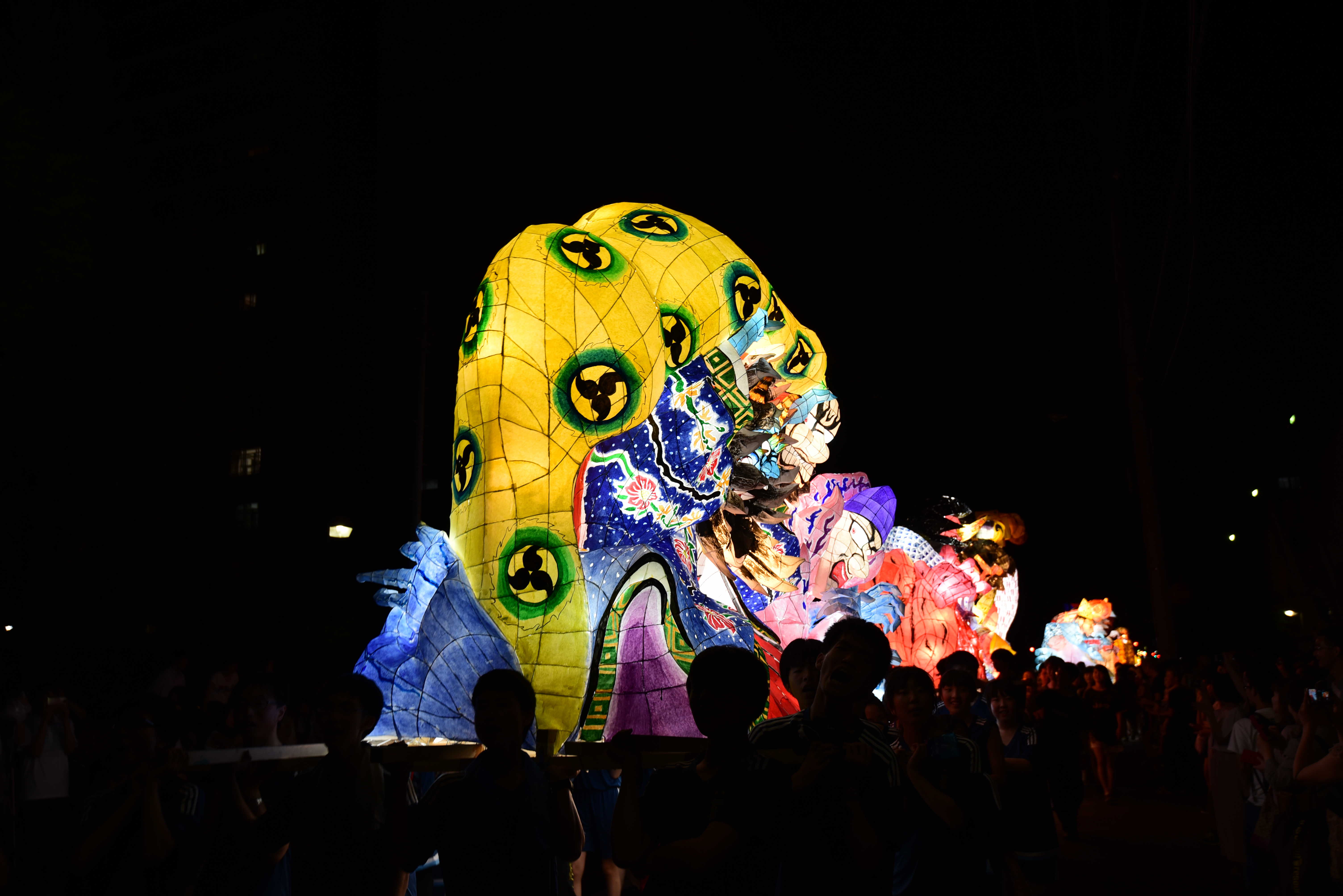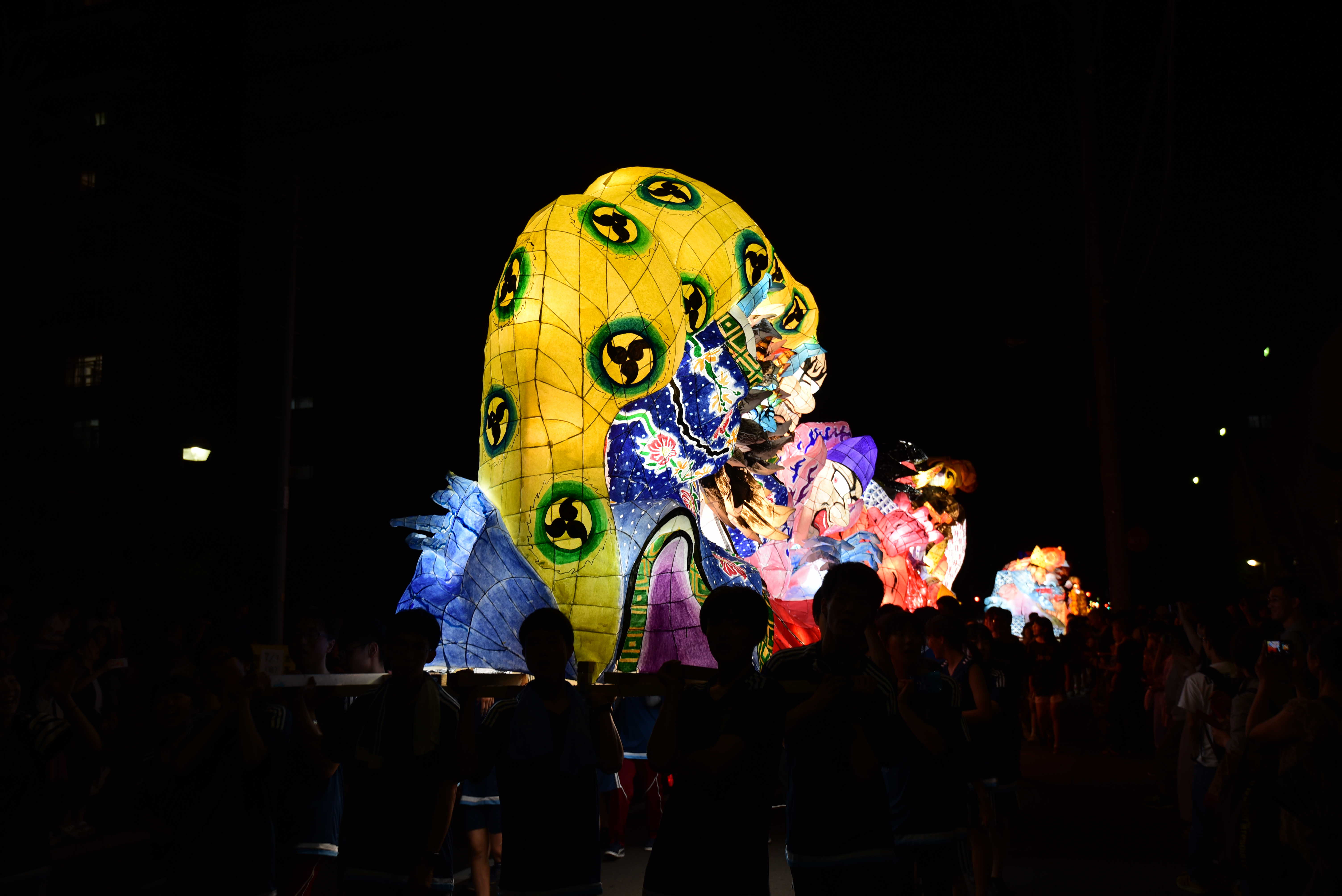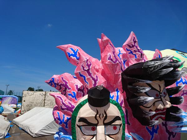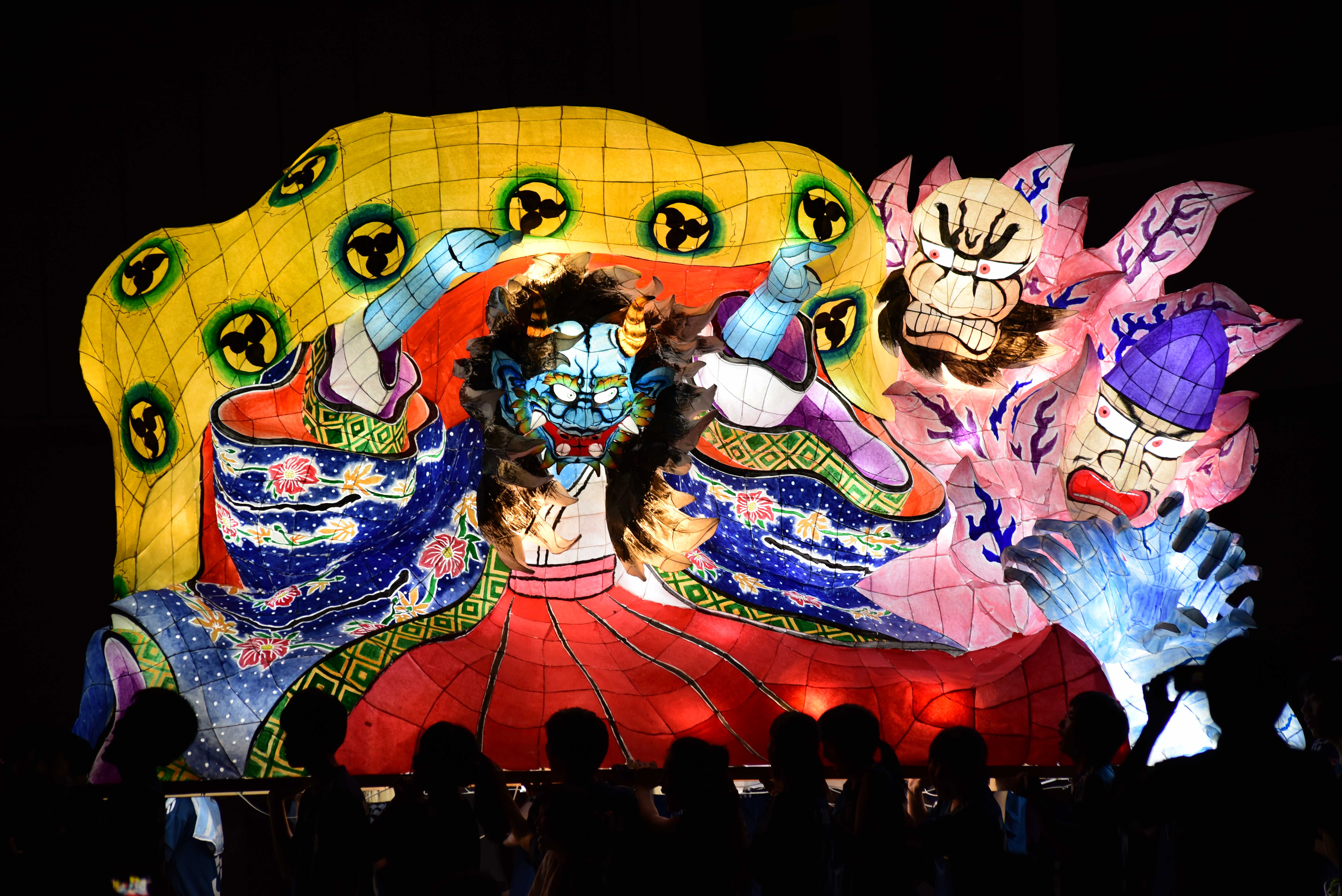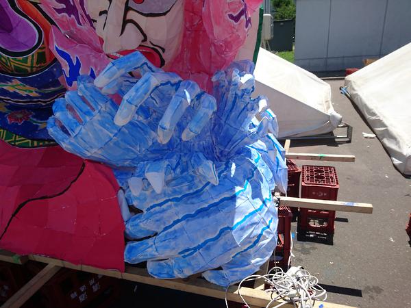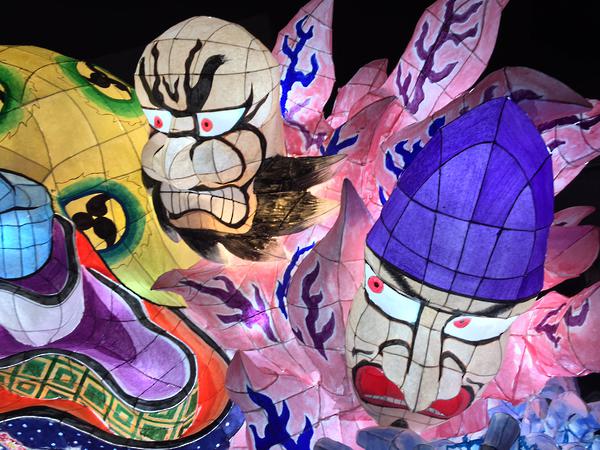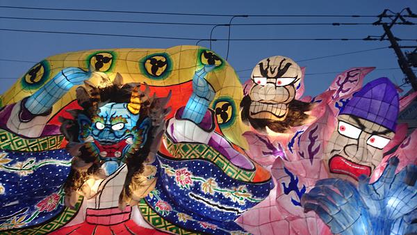 特筆すべきは鬼で、顔の針金はもちろん、色塗りや墨入れ技術が素晴らしかったです。髪の長さからしっかり女性らしさも感じられました。歯にロウを塗っていると思いますが(違ったらすみません)、これにより鬼の気迫ある表情がより表現できていてよかったです。 着物についてですが、ここまで立体感を表現できたもの(特に袖口)、そして紺といった暗い色に書き割り・ロウ書きをしっかり行なった行灯は過去にないと思います。ねぶたのようでした。