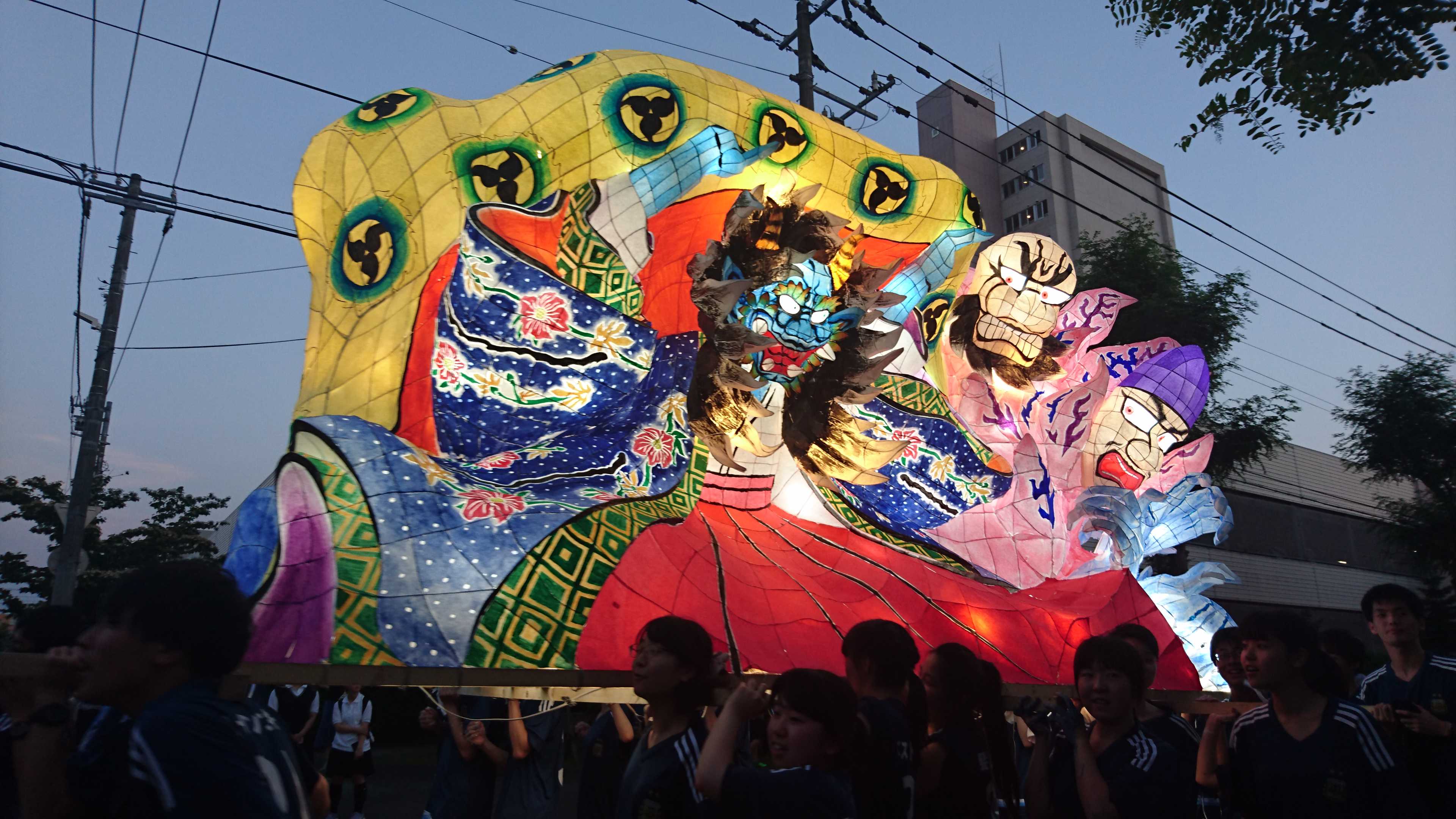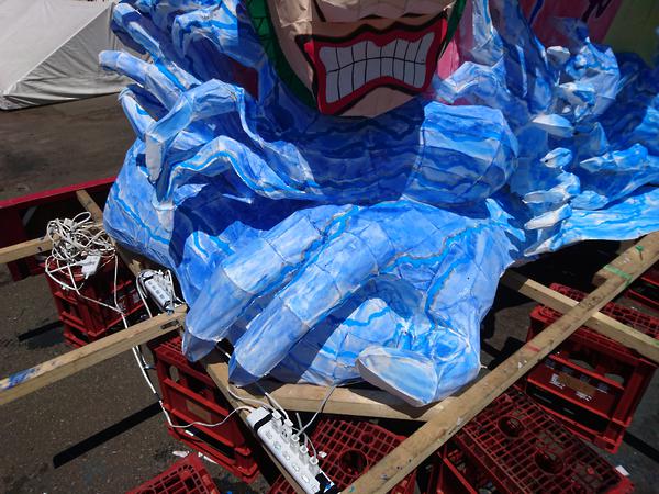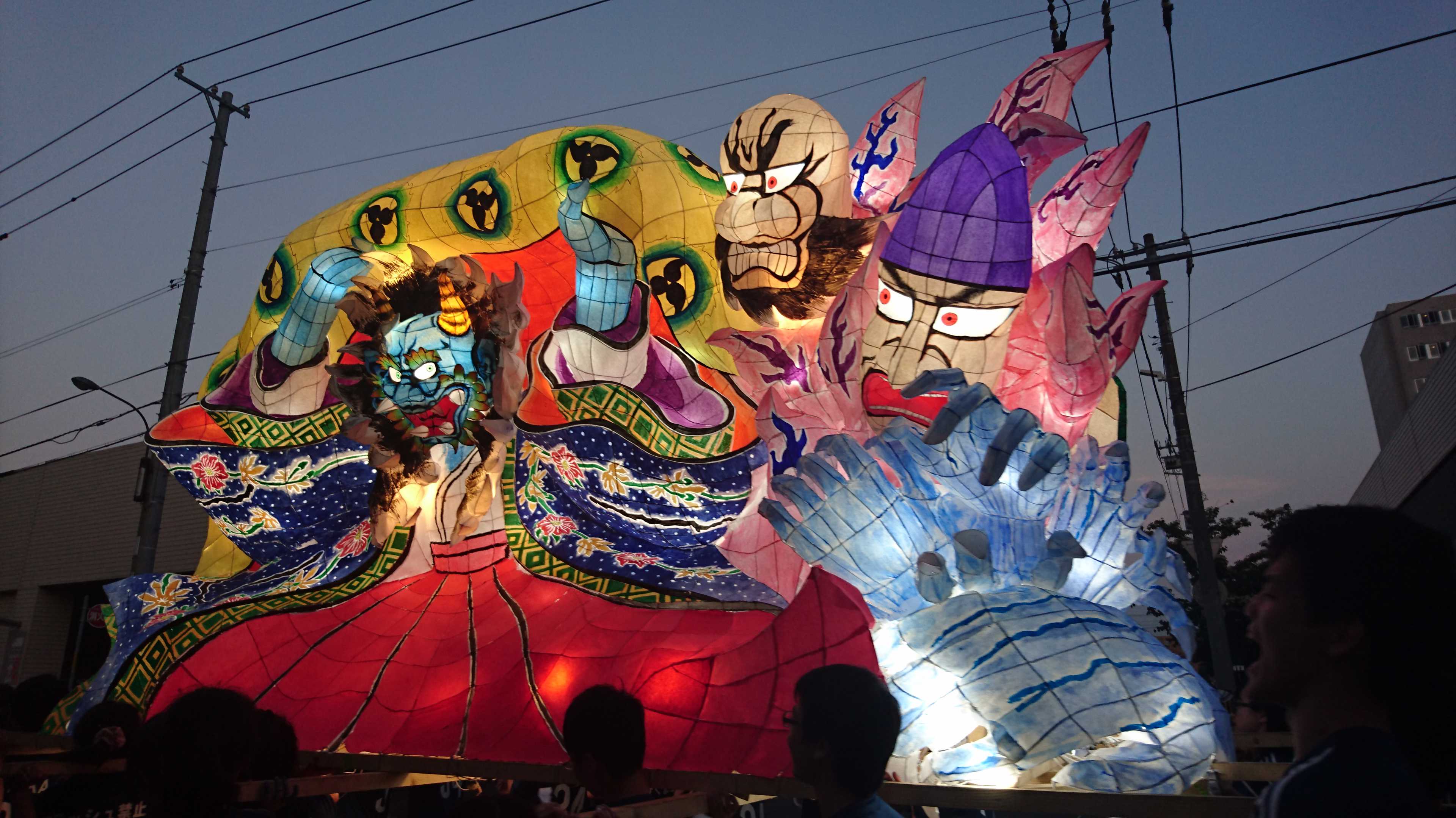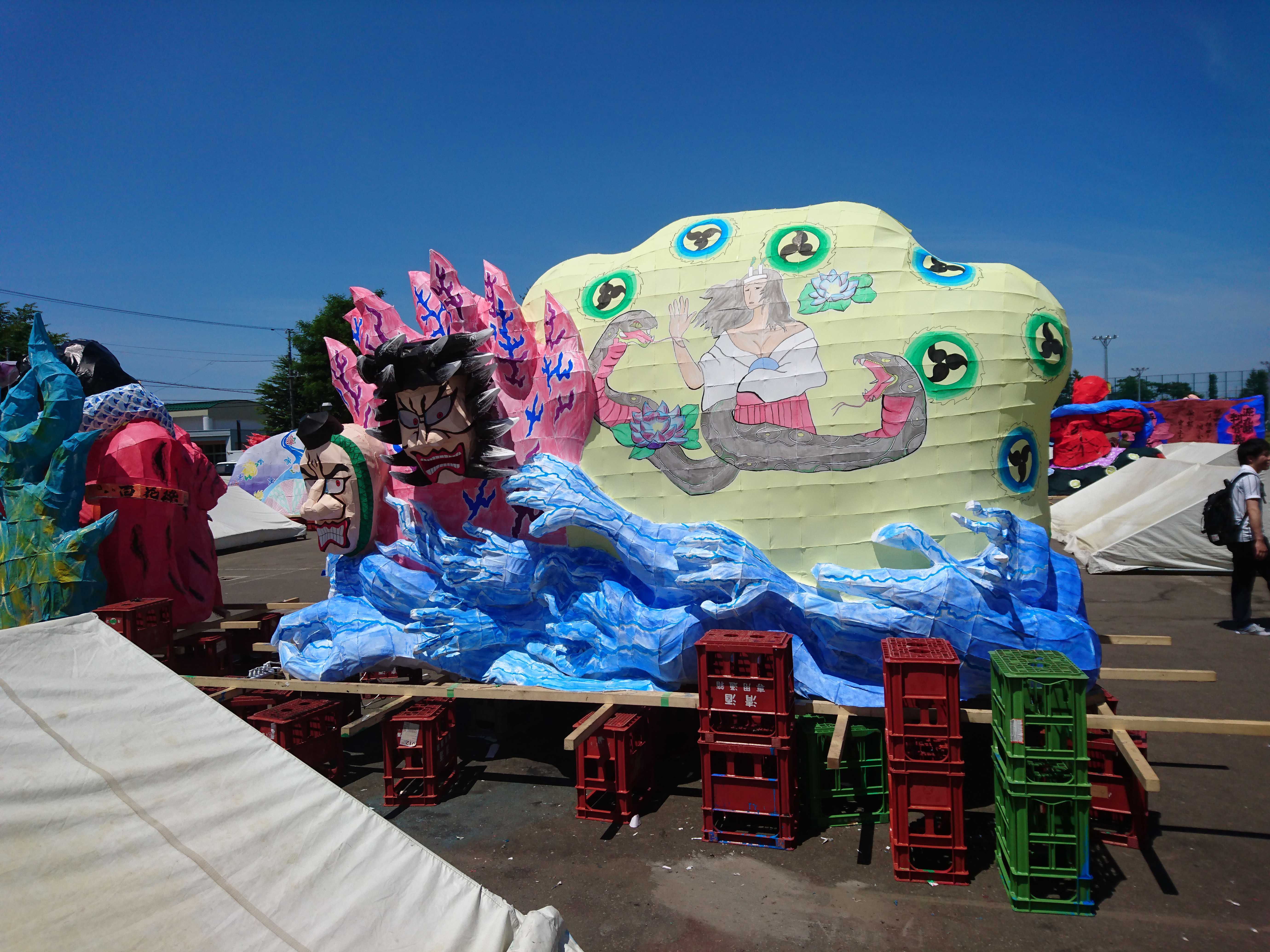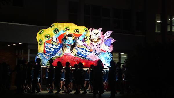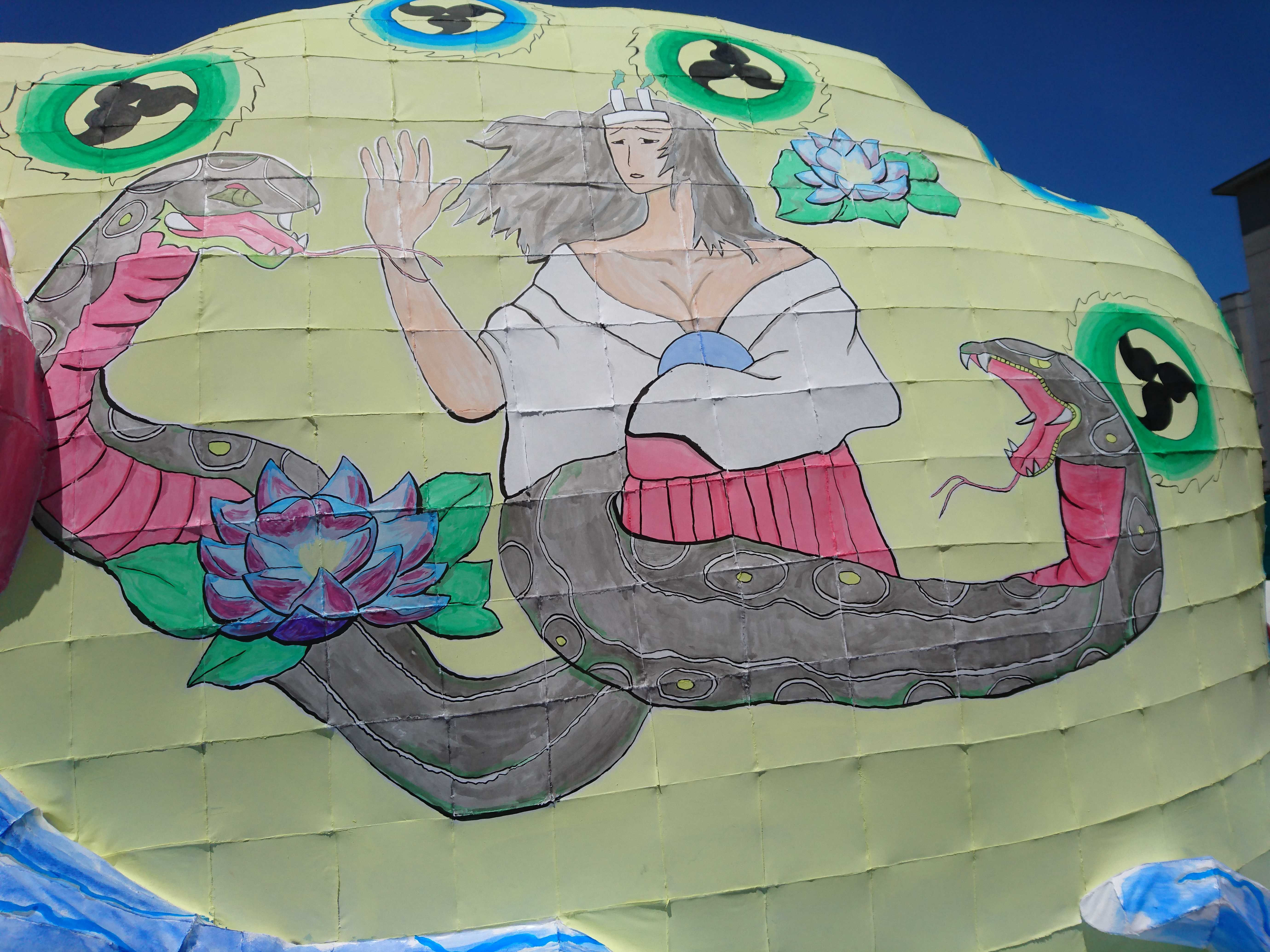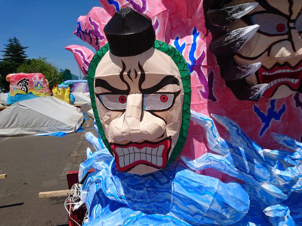 特筆すべきは鬼で、顔の針金はもちろん、色塗りや墨入れ技術が素晴らしかったです。髪の長さからしっかり女性らしさも感じられました。歯にロウを塗っていると思いますが(違ったらすみません)、これにより鬼の気迫ある表情がより表現できていてよかったです。 着物についてですが、ここまで立体感を表現できたもの(特に袖口)、そして紺といった暗い色に書き割り・ロウ書きをしっかり行なった行灯は過去にないと思います。ねぶたのようでした。