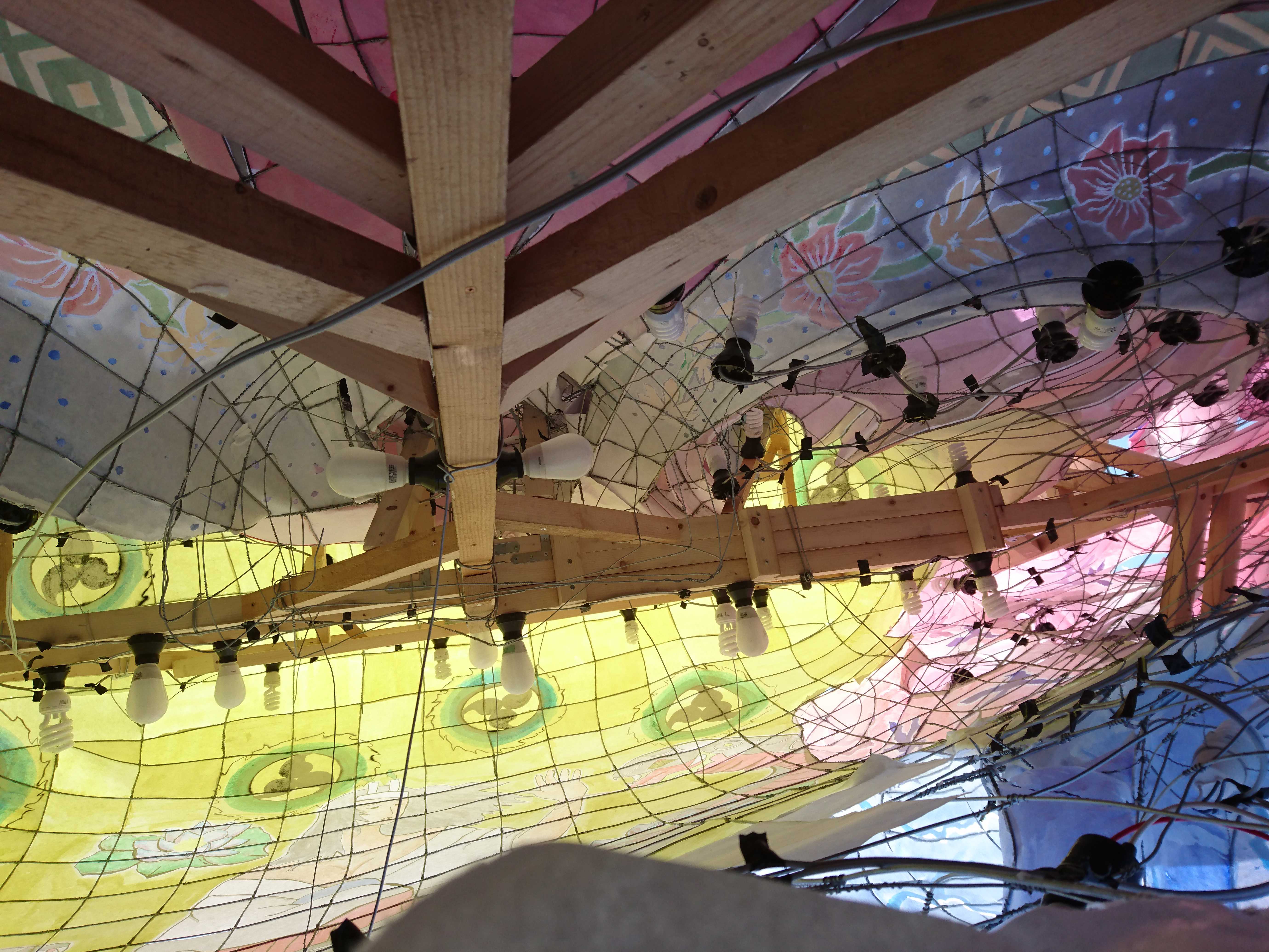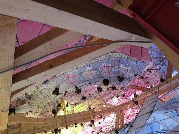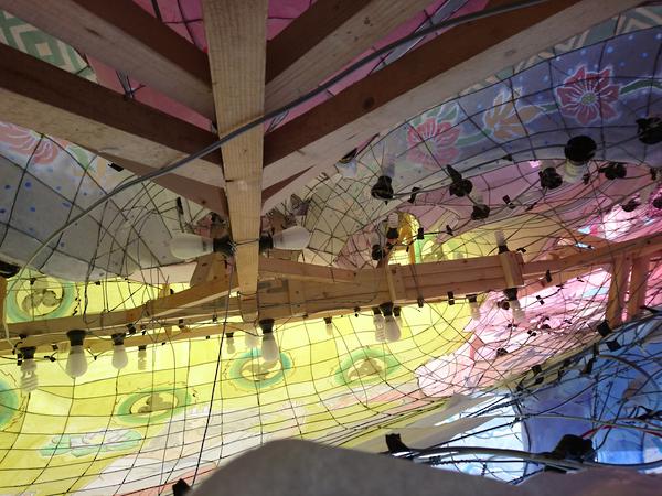 そしてその紙貼りを支える針金の丁寧さですね。紙貼りのことをよく考えた針金になっていると思います。灯りをつけて透かしたあとの針金の線もとてもきれいです (特に袴)。造形も素晴らしいです。いろいろな人が取り上げていますが、裾が綺麗すぎます笑。これはやばい笑。惚れ惚れします。全体的に曲線もかなり美しく作られています。あとは地味ですが物体間の境目!素晴らしいですね〜。構図のページでも説明しているように、境目は曖昧にされることが多いのですが、きちんと作ってあります。事前によく考えておかないと、最後まで曖昧にされてそこから光が漏れたりするのですが、この行灯は事前に細かいところまでよく練られている印象を受けました。誰か一人だけが把握していたのか、それとも複数人で共有できていたのか、気になります。