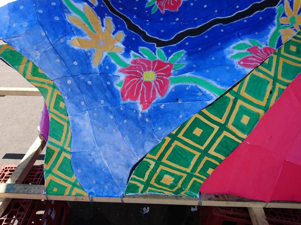 次に色。色は綺麗すぎます笑 最近は色がきれいな行灯が増えてきて嬉しいです。なんといっても着物が素晴らしいですね。配色・柄・グラデーションすべてのセンスがいい!紺色はベタ塗りだと難しいのですが、このようにろう点や書割や柄の周りを白で抜くとかなりきれいになります。構図のページに書いてあることを忠実にやってくれたのだと思います。間違いなく歴代トップレベルの塗りです (紅葉狩やシャクシャインと同じくらい?個人的にはいままでのすべての行灯の塗りで一番好きです)。 柄の周りを白で抜く (柄を先に描いて、あとから地の色をポンポンしているのだと思います) という技法は、確か66th3-4が使っていた技法なのですが、当時一年生だった68thのみなさんが使っているのが、こうやって伝統は続いていくんだなあという感じで感慨深いですね。今後も続いていってほしいです。