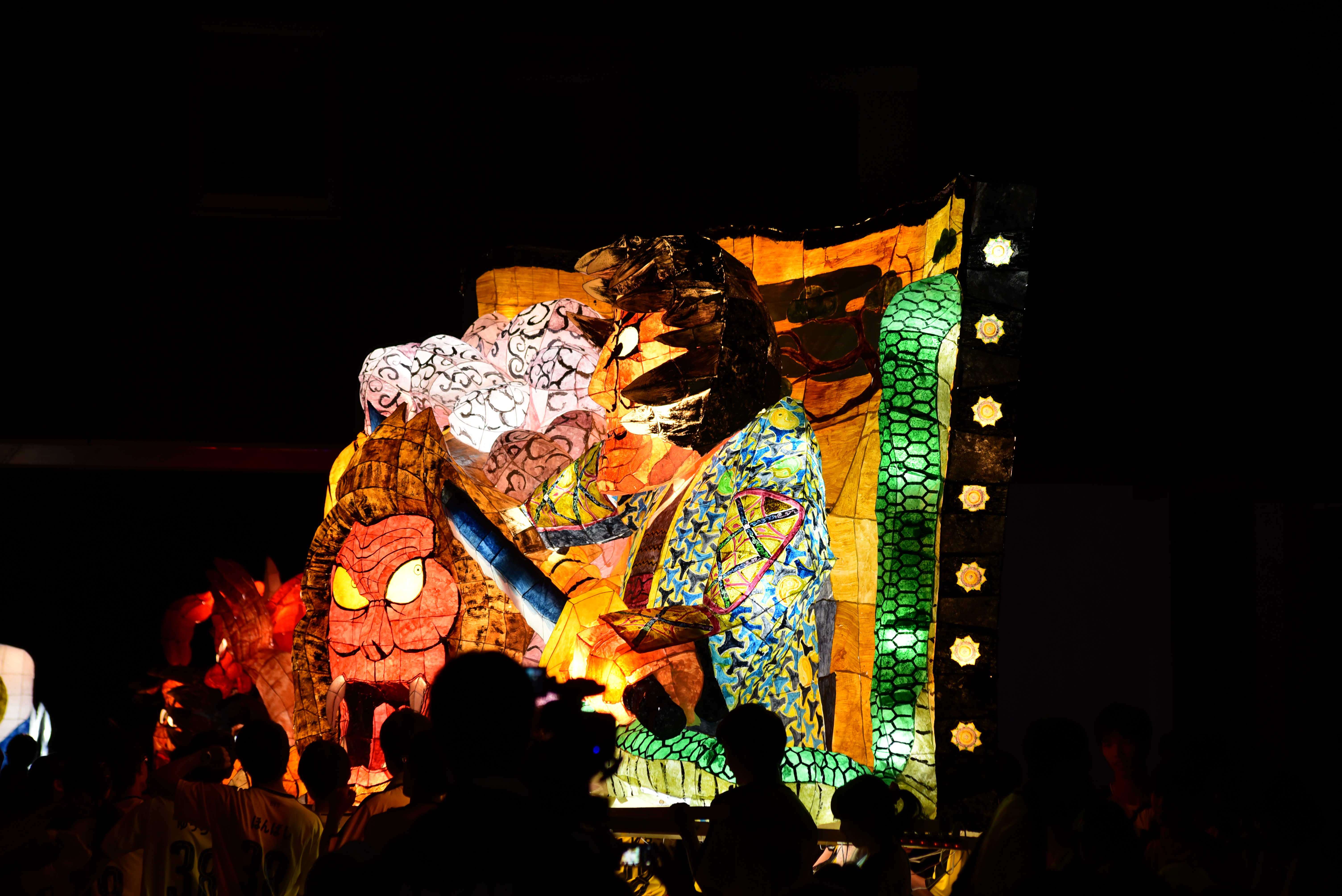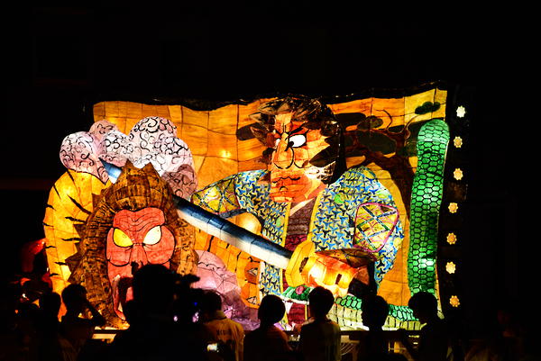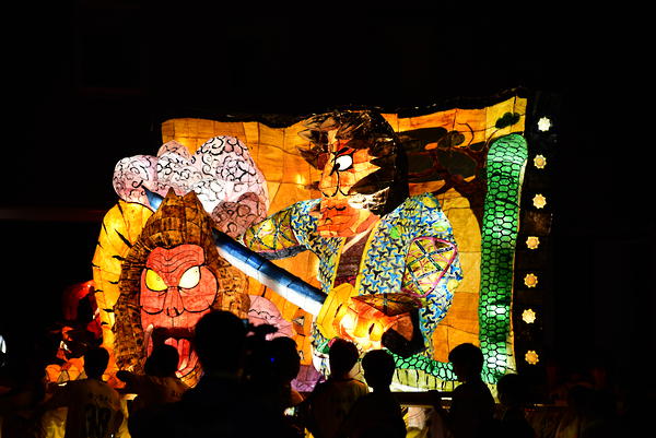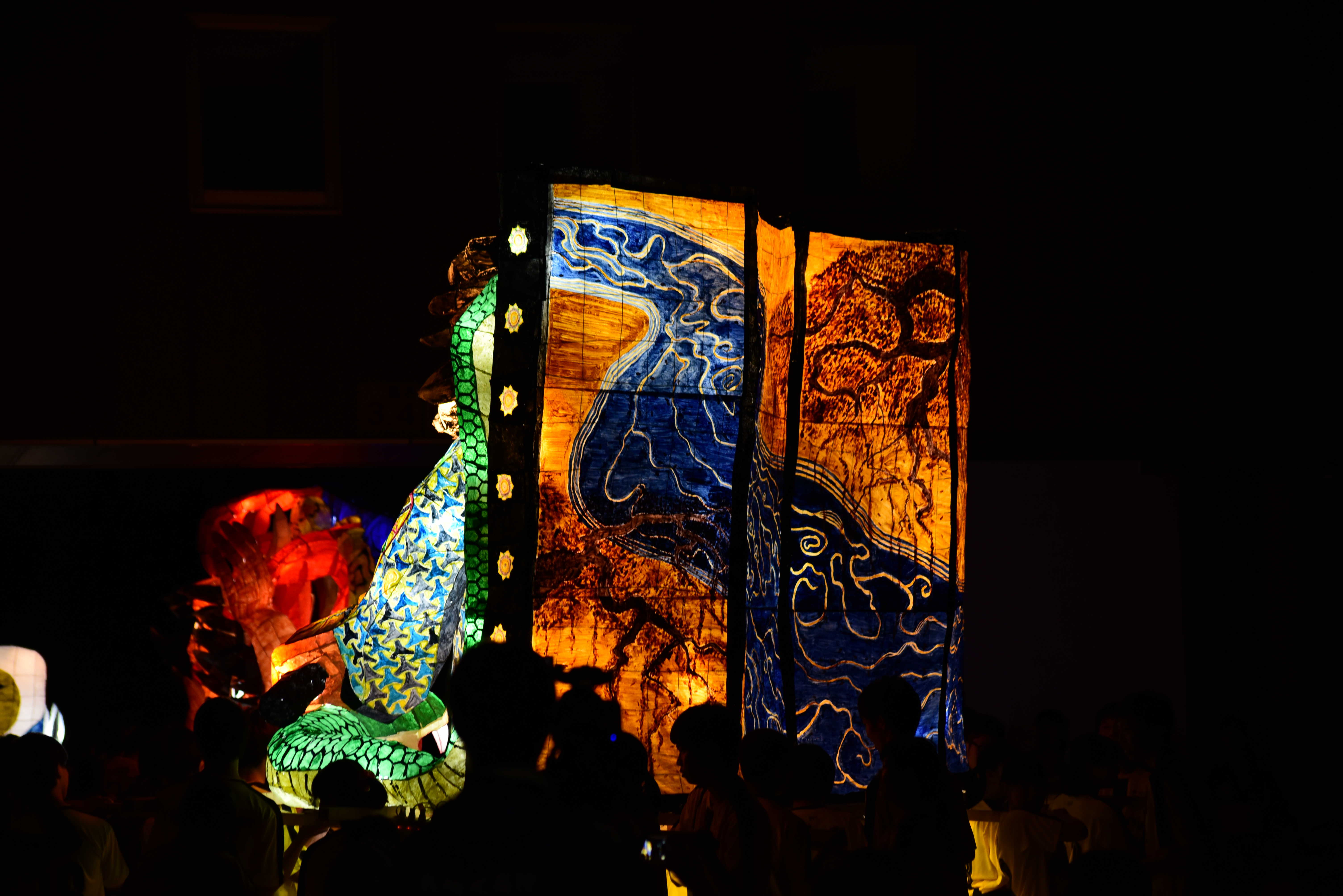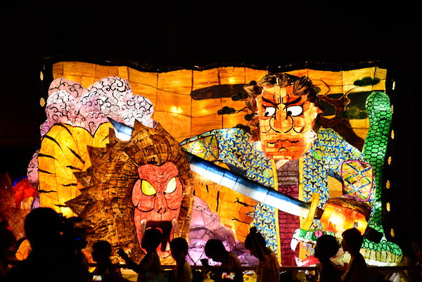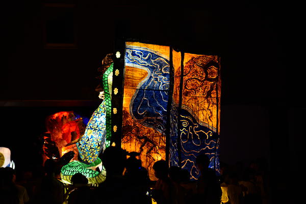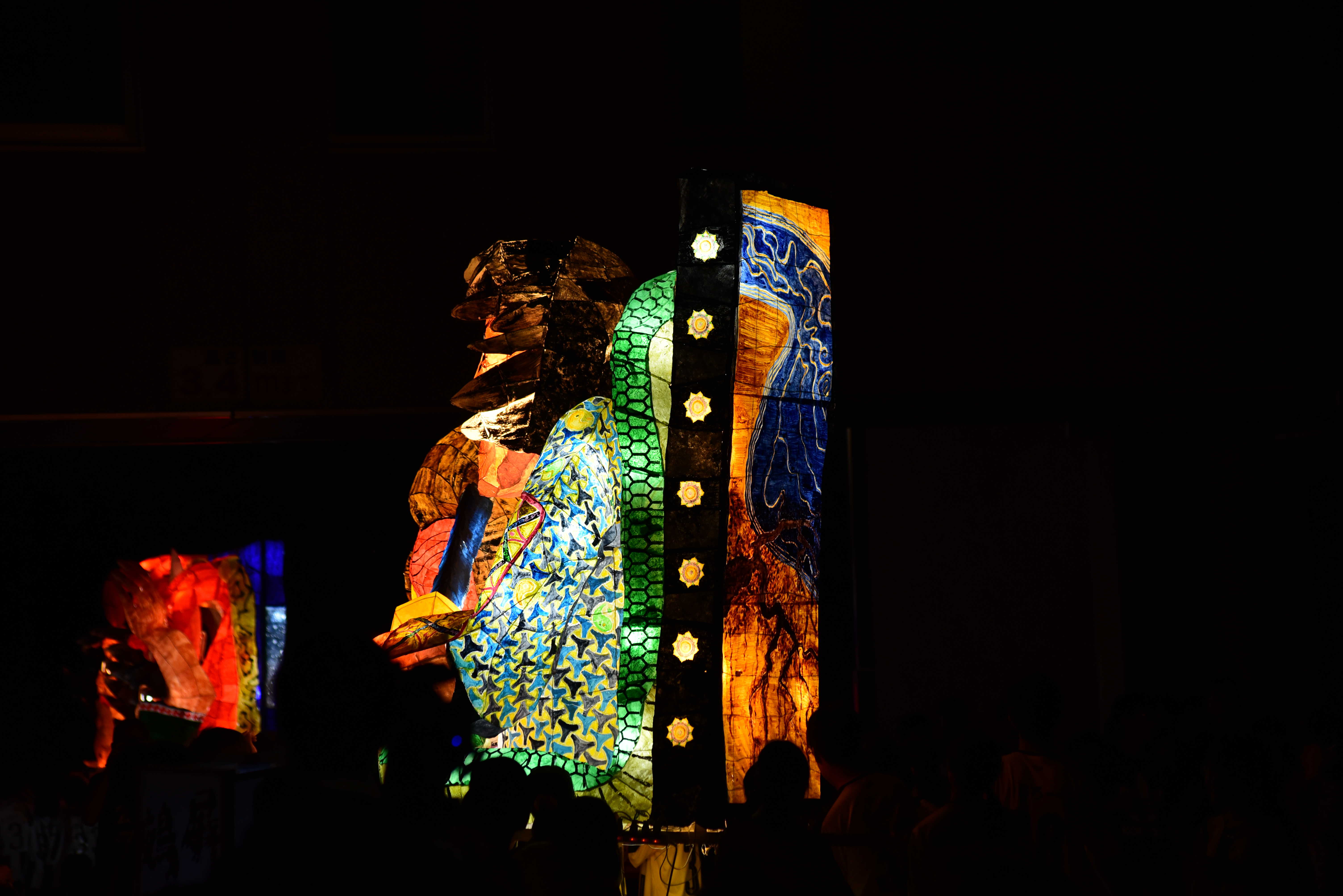 尻尾である蛇が左側にいる鵺に対して、屏風を通って右側から出てくる発想がよかったです。うねっている様子も伝わってきました。また、黄色系の色が多い行灯だったので、緑がいいアクセントになっていました。