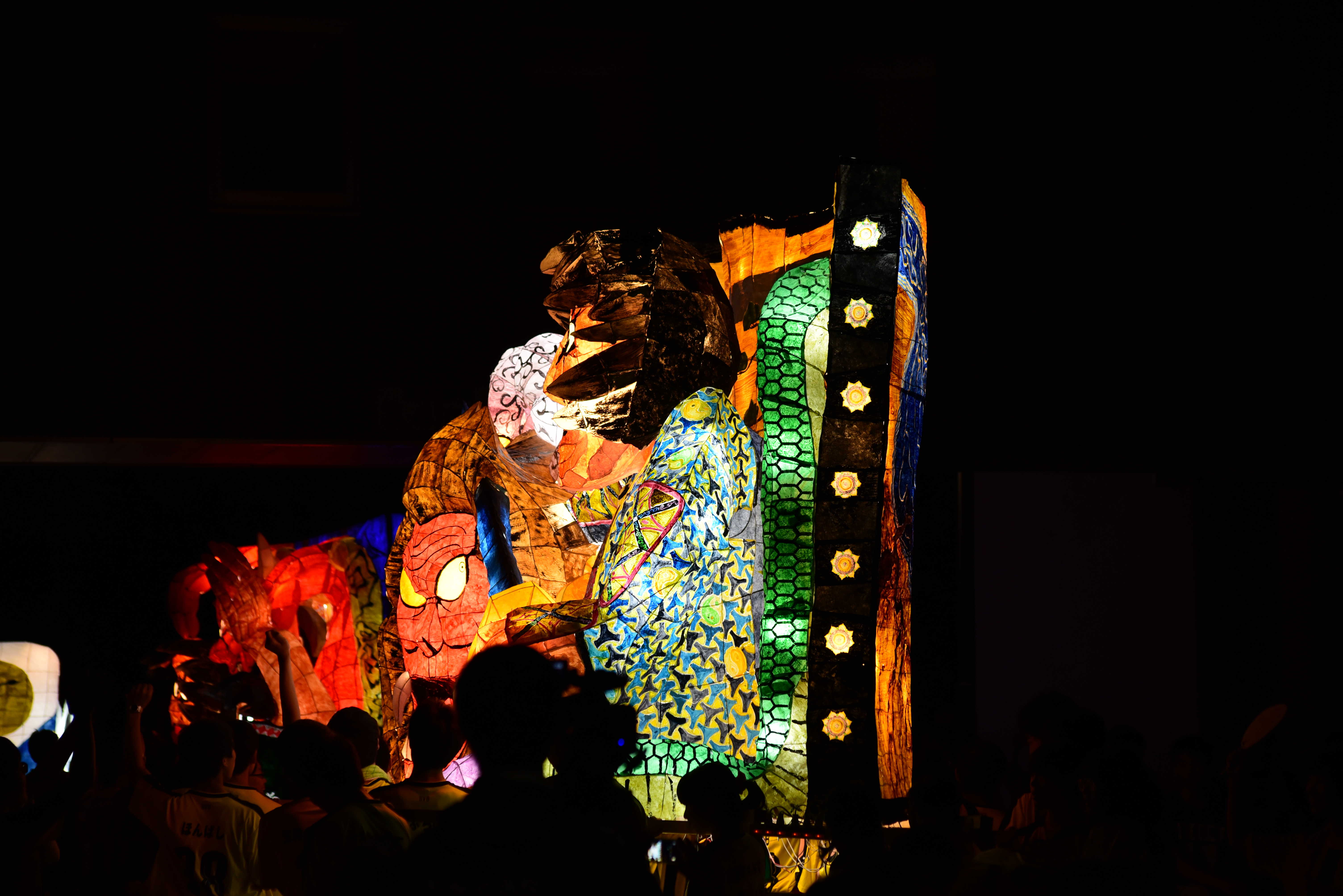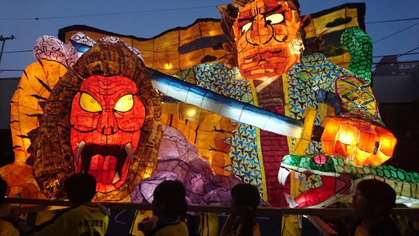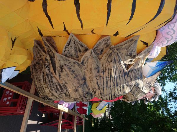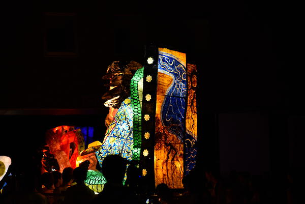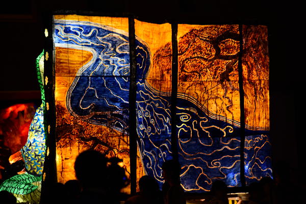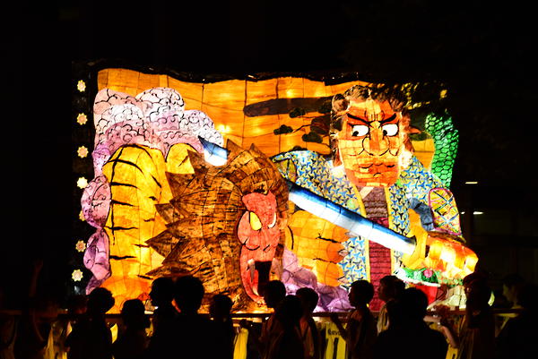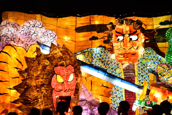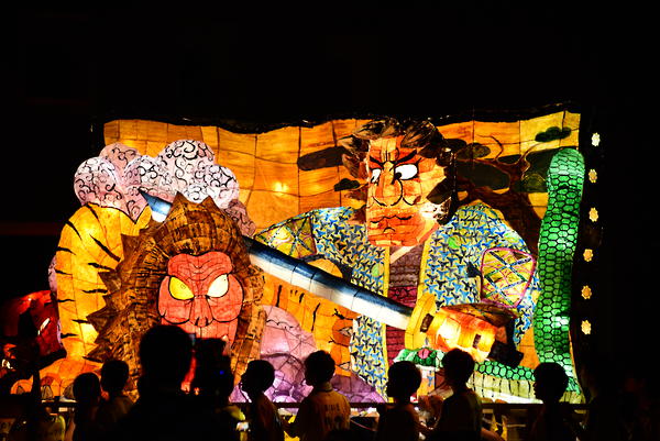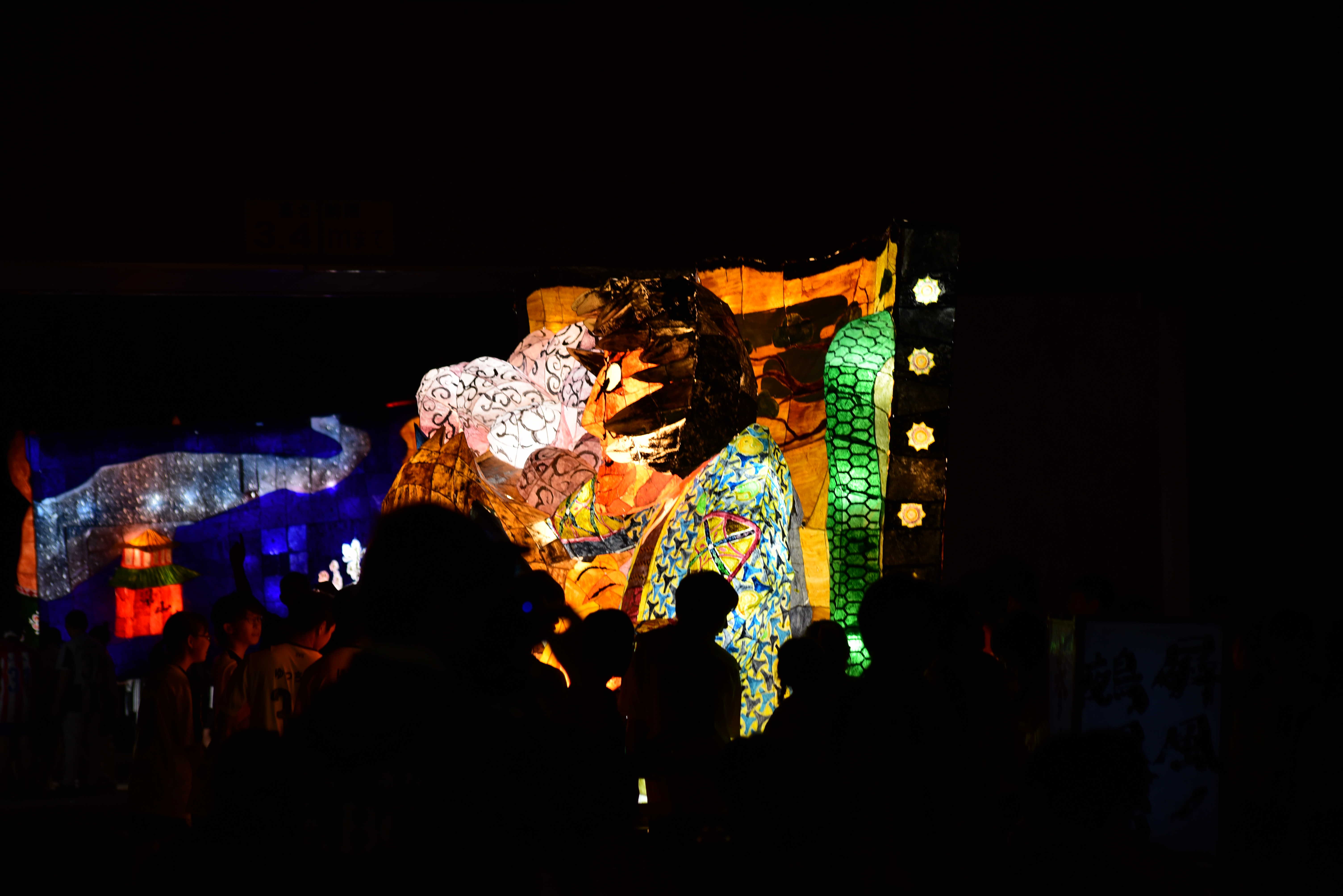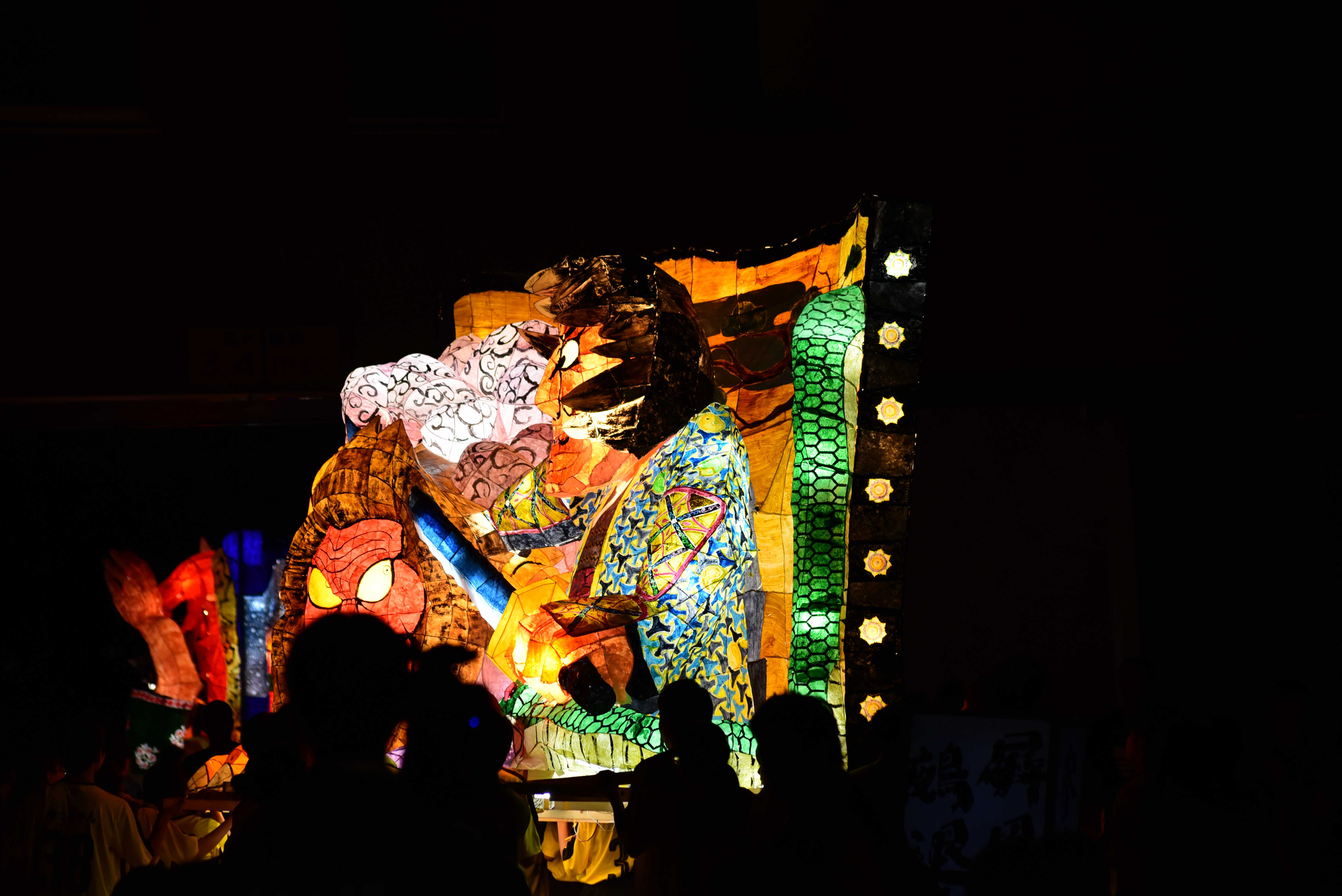 尻尾である蛇が左側にいる鵺に対して、屏風を通って右側から出てくる発想がよかったです。うねっている様子も伝わってきました。また、黄色系の色が多い行灯だったので、緑がいいアクセントになっていました。