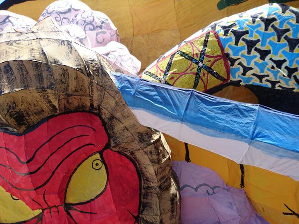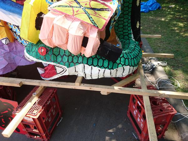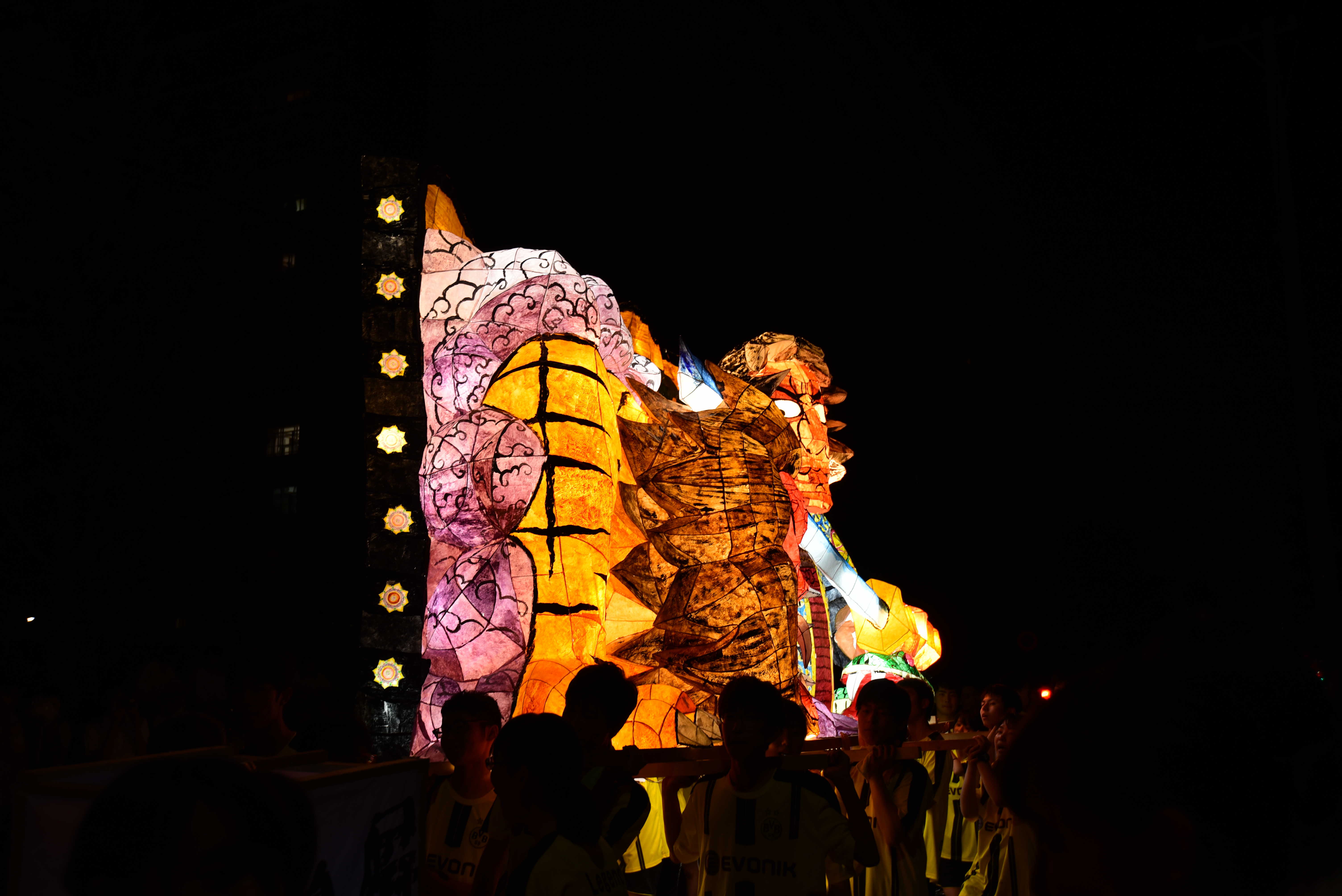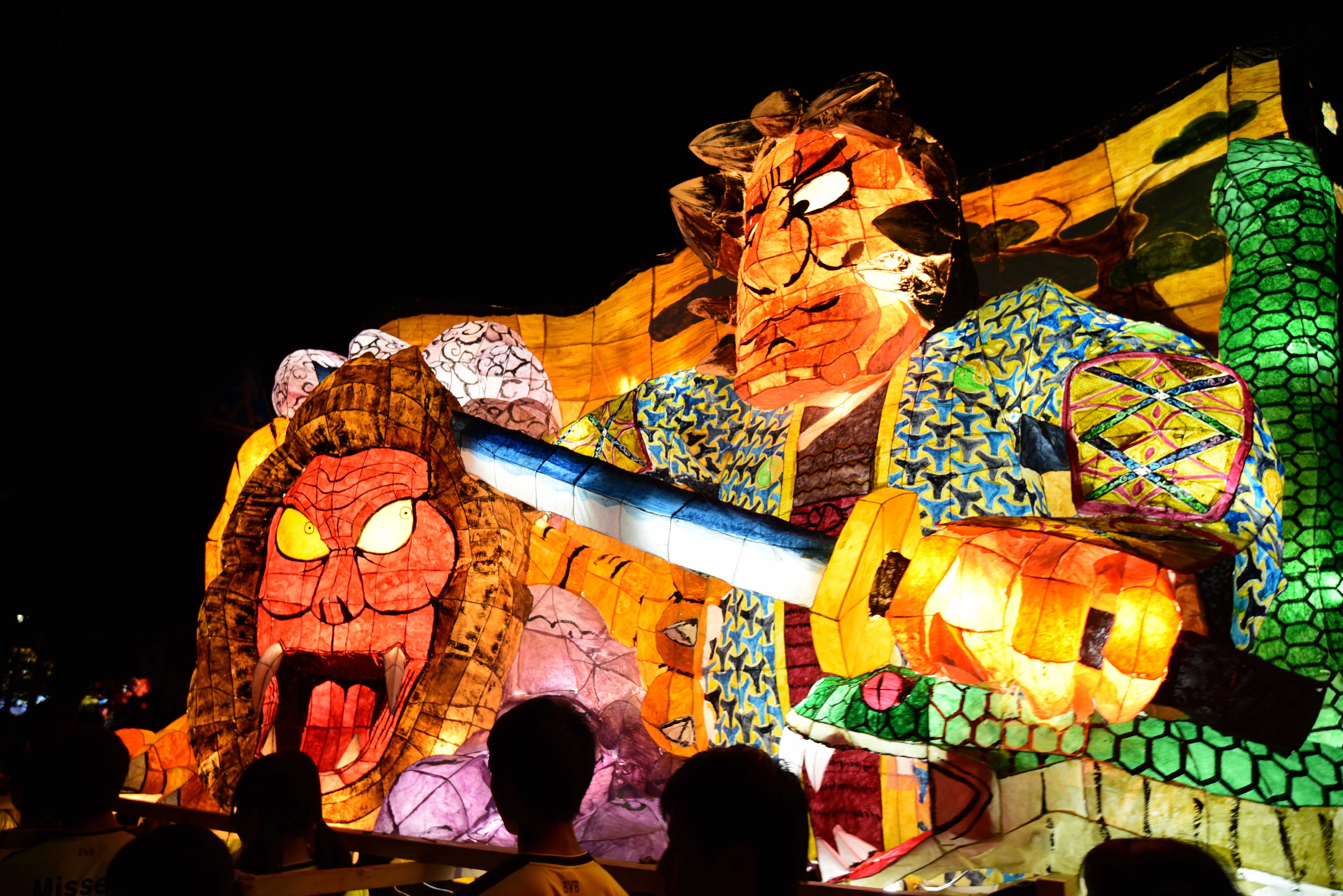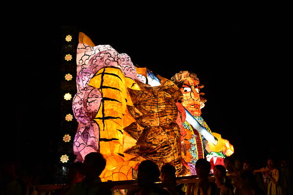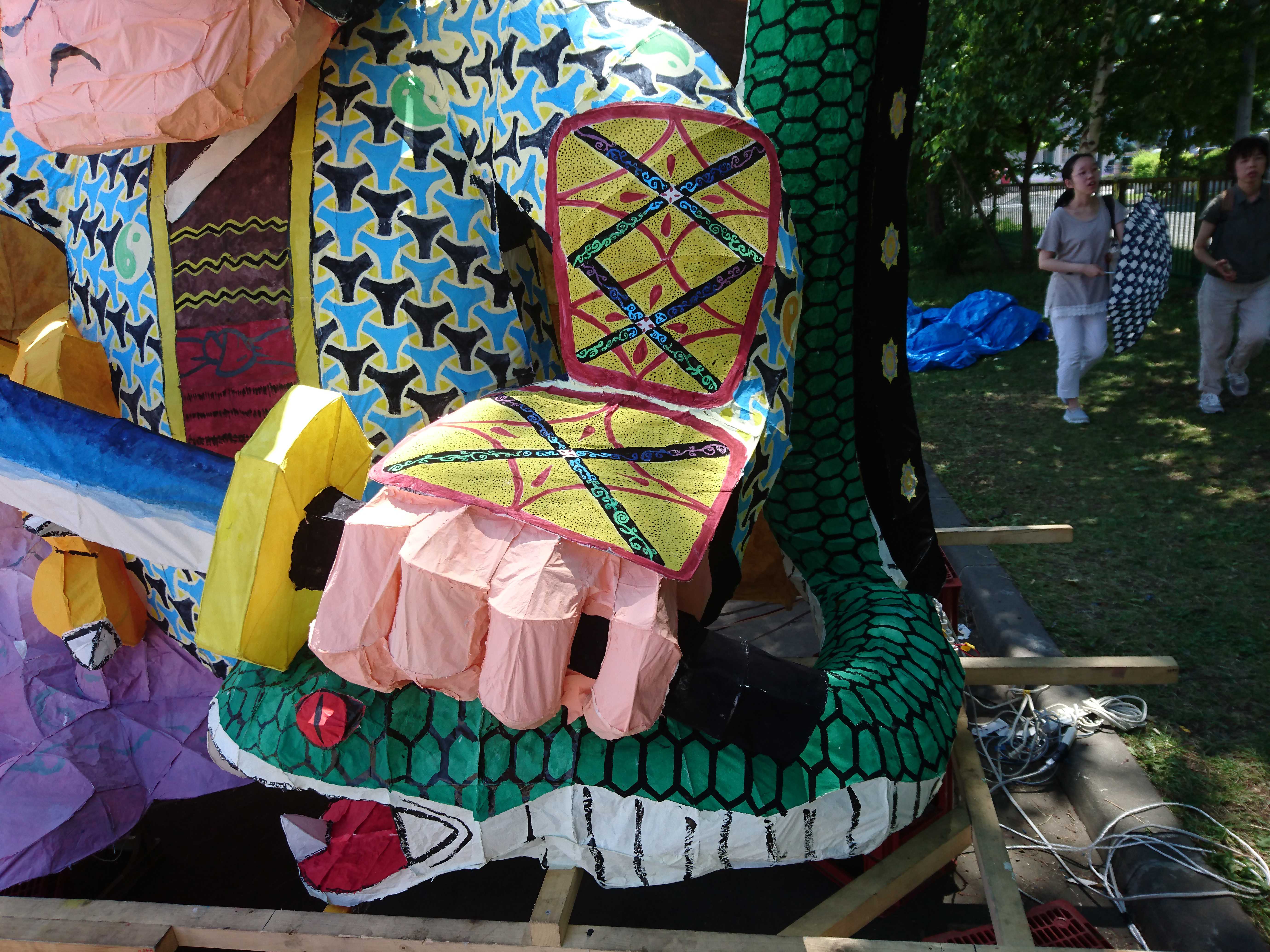 尻尾である蛇が左側にいる鵺に対して、屏風を通って右側から出てくる発想がよかったです。うねっている様子も伝わってきました。また、黄色系の色が多い行灯だったので、緑がいいアクセントになっていました。