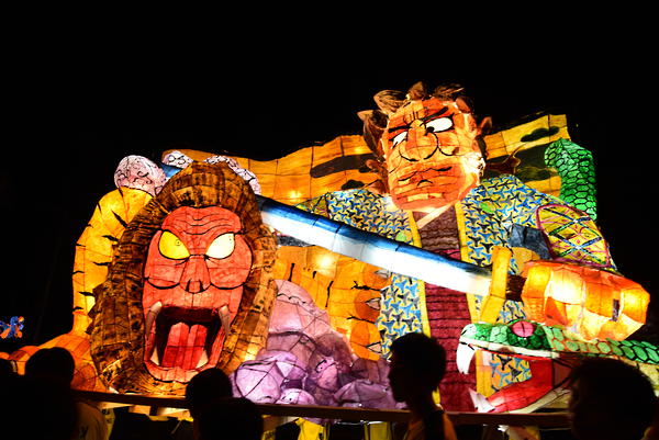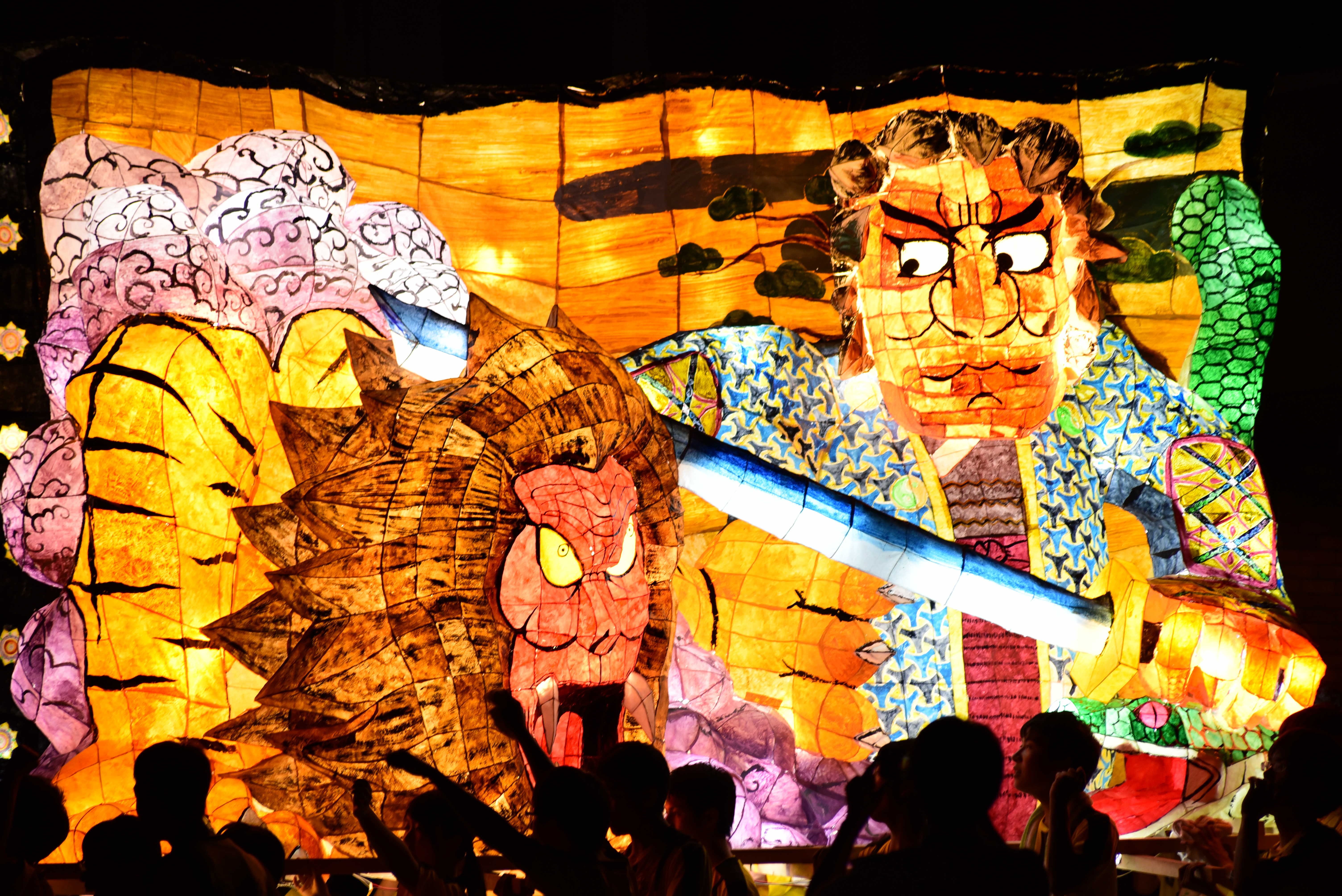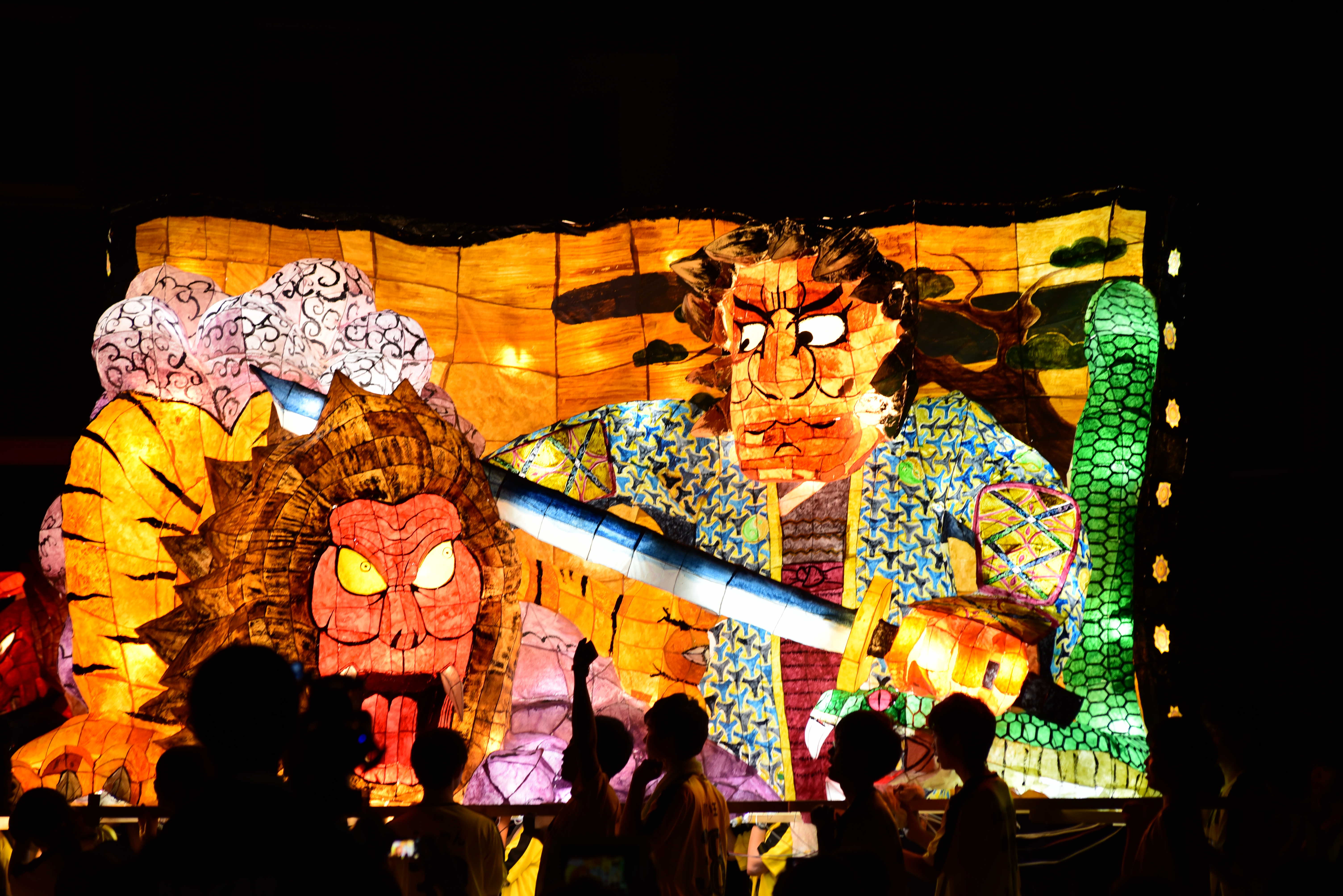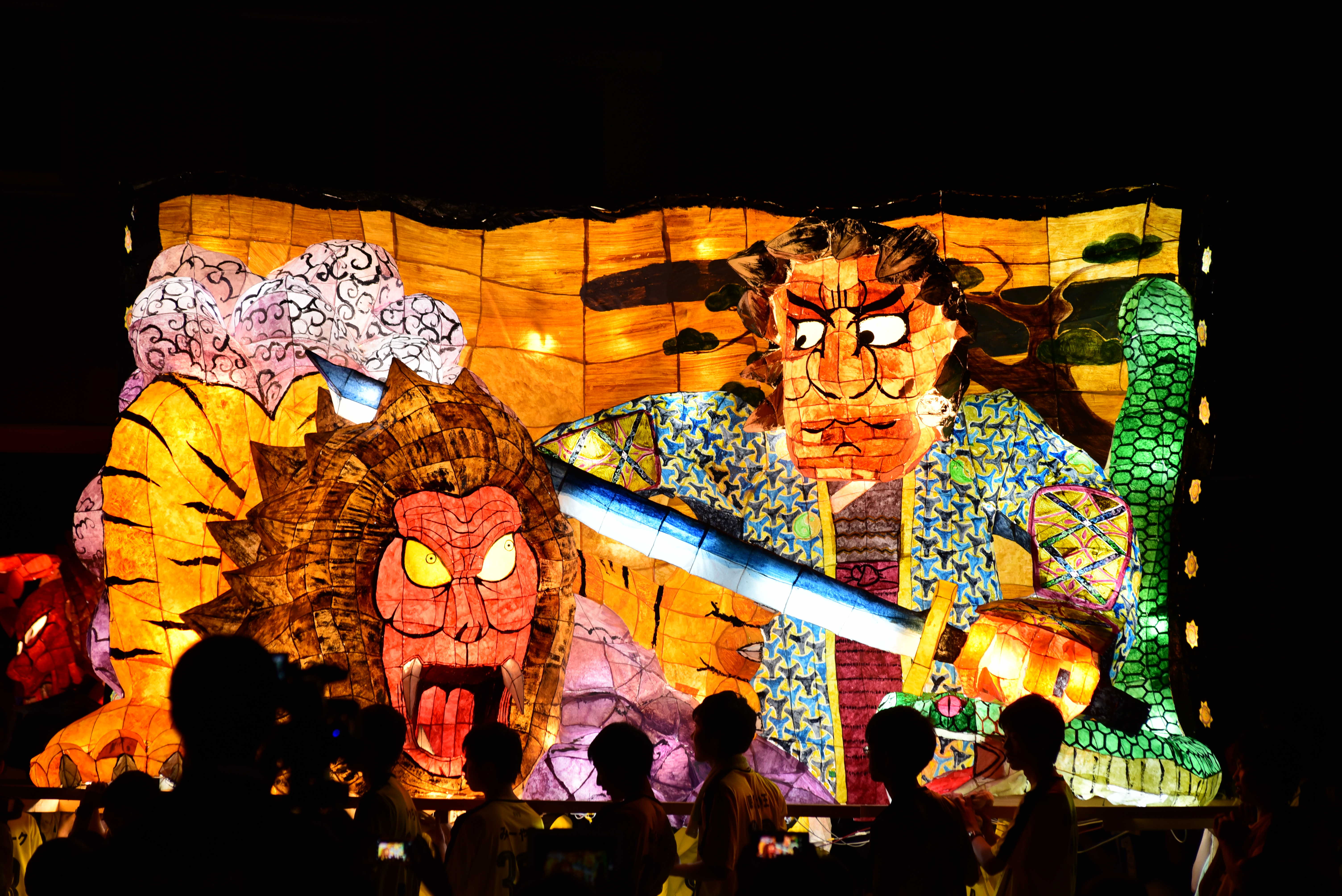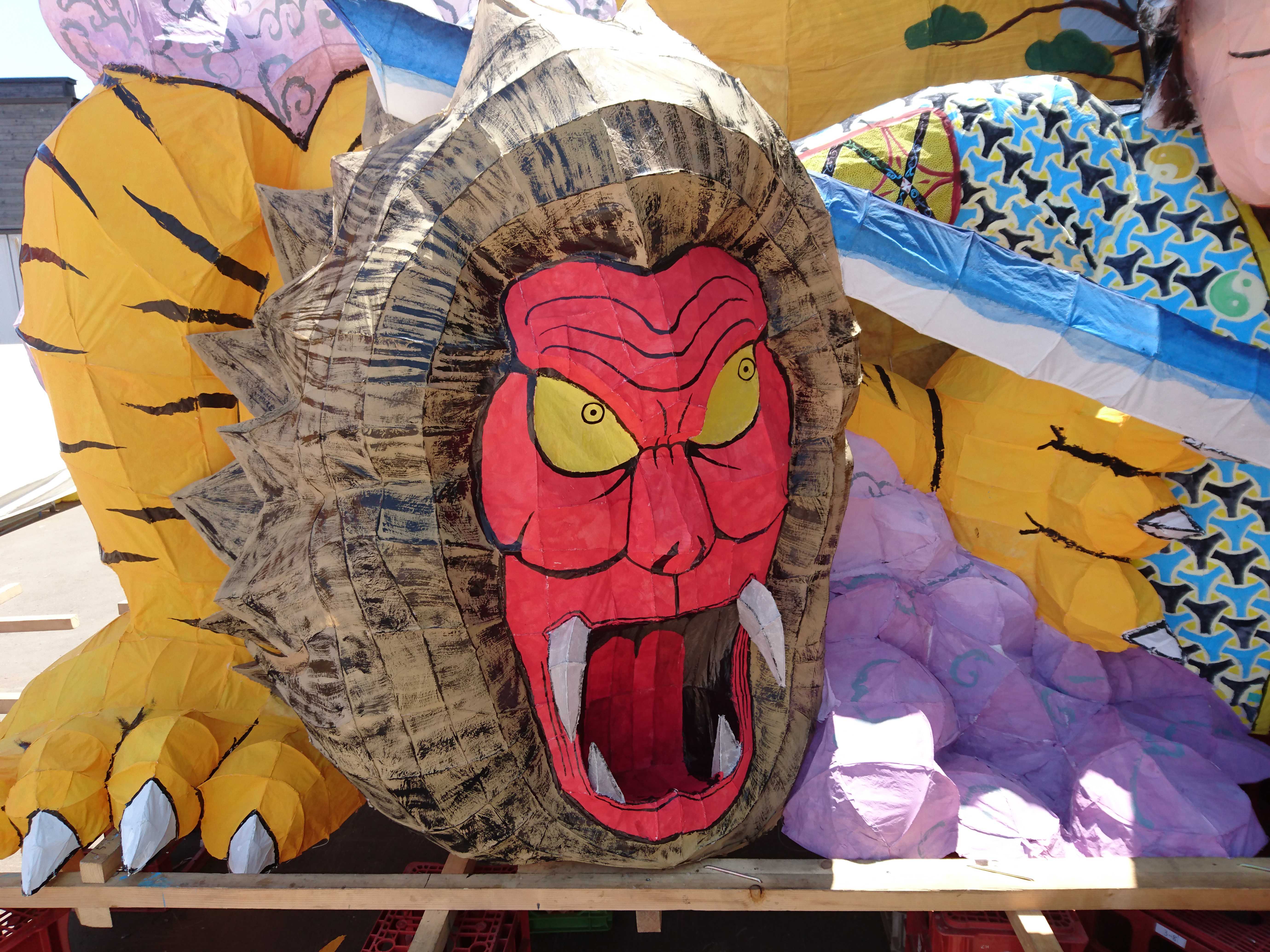 次に鵺です。鵺が大きく目を開いて刀を持つ武者を睨んでいる表情が素晴らしいです。鵺と武者が見合っている場面をよく表現していると思います。北高行灯奥行き足りなさすぎ問題 (いま名付けました) のせいで、鵺も武者も窮屈になっているのは否めないですが…。 あまり目立たないですが蛇の頭もいいですね!目が好きです。