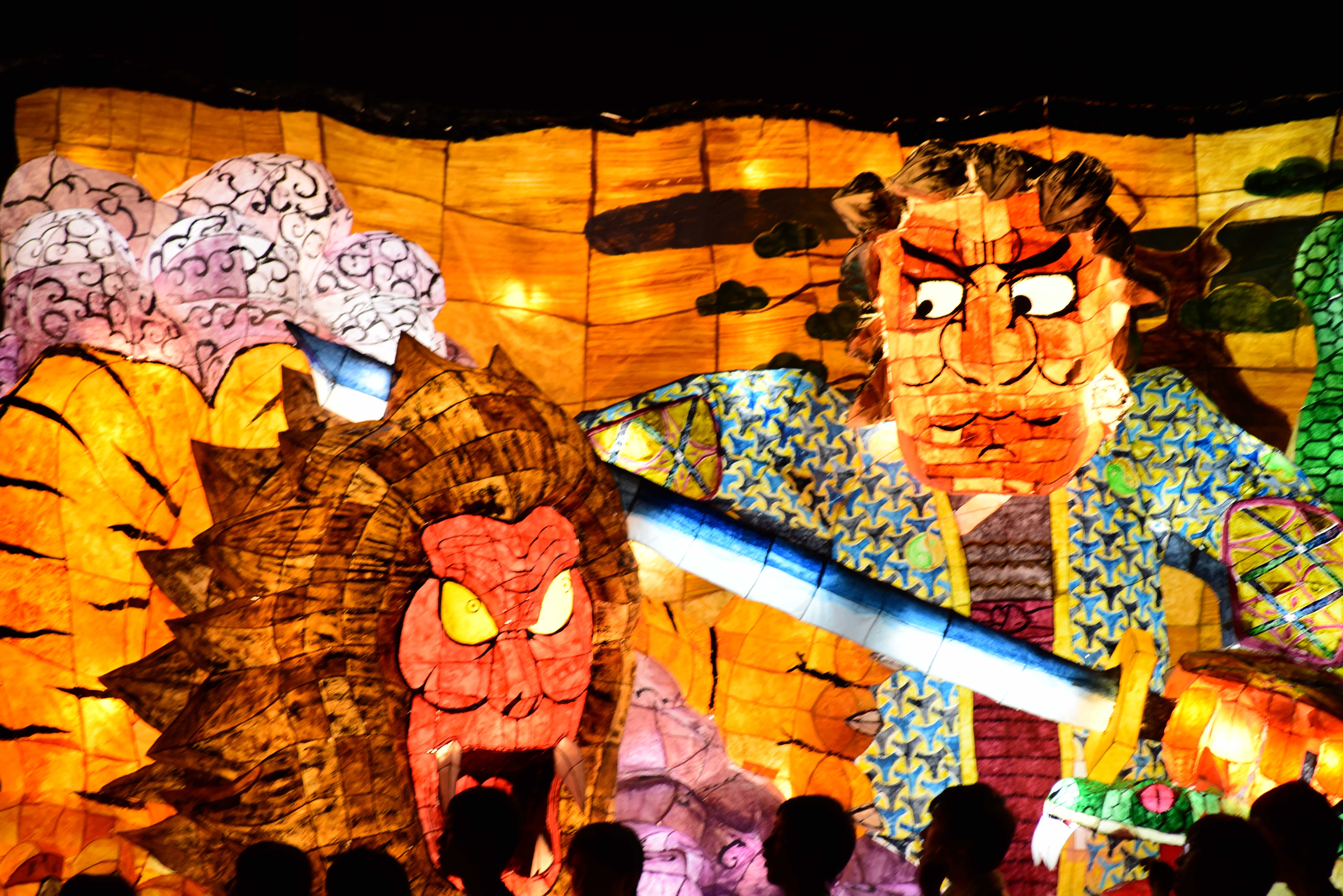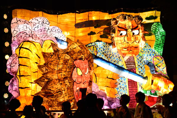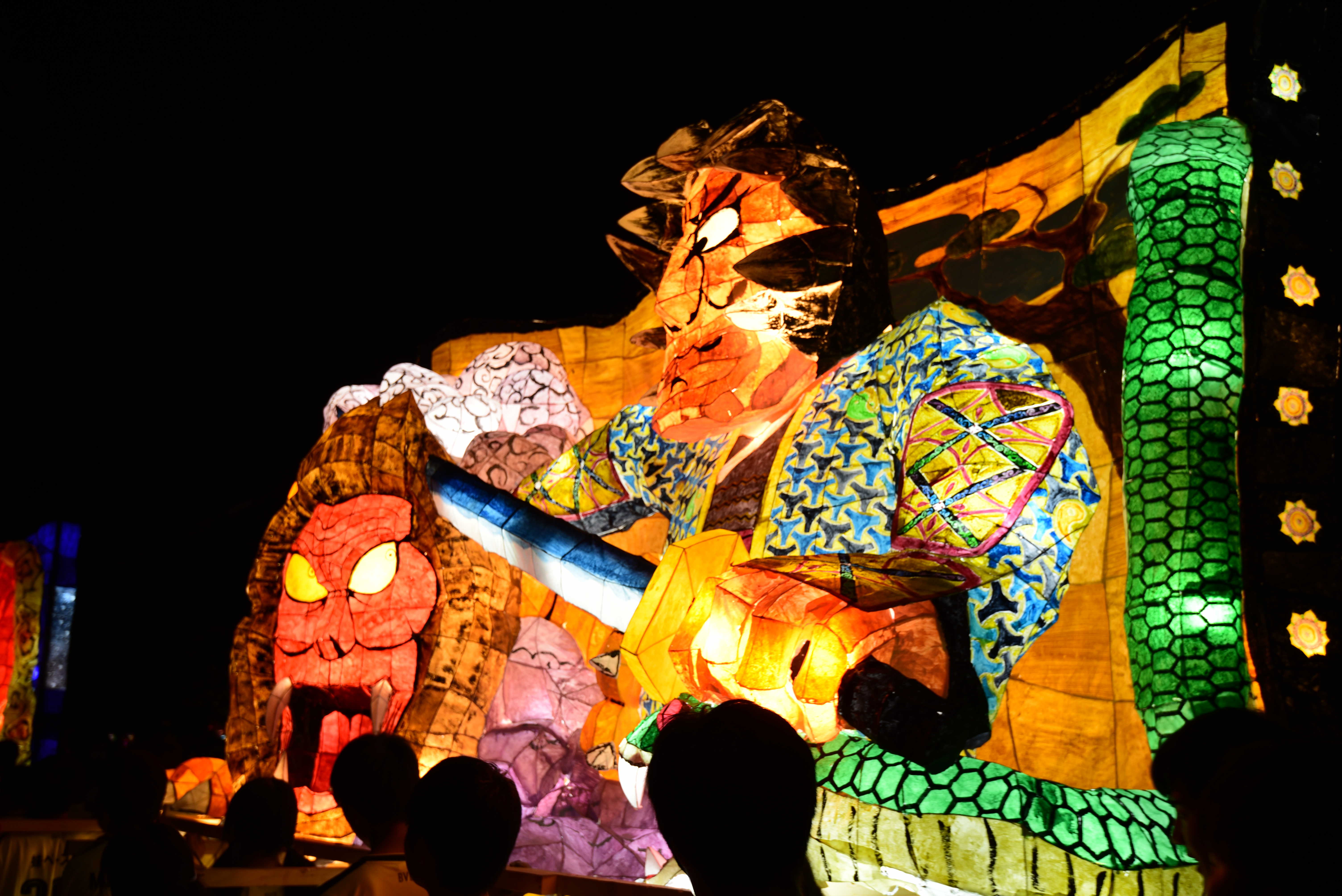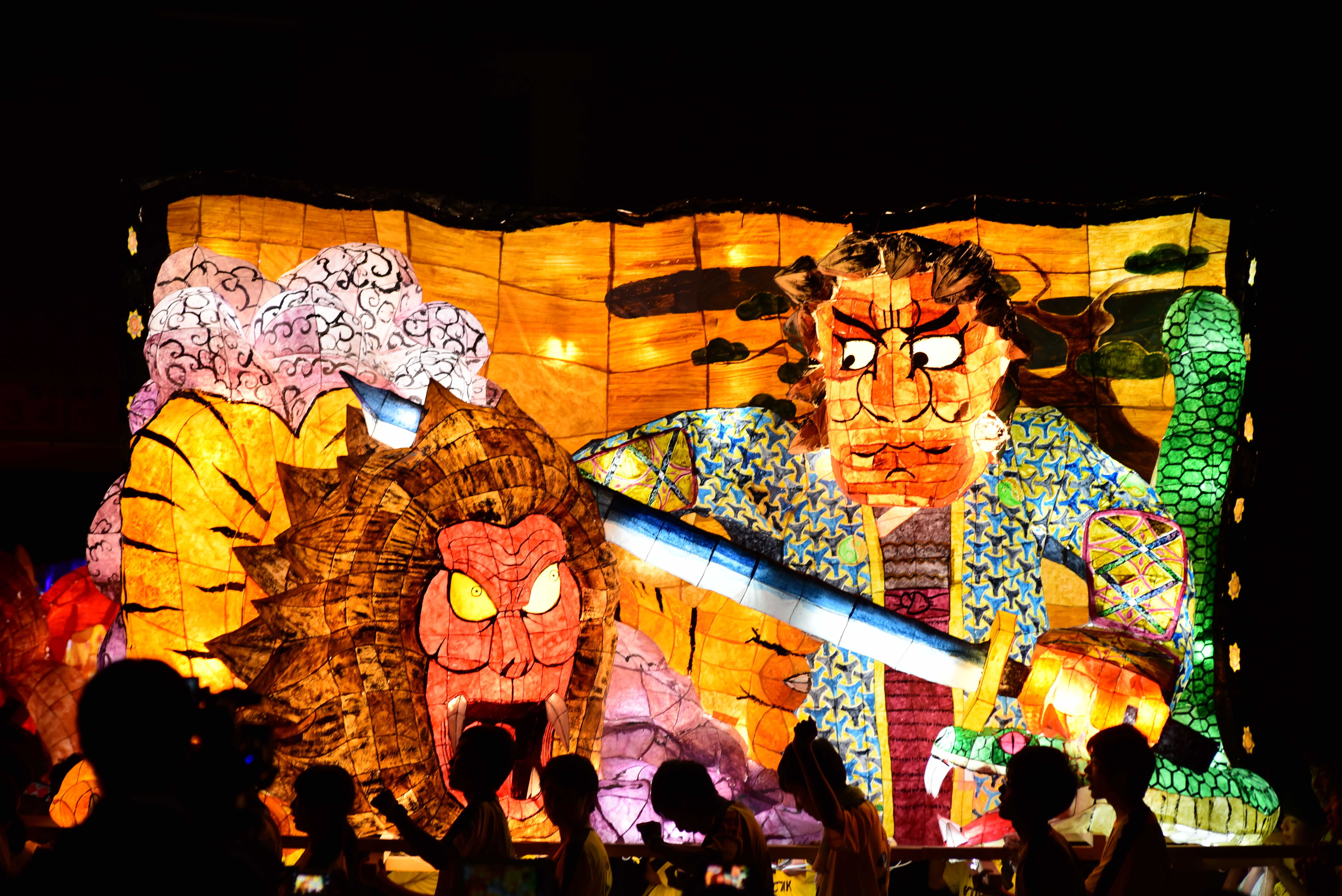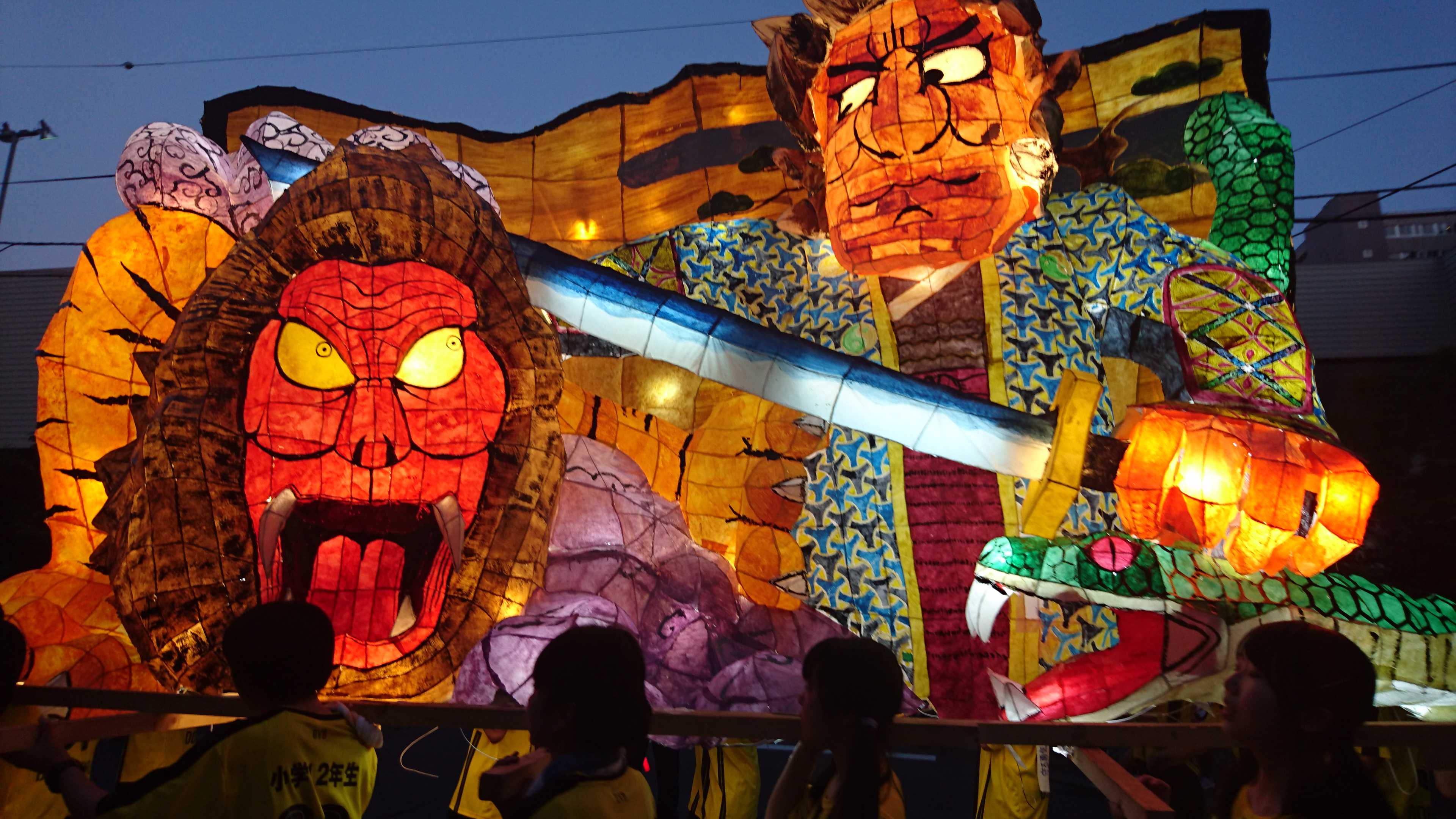 次に鵺です。鵺が大きく目を開いて刀を持つ武者を睨んでいる表情が素晴らしいです。鵺と武者が見合っている場面をよく表現していると思います。北高行灯奥行き足りなさすぎ問題 (いま名付けました) のせいで、鵺も武者も窮屈になっているのは否めないですが…。 あまり目立たないですが蛇の頭もいいですね!目が好きです。