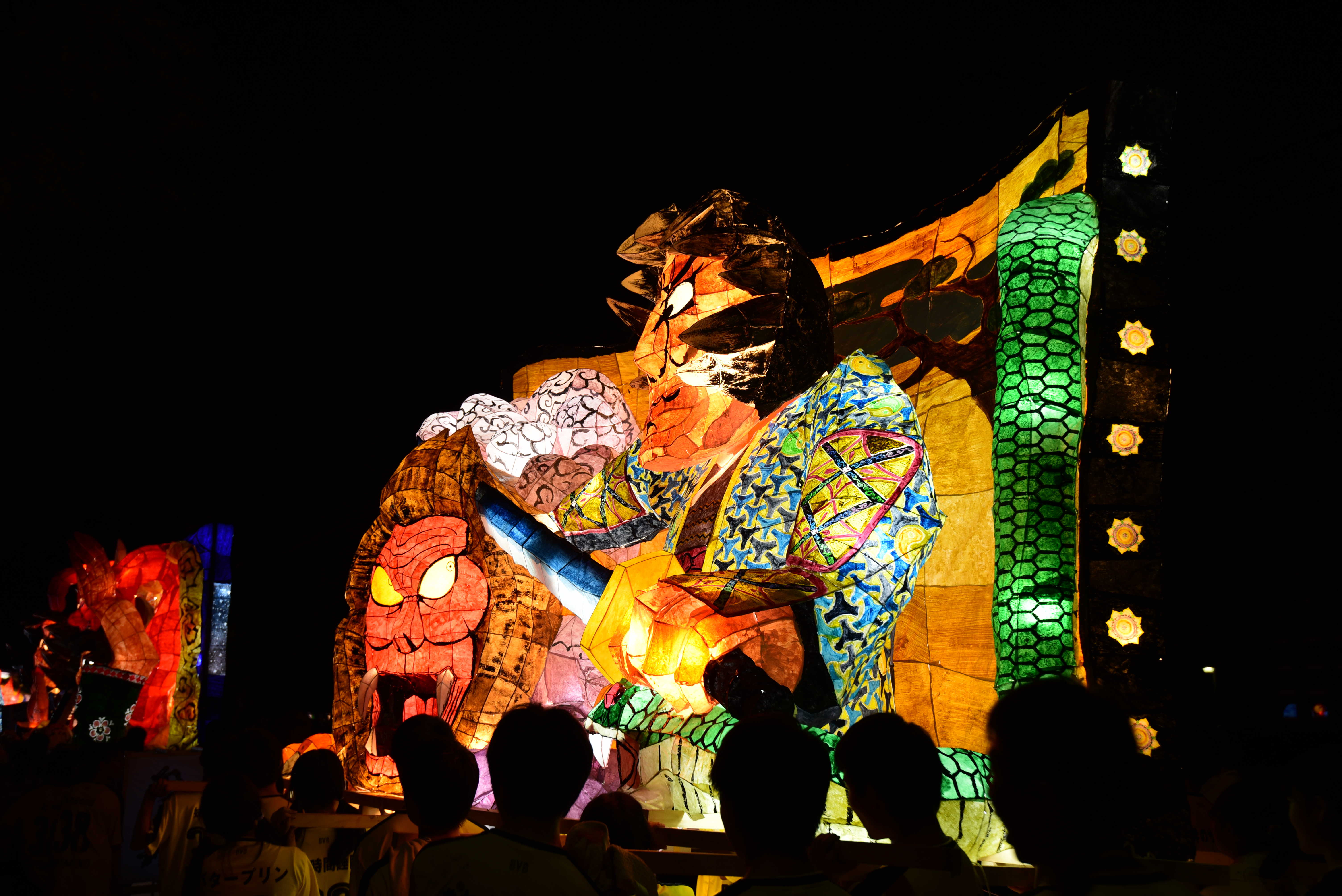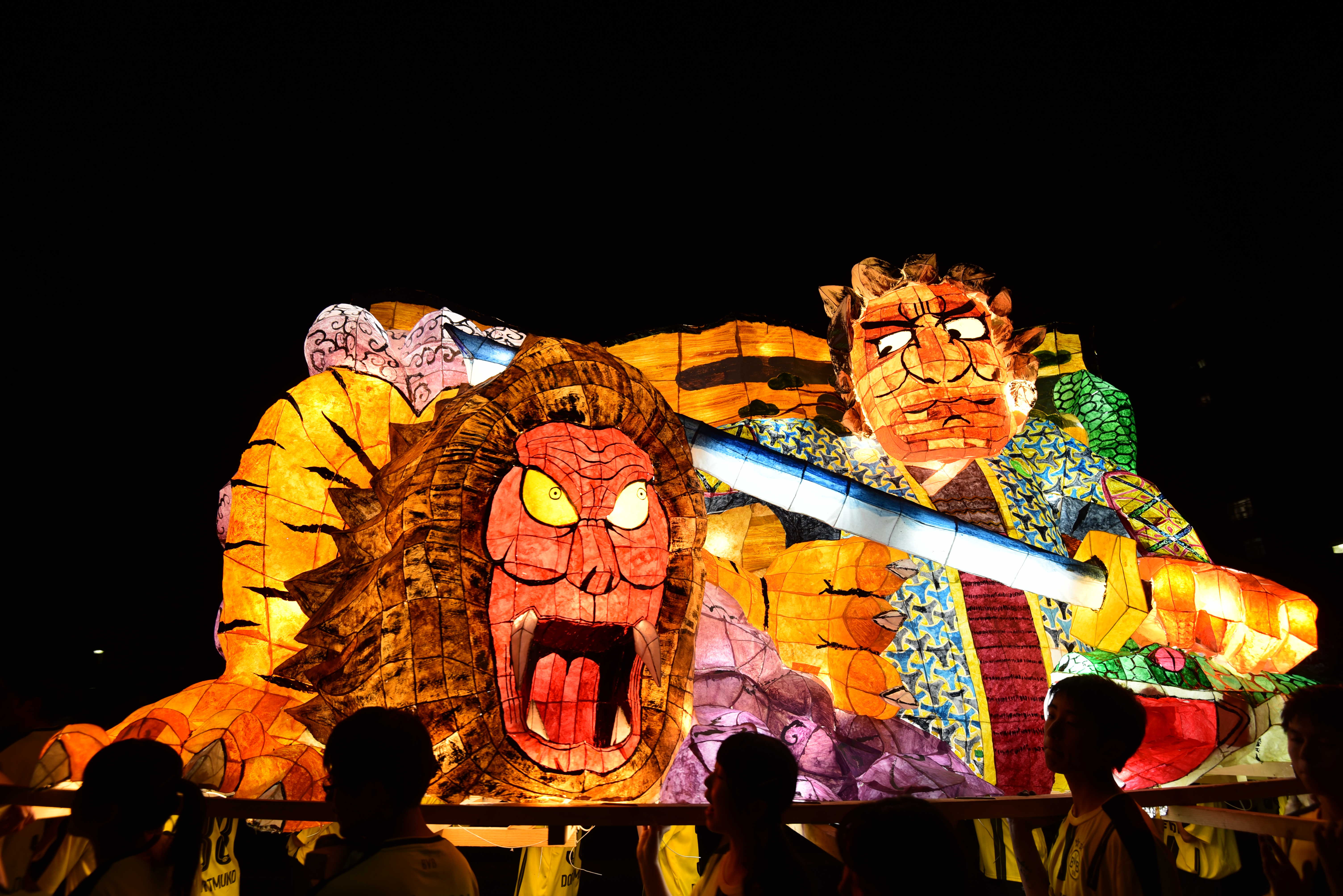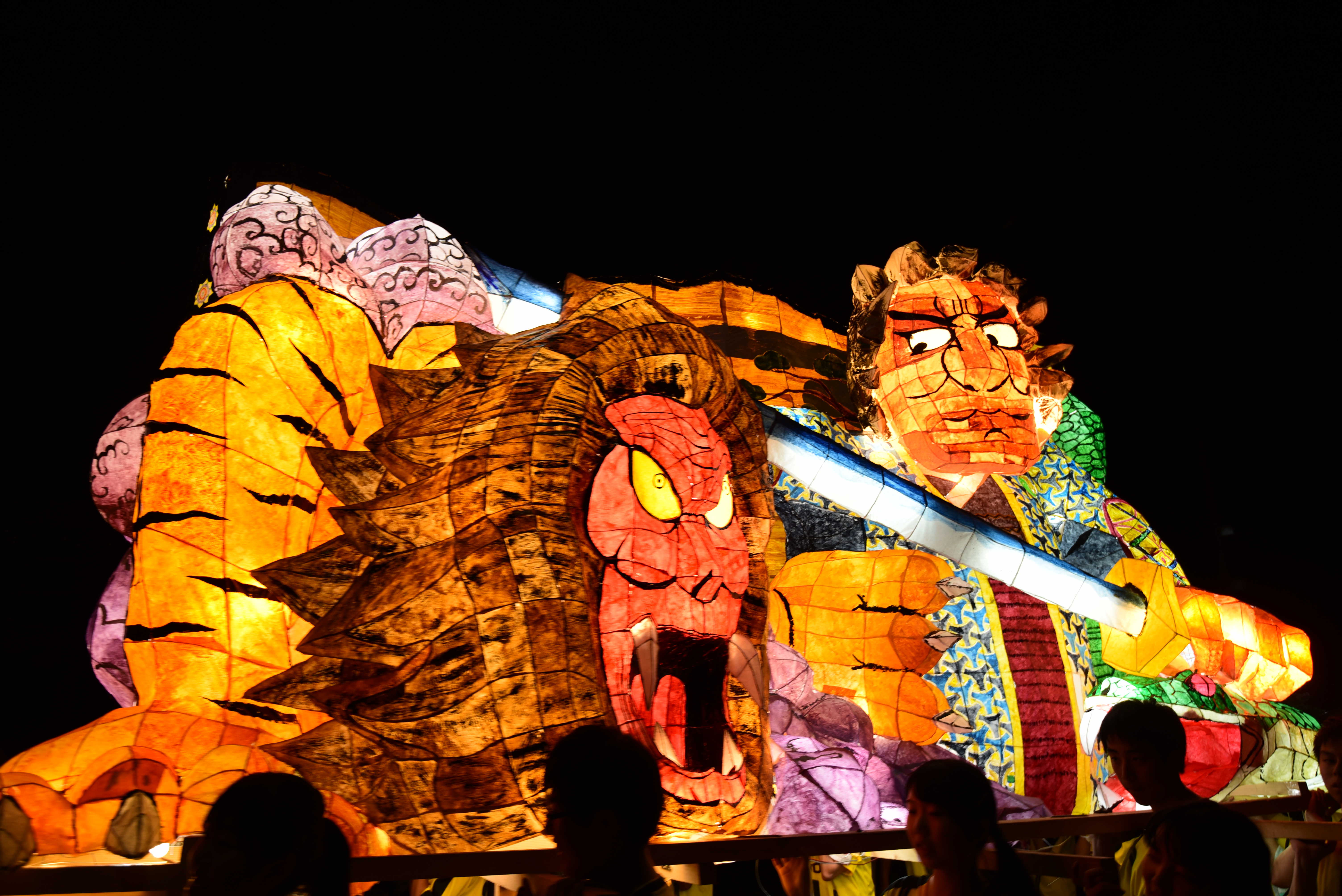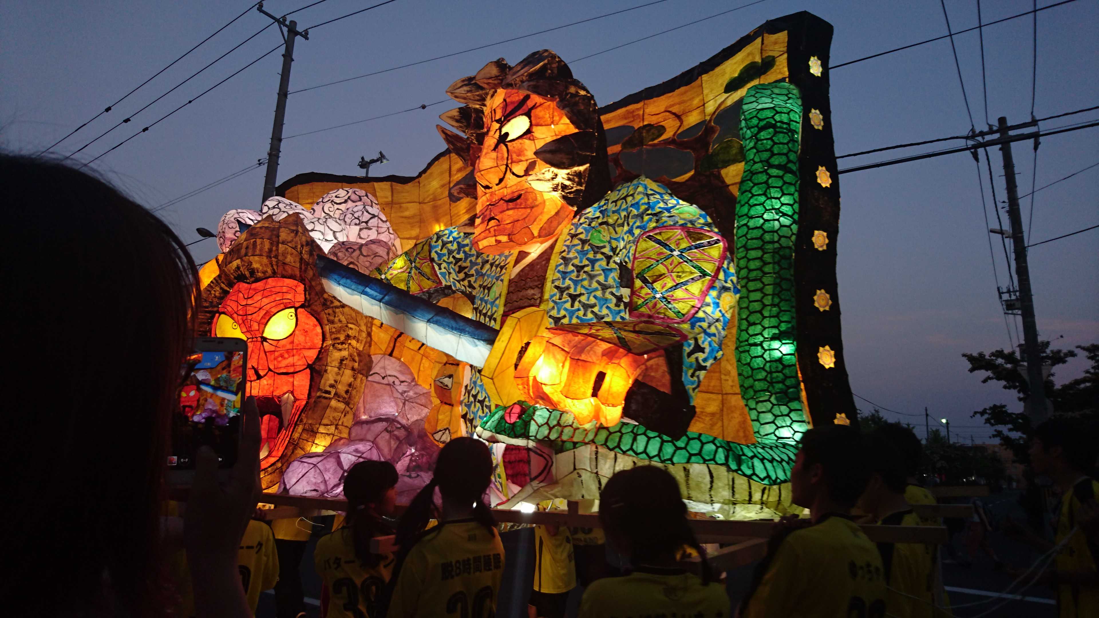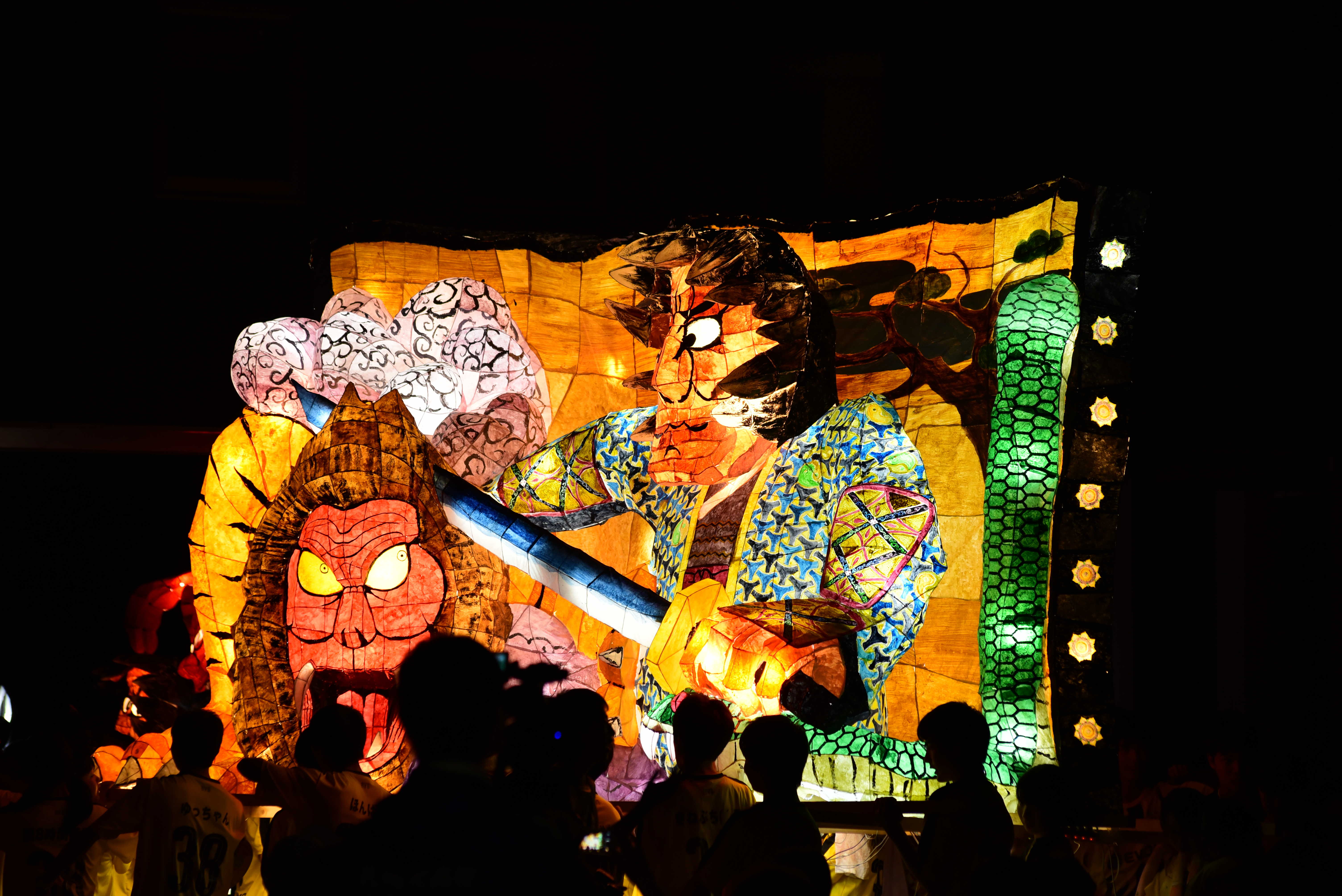 次に鵺です。鵺が大きく目を開いて刀を持つ武者を睨んでいる表情が素晴らしいです。鵺と武者が見合っている場面をよく表現していると思います。北高行灯奥行き足りなさすぎ問題 (いま名付けました) のせいで、鵺も武者も窮屈になっているのは否めないですが…。 あまり目立たないですが蛇の頭もいいですね!目が好きです。