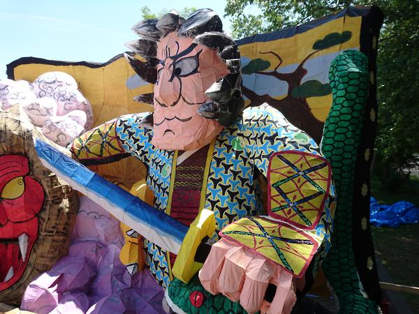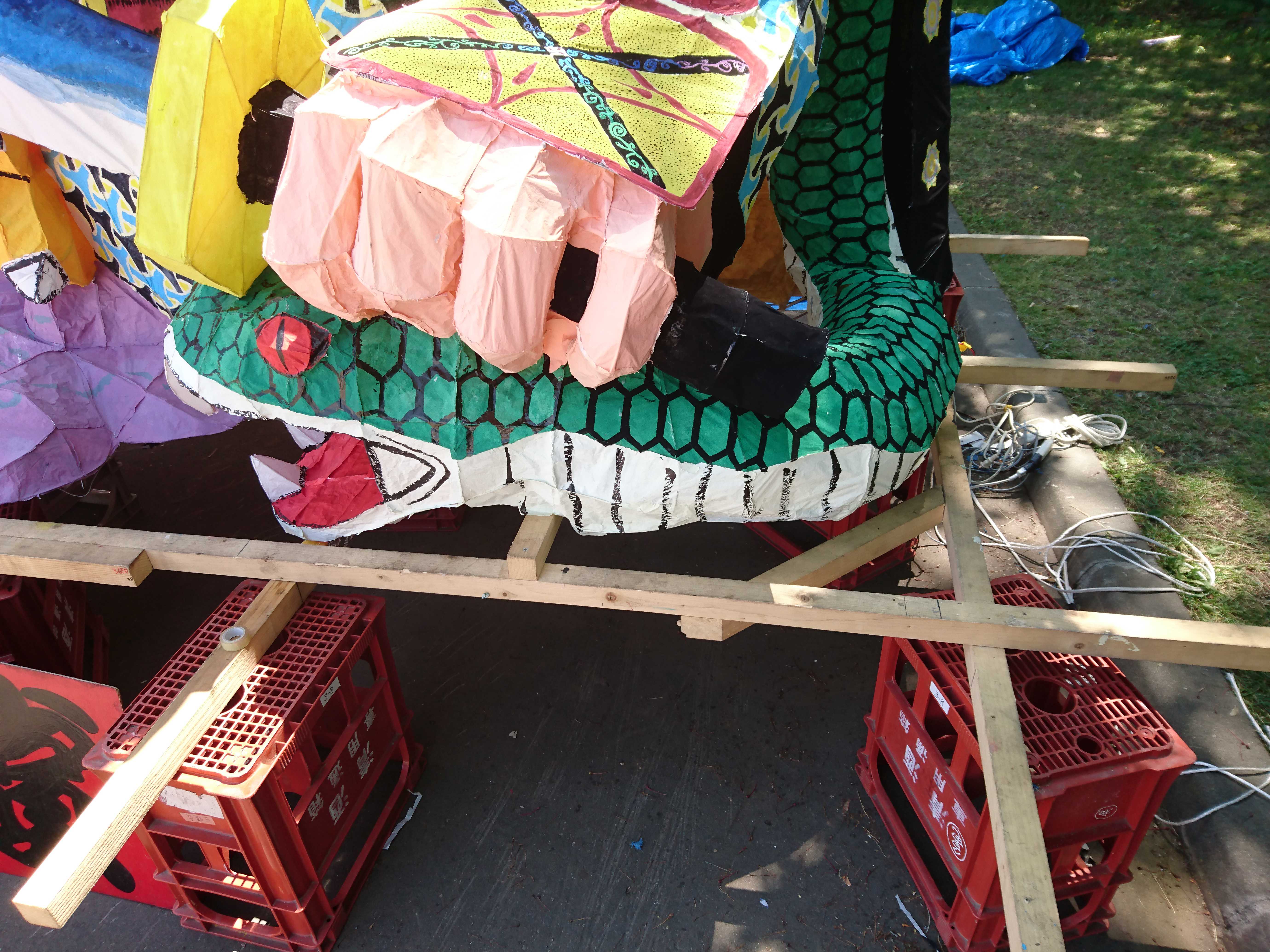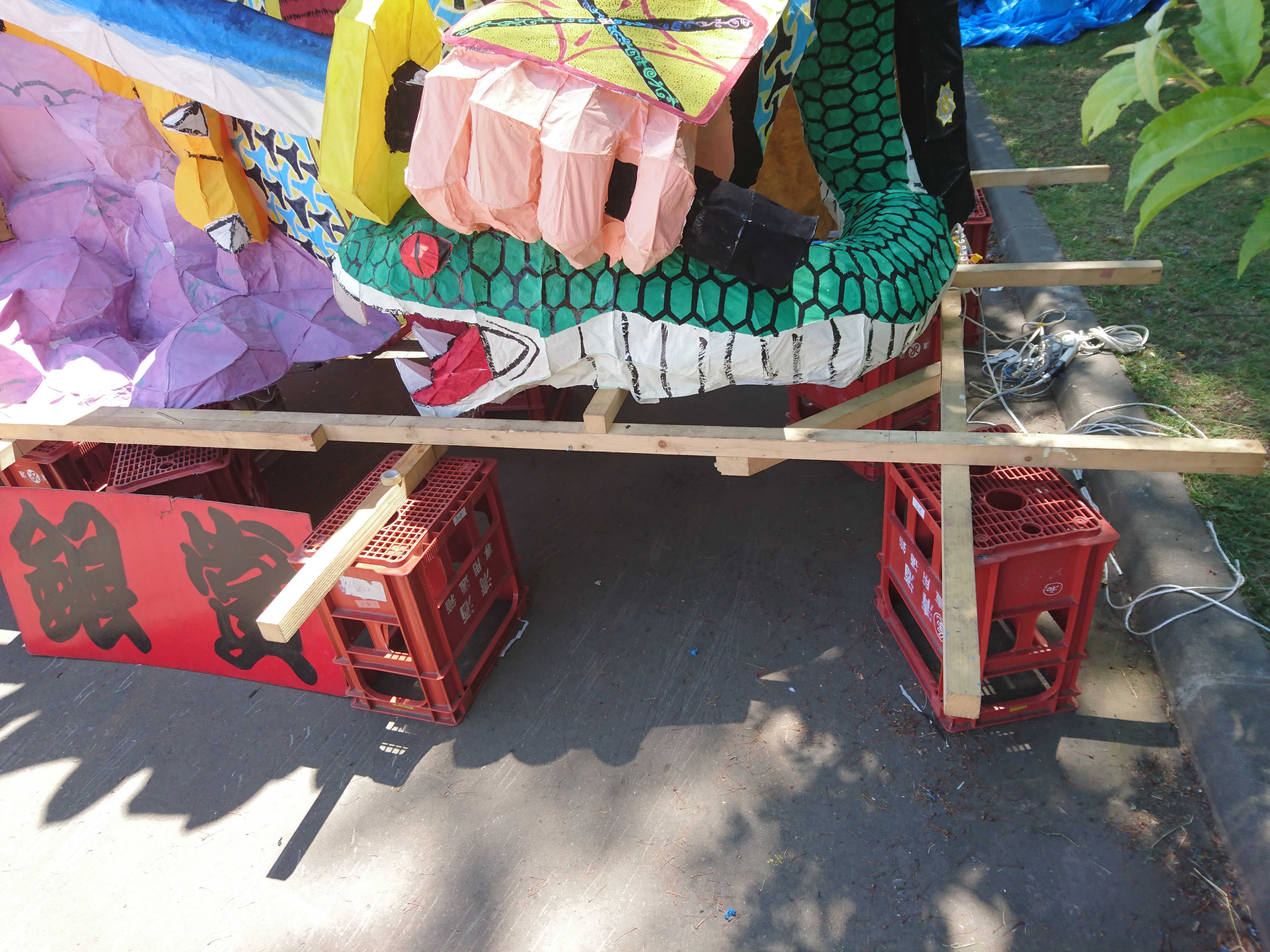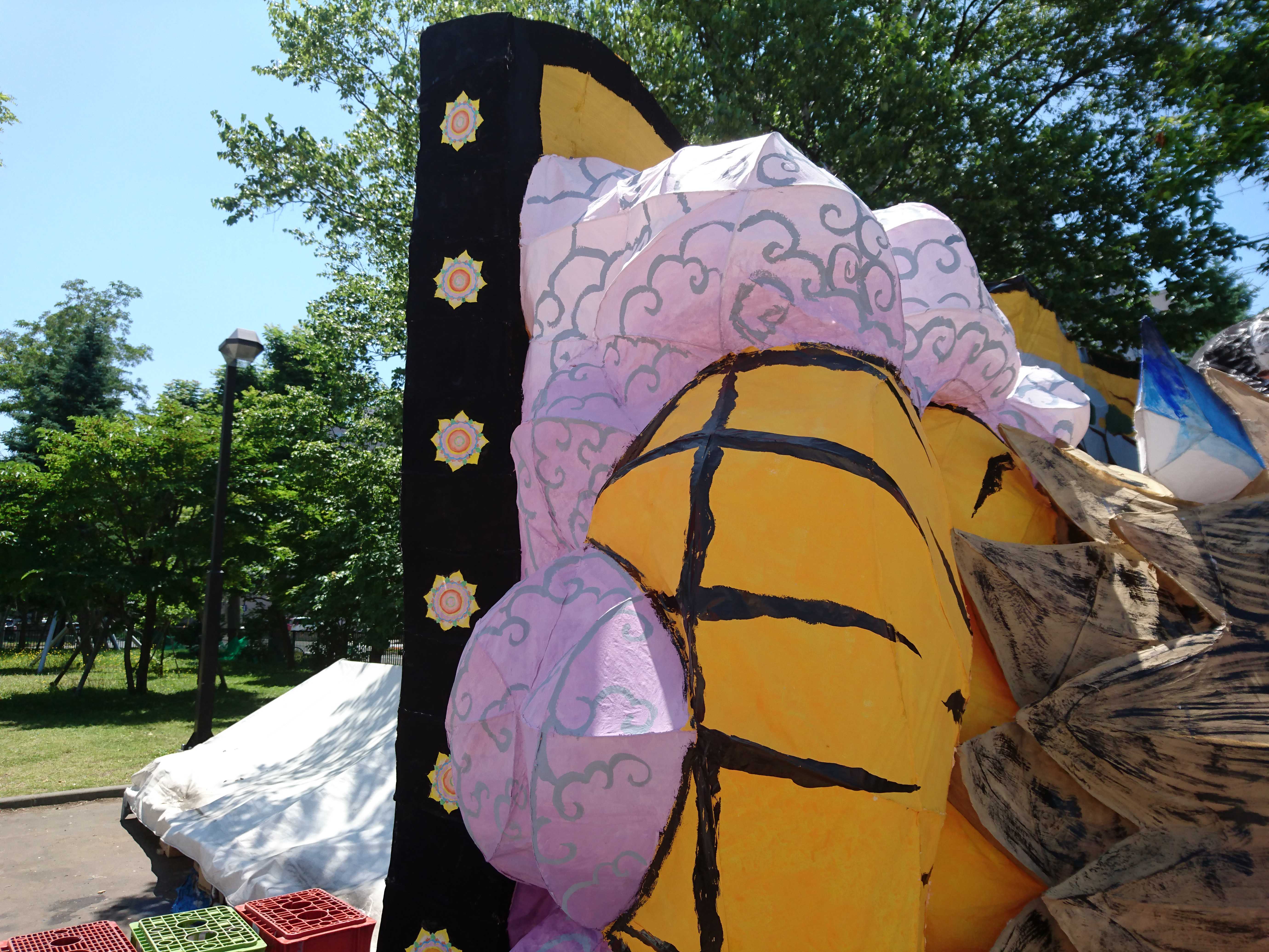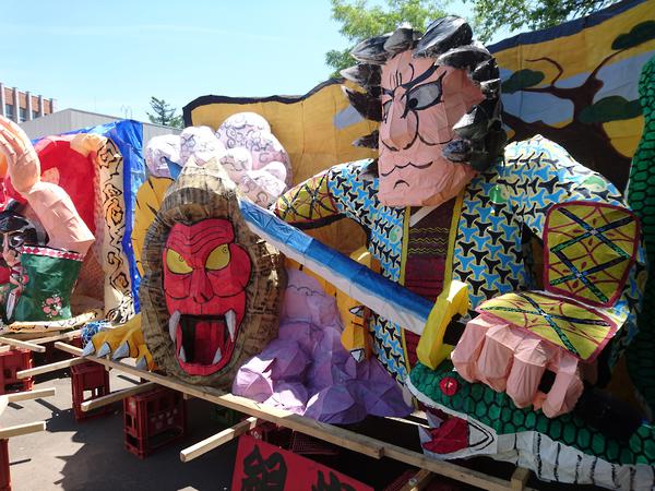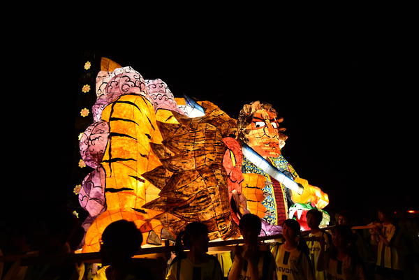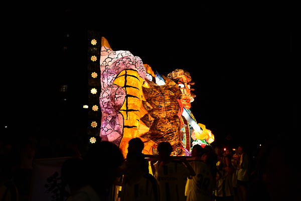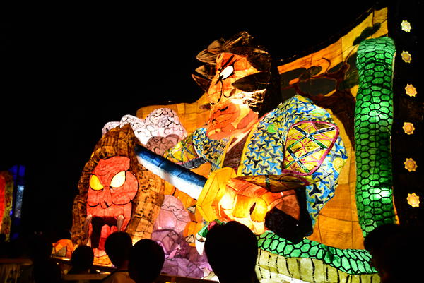 次に鵺です。鵺が大きく目を開いて刀を持つ武者を睨んでいる表情が素晴らしいです。鵺と武者が見合っている場面をよく表現していると思います。北高行灯奥行き足りなさすぎ問題 (いま名付けました) のせいで、鵺も武者も窮屈になっているのは否めないですが…。 あまり目立たないですが蛇の頭もいいですね!目が好きです。