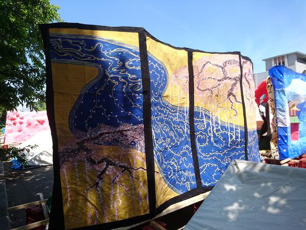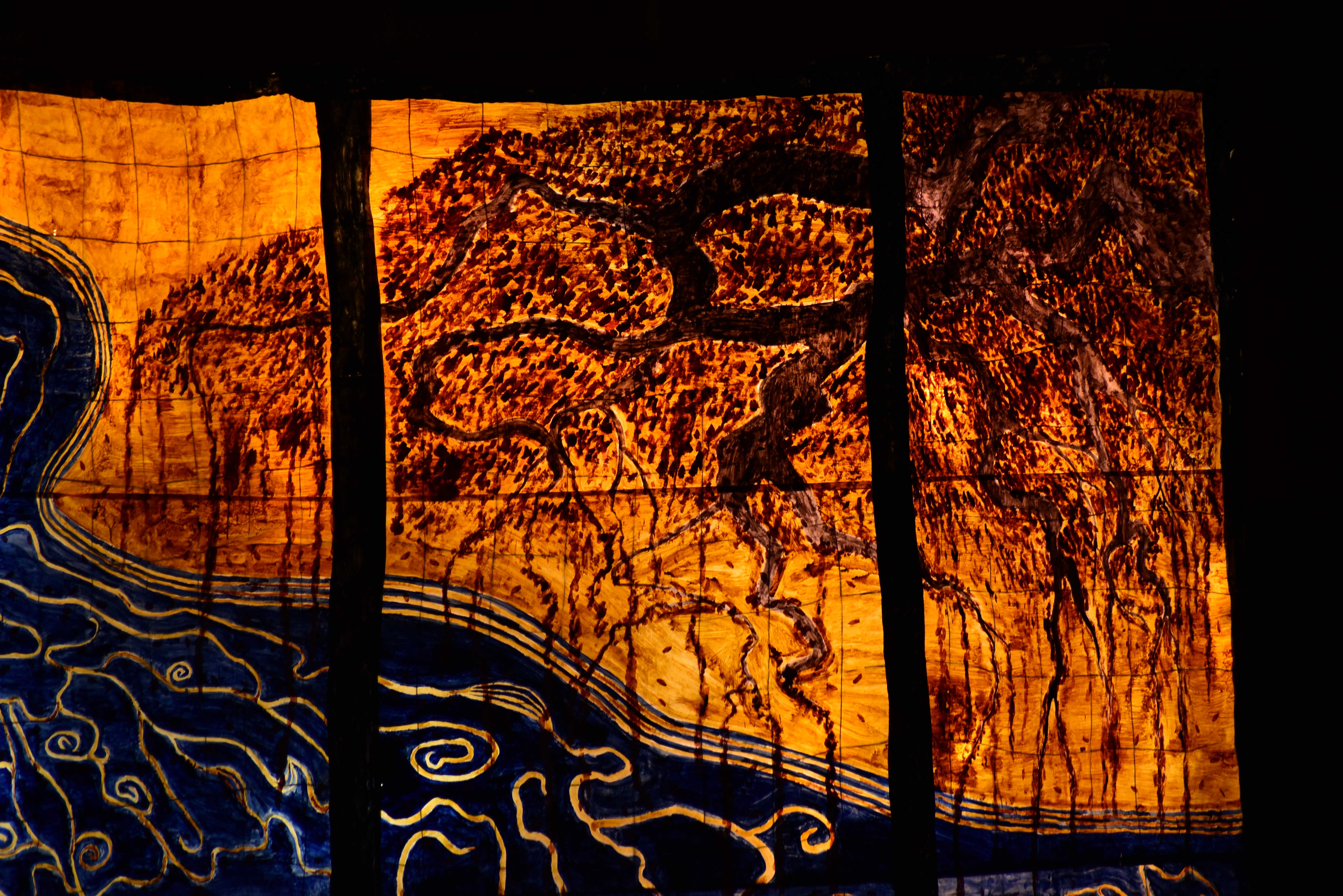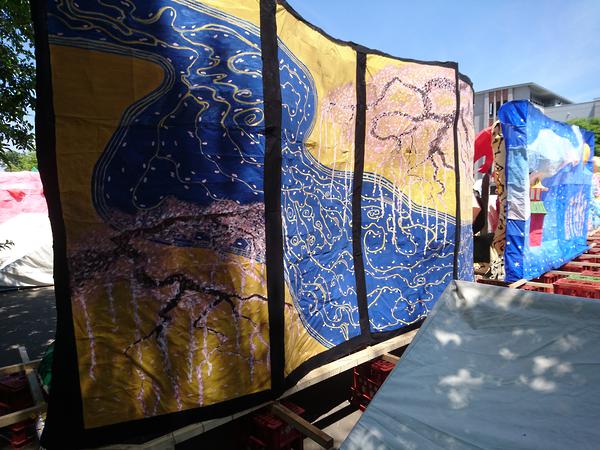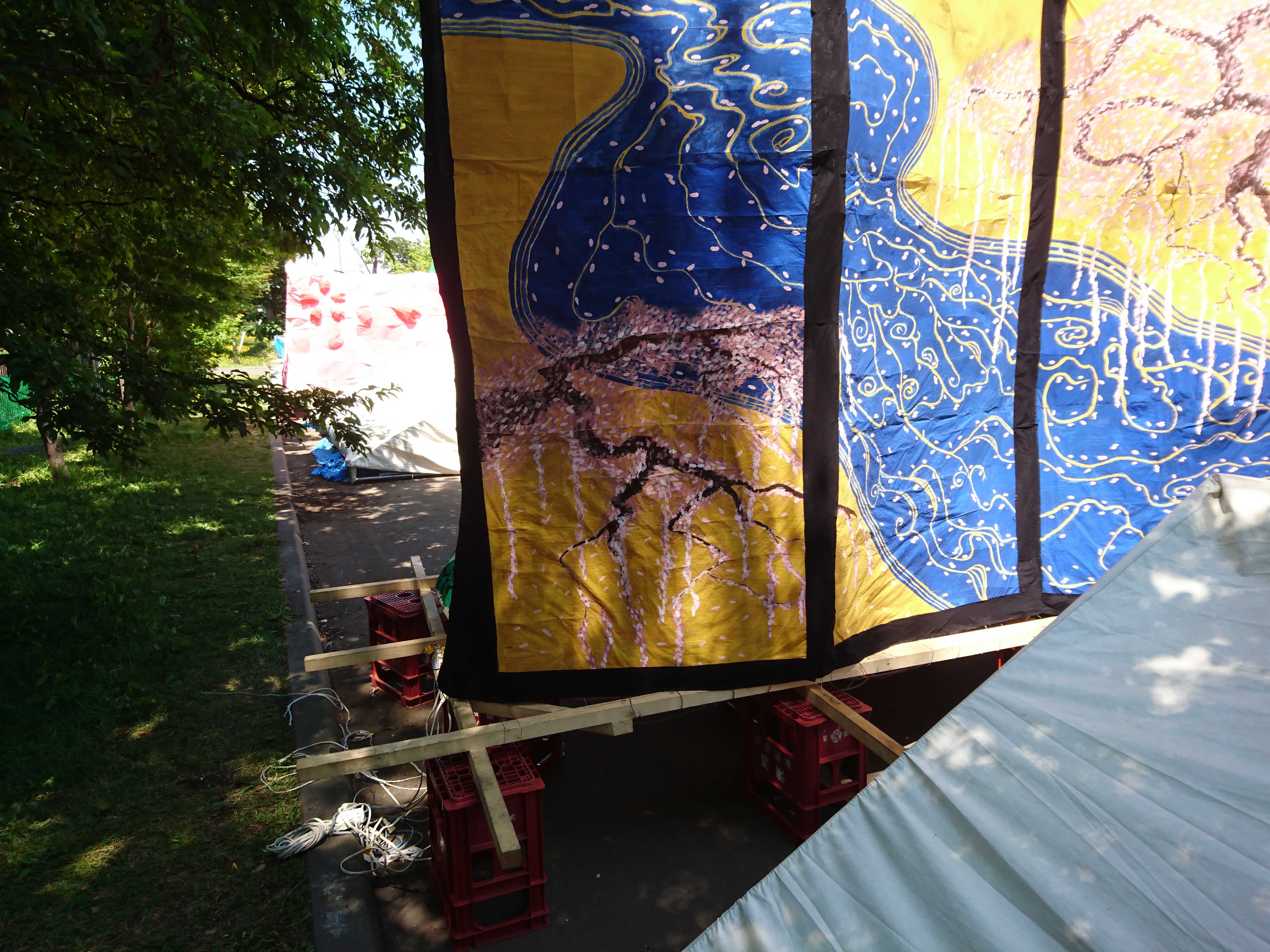 - 裏側が息を飲むような美しい絵になっています。屏風はいままでいくつかのクラスがやっていたと思うのですが、一番綺麗なのではないかなと思います。色合いがとても好きです。横や、前から見える側にも柄や絵を描いているのがいいですね!細かいところまで考えられているのが伝わります。