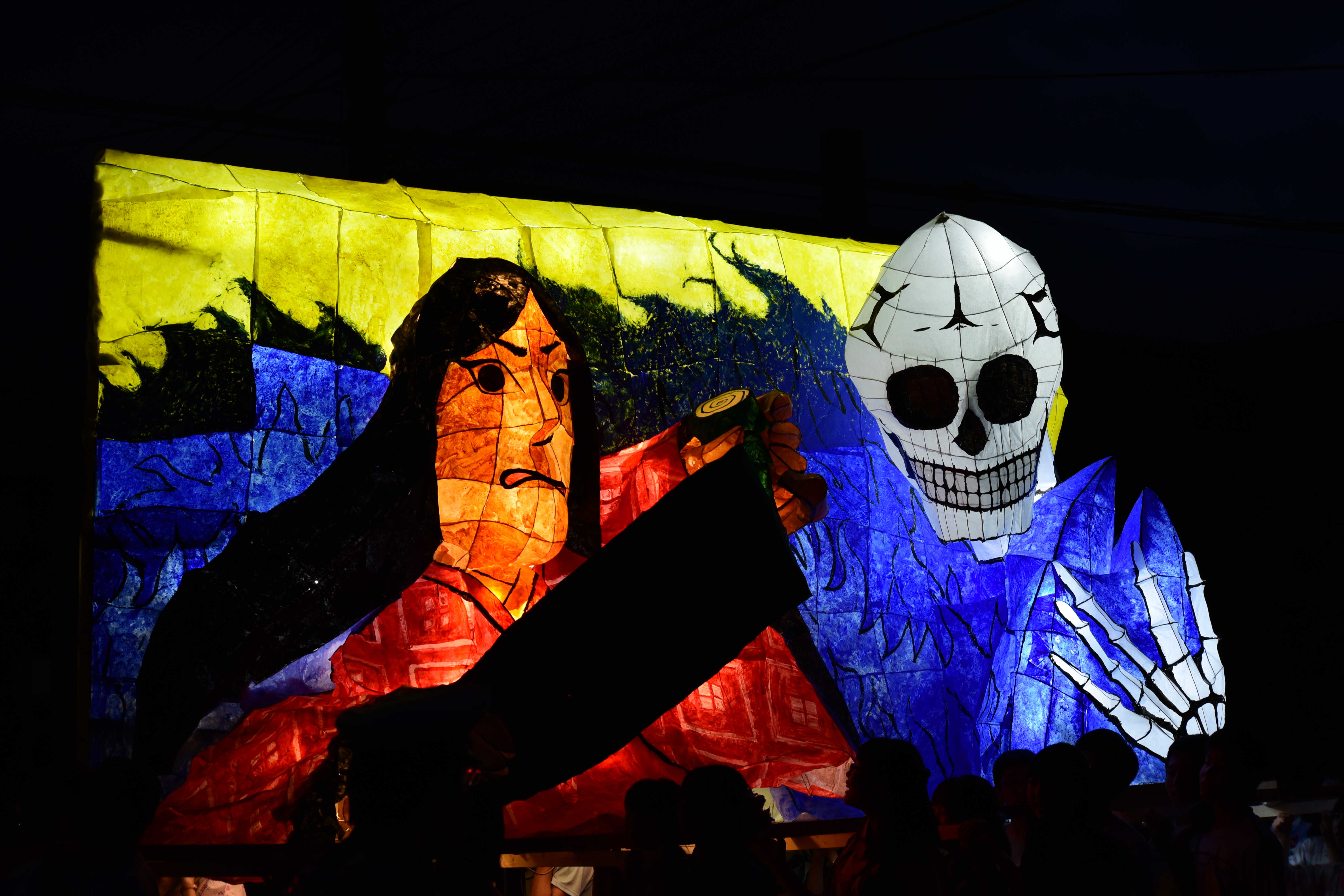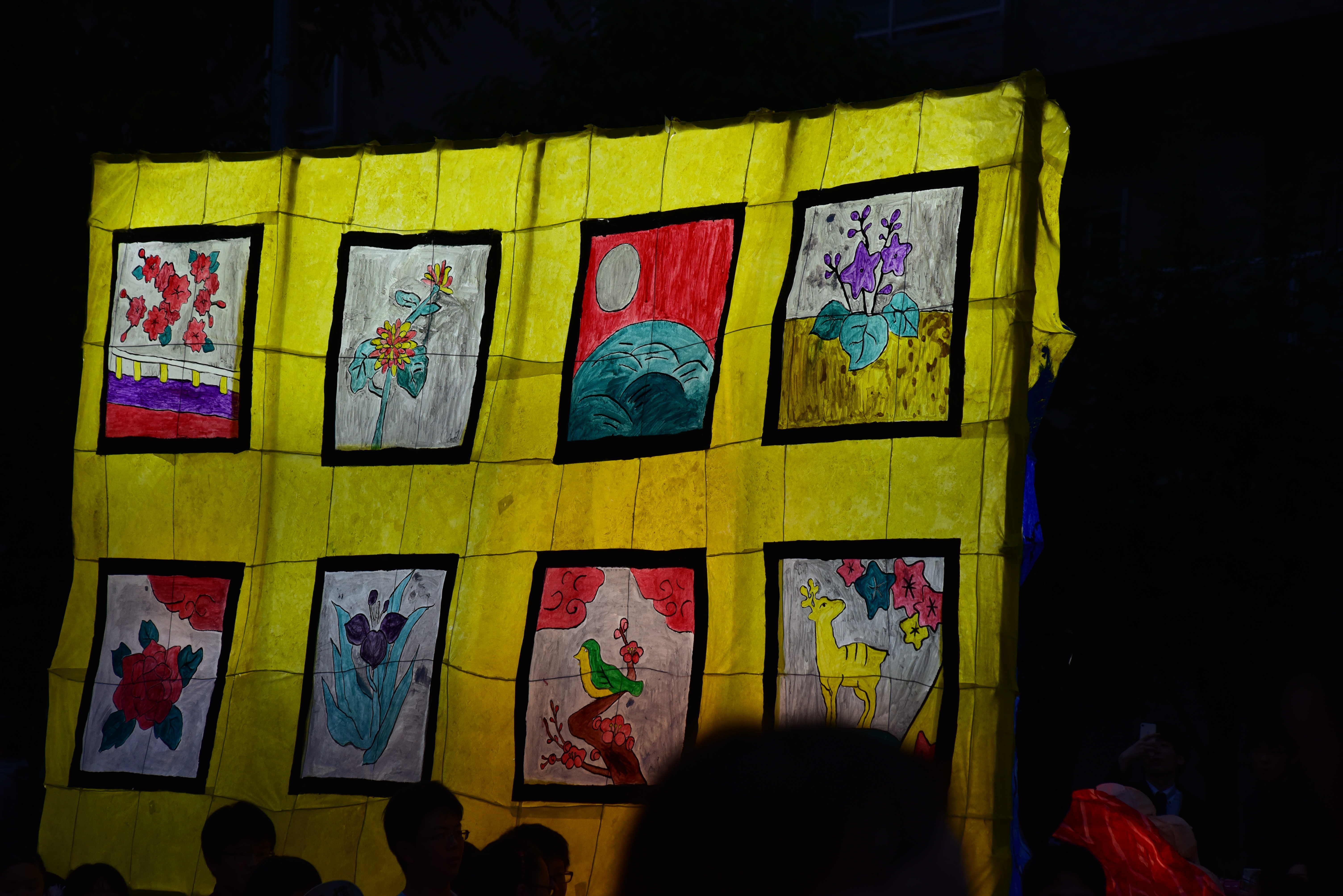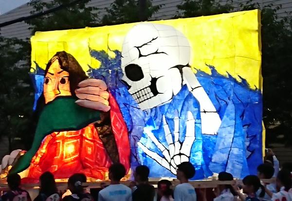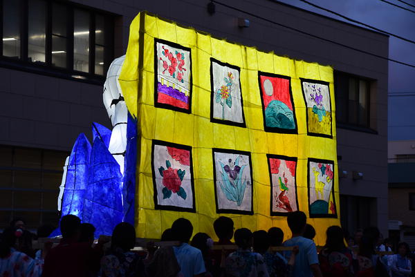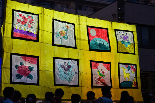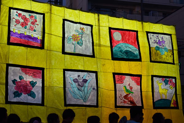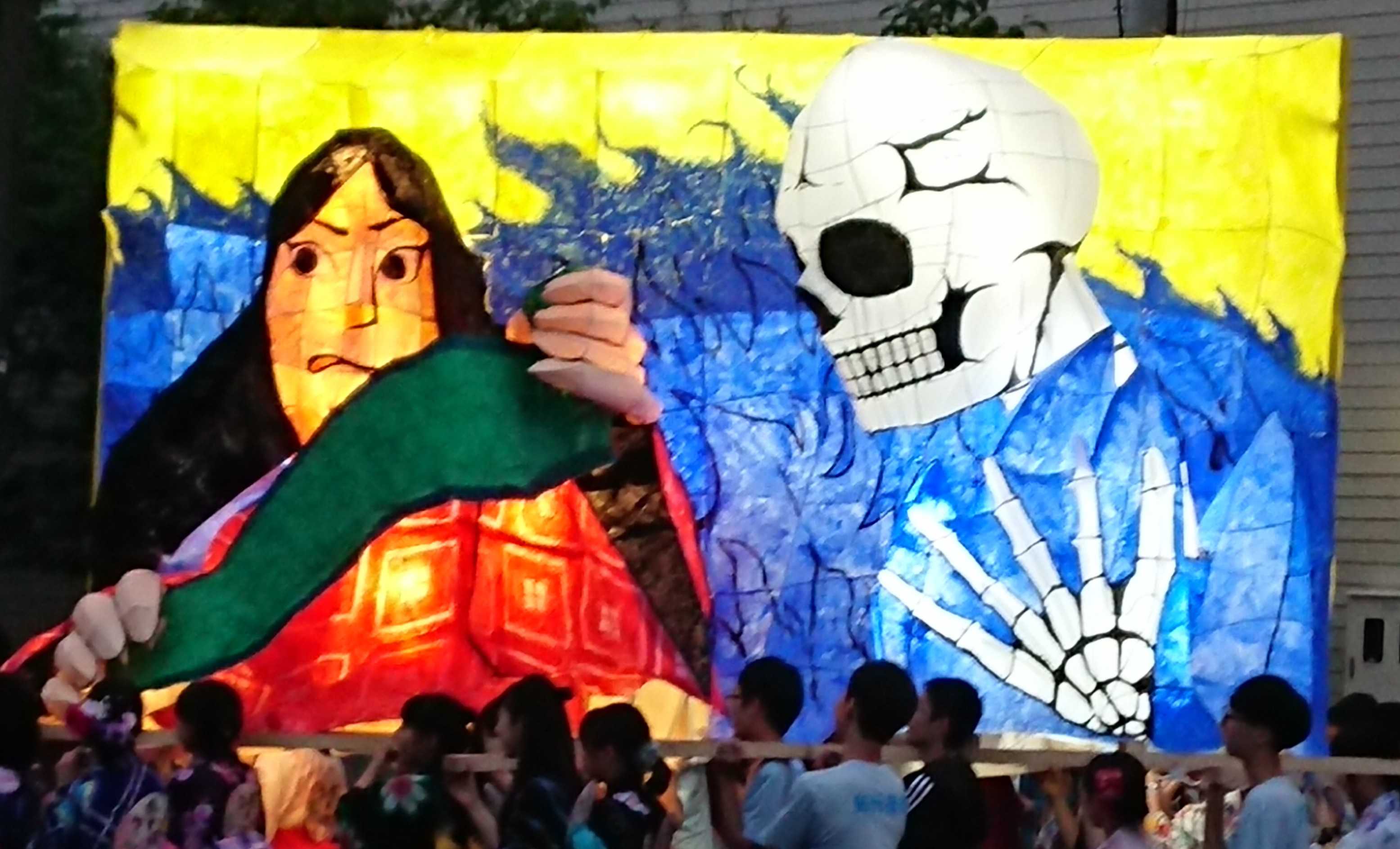 女性の面とドクロはともに墨入れのみずみずしさがとてもいいですね。墨入れは急いでやると掠れてしまいがちなのですが、この行灯は全然掠れていないので、丁寧に塗ったのだなと思いました。女性の眉は毛っぽくなっていて、使い分けられていて素晴らしいです。 裏側の花札もとても丁寧でよかったです。