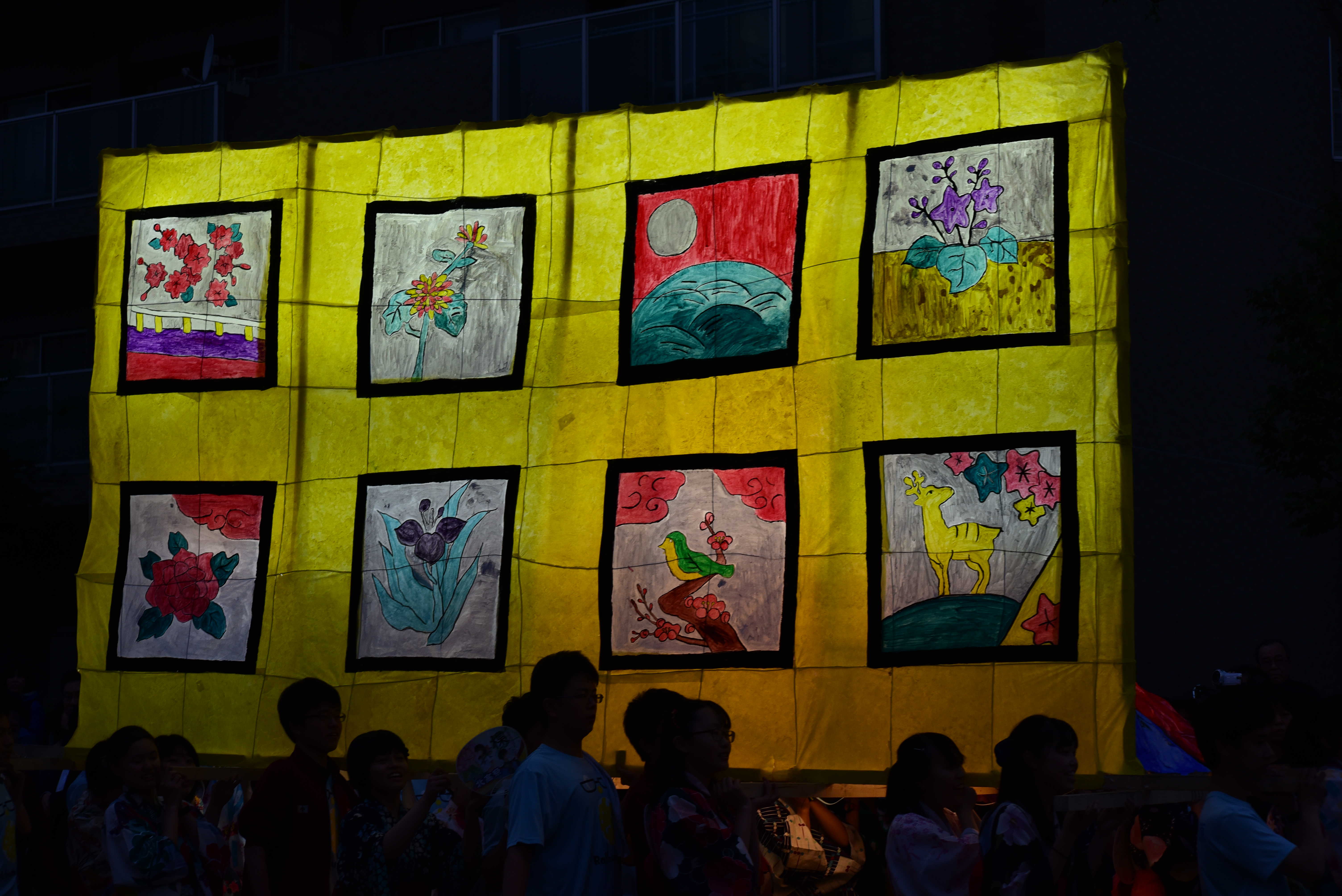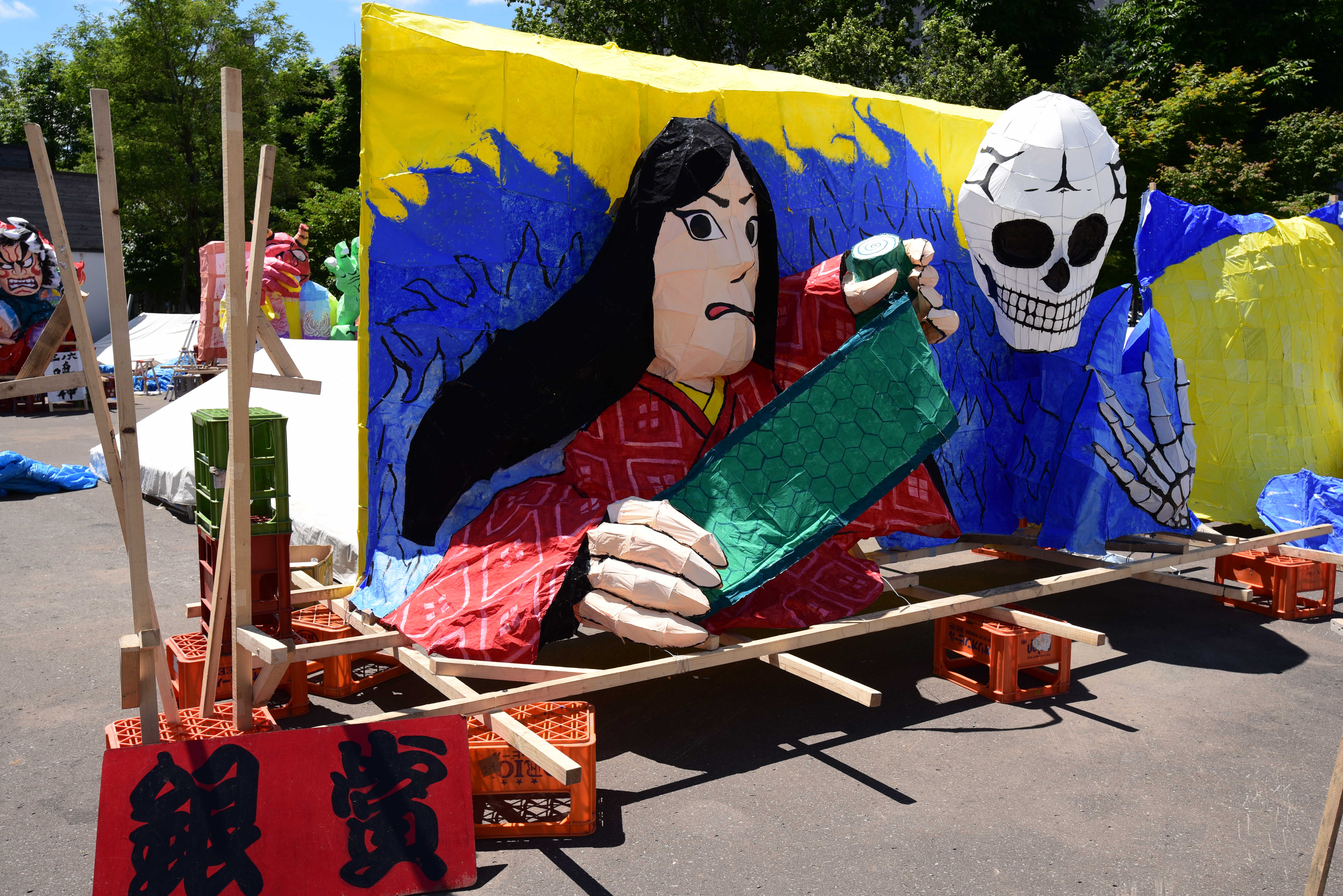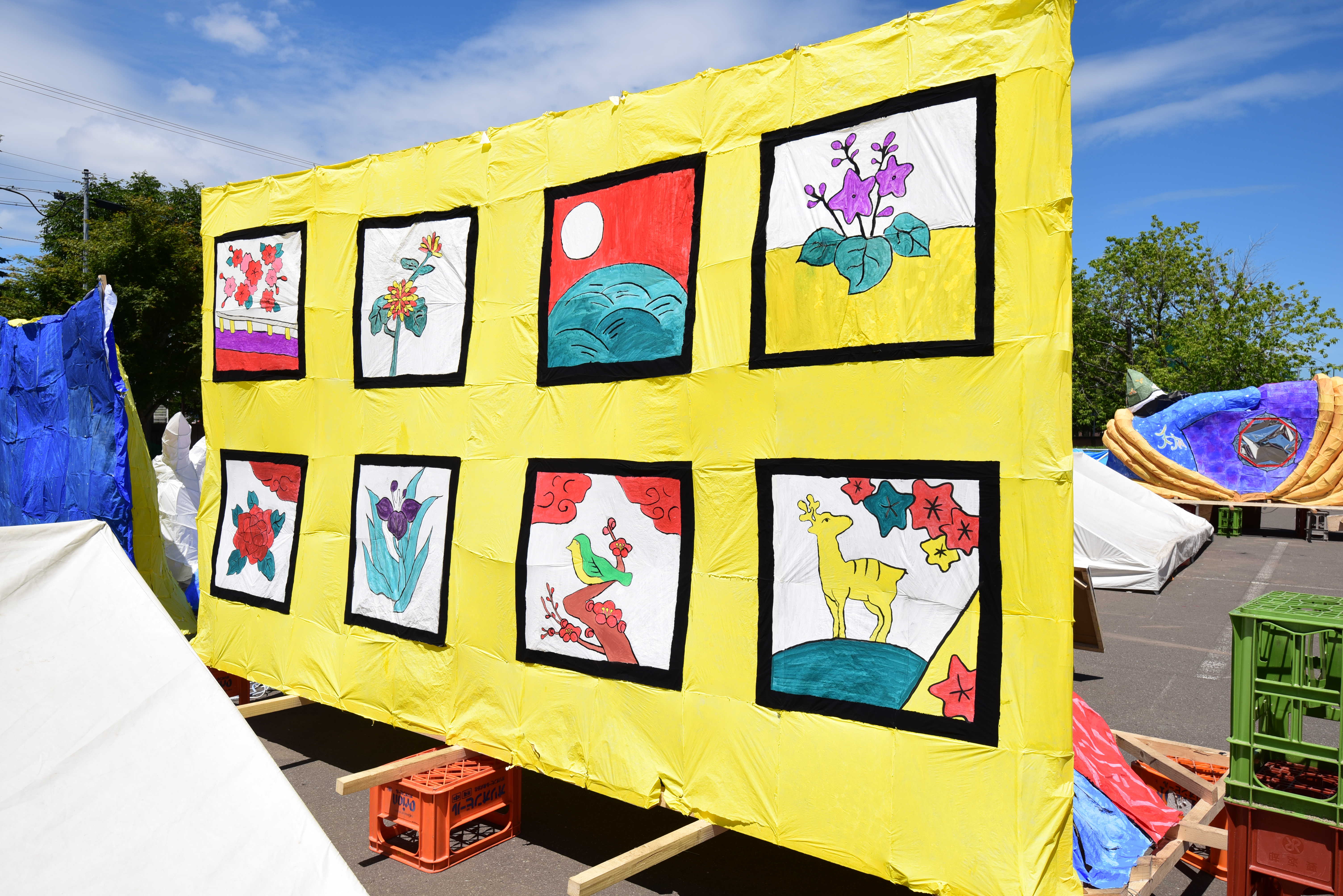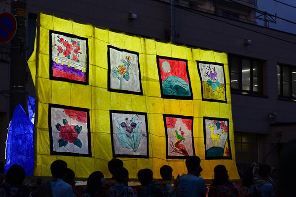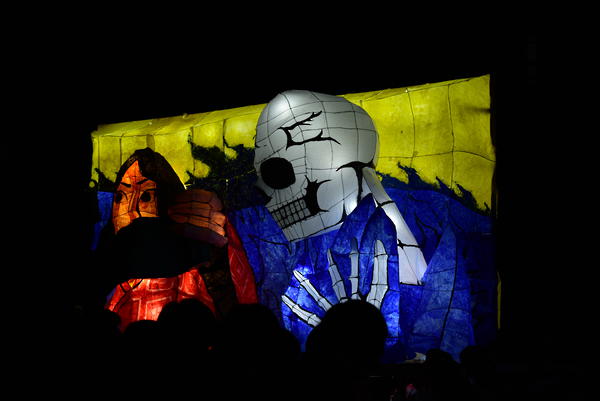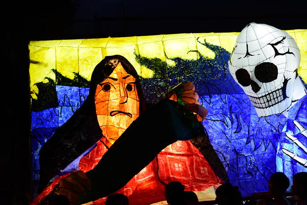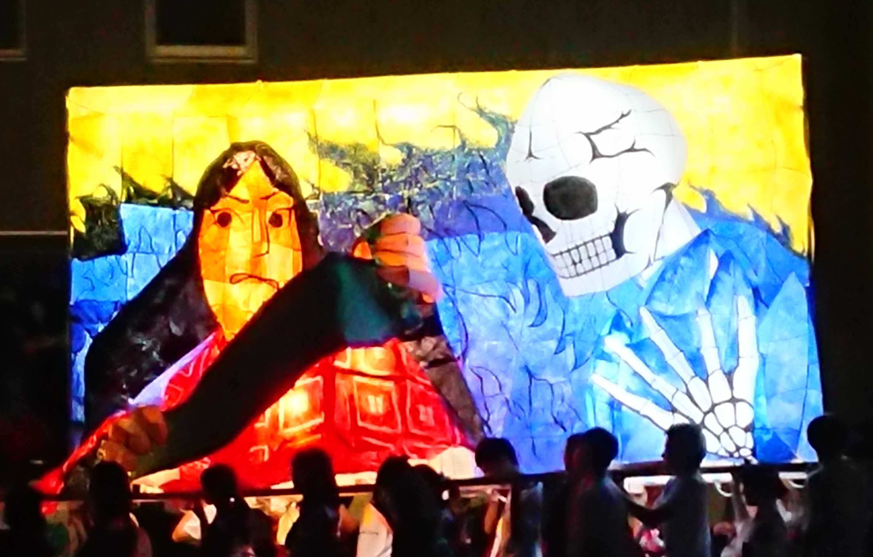 女性の面とドクロはともに墨入れのみずみずしさがとてもいいですね。墨入れは急いでやると掠れてしまいがちなのですが、この行灯は全然掠れていないので、丁寧に塗ったのだなと思いました。女性の眉は毛っぽくなっていて、使い分けられていて素晴らしいです。 裏側の花札もとても丁寧でよかったです。