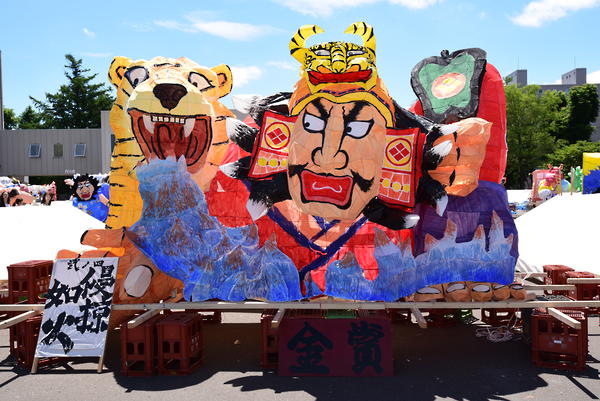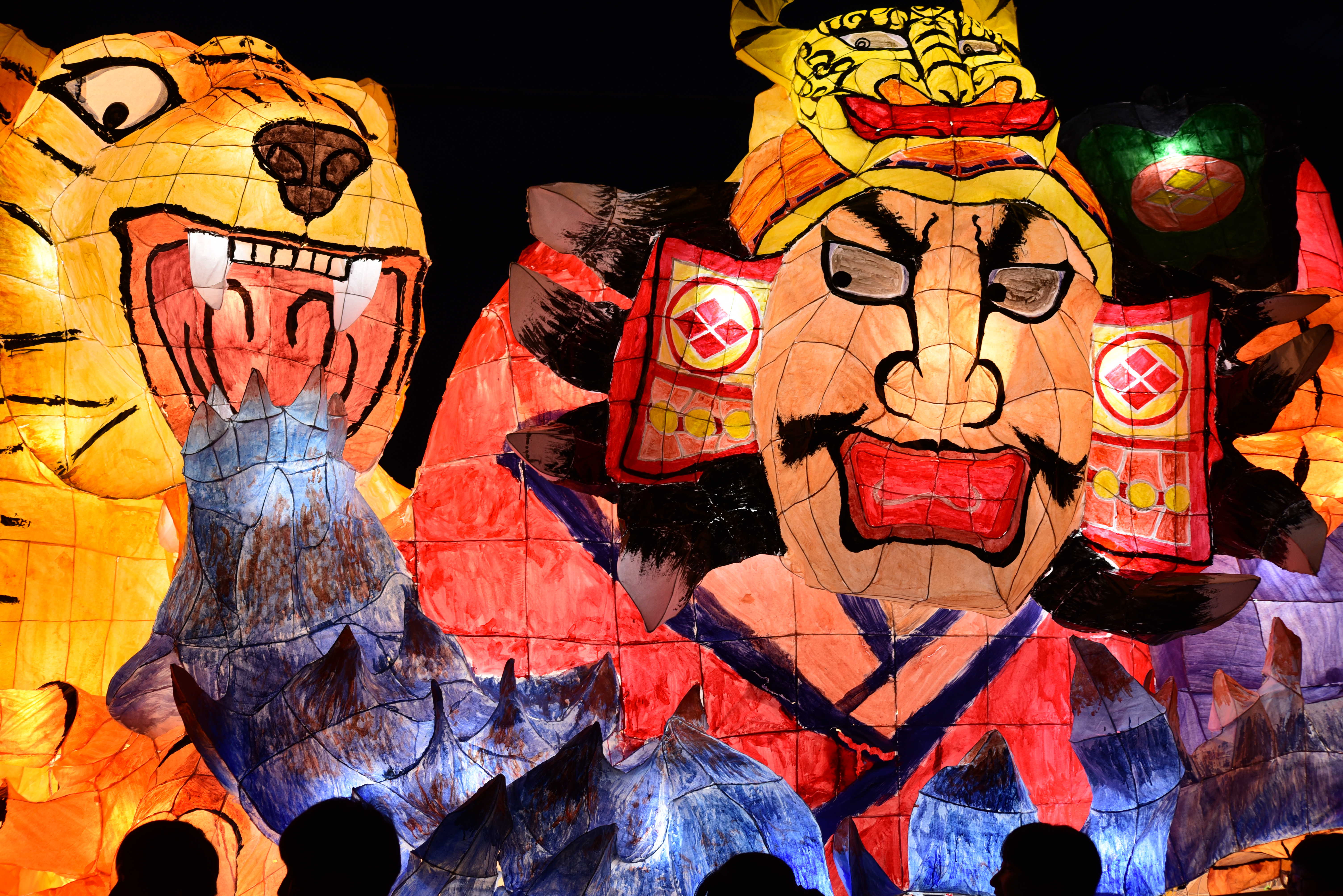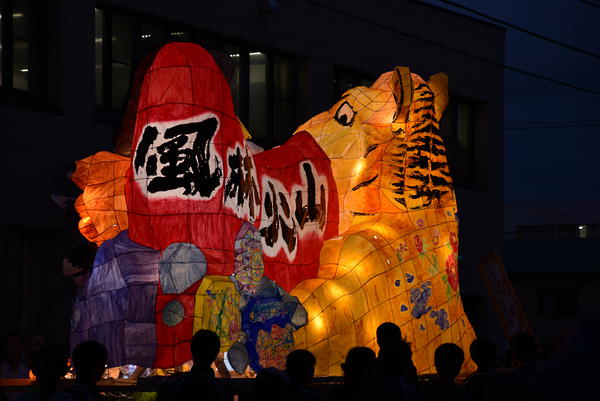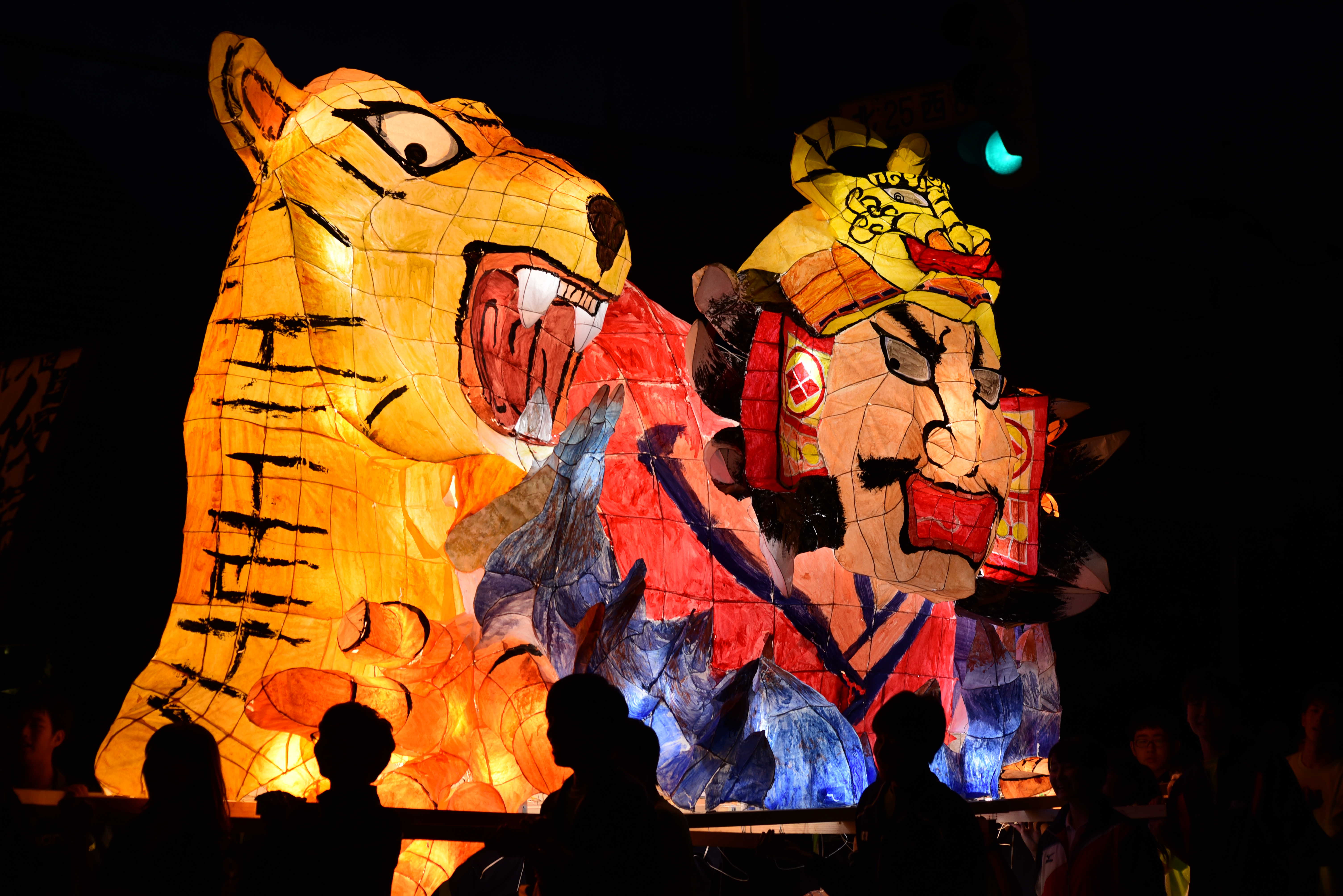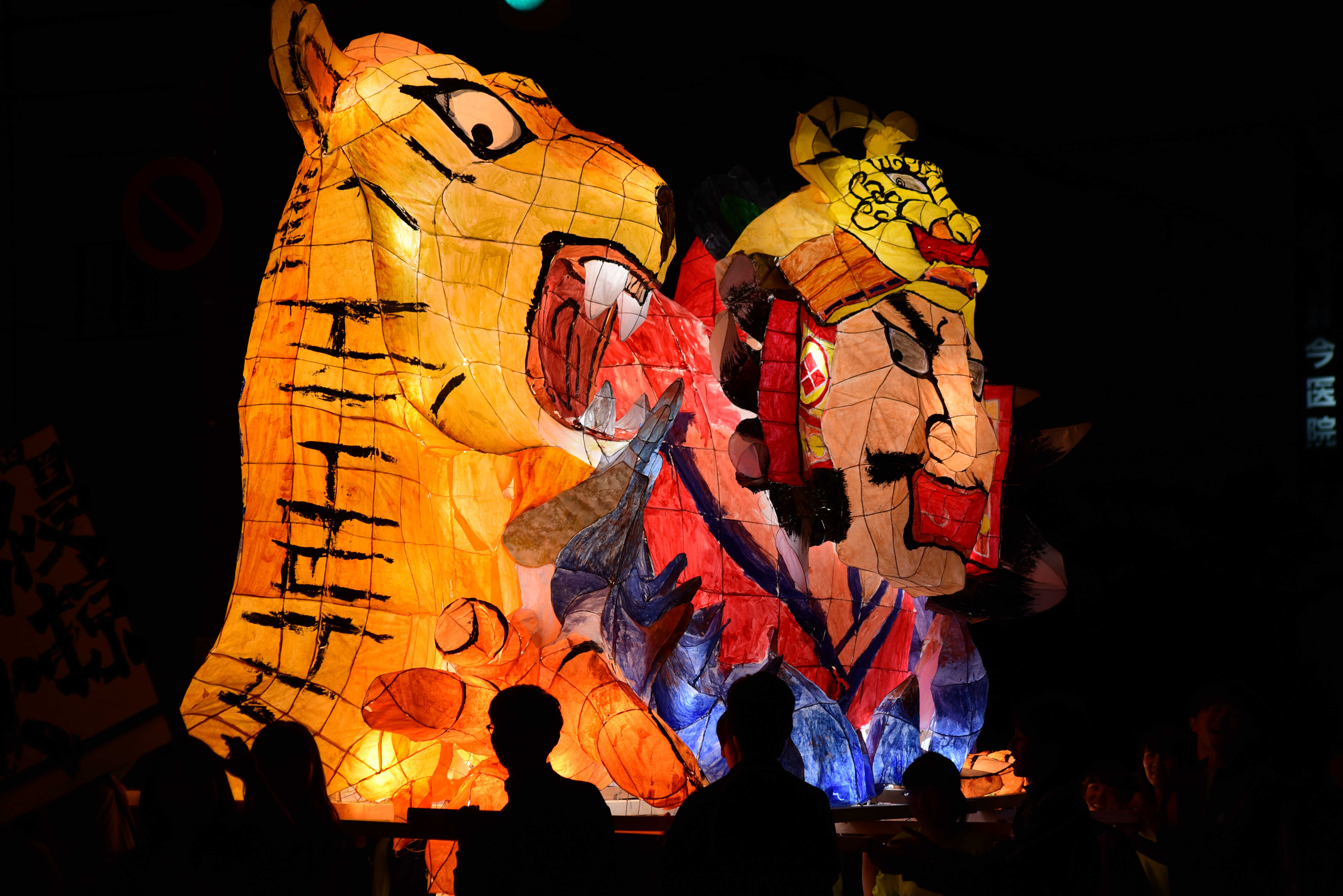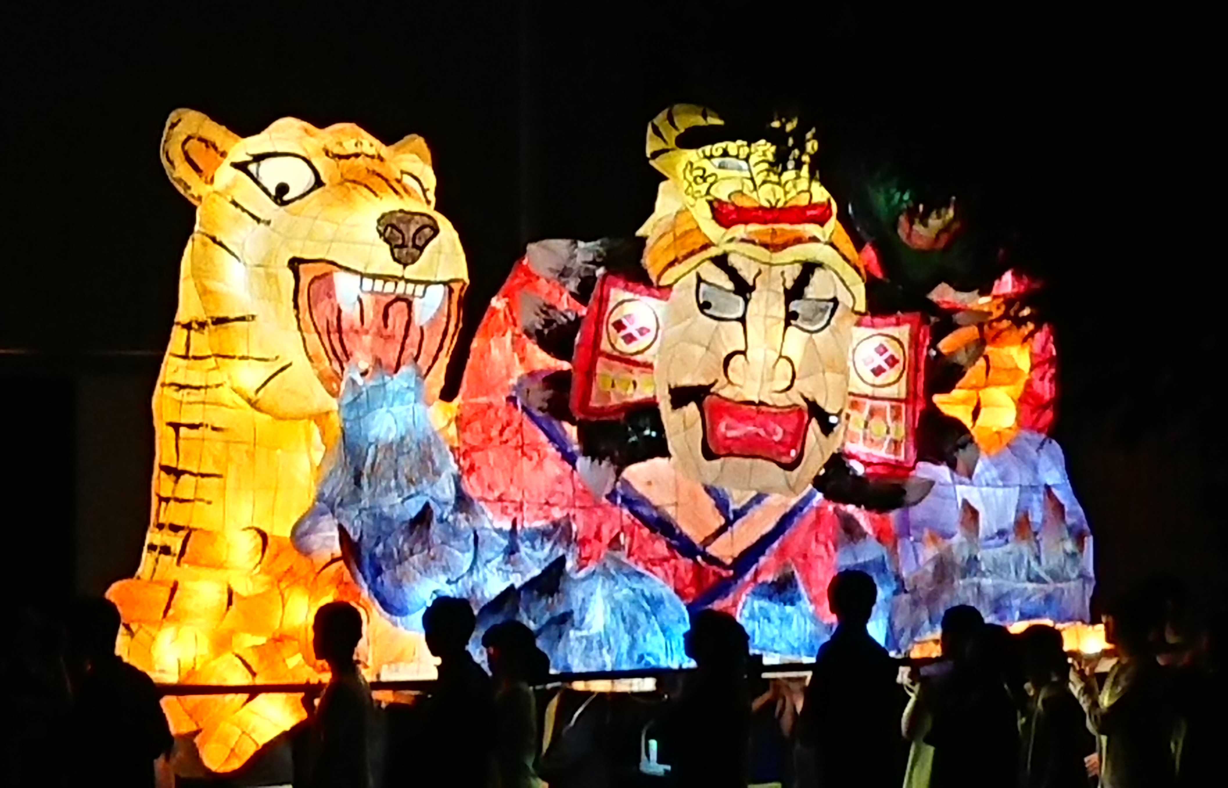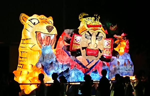 - 虎・人ともに大きくはっきりと作られていて、鮮やかな色が多かったので、何を表している行灯なのかがとても分かりやすかったです。また、針金、電飾、紙貼りなどすべての技術が安定していたため、金賞になったのだと思います。あとは、兜のデザインが凝っていてよかったです。