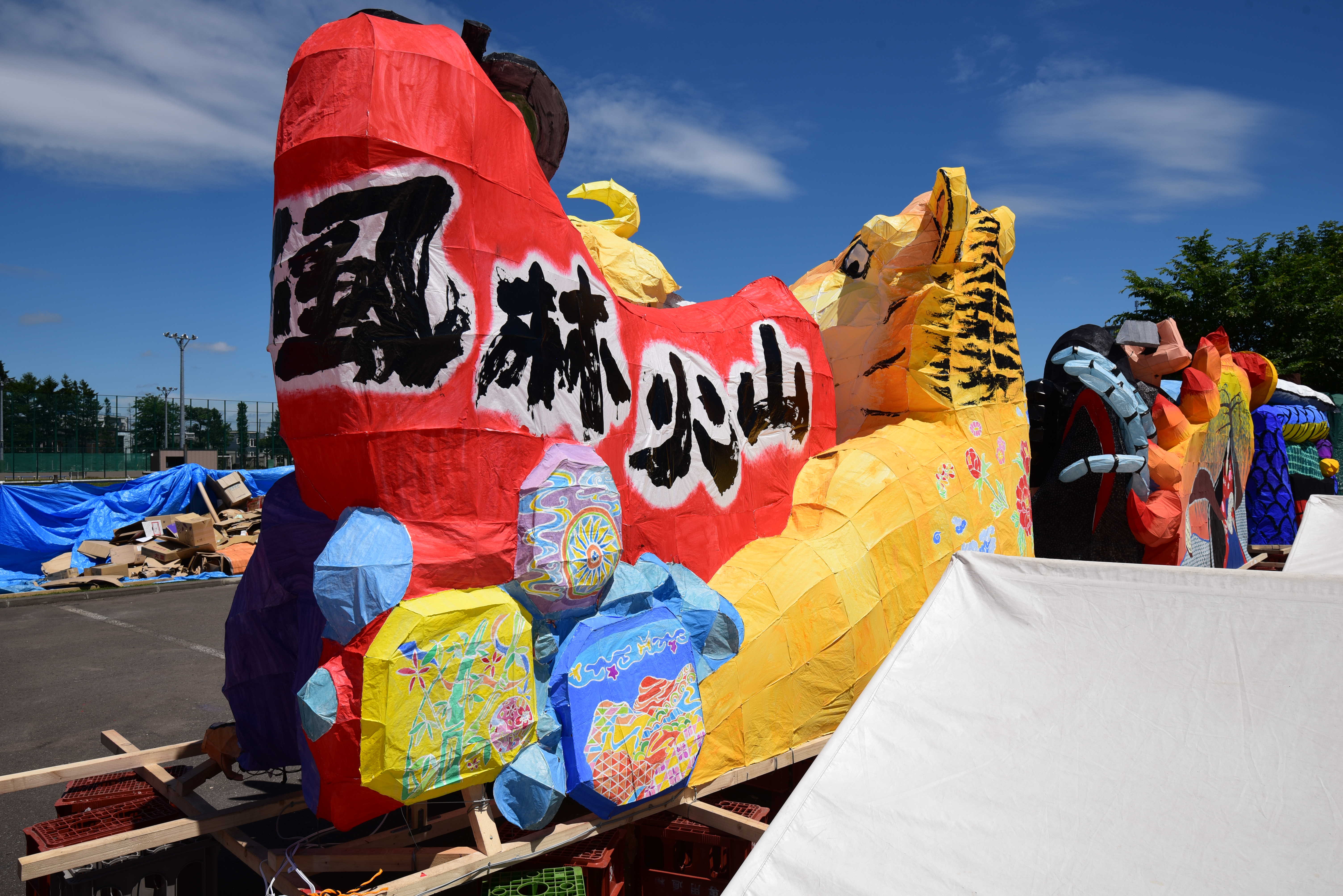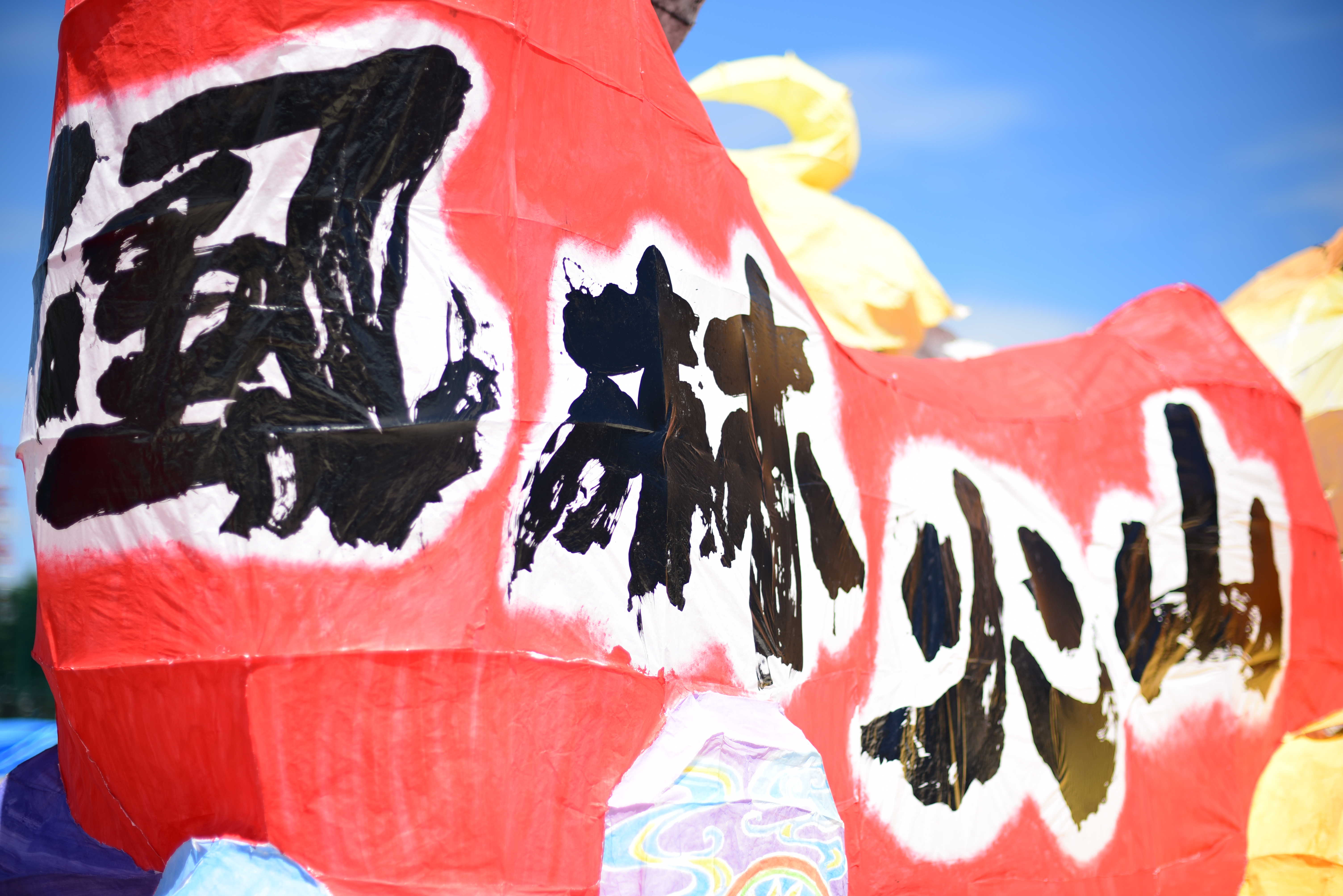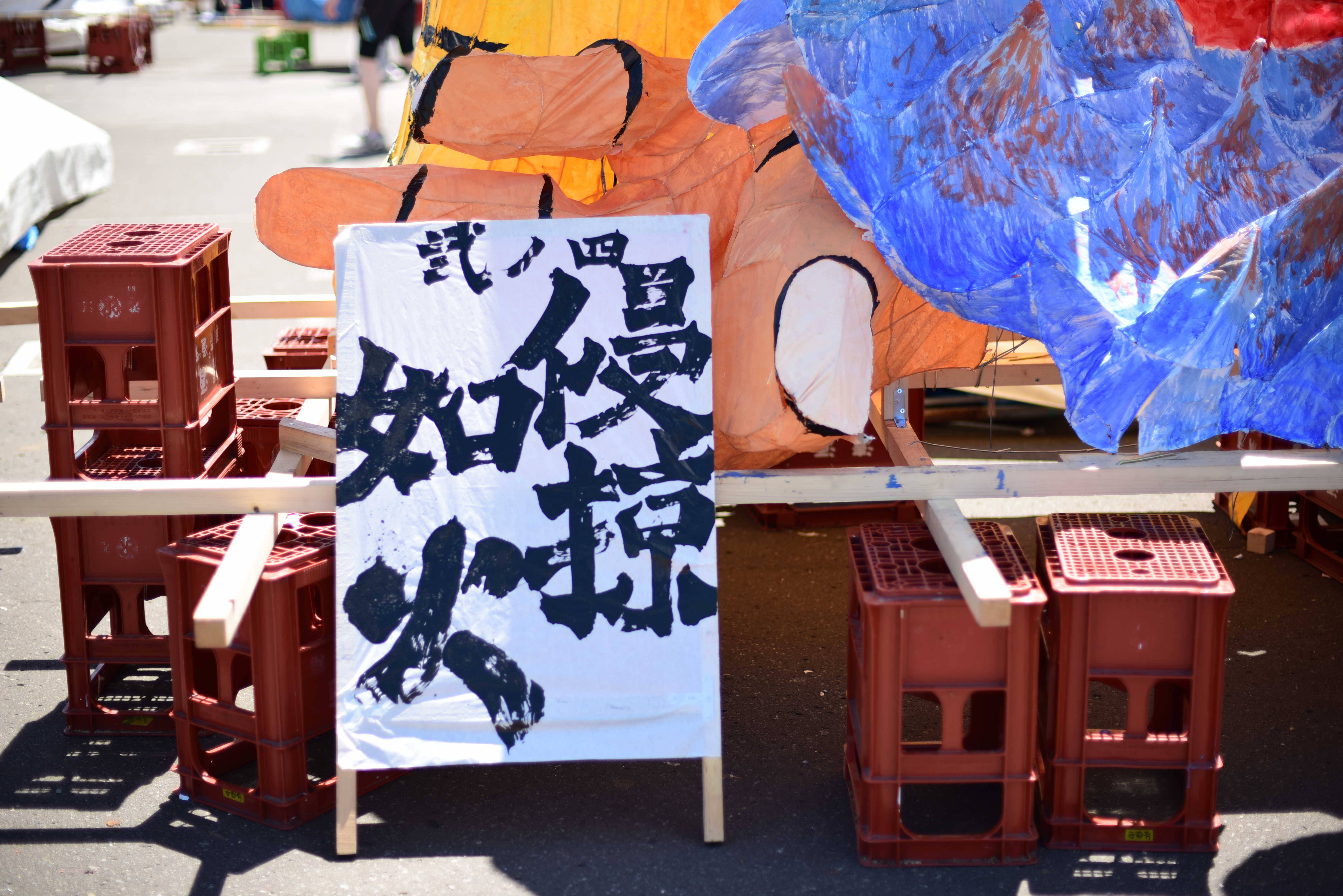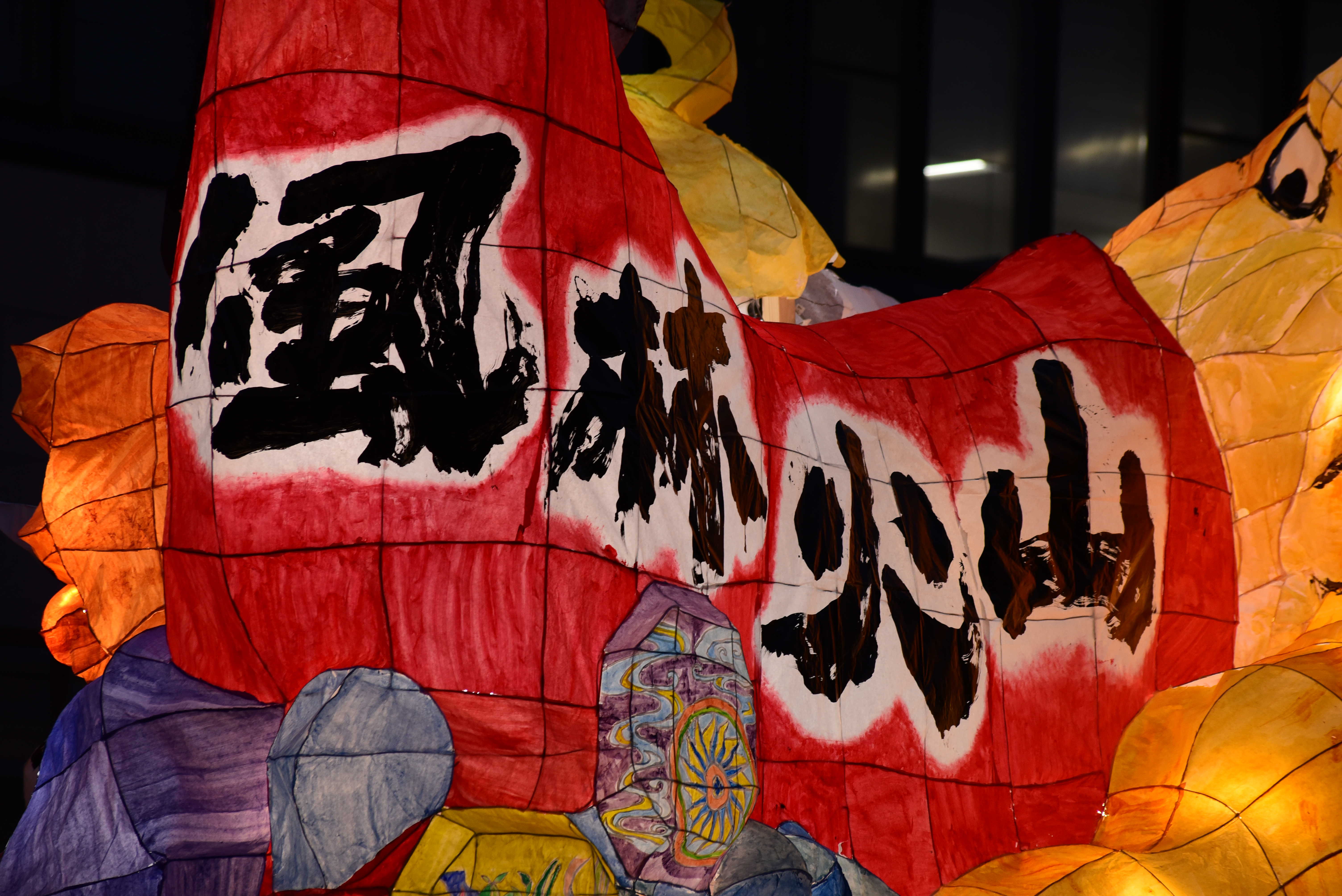 人の顔も安定していてすごくよいと思います。目はロウを入れてみたのでしょうか?意図的だったり違っていたら申し訳ないのですが、おそらく温度が足りず途中で固まり、光ったときに影になってしまっているのかなと思います。たぶんいまの北高では目にロウを入れる難易度はだいぶ高く、ロウの効果よりも失敗したときのリスクのほうが大きいので、避けたほうが無難かもしれません (目の周りの後塗りで滲まないようにロウを入れたい場合は別)。顔すごくよいのでもう一つアドバイスすると、ちょっと表情変わってしまうかもですが、目のラインを鼻に近づけるように下げるともっとよくなると思います。眉間が顔 (頭部含む) の中央に来るような形で。 後ろの「風林火山」という字、めっちゃ好きです。書道部の方が書いたのかな。すごく上手いと思います。白抜きされているところもすごくよかったです。おそらく赤い背景に字を書いてもあまり目立たないので…。 後ろの柄もきれいですね。こういう、パターンではない柄が最近増えていますよね。すごく好きです。 来年もいい行灯を期待しています!