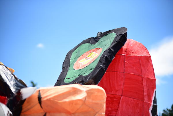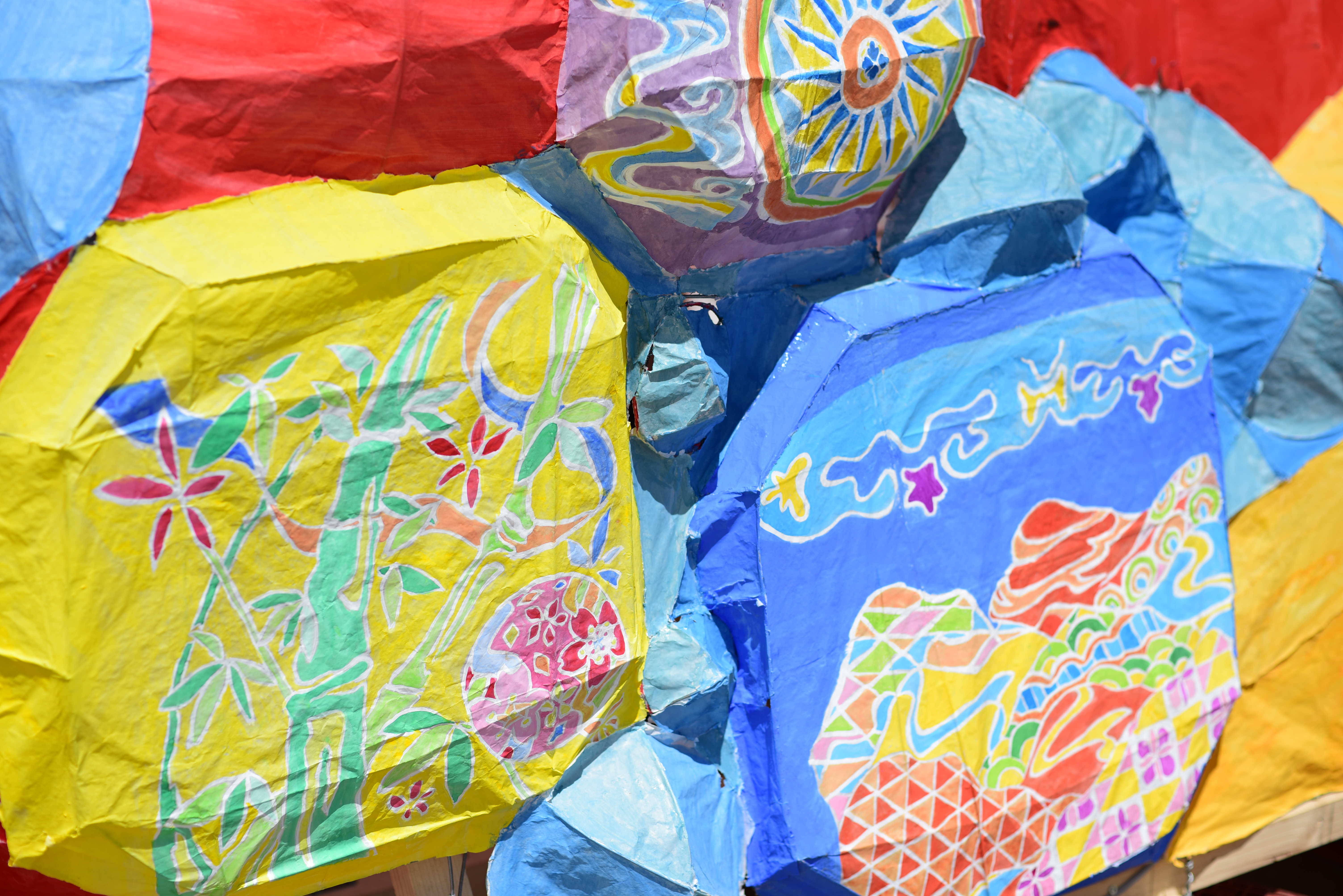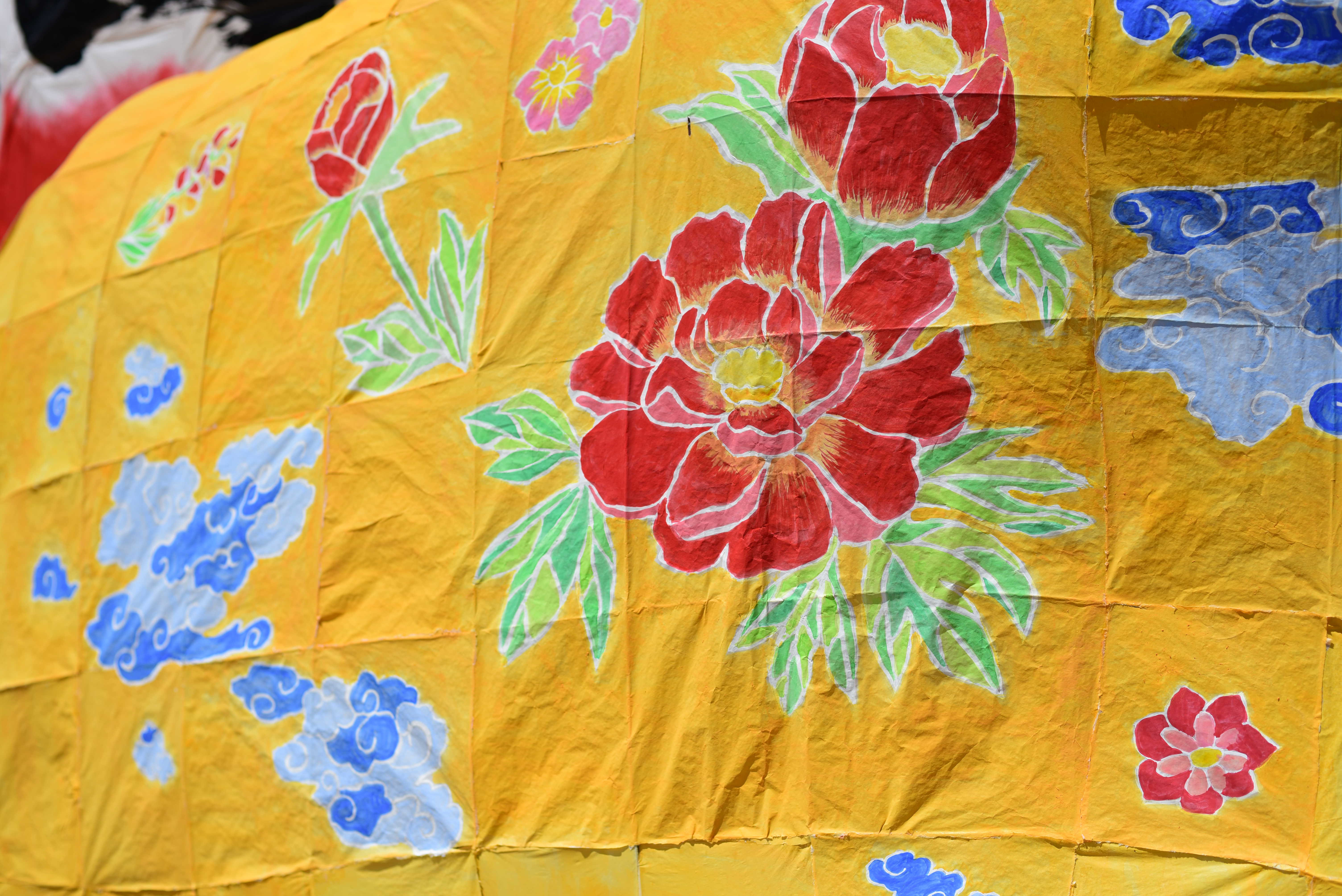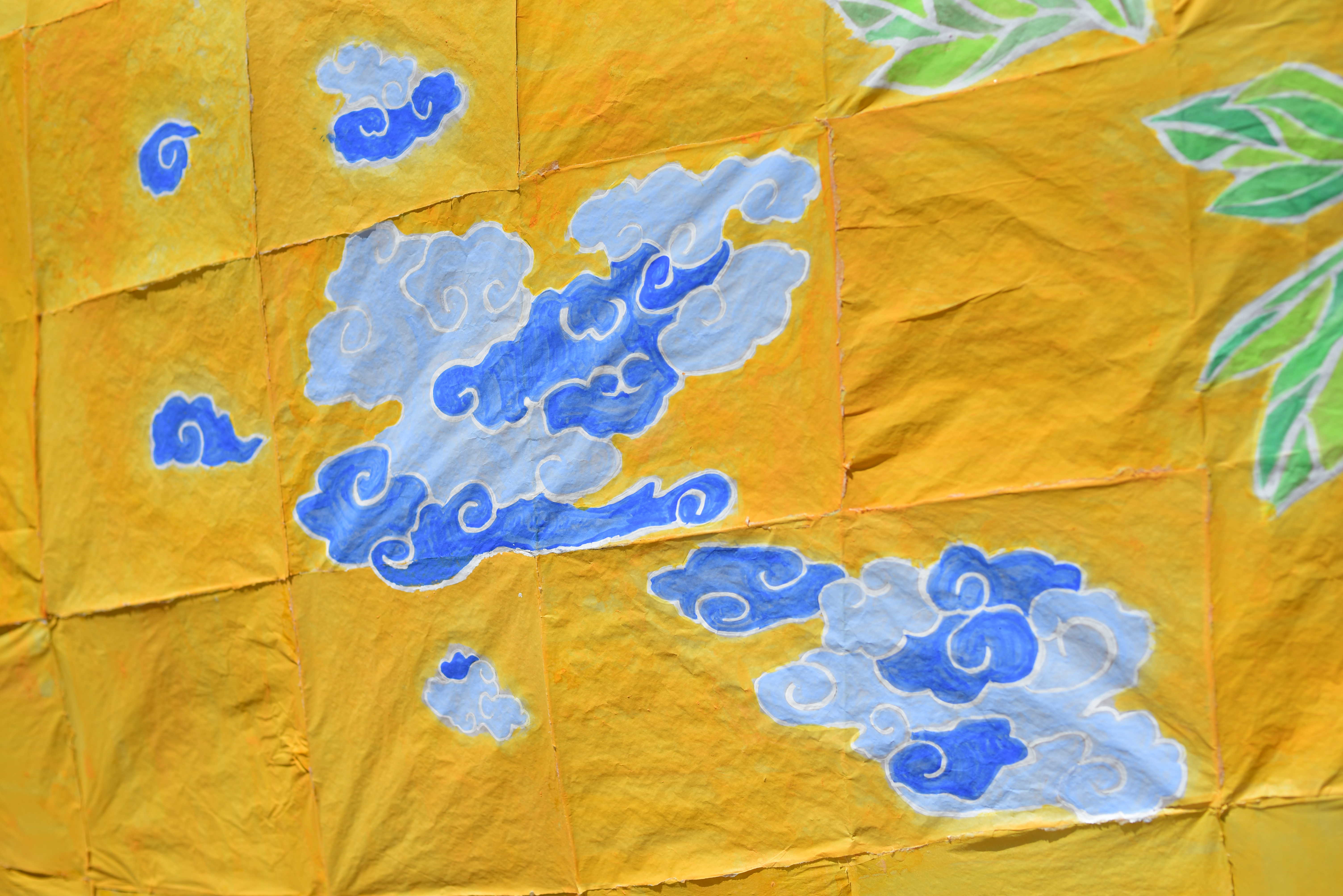 人の顔も安定していてすごくよいと思います。目はロウを入れてみたのでしょうか?意図的だったり違っていたら申し訳ないのですが、おそらく温度が足りず途中で固まり、光ったときに影になってしまっているのかなと思います。たぶんいまの北高では目にロウを入れる難易度はだいぶ高く、ロウの効果よりも失敗したときのリスクのほうが大きいので、避けたほうが無難かもしれません (目の周りの後塗りで滲まないようにロウを入れたい場合は別)。顔すごくよいのでもう一つアドバイスすると、ちょっと表情変わってしまうかもですが、目のラインを鼻に近づけるように下げるともっとよくなると思います。眉間が顔 (頭部含む) の中央に来るような形で。 後ろの「風林火山」という字、めっちゃ好きです。書道部の方が書いたのかな。すごく上手いと思います。白抜きされているところもすごくよかったです。おそらく赤い背景に字を書いてもあまり目立たないので…。 後ろの柄もきれいですね。こういう、パターンではない柄が最近増えていますよね。すごく好きです。 来年もいい行灯を期待しています!