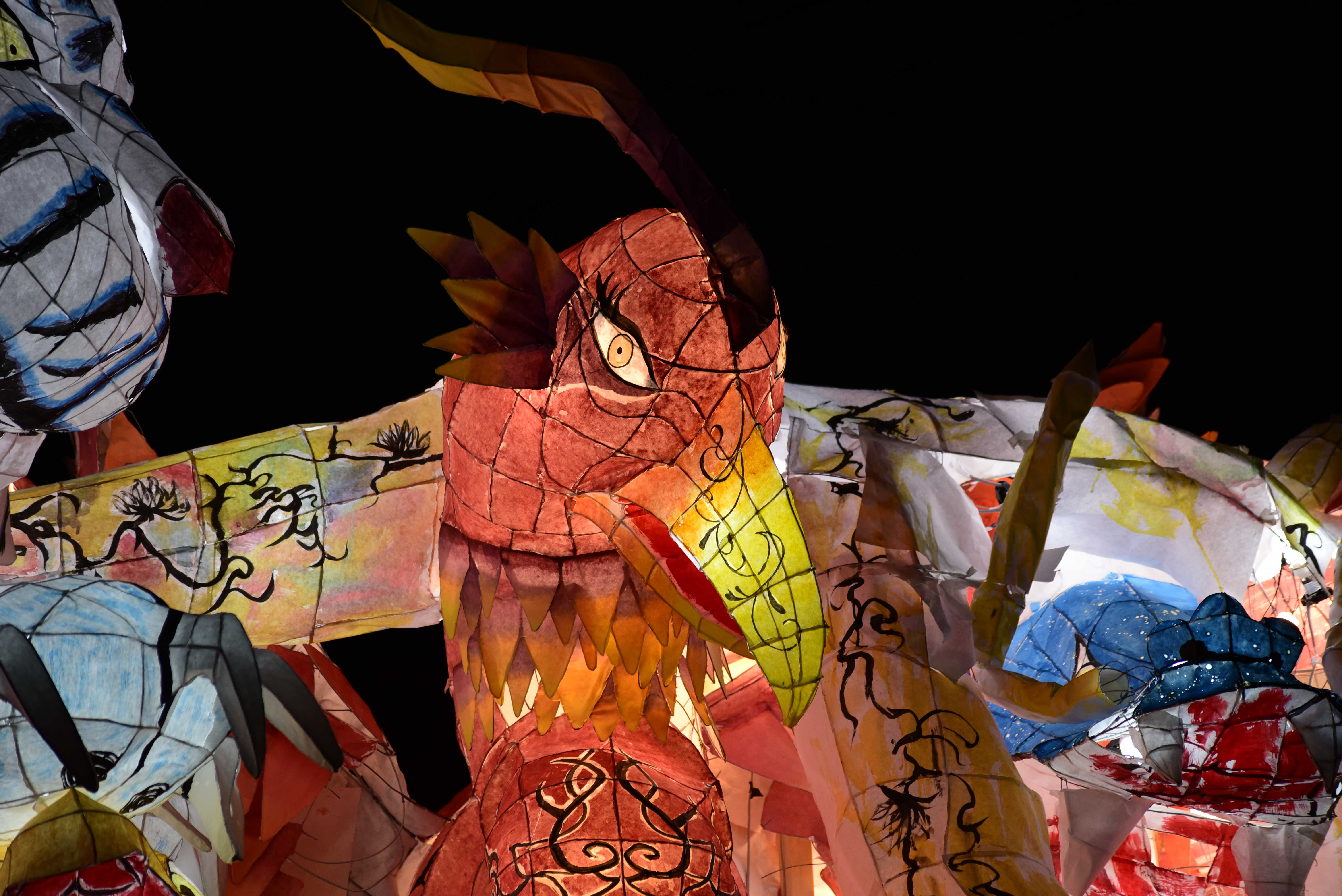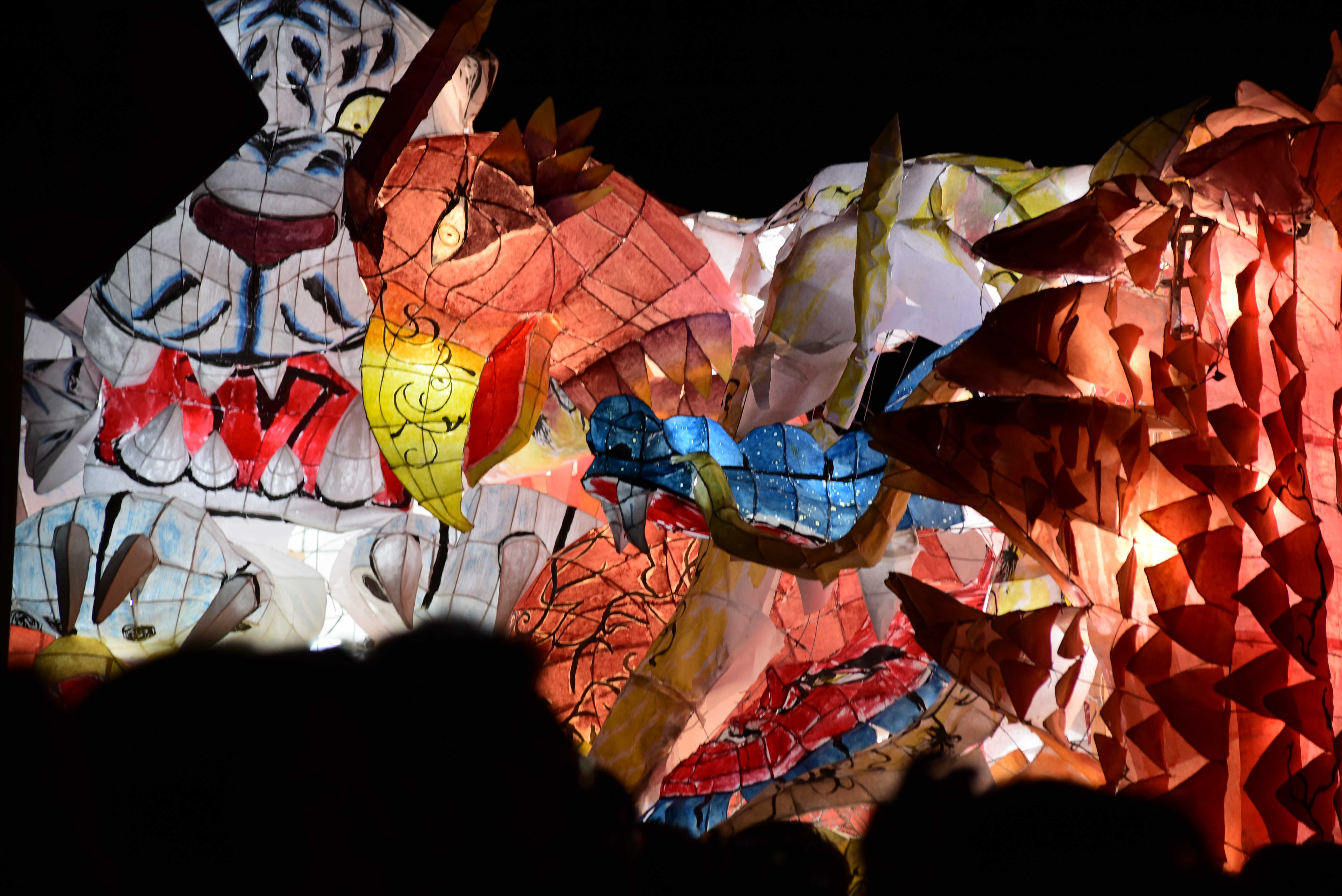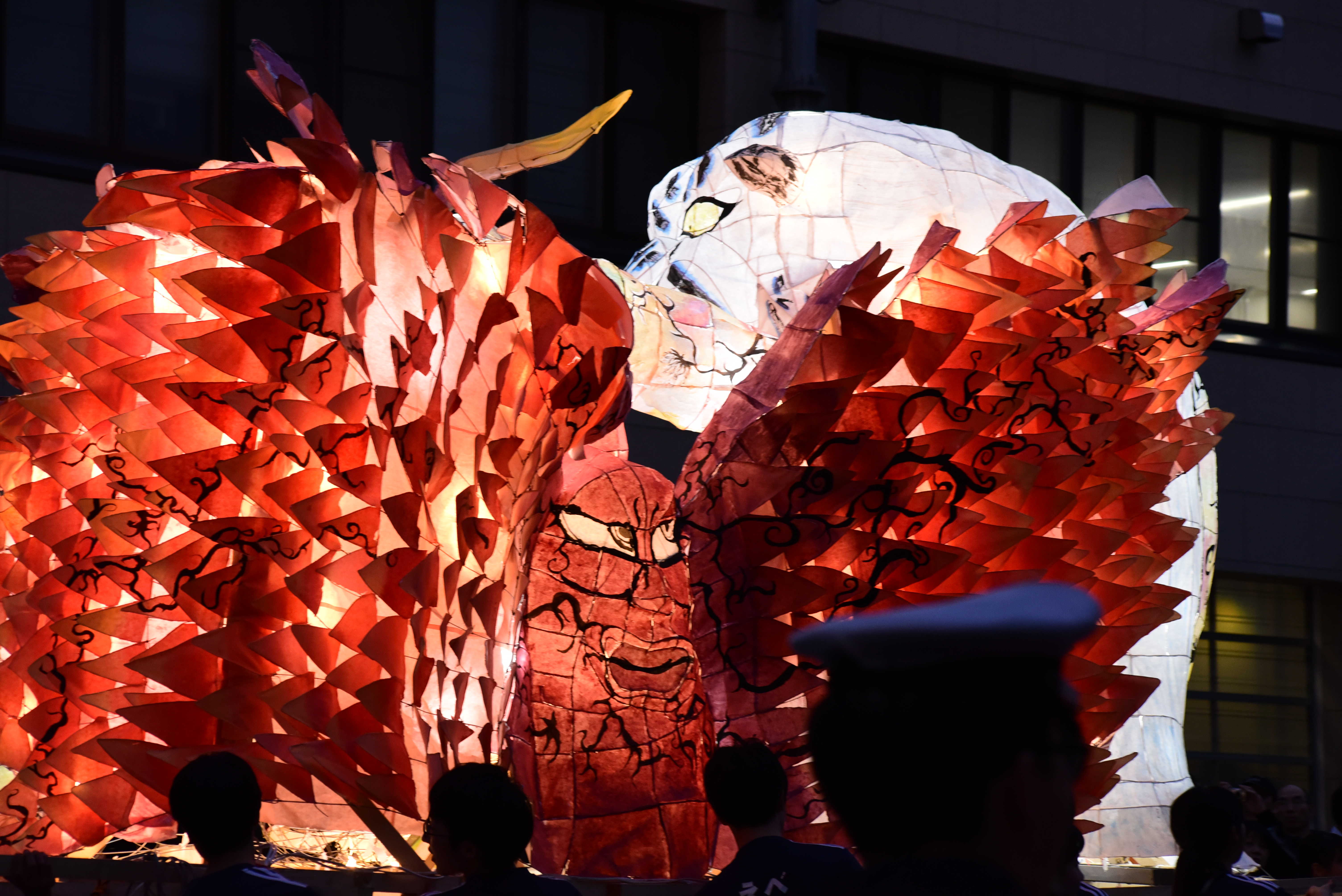 全体的に不思議な柄が施されていたり、各動物に人の顔が書かれていたりなど、行灯の背景を知らないとわからないような点がたくさんあったので、どのような意図があるのか気になりました。 あとは、後ろから見た時の朱雀の羽にこだわりを感じました。