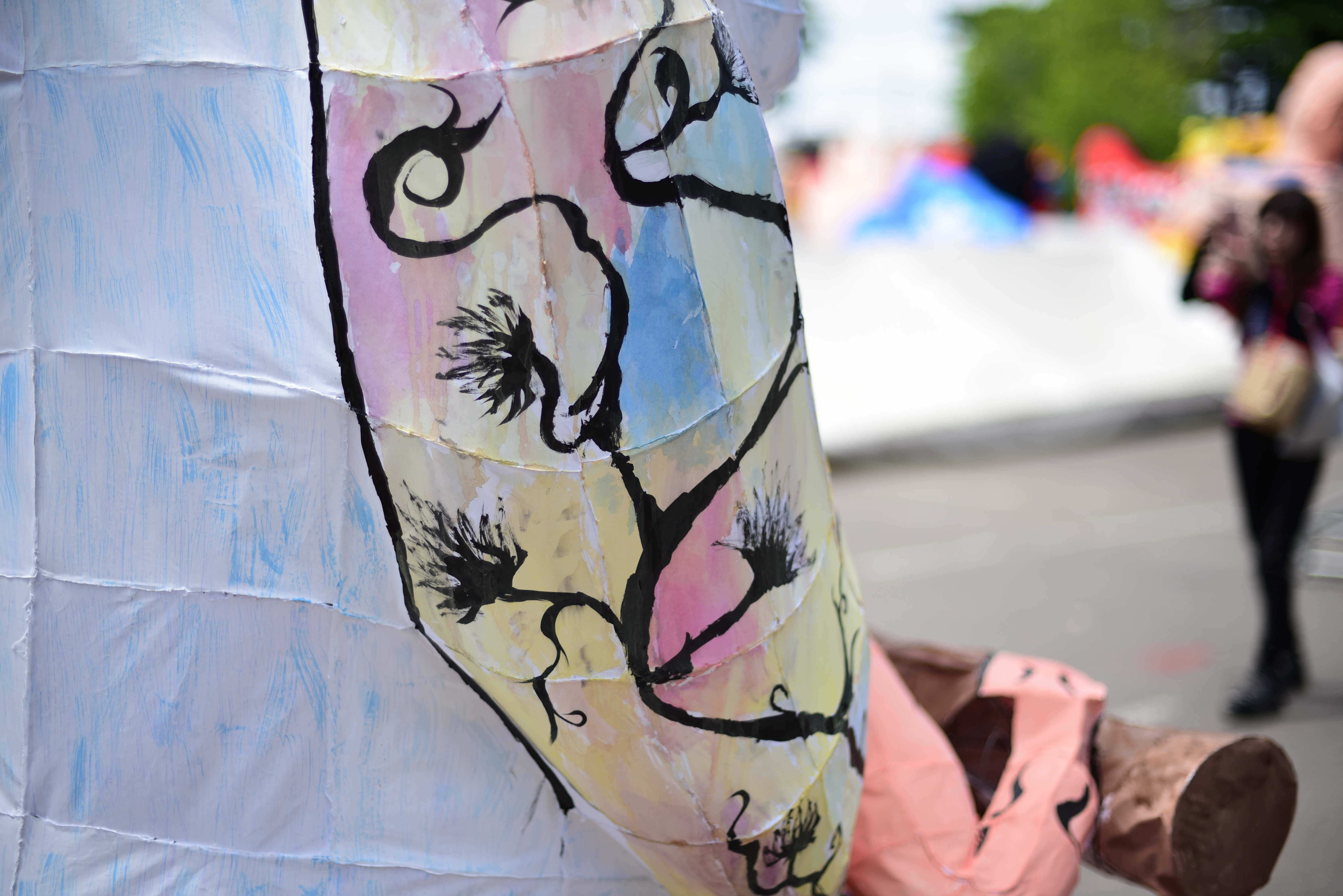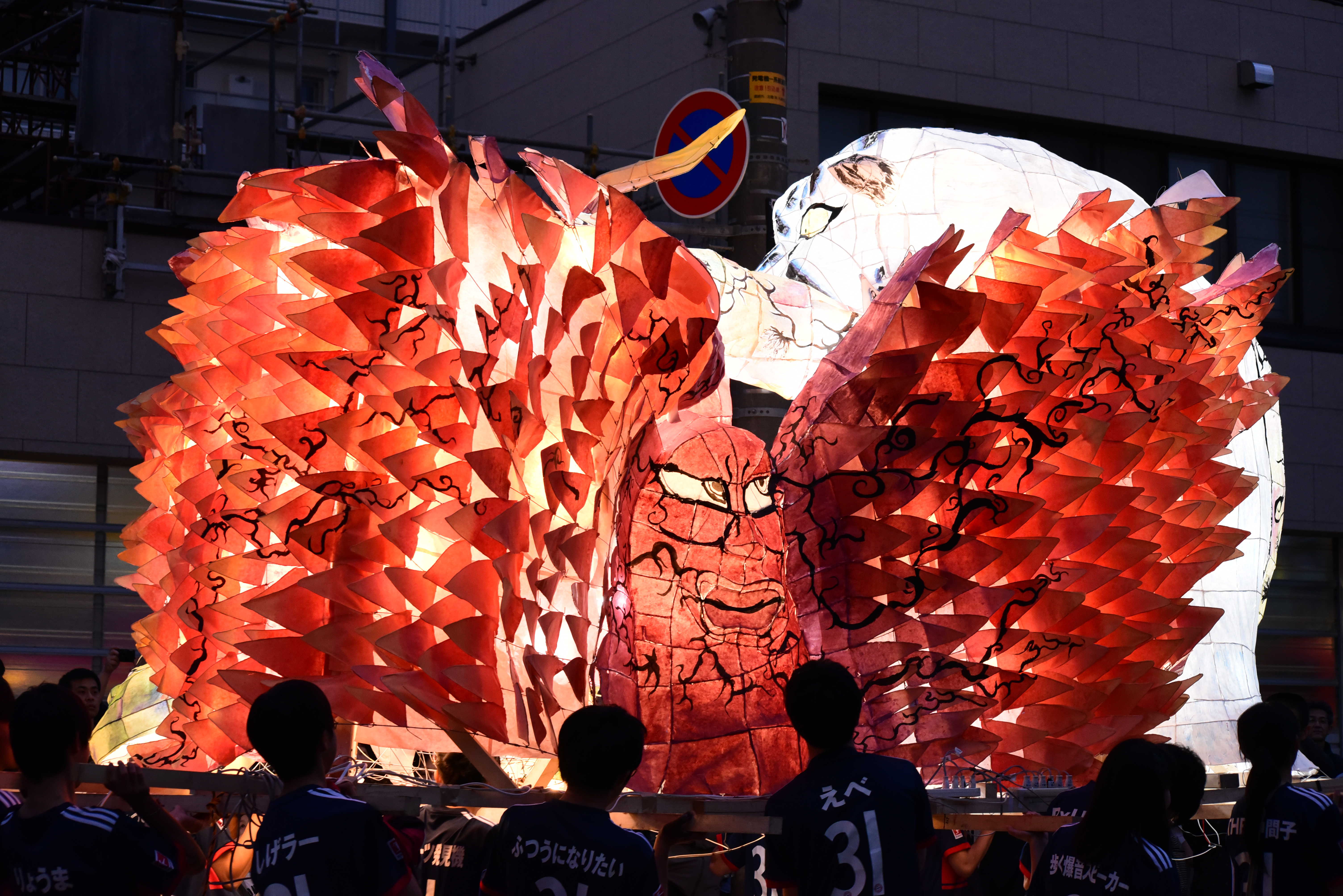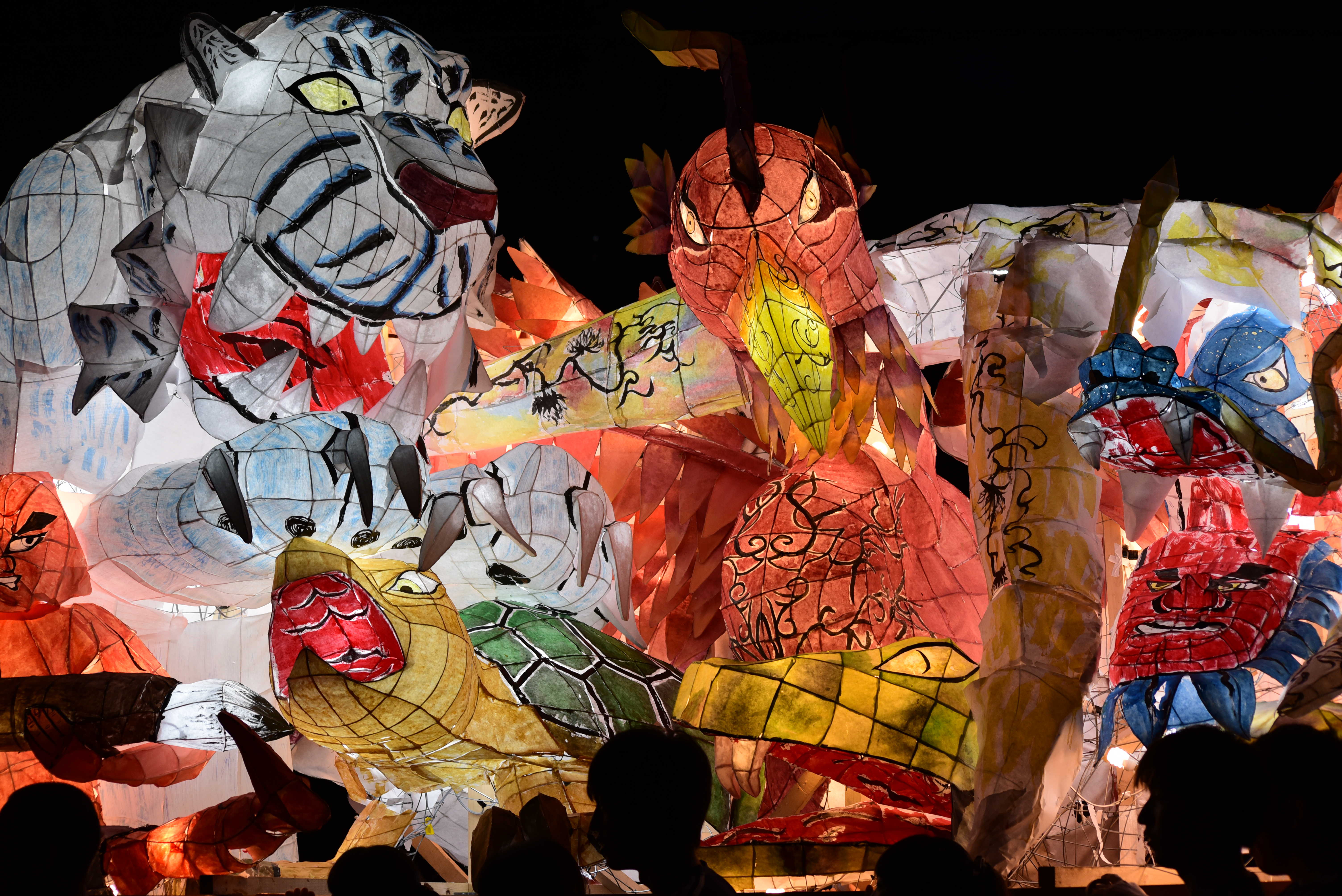 全体的に不思議な柄が施されていたり、各動物に人の顔が書かれていたりなど、行灯の背景を知らないとわからないような点がたくさんあったので、どのような意図があるのか気になりました。 あとは、後ろから見た時の朱雀の羽にこだわりを感じました。