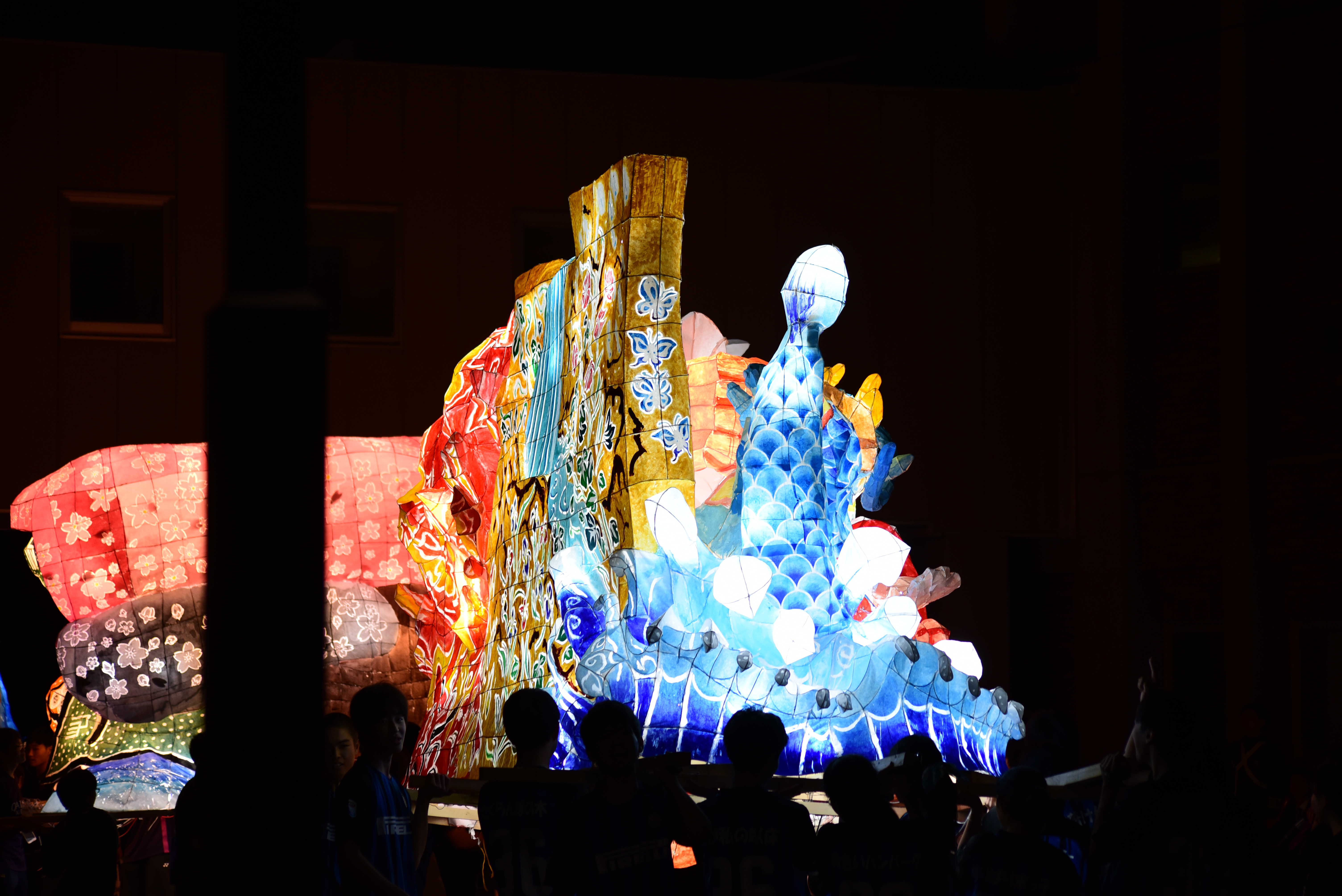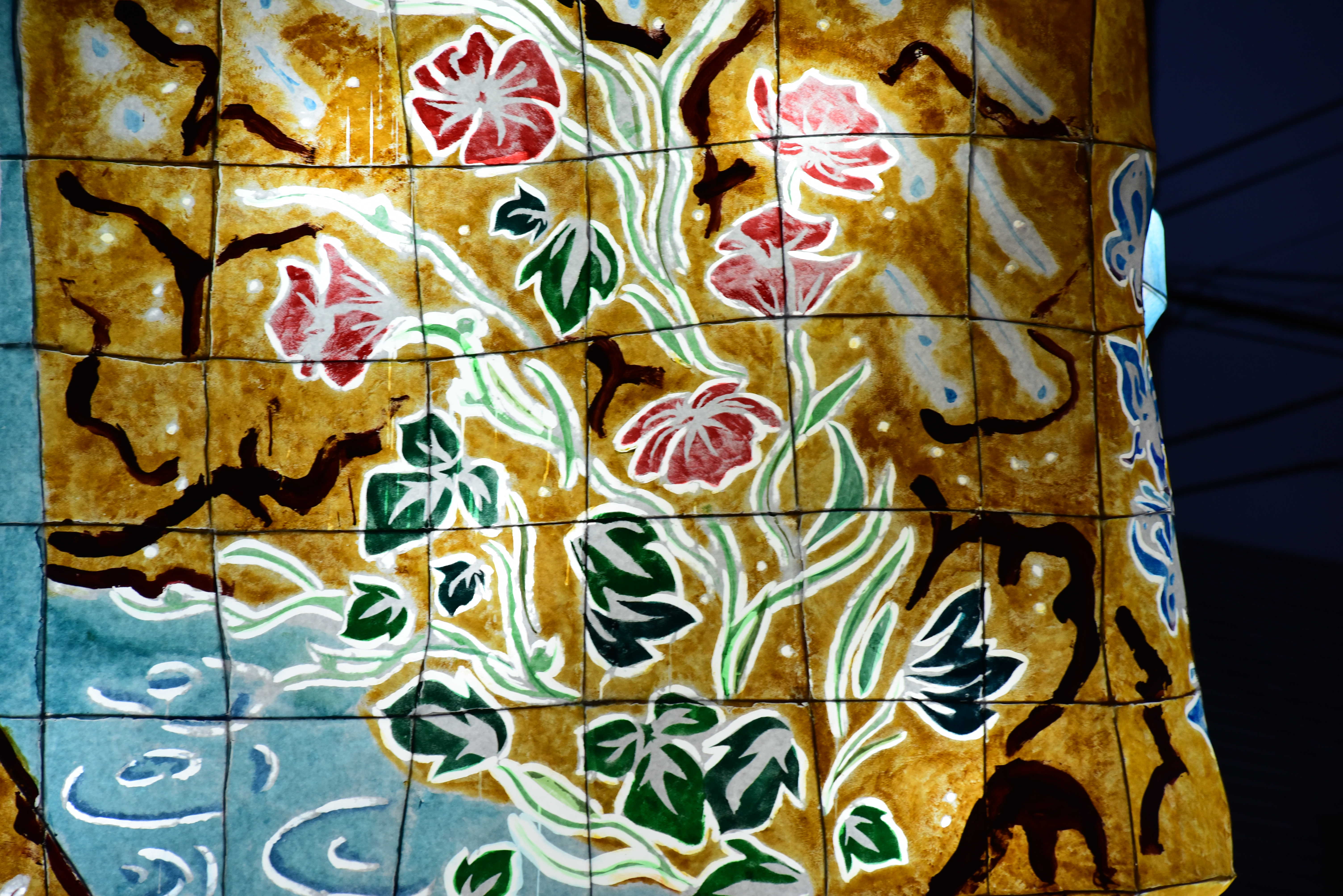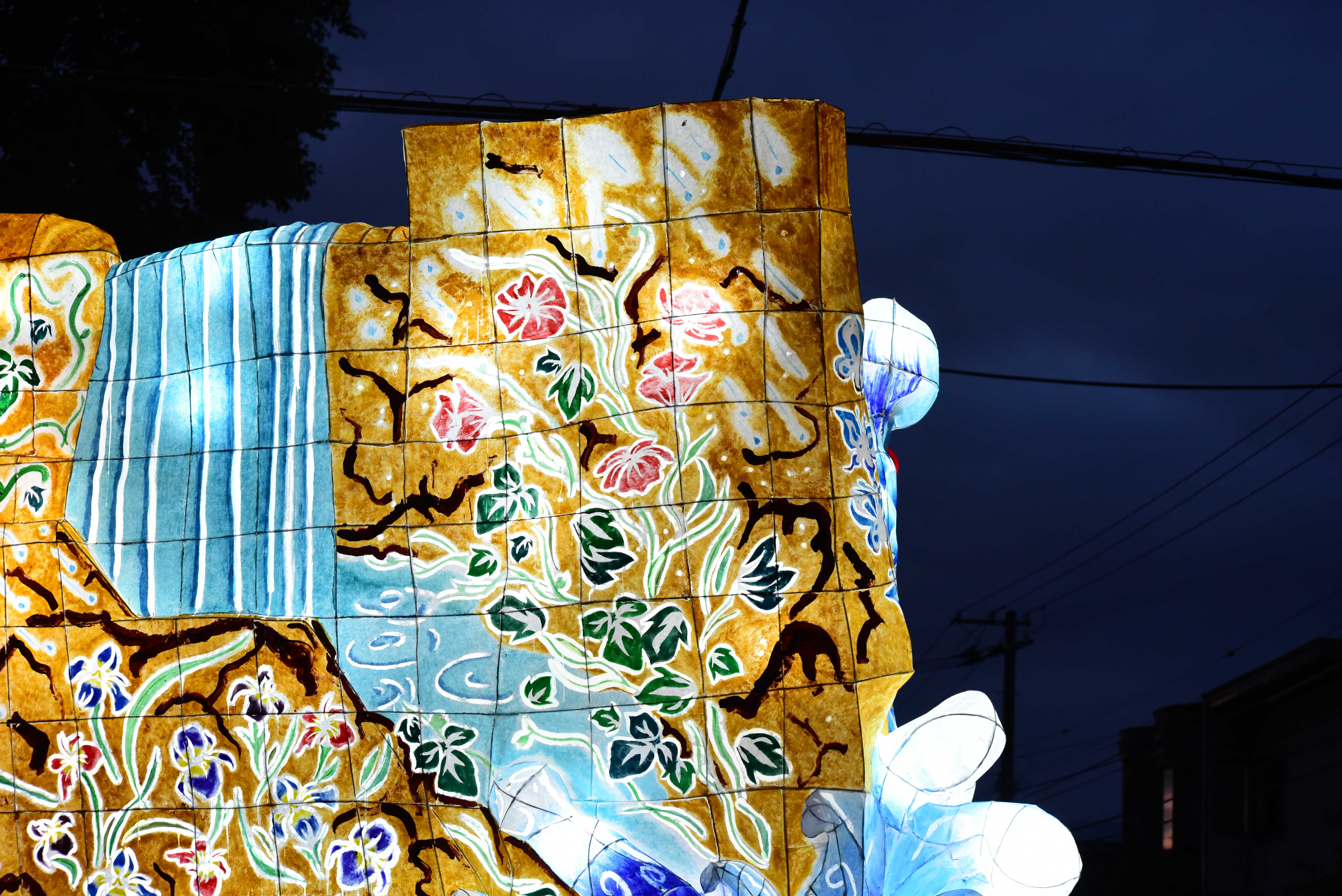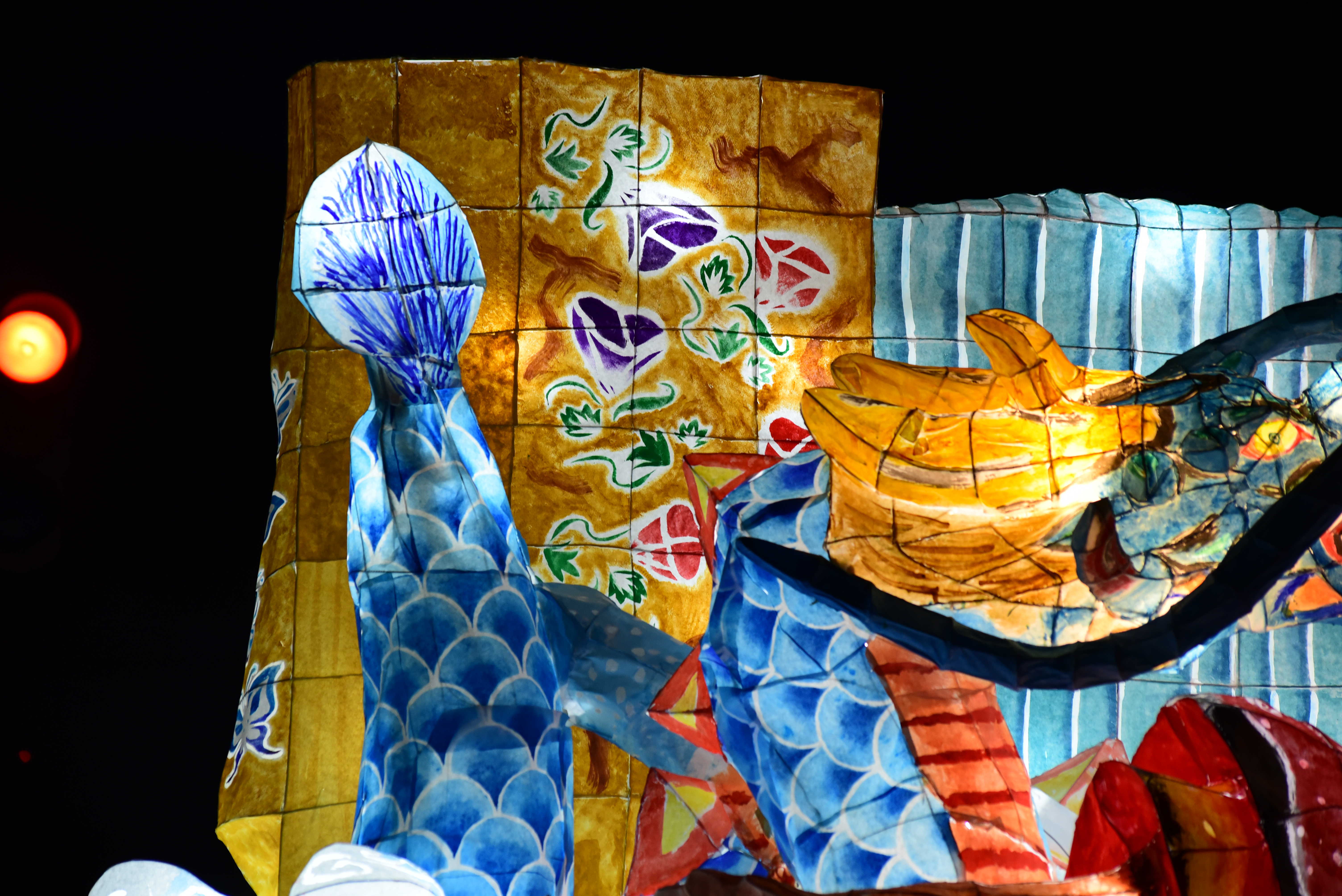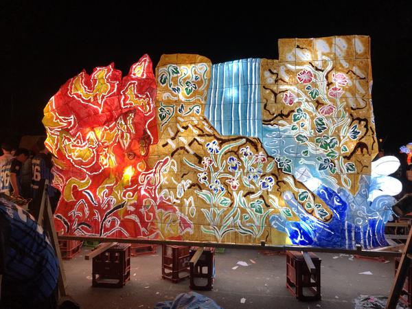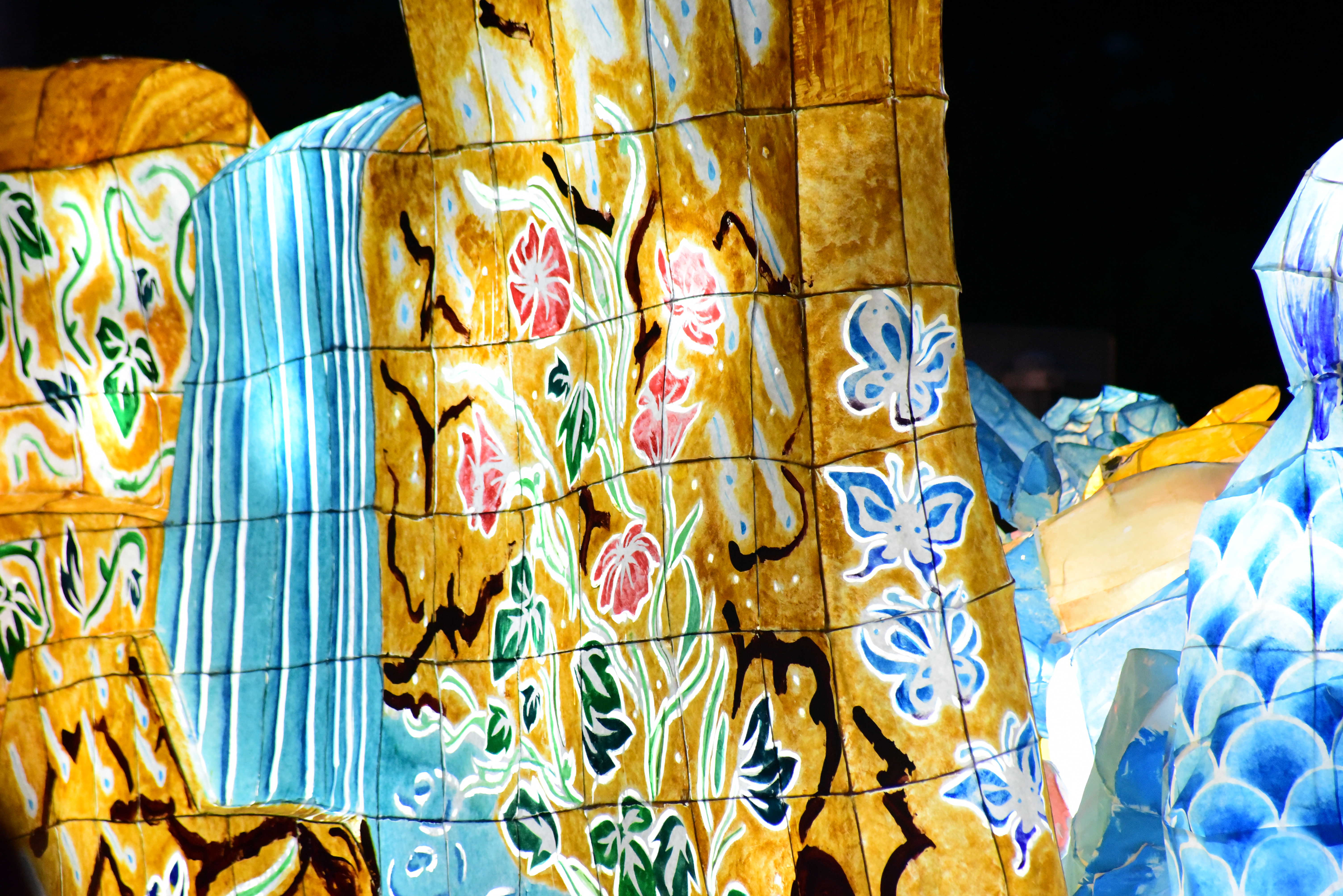 - 全体的にたくさんの色が使われているため、鮮やかで、力強さの中にも綺麗さがある行灯という印象を受けました。