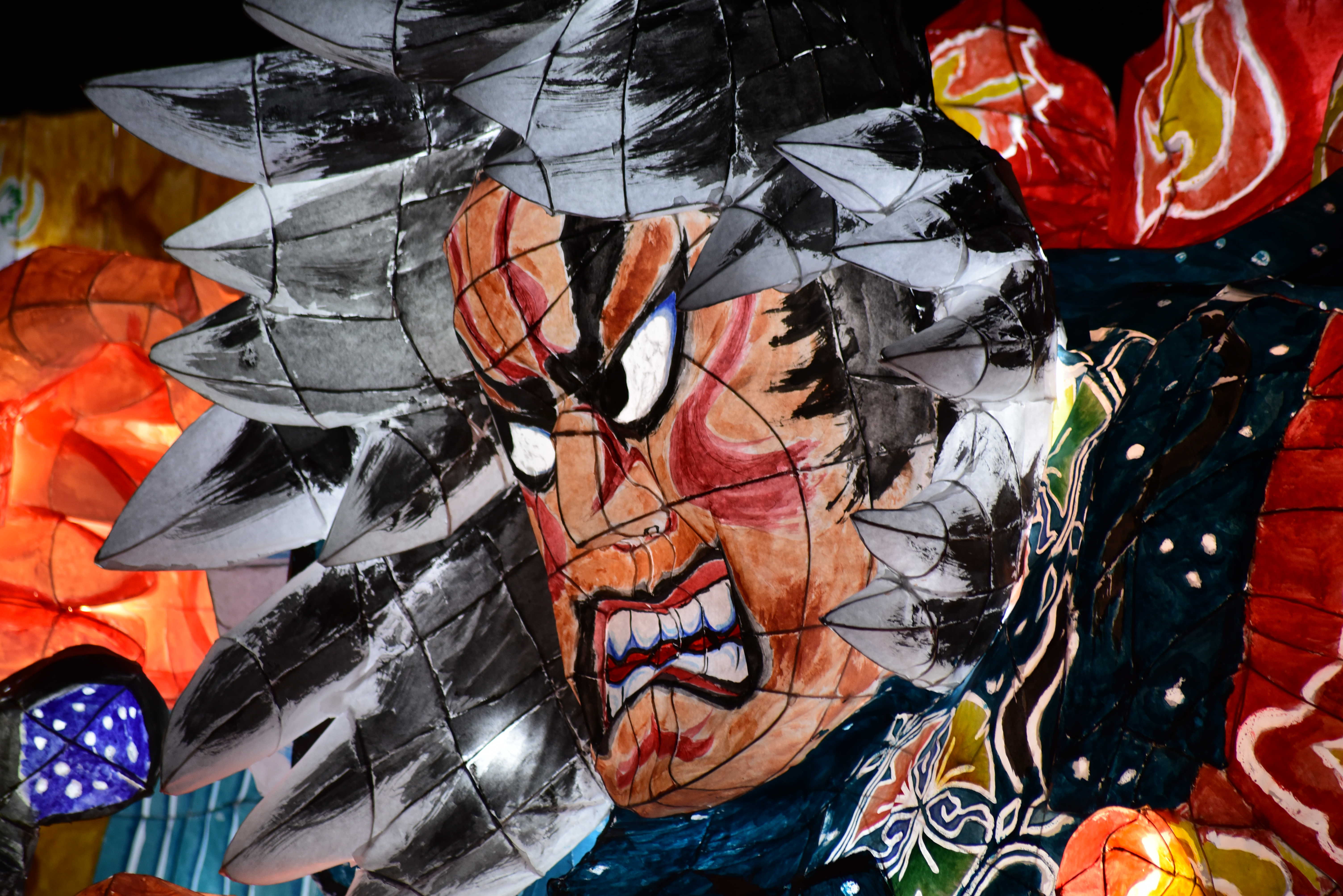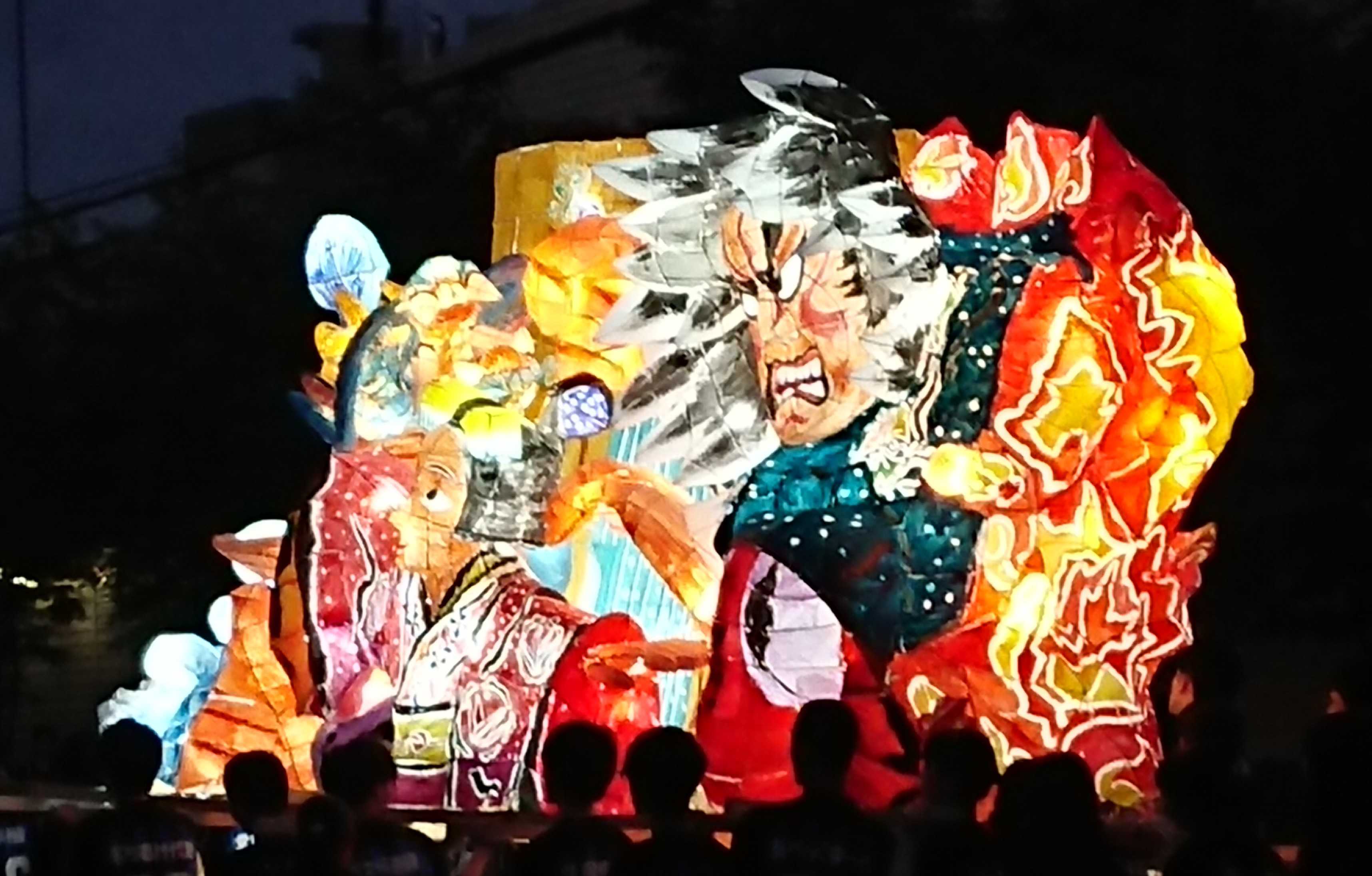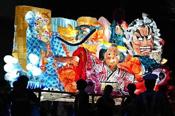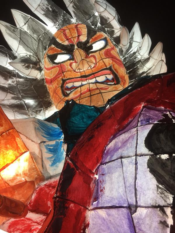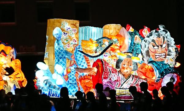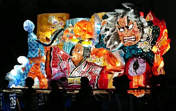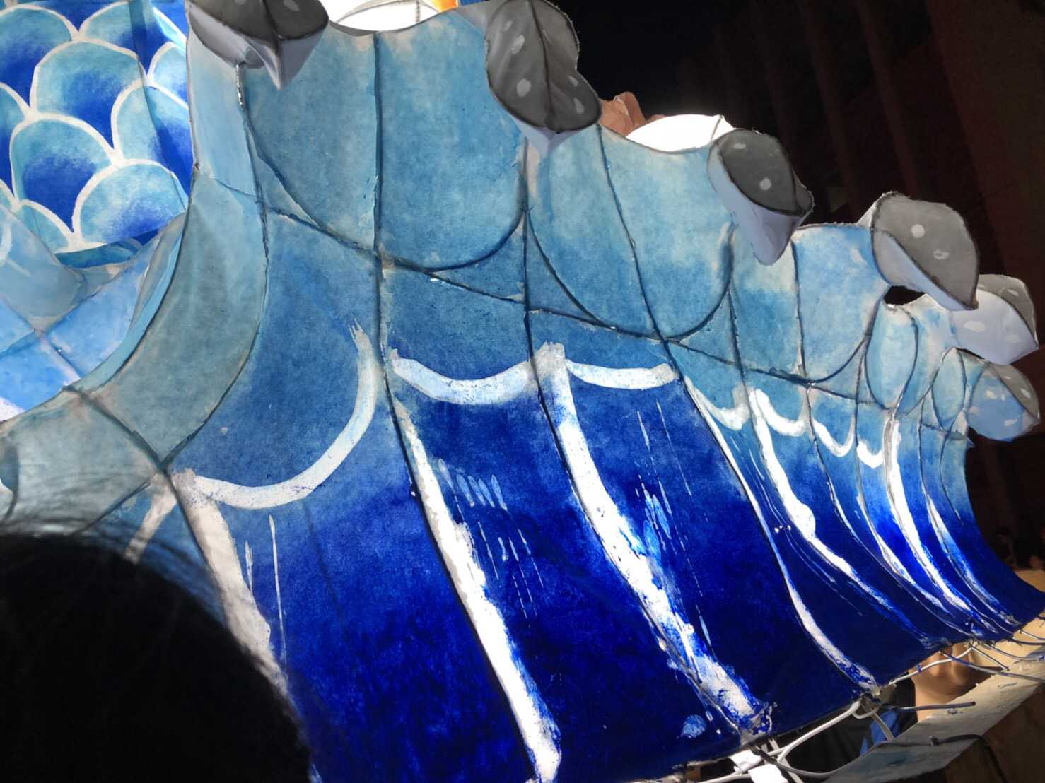 まずは顔!とても迫力があります!睨みつける表情が素晴らしいです。赤い隈取も上手くいっていると思います。髪の流れもとても上手いです。顔は大きさも位置も角度も今年一番よかったかなと思います。 男の肩にあるイチョウの柄、ちょっと目立たない位置にあるのですが、めちゃくちゃキレイで感動してしまいました。ぼかしがとても上手いですね!他の柄もとても上手いのですが、この柄は別格で上手いと思います。 後ろ側の岩が段々になっているところ、地味ですがこういうの好きです。狭い奥行きの中でも妥協しない姿勢が見て取れました。 そして左下の波が素晴らしい!行灯行列のときは担いでいる人の頭ですこし隠れてしまっていますが、一般公開日に見つけたときは「おおっ」と思ってしまいました。水しぶきの躍動感がよく表現された針金・色塗りになっていると思います。素晴らしい。けっこう入り組んでいるので紙貼りも大変だったのではないでしょうか? 色ですが、肌色の色ムラが気になってしまいました。この行灯の構図だと、肌色以外は最悪ムラがあっても問題ないとは思うのですが、肌色もムラがあると、人以外の物体との差があまりわかりづらくなってしまいます。もうちょっと色を薄くしたら塗りやすくかつ他と差別化できてよかったかもしれません。龍の頭部もそうですね。正面から見たときに龍の角と後ろの岩、龍の頭と後ろの滝にそれぞれ色が被ってしまっていてあまり龍が目立っていなかったのがもったいなかった。 大賞と銀賞もそうですが、この行灯はとてもロウを上手く使っているので、最近はロウを上手く使えるかどうかで受賞できるかが変わってくる気がします。 点数も評判も僅差だったので大賞が取れなくて悔しかったかもしれませんが、素晴らしい行灯だったと思います。金賞、おめでとうございます!