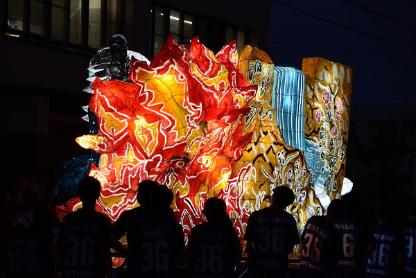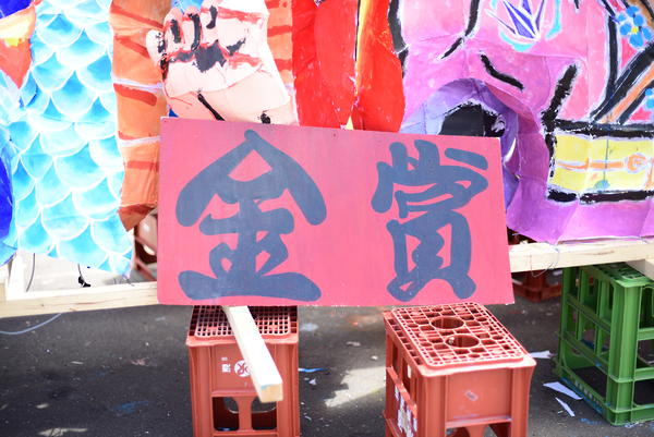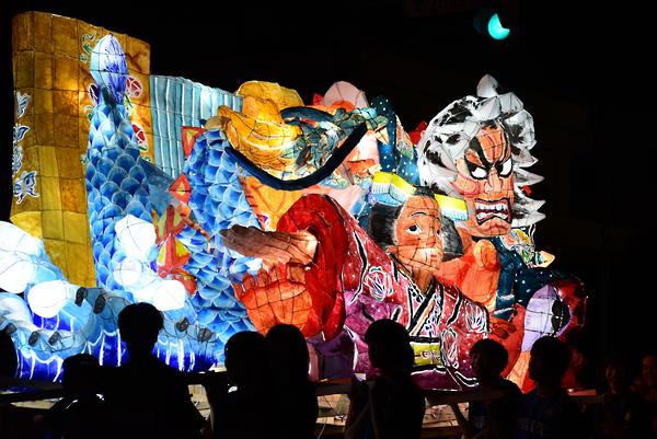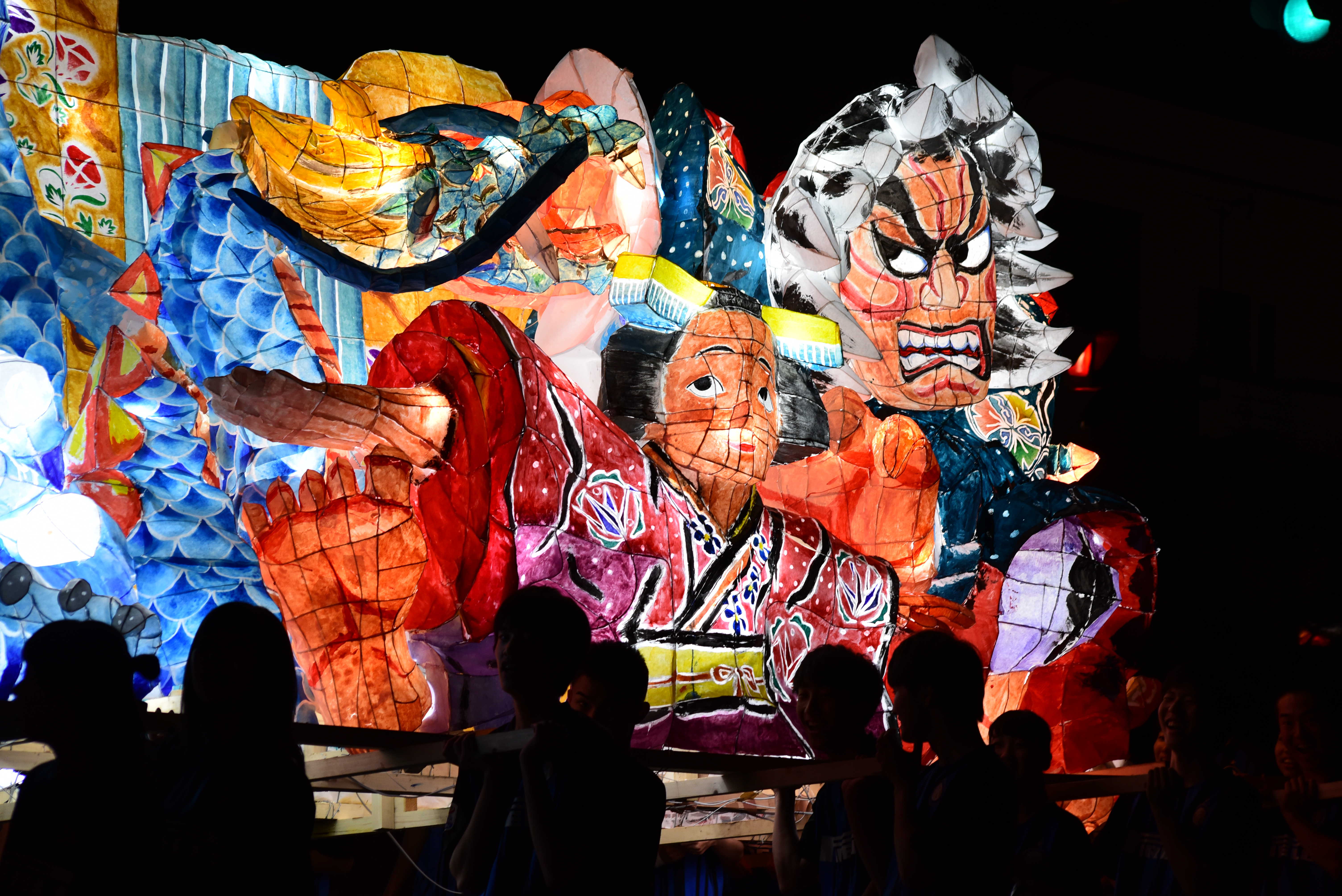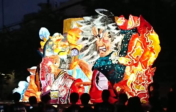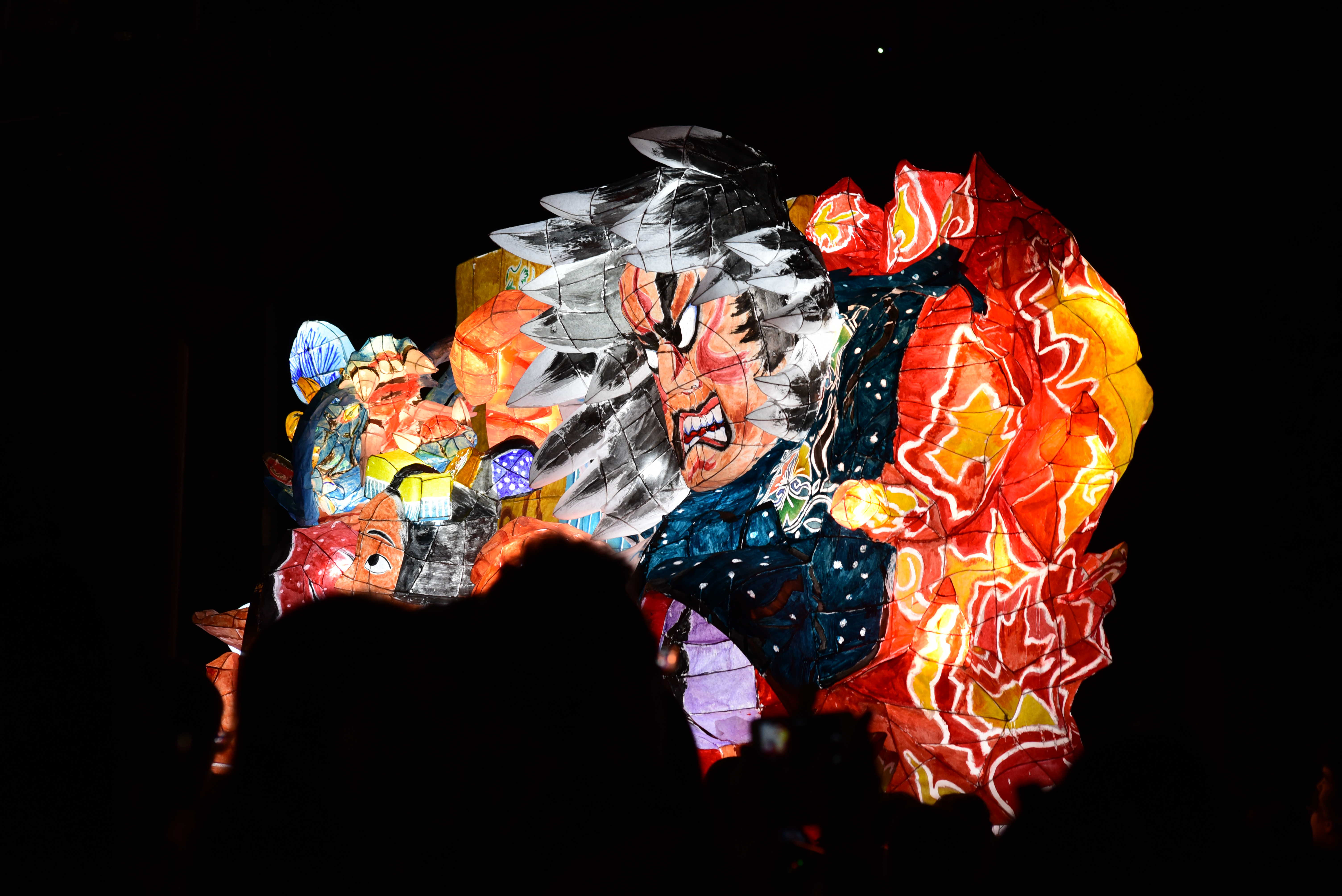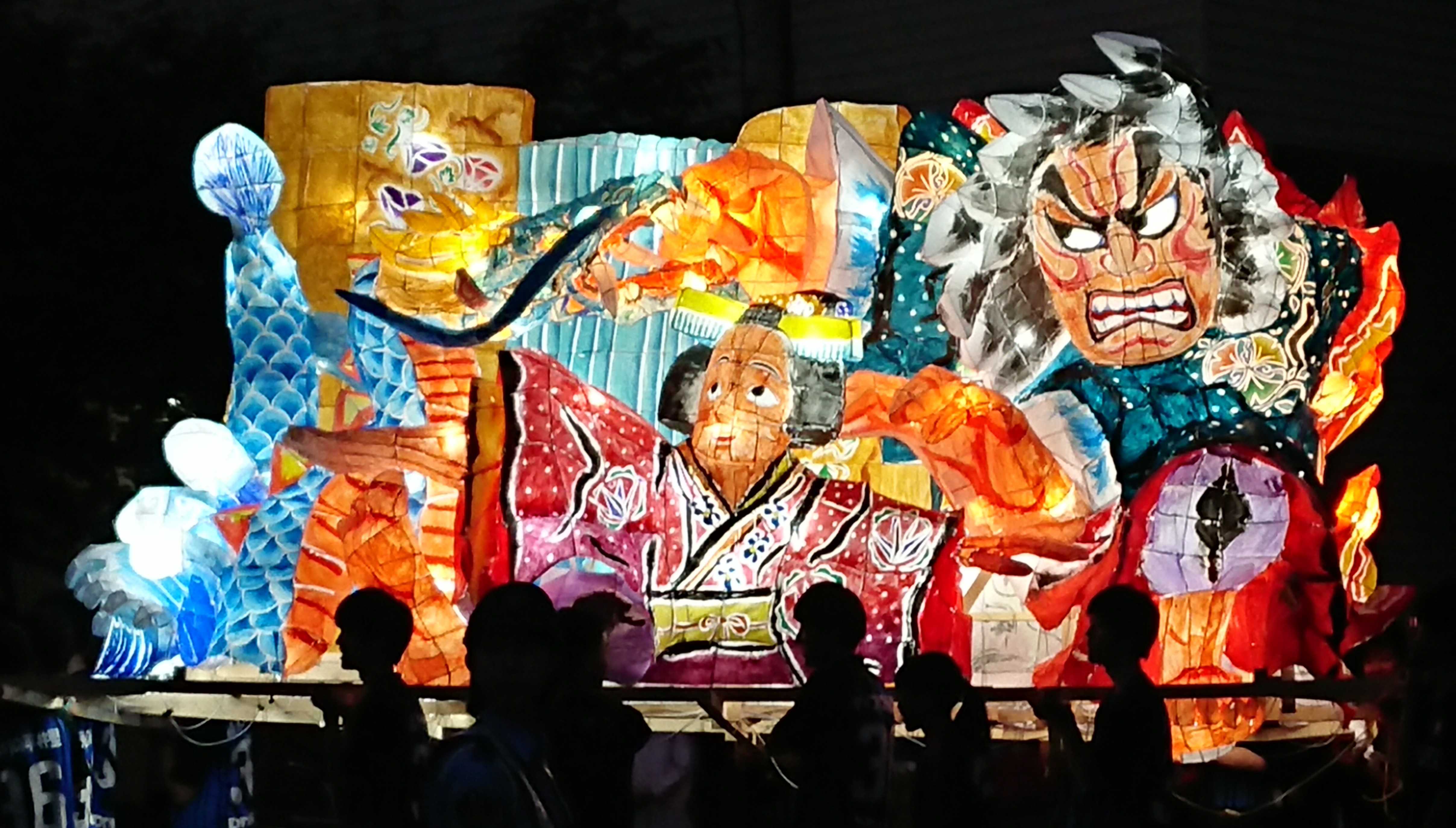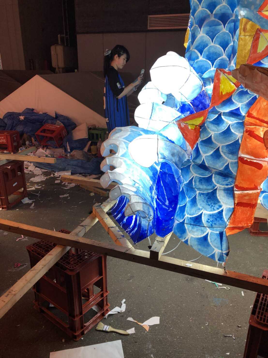 まずは顔!とても迫力があります!睨みつける表情が素晴らしいです。赤い隈取も上手くいっていると思います。髪の流れもとても上手いです。顔は大きさも位置も角度も今年一番よかったかなと思います。 男の肩にあるイチョウの柄、ちょっと目立たない位置にあるのですが、めちゃくちゃキレイで感動してしまいました。ぼかしがとても上手いですね!他の柄もとても上手いのですが、この柄は別格で上手いと思います。 後ろ側の岩が段々になっているところ、地味ですがこういうの好きです。狭い奥行きの中でも妥協しない姿勢が見て取れました。 そして左下の波が素晴らしい!行灯行列のときは担いでいる人の頭ですこし隠れてしまっていますが、一般公開日に見つけたときは「おおっ」と思ってしまいました。水しぶきの躍動感がよく表現された針金・色塗りになっていると思います。素晴らしい。けっこう入り組んでいるので紙貼りも大変だったのではないでしょうか? 色ですが、肌色の色ムラが気になってしまいました。この行灯の構図だと、肌色以外は最悪ムラがあっても問題ないとは思うのですが、肌色もムラがあると、人以外の物体との差があまりわかりづらくなってしまいます。もうちょっと色を薄くしたら塗りやすくかつ他と差別化できてよかったかもしれません。龍の頭部もそうですね。正面から見たときに龍の角と後ろの岩、龍の頭と後ろの滝にそれぞれ色が被ってしまっていてあまり龍が目立っていなかったのがもったいなかった。 大賞と銀賞もそうですが、この行灯はとてもロウを上手く使っているので、最近はロウを上手く使えるかどうかで受賞できるかが変わってくる気がします。 点数も評判も僅差だったので大賞が取れなくて悔しかったかもしれませんが、素晴らしい行灯だったと思います。金賞、おめでとうございます!