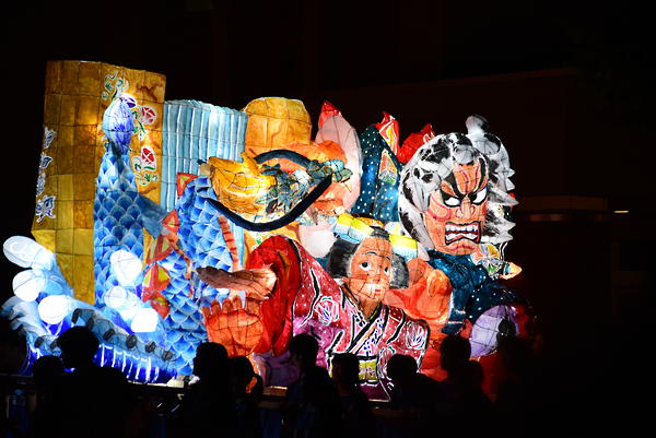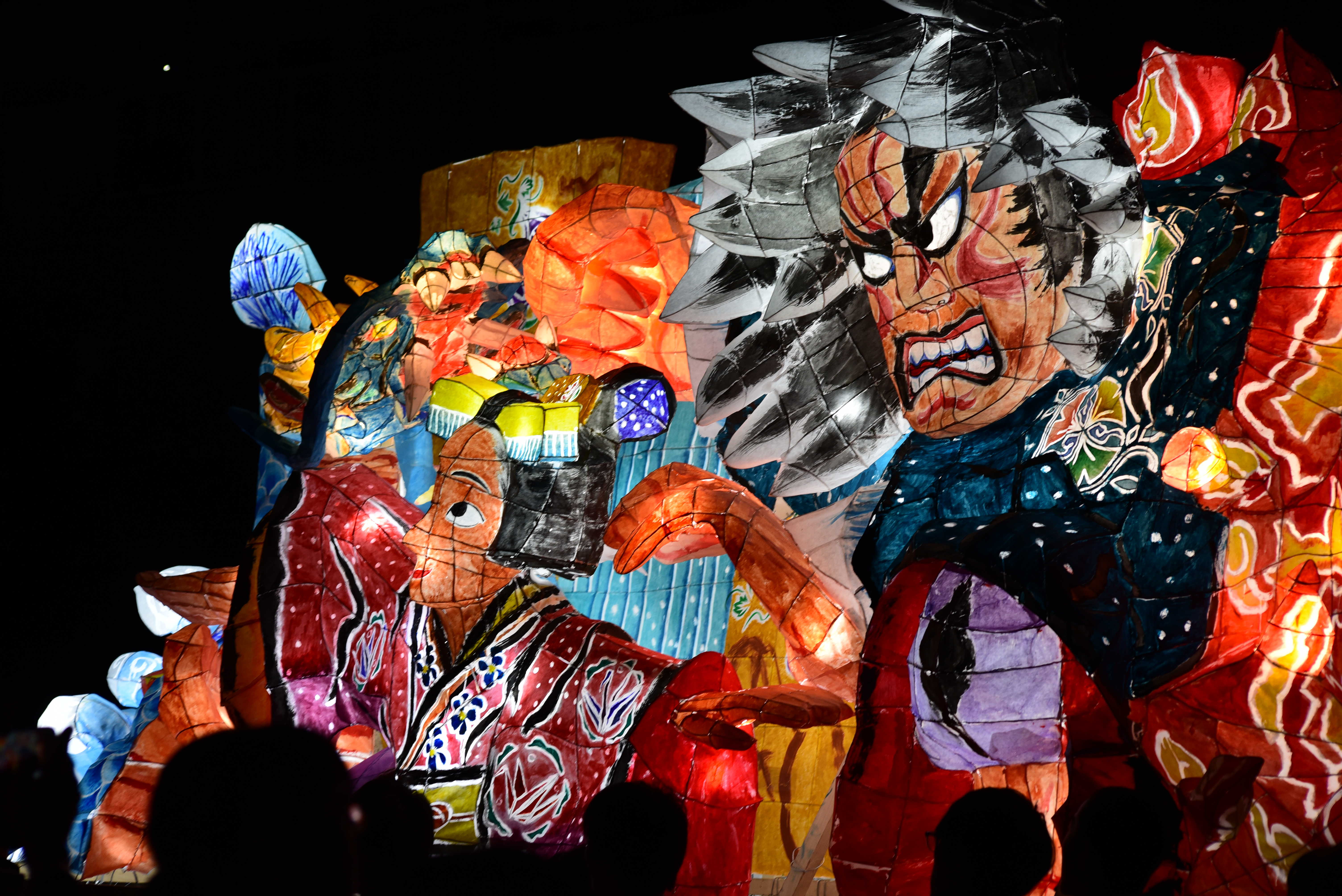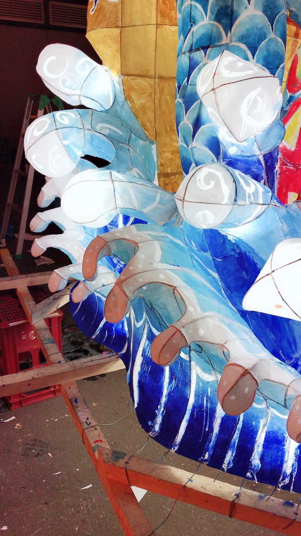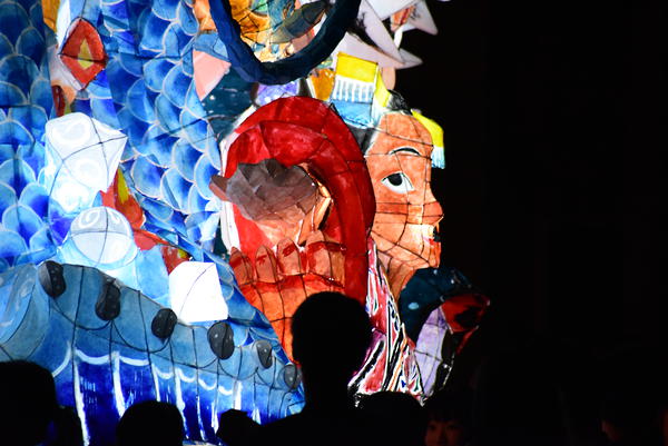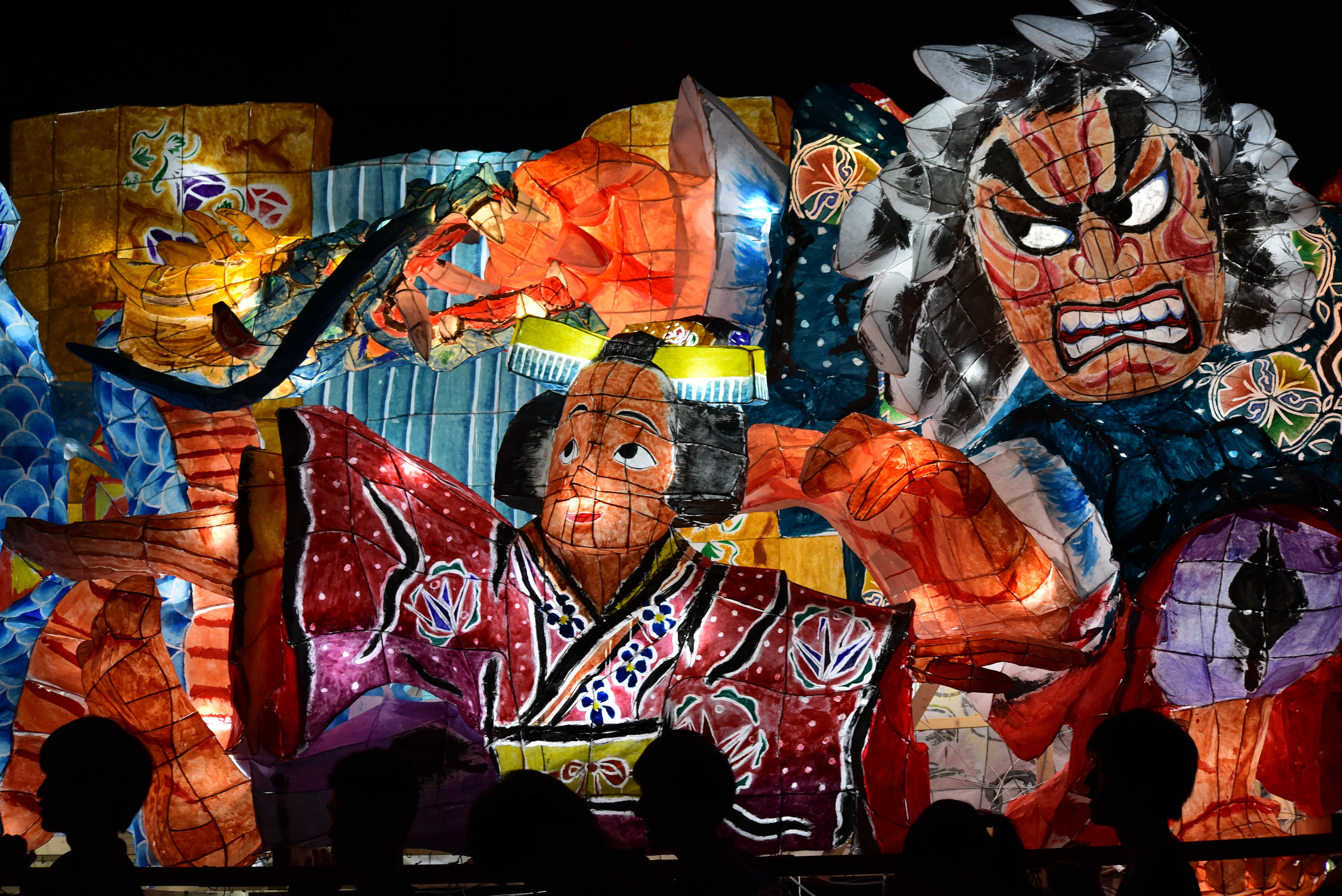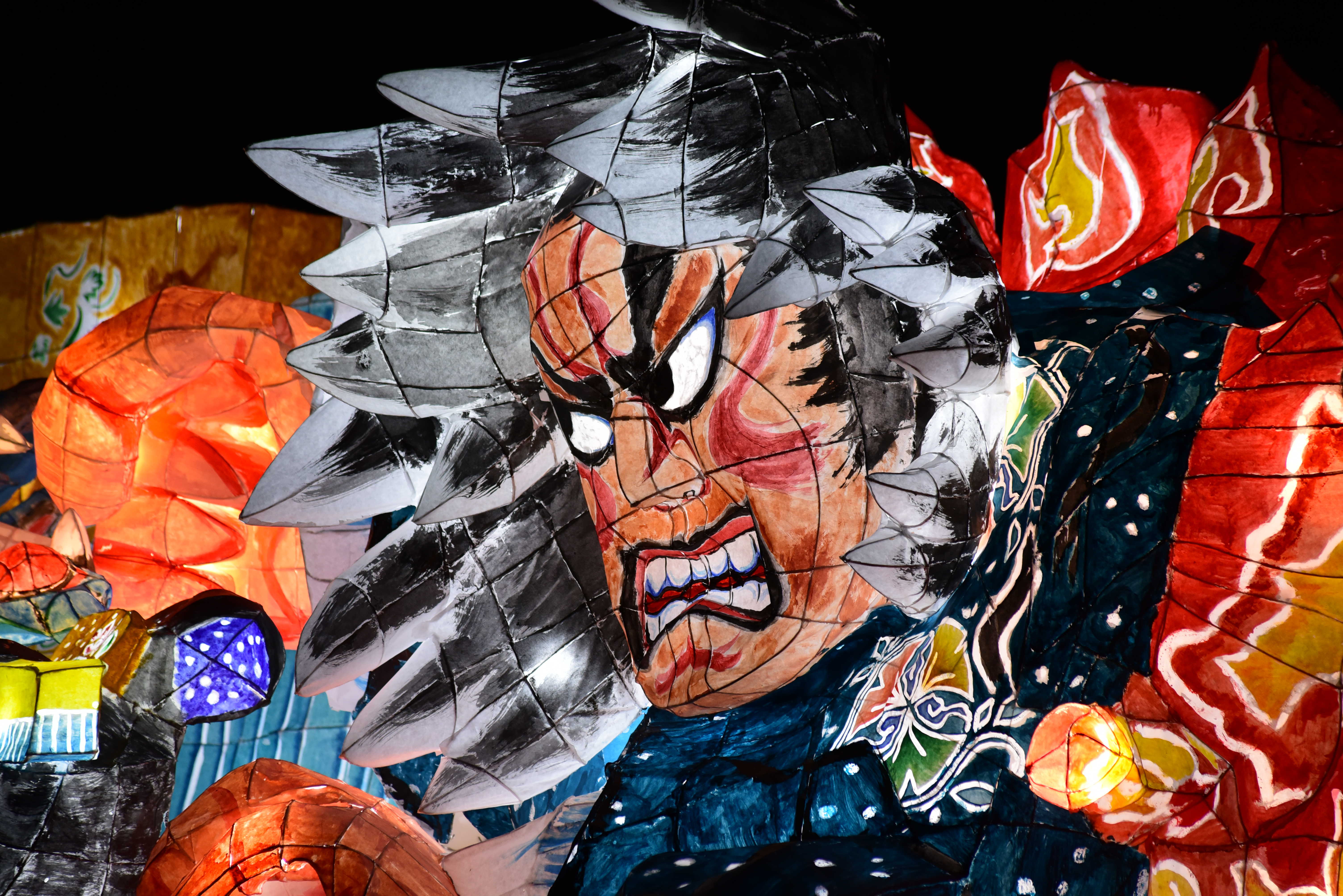 まずは顔!とても迫力があります!睨みつける表情が素晴らしいです。赤い隈取も上手くいっていると思います。髪の流れもとても上手いです。顔は大きさも位置も角度も今年一番よかったかなと思います。 男の肩にあるイチョウの柄、ちょっと目立たない位置にあるのですが、めちゃくちゃキレイで感動してしまいました。ぼかしがとても上手いですね!他の柄もとても上手いのですが、この柄は別格で上手いと思います。 後ろ側の岩が段々になっているところ、地味ですがこういうの好きです。狭い奥行きの中でも妥協しない姿勢が見て取れました。 そして左下の波が素晴らしい!行灯行列のときは担いでいる人の頭ですこし隠れてしまっていますが、一般公開日に見つけたときは「おおっ」と思ってしまいました。水しぶきの躍動感がよく表現された針金・色塗りになっていると思います。素晴らしい。けっこう入り組んでいるので紙貼りも大変だったのではないでしょうか? 色ですが、肌色の色ムラが気になってしまいました。この行灯の構図だと、肌色以外は最悪ムラがあっても問題ないとは思うのですが、肌色もムラがあると、人以外の物体との差があまりわかりづらくなってしまいます。もうちょっと色を薄くしたら塗りやすくかつ他と差別化できてよかったかもしれません。龍の頭部もそうですね。正面から見たときに龍の角と後ろの岩、龍の頭と後ろの滝にそれぞれ色が被ってしまっていてあまり龍が目立っていなかったのがもったいなかった。 大賞と銀賞もそうですが、この行灯はとてもロウを上手く使っているので、最近はロウを上手く使えるかどうかで受賞できるかが変わってくる気がします。 点数も評判も僅差だったので大賞が取れなくて悔しかったかもしれませんが、素晴らしい行灯だったと思います。金賞、おめでとうございます!