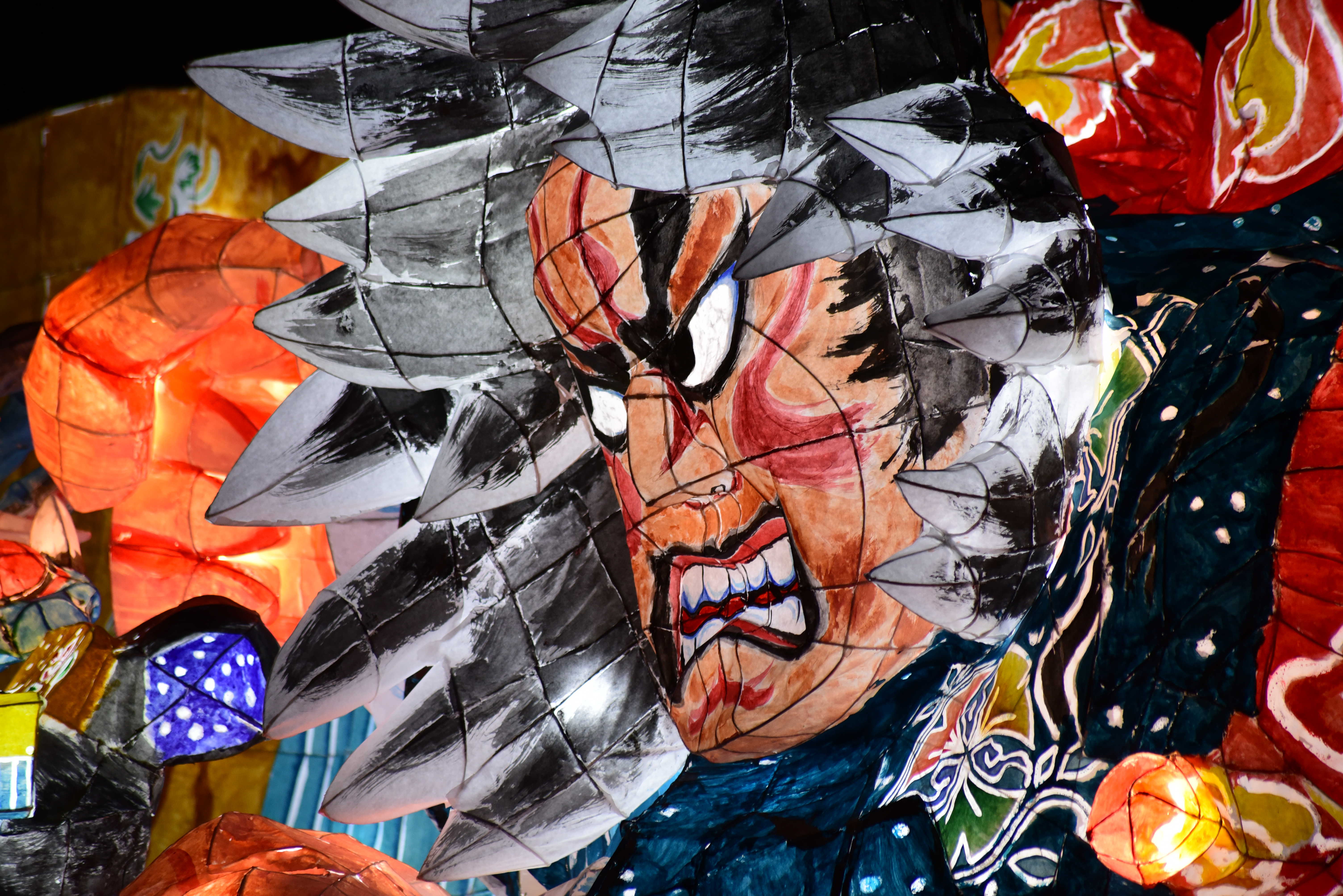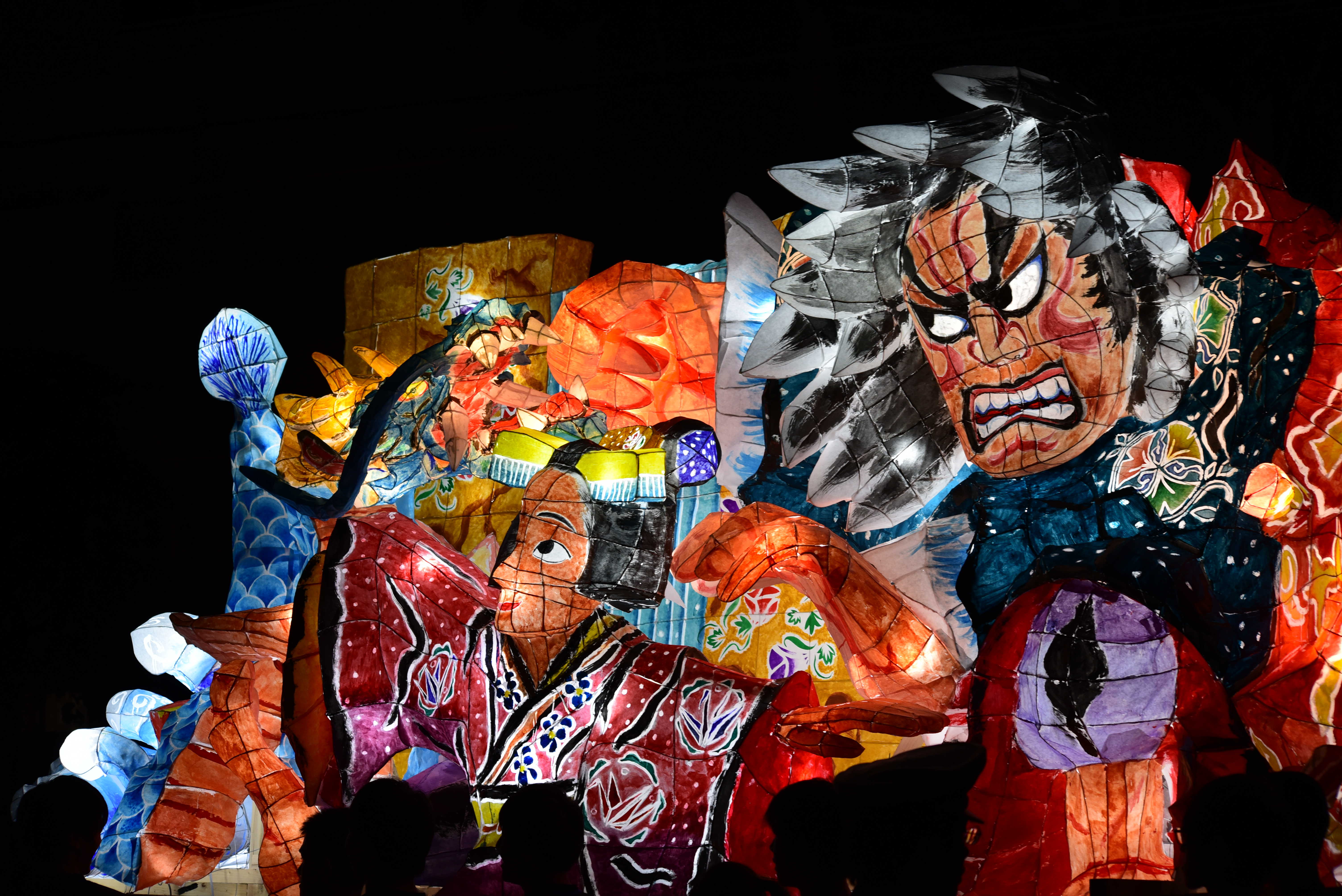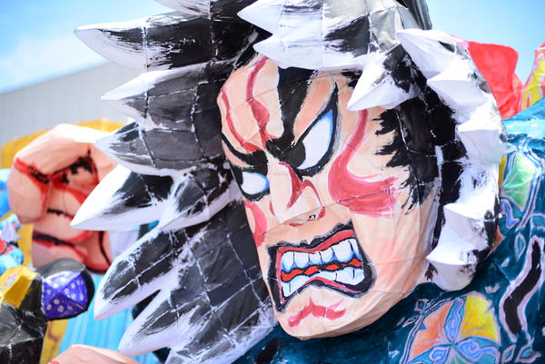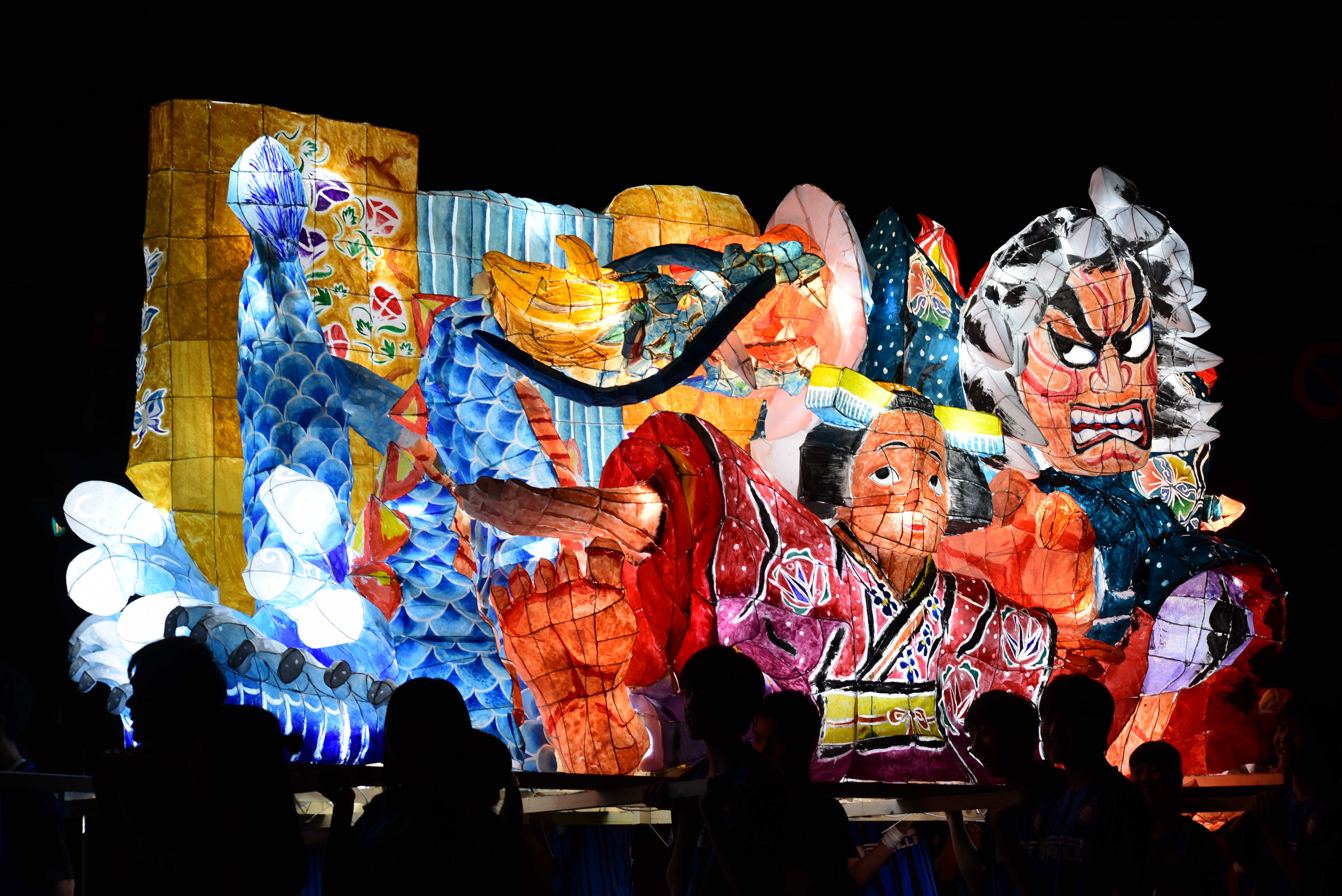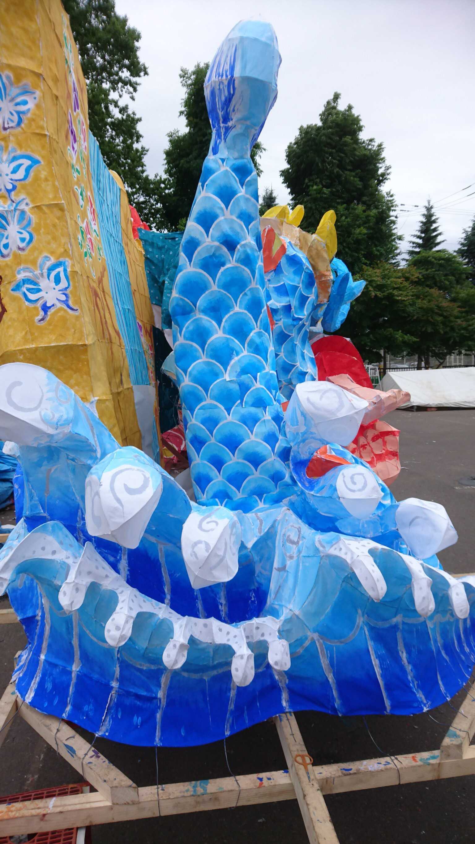 まずは顔!とても迫力があります!睨みつける表情が素晴らしいです。赤い隈取も上手くいっていると思います。髪の流れもとても上手いです。顔は大きさも位置も角度も今年一番よかったかなと思います。 男の肩にあるイチョウの柄、ちょっと目立たない位置にあるのですが、めちゃくちゃキレイで感動してしまいました。ぼかしがとても上手いですね!他の柄もとても上手いのですが、この柄は別格で上手いと思います。 後ろ側の岩が段々になっているところ、地味ですがこういうの好きです。狭い奥行きの中でも妥協しない姿勢が見て取れました。 そして左下の波が素晴らしい!行灯行列のときは担いでいる人の頭ですこし隠れてしまっていますが、一般公開日に見つけたときは「おおっ」と思ってしまいました。水しぶきの躍動感がよく表現された針金・色塗りになっていると思います。素晴らしい。けっこう入り組んでいるので紙貼りも大変だったのではないでしょうか? 色ですが、肌色の色ムラが気になってしまいました。この行灯の構図だと、肌色以外は最悪ムラがあっても問題ないとは思うのですが、肌色もムラがあると、人以外の物体との差があまりわかりづらくなってしまいます。もうちょっと色を薄くしたら塗りやすくかつ他と差別化できてよかったかもしれません。龍の頭部もそうですね。正面から見たときに龍の角と後ろの岩、龍の頭と後ろの滝にそれぞれ色が被ってしまっていてあまり龍が目立っていなかったのがもったいなかった。 大賞と銀賞もそうですが、この行灯はとてもロウを上手く使っているので、最近はロウを上手く使えるかどうかで受賞できるかが変わってくる気がします。 点数も評判も僅差だったので大賞が取れなくて悔しかったかもしれませんが、素晴らしい行灯だったと思います。金賞、おめでとうございます!