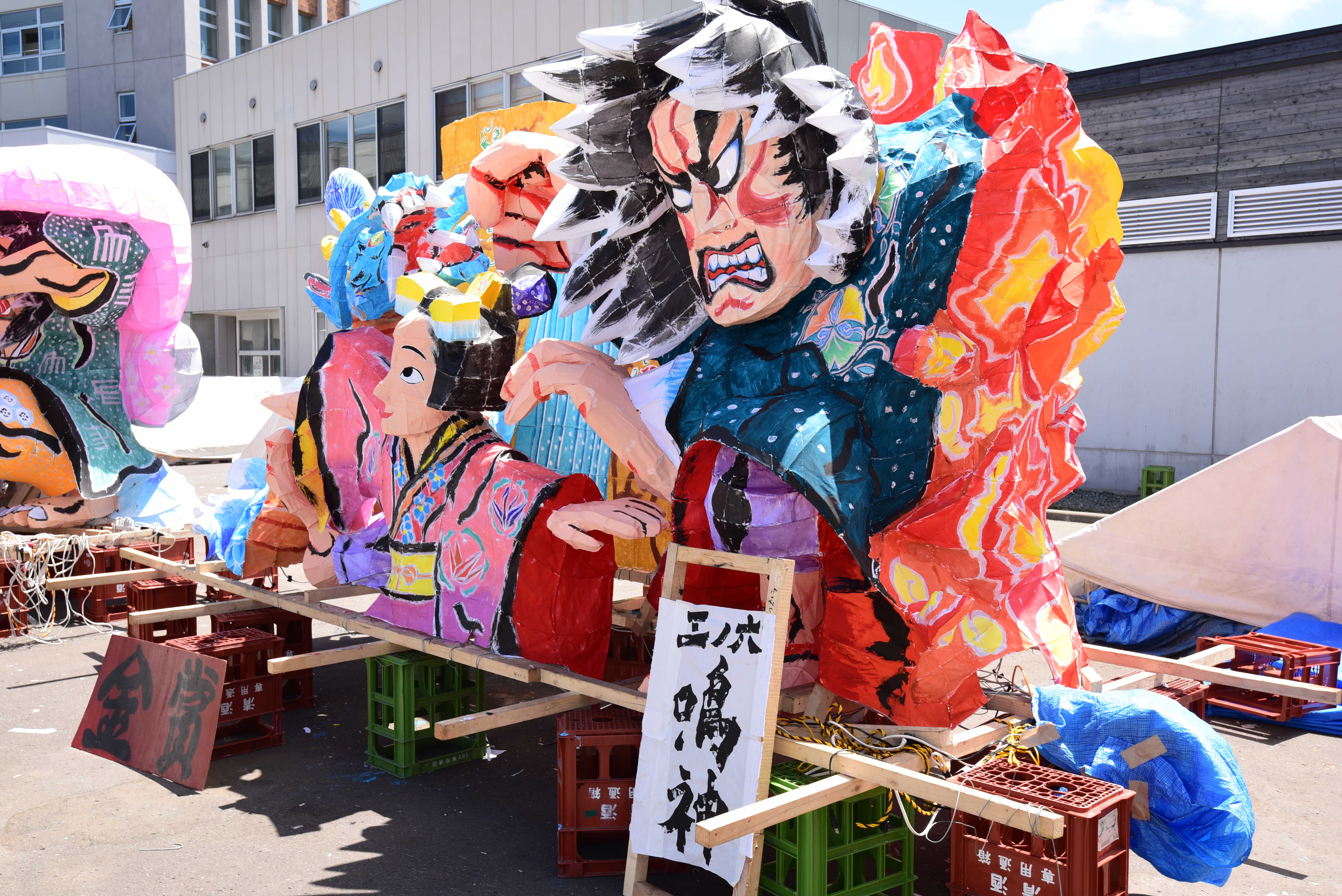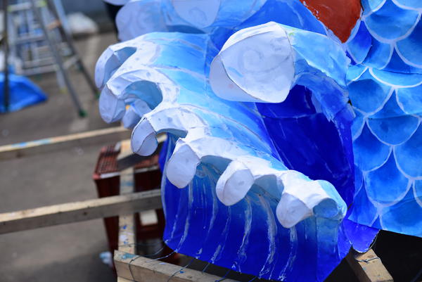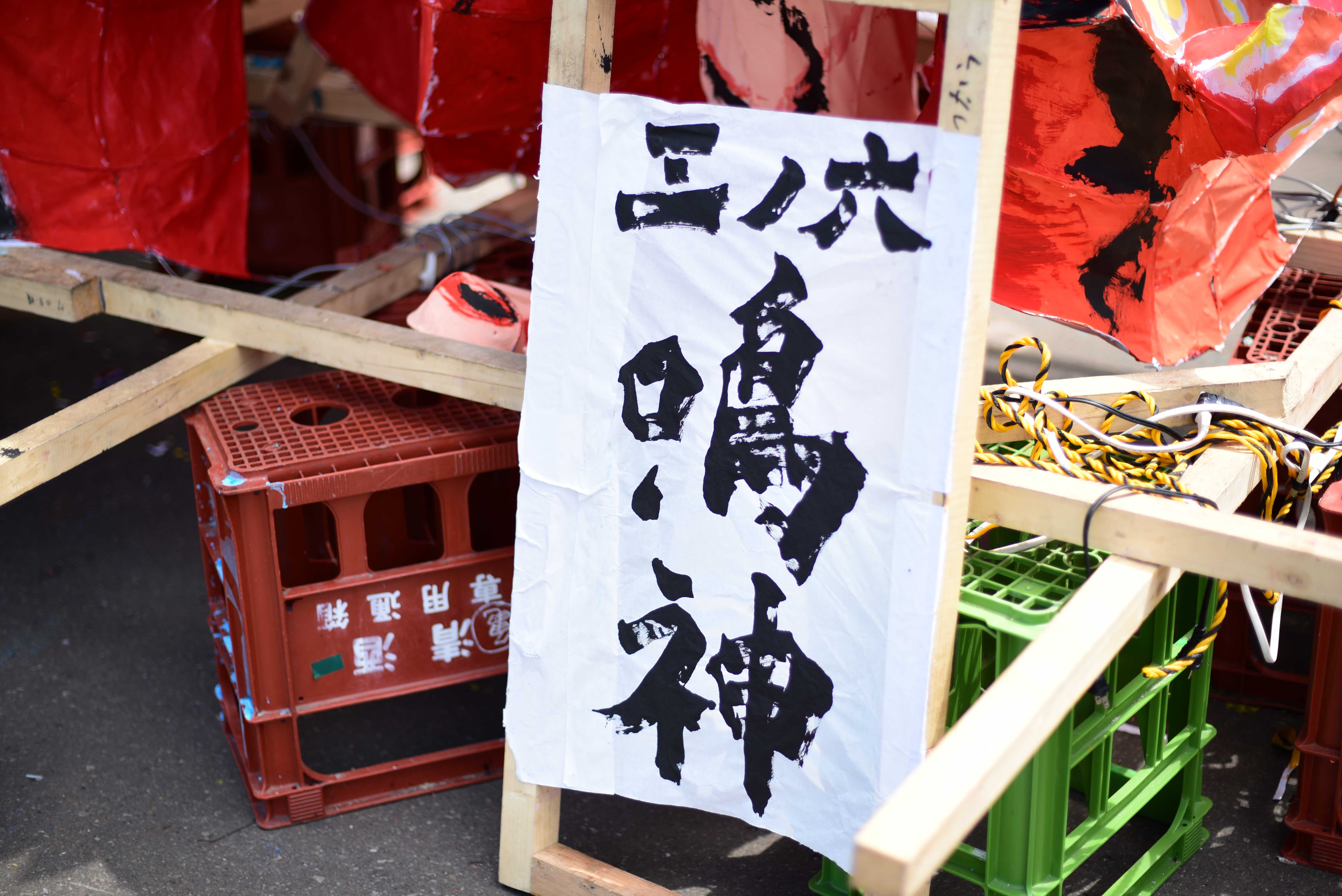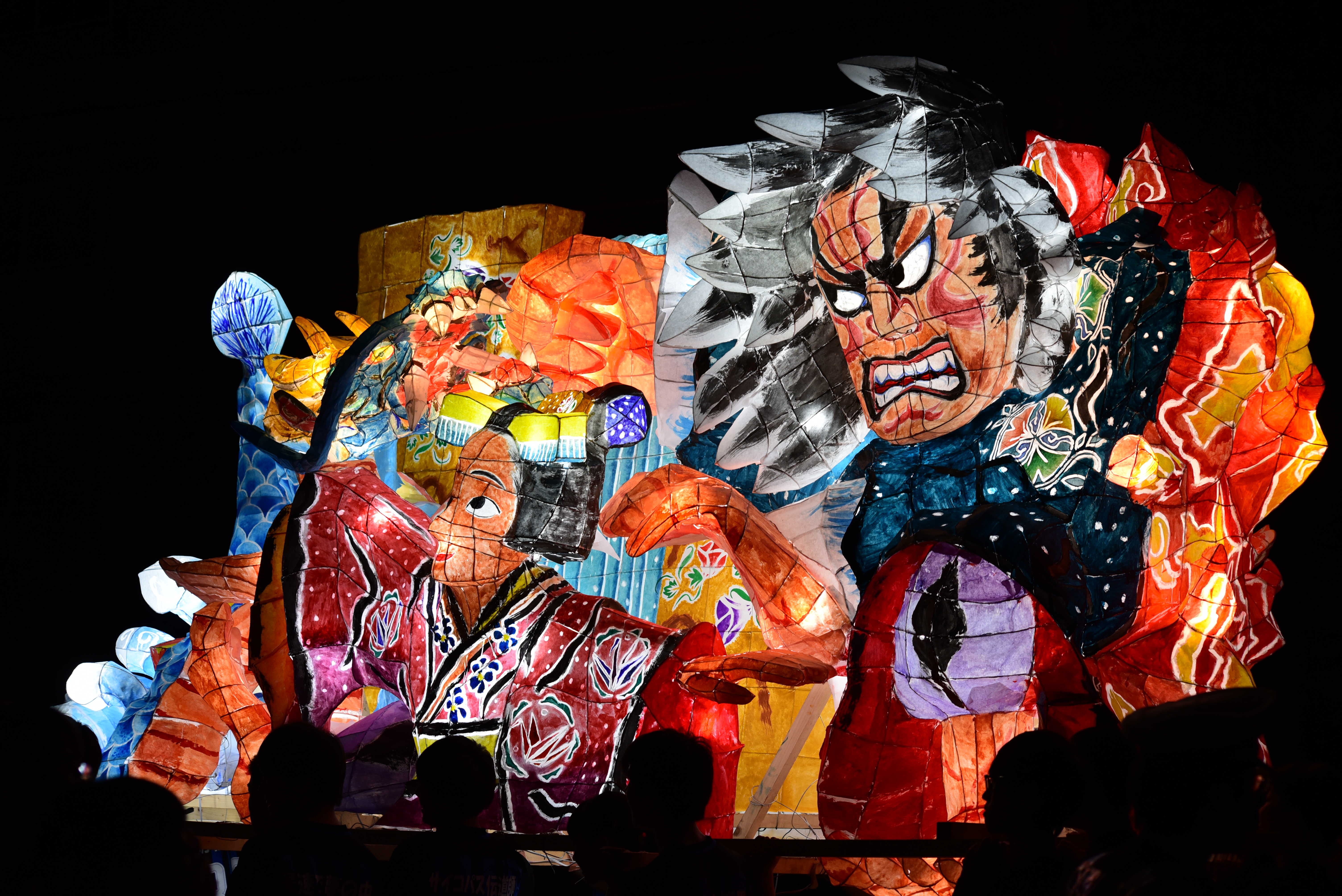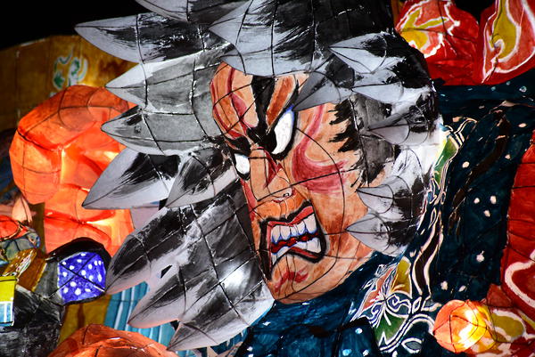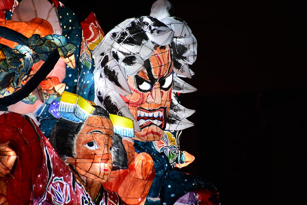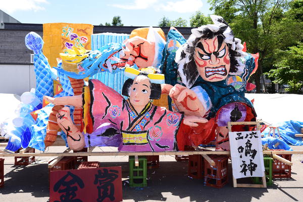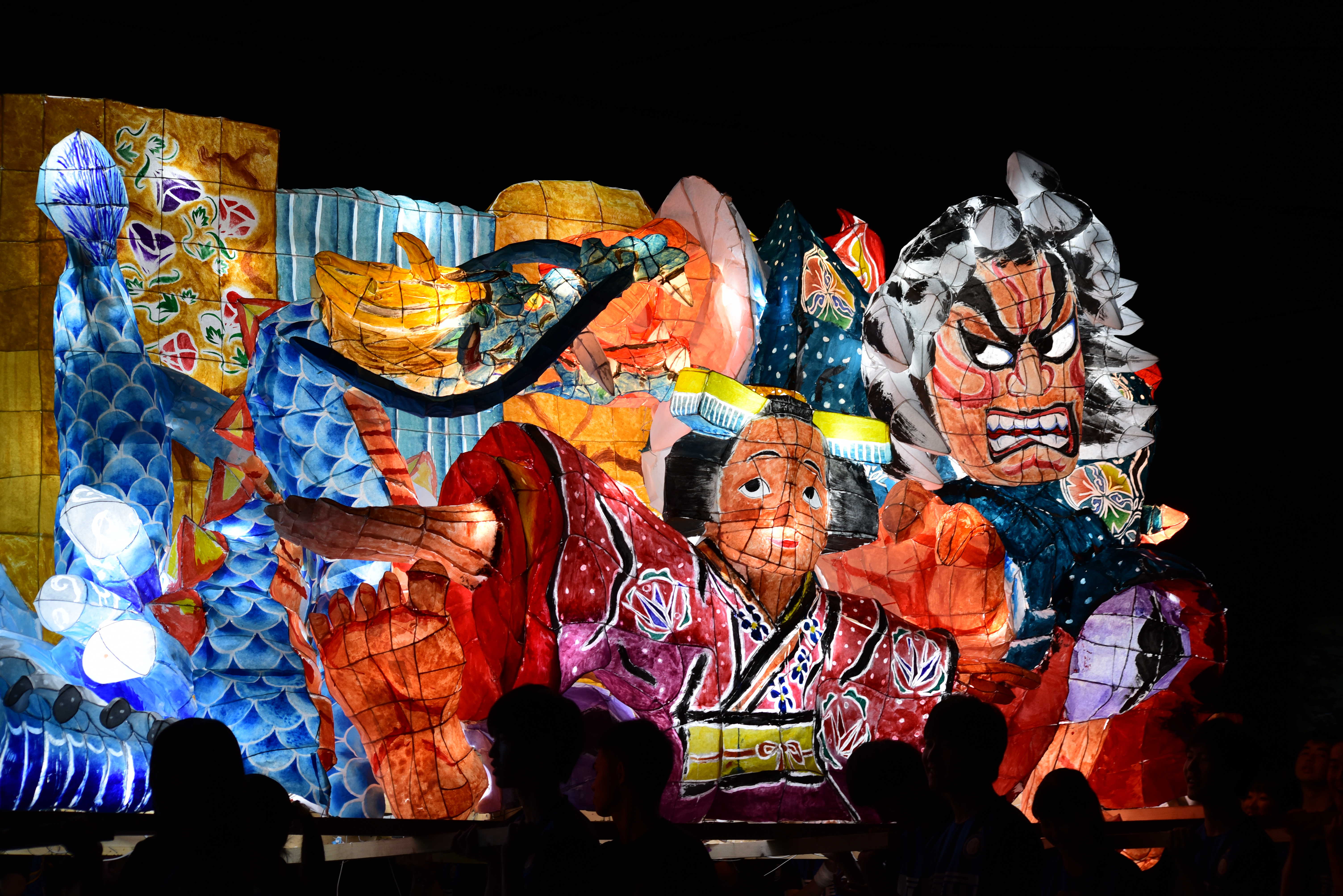 まずは顔!とても迫力があります!睨みつける表情が素晴らしいです。赤い隈取も上手くいっていると思います。髪の流れもとても上手いです。顔は大きさも位置も角度も今年一番よかったかなと思います。 男の肩にあるイチョウの柄、ちょっと目立たない位置にあるのですが、めちゃくちゃキレイで感動してしまいました。ぼかしがとても上手いですね!他の柄もとても上手いのですが、この柄は別格で上手いと思います。 後ろ側の岩が段々になっているところ、地味ですがこういうの好きです。狭い奥行きの中でも妥協しない姿勢が見て取れました。 そして左下の波が素晴らしい!行灯行列のときは担いでいる人の頭ですこし隠れてしまっていますが、一般公開日に見つけたときは「おおっ」と思ってしまいました。水しぶきの躍動感がよく表現された針金・色塗りになっていると思います。素晴らしい。けっこう入り組んでいるので紙貼りも大変だったのではないでしょうか? 色ですが、肌色の色ムラが気になってしまいました。この行灯の構図だと、肌色以外は最悪ムラがあっても問題ないとは思うのですが、肌色もムラがあると、人以外の物体との差があまりわかりづらくなってしまいます。もうちょっと色を薄くしたら塗りやすくかつ他と差別化できてよかったかもしれません。龍の頭部もそうですね。正面から見たときに龍の角と後ろの岩、龍の頭と後ろの滝にそれぞれ色が被ってしまっていてあまり龍が目立っていなかったのがもったいなかった。 大賞と銀賞もそうですが、この行灯はとてもロウを上手く使っているので、最近はロウを上手く使えるかどうかで受賞できるかが変わってくる気がします。 点数も評判も僅差だったので大賞が取れなくて悔しかったかもしれませんが、素晴らしい行灯だったと思います。金賞、おめでとうございます!