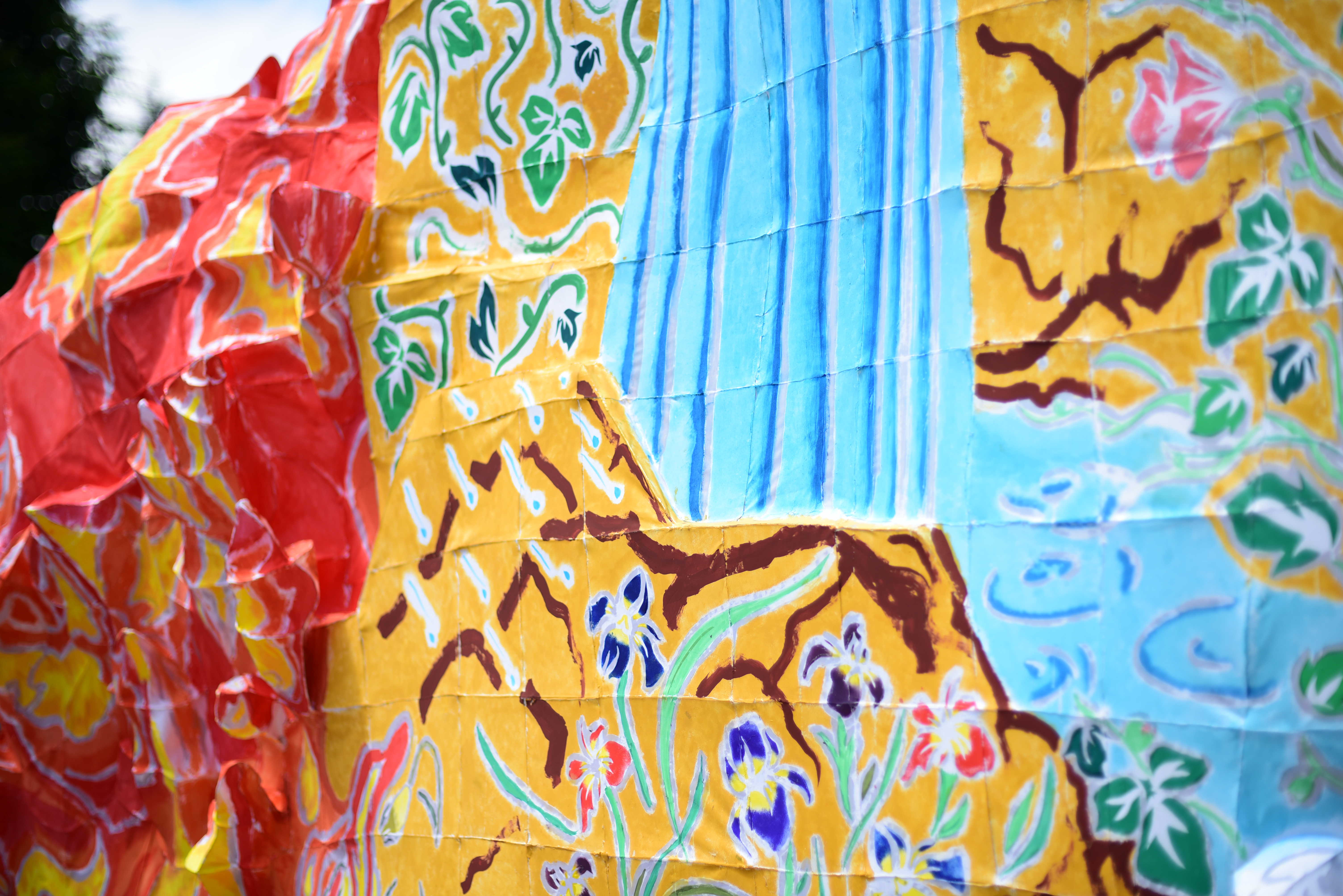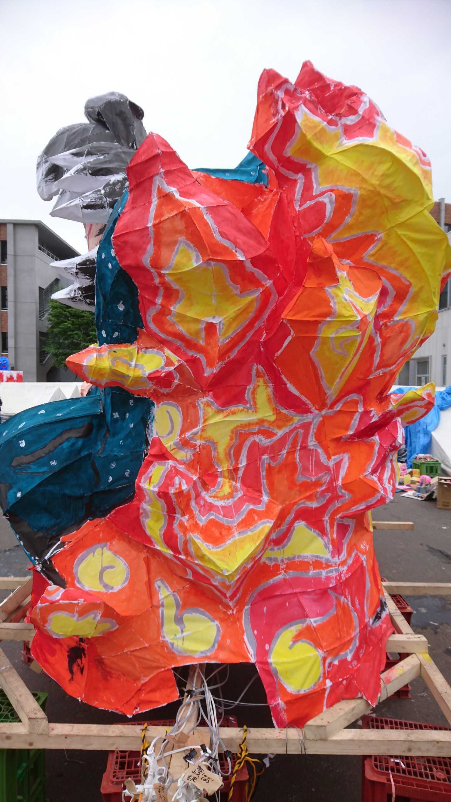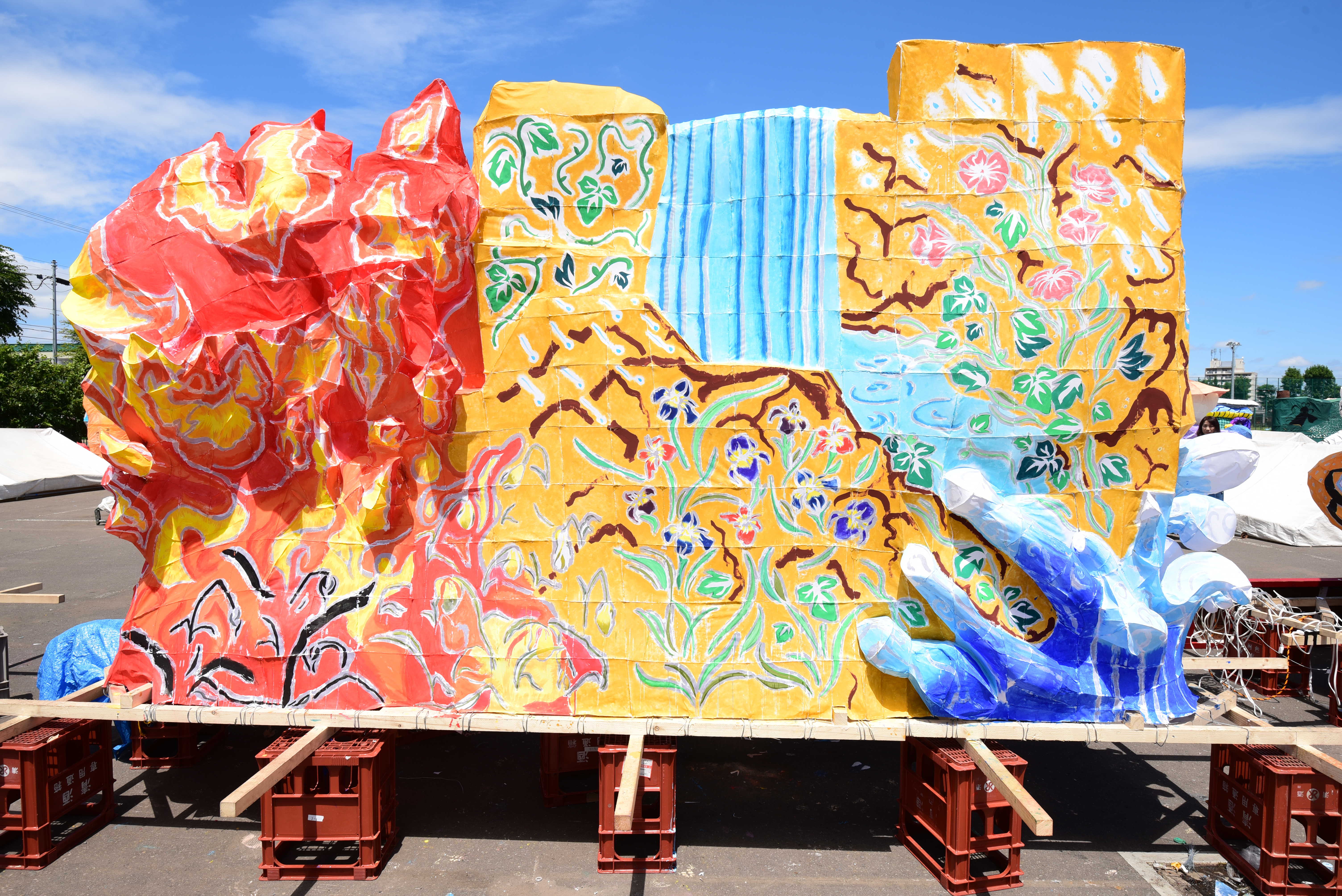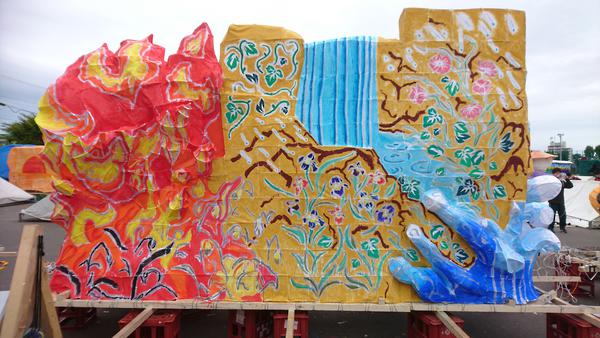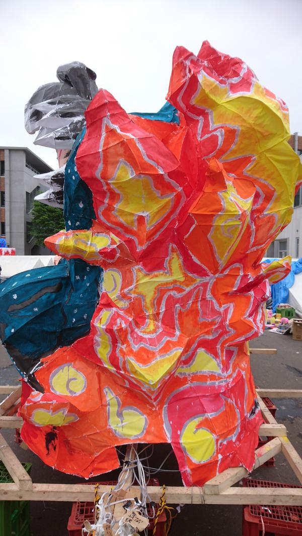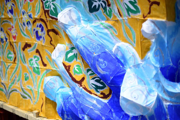あとは、滝や炎のところでのロウの使われ方がとても効果的でした。特に裏面のクオリティがとても高く、今年1番だと思います。めちゃくちゃ綺麗でした。個人的な話になるんですが、僕が3年生で滝を作ることになったときに、このように青、水色、ロウ…と繰り返すような滝を作りたかったので、こういった作品がでてきて嬉しいです。