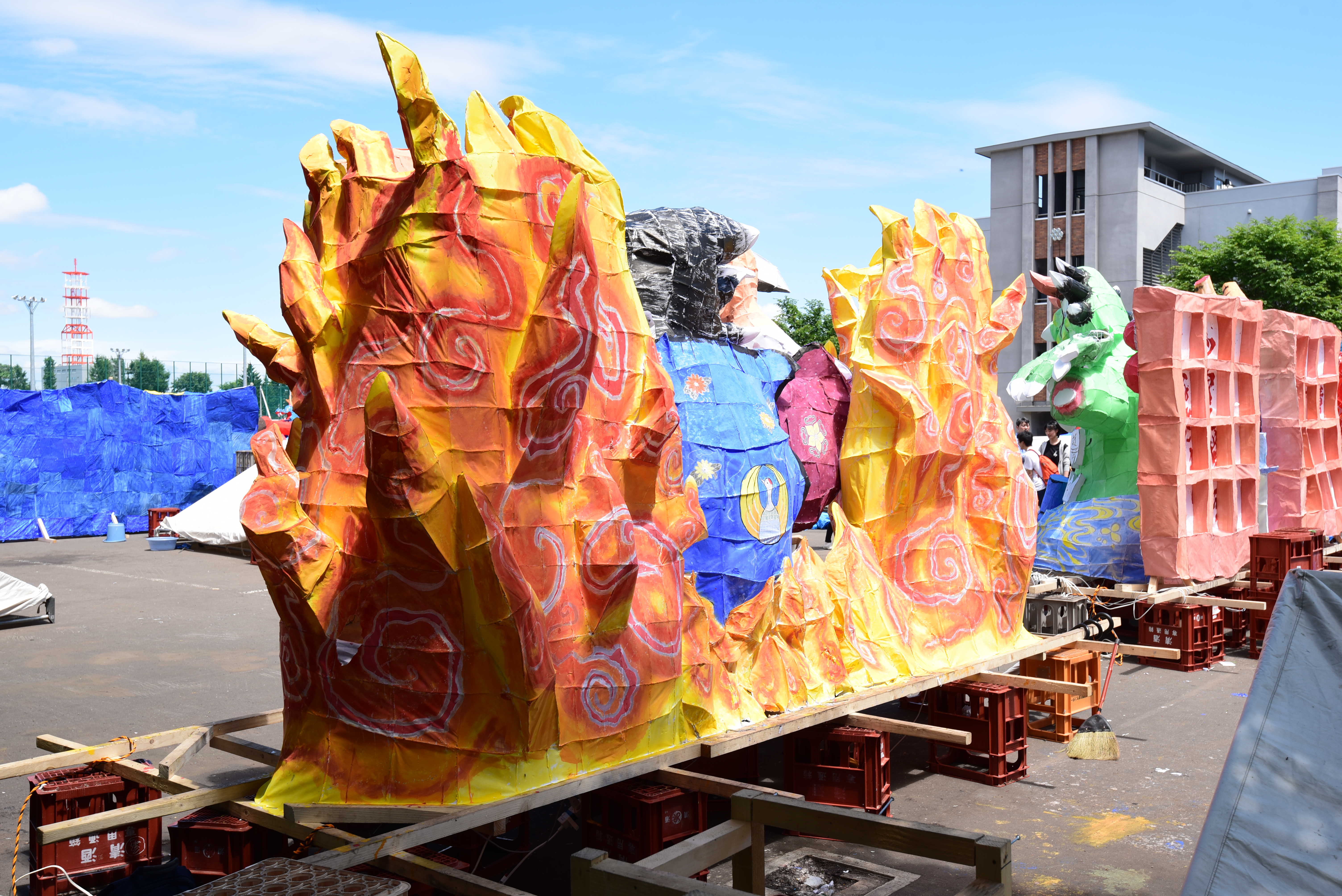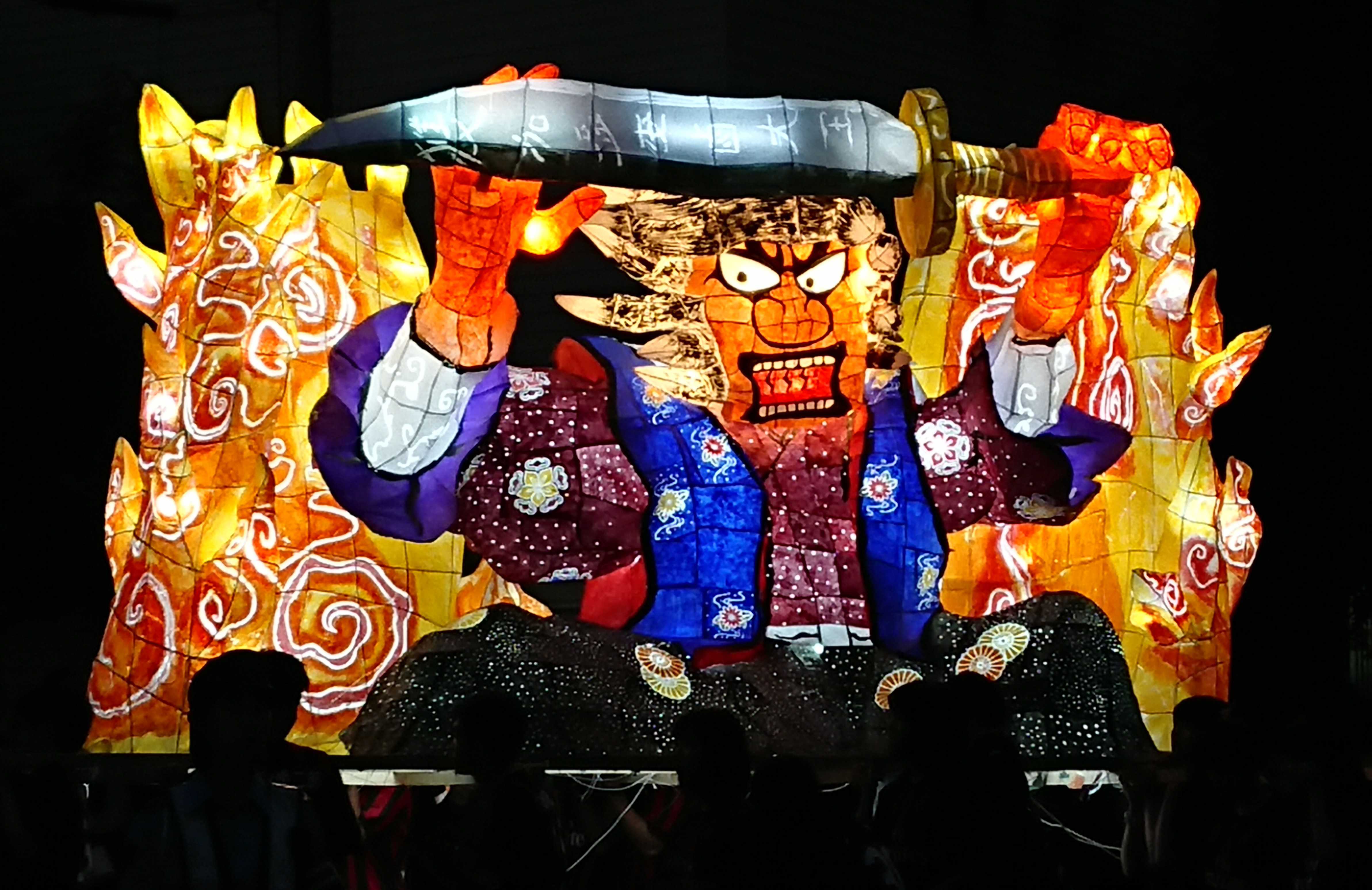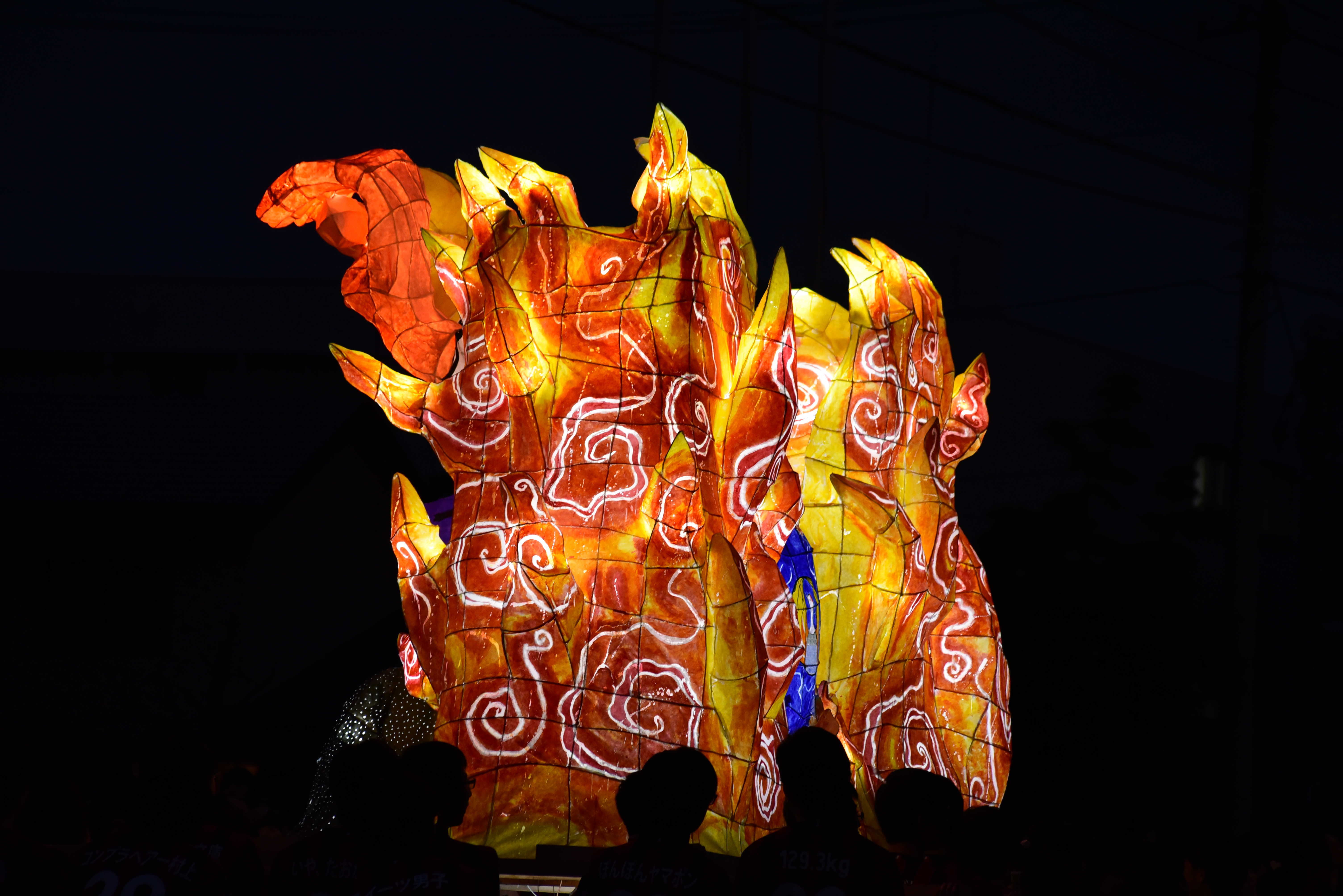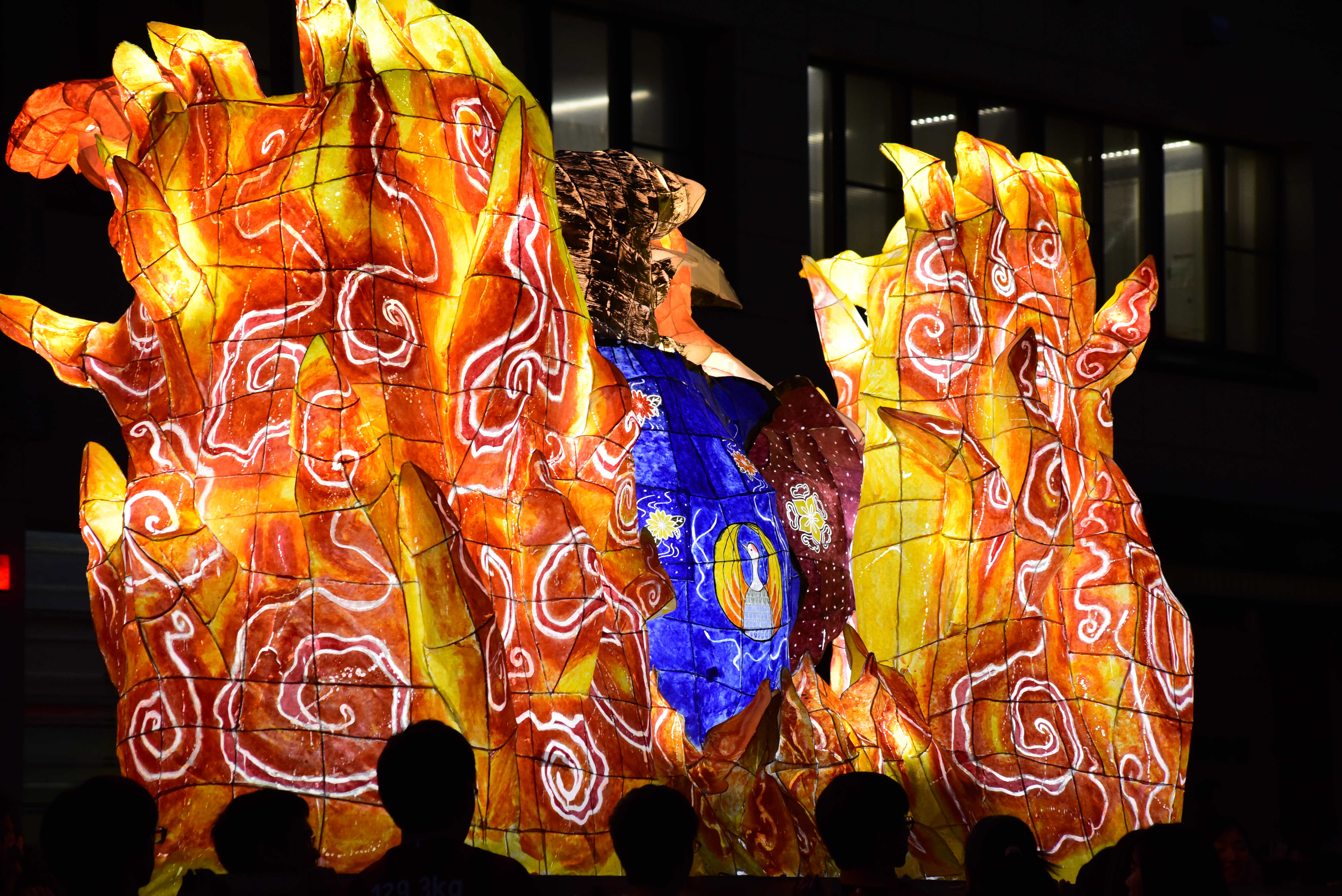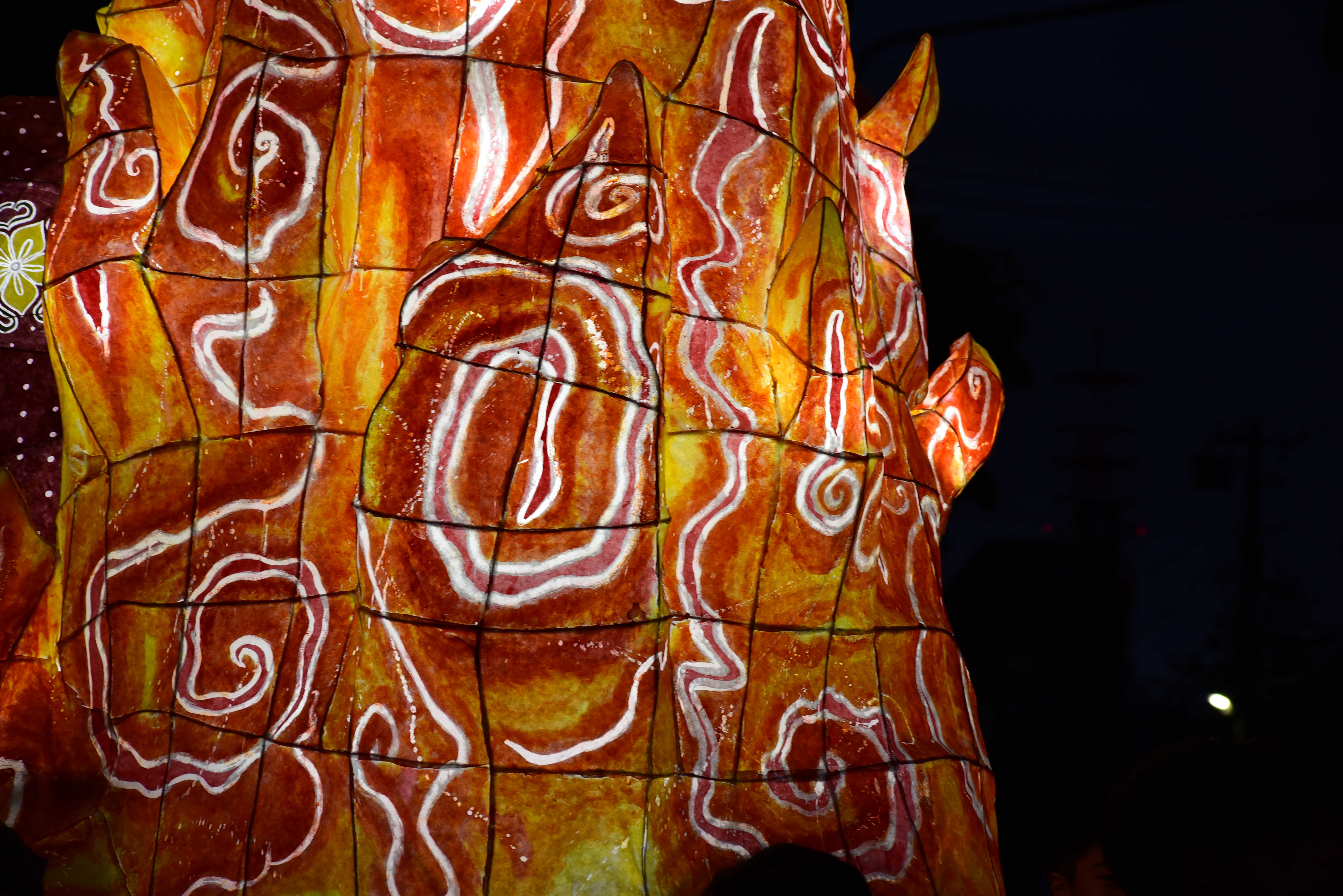 特に配色が素晴らしいと思っていて、内側には暗い寒色系の色、外側に明るい暖色系の色を持ってきているので、内側は引き締めつつも全体では大きく見せることに成功しています。 暗い色もただ暗くするだけでは形がわからなくなってしまうので、きちんとロウ点を打っていたり明るい柄を入れていたりとよく工夫されています。さらに炎がバックにあるので体の輪郭もよくわかります。 針金も不自然なところはないですし、電飾もよく光っていました。 あともう一つ「おお」と思ったのが、ギャラリーの写真を見るとわかりますが、このクラスは審査員席で前に傾けていて、審査員に対して覆いかぶさるような演出をしていました。青森ねぶた祭りを観に行くとよくわかりますが前に傾けられると迫力が倍増するんですよね。あとは北高行灯の奥行き足りなさすぎ問題に対してこの手を使うと高さを奥行きとして使うことができるので、よさそうです。 ただ、これけっこう危ない (最悪角材が折れたりパーツが外れたりして審査員席に落ちる) と思うので後輩のみなさんはやらないほうがいいと思います。現段階では禁止されていない?かもしれませんがもしかしたら今後禁止されるかも。