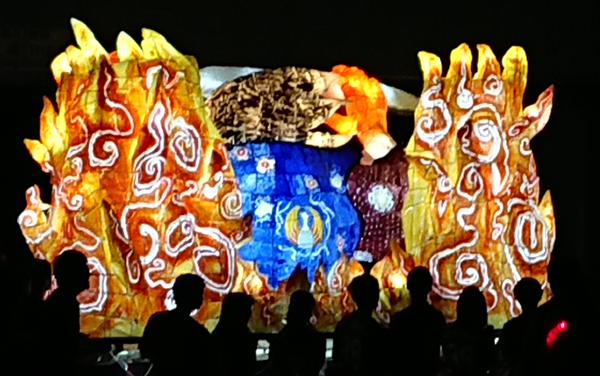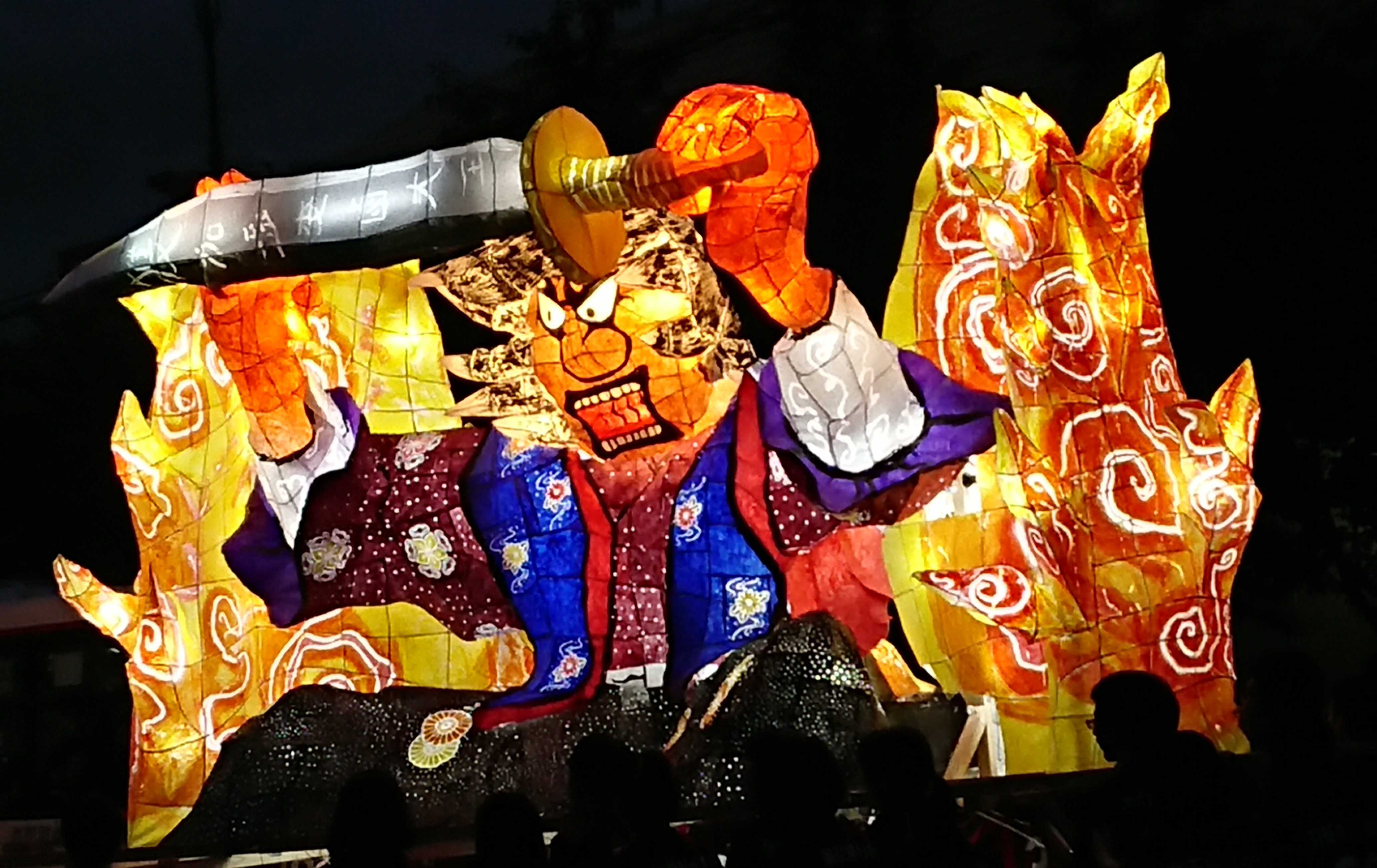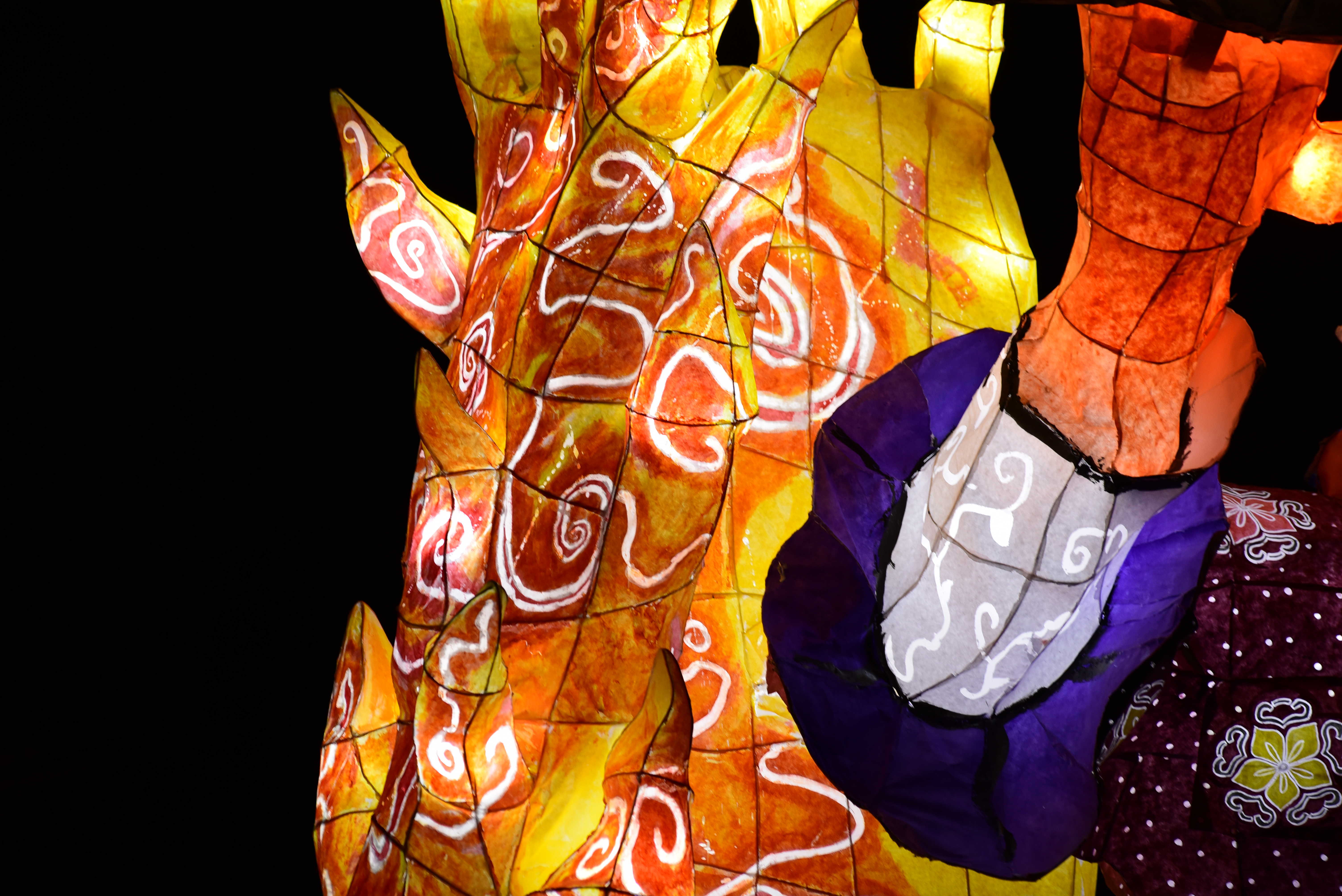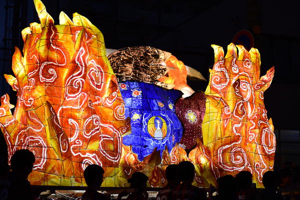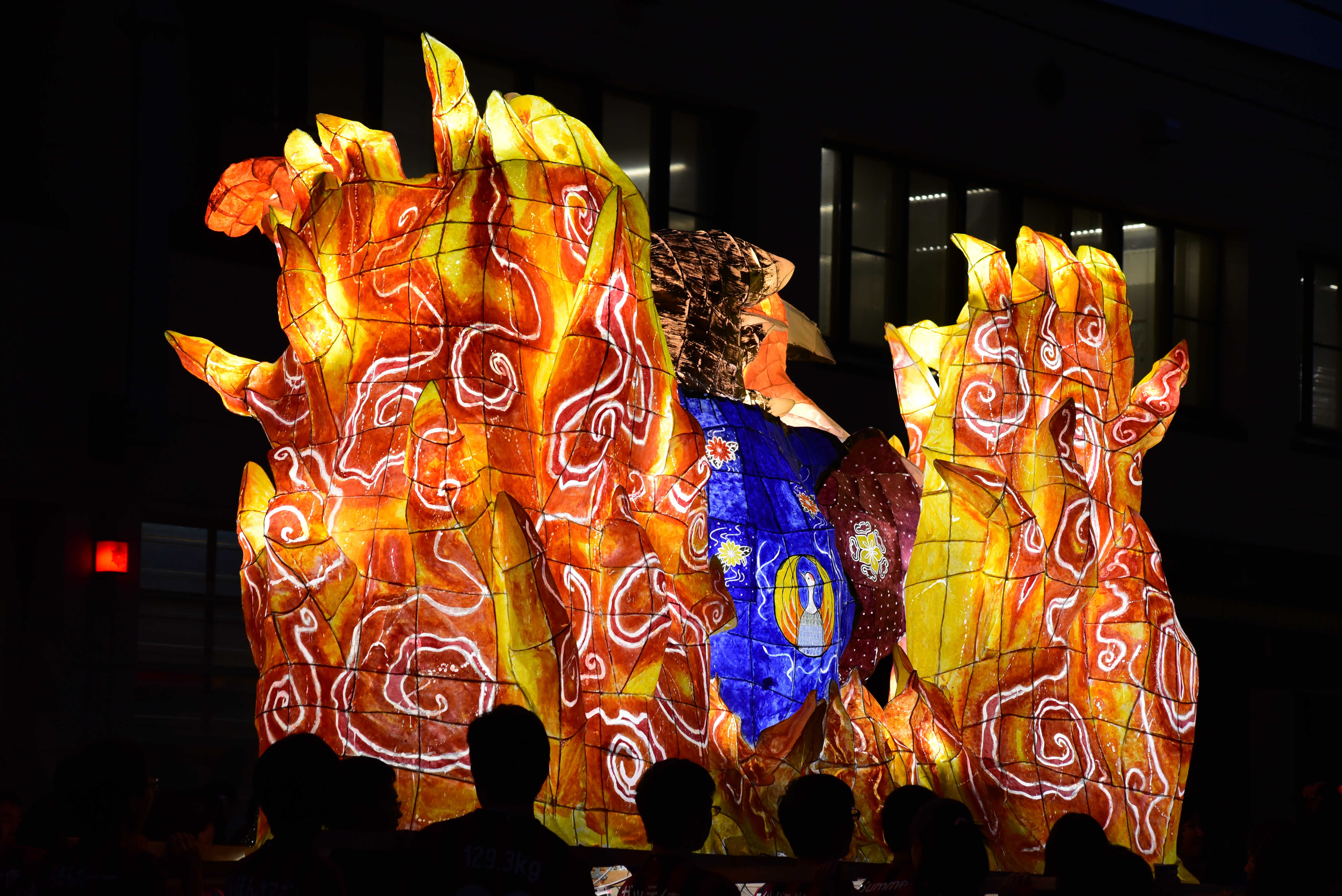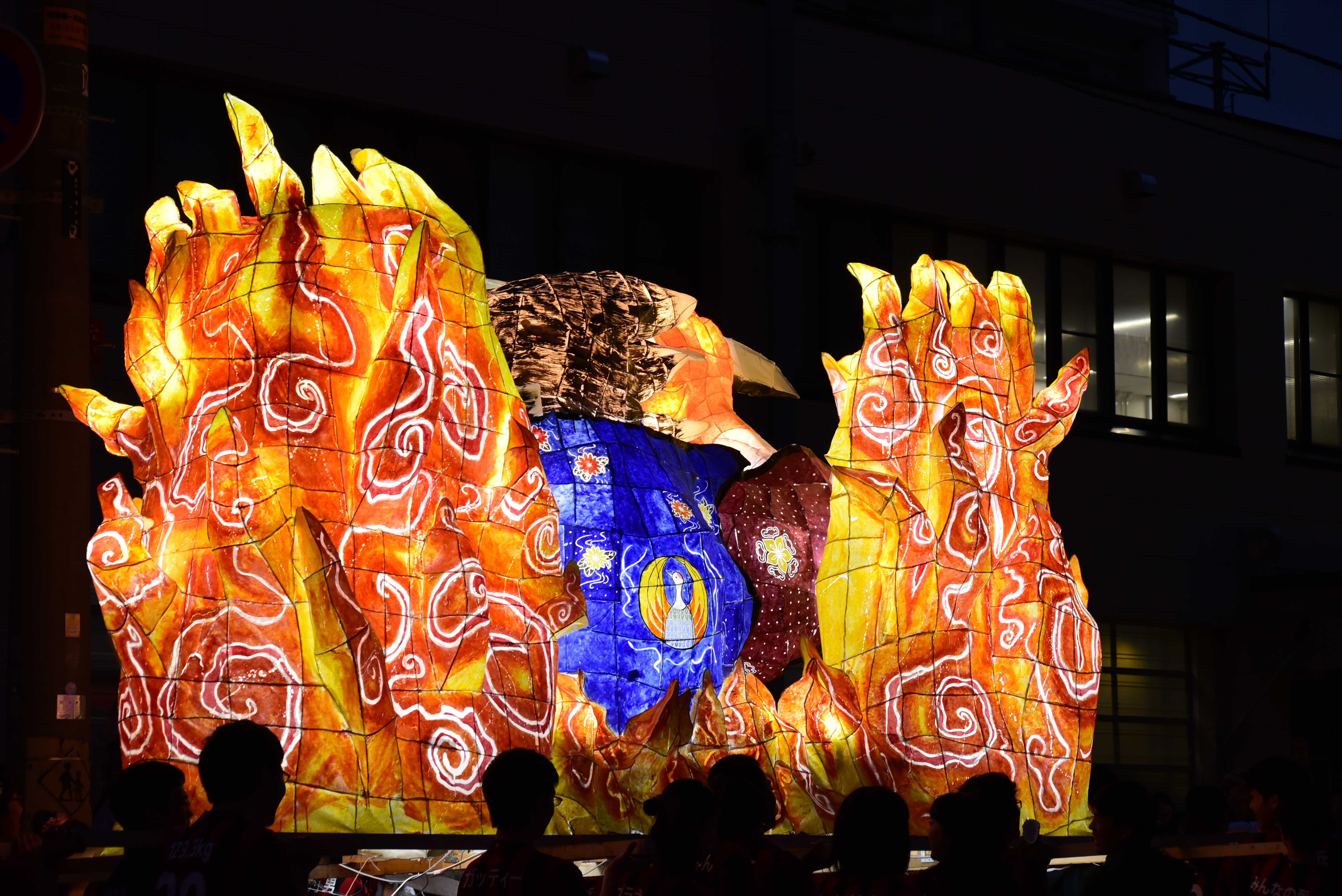 特に配色が素晴らしいと思っていて、内側には暗い寒色系の色、外側に明るい暖色系の色を持ってきているので、内側は引き締めつつも全体では大きく見せることに成功しています。 暗い色もただ暗くするだけでは形がわからなくなってしまうので、きちんとロウ点を打っていたり明るい柄を入れていたりとよく工夫されています。さらに炎がバックにあるので体の輪郭もよくわかります。 針金も不自然なところはないですし、電飾もよく光っていました。 あともう一つ「おお」と思ったのが、ギャラリーの写真を見るとわかりますが、このクラスは審査員席で前に傾けていて、審査員に対して覆いかぶさるような演出をしていました。青森ねぶた祭りを観に行くとよくわかりますが前に傾けられると迫力が倍増するんですよね。あとは北高行灯の奥行き足りなさすぎ問題に対してこの手を使うと高さを奥行きとして使うことができるので、よさそうです。 ただ、これけっこう危ない (最悪角材が折れたりパーツが外れたりして審査員席に落ちる) と思うので後輩のみなさんはやらないほうがいいと思います。現段階では禁止されていない?かもしれませんがもしかしたら今後禁止されるかも。