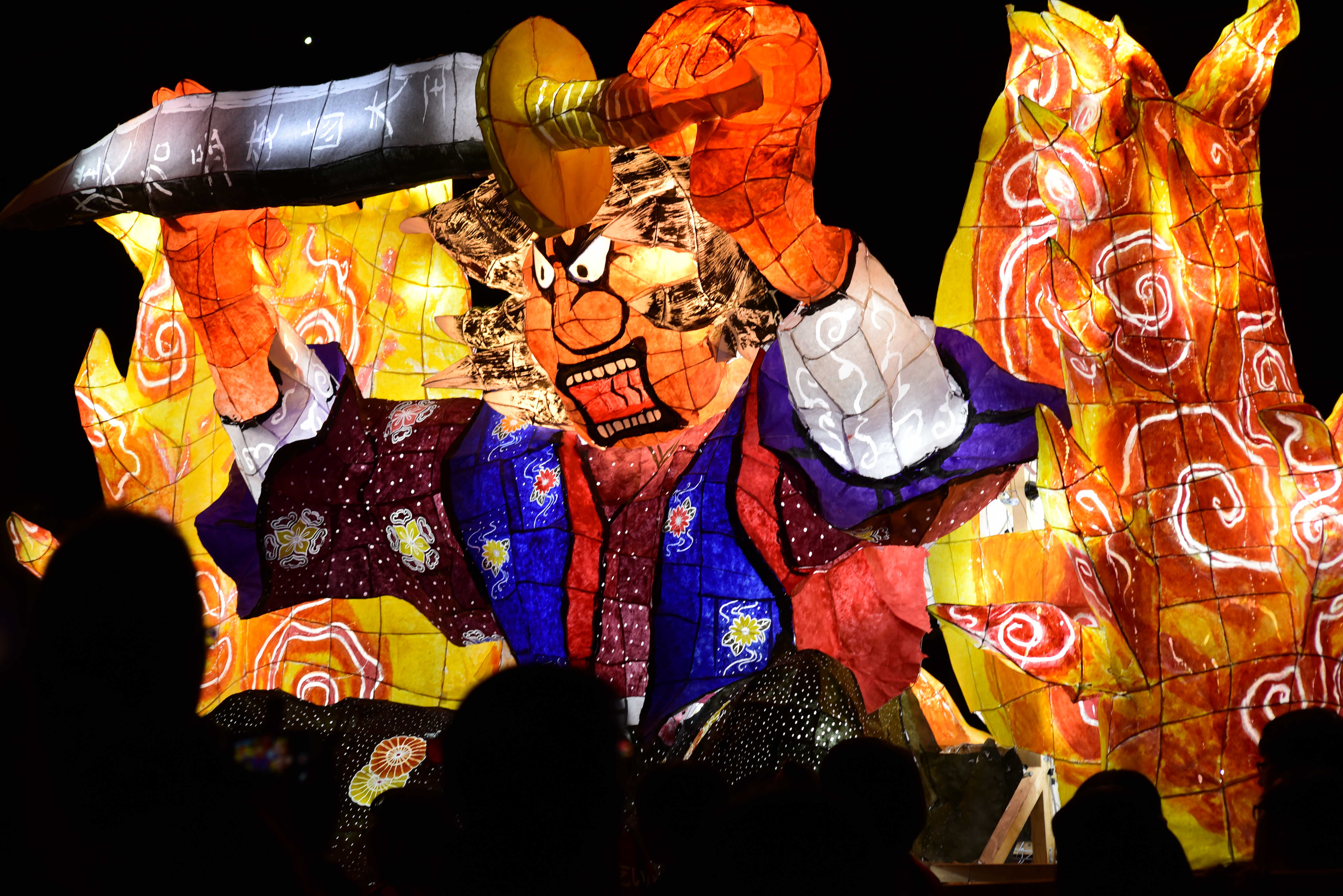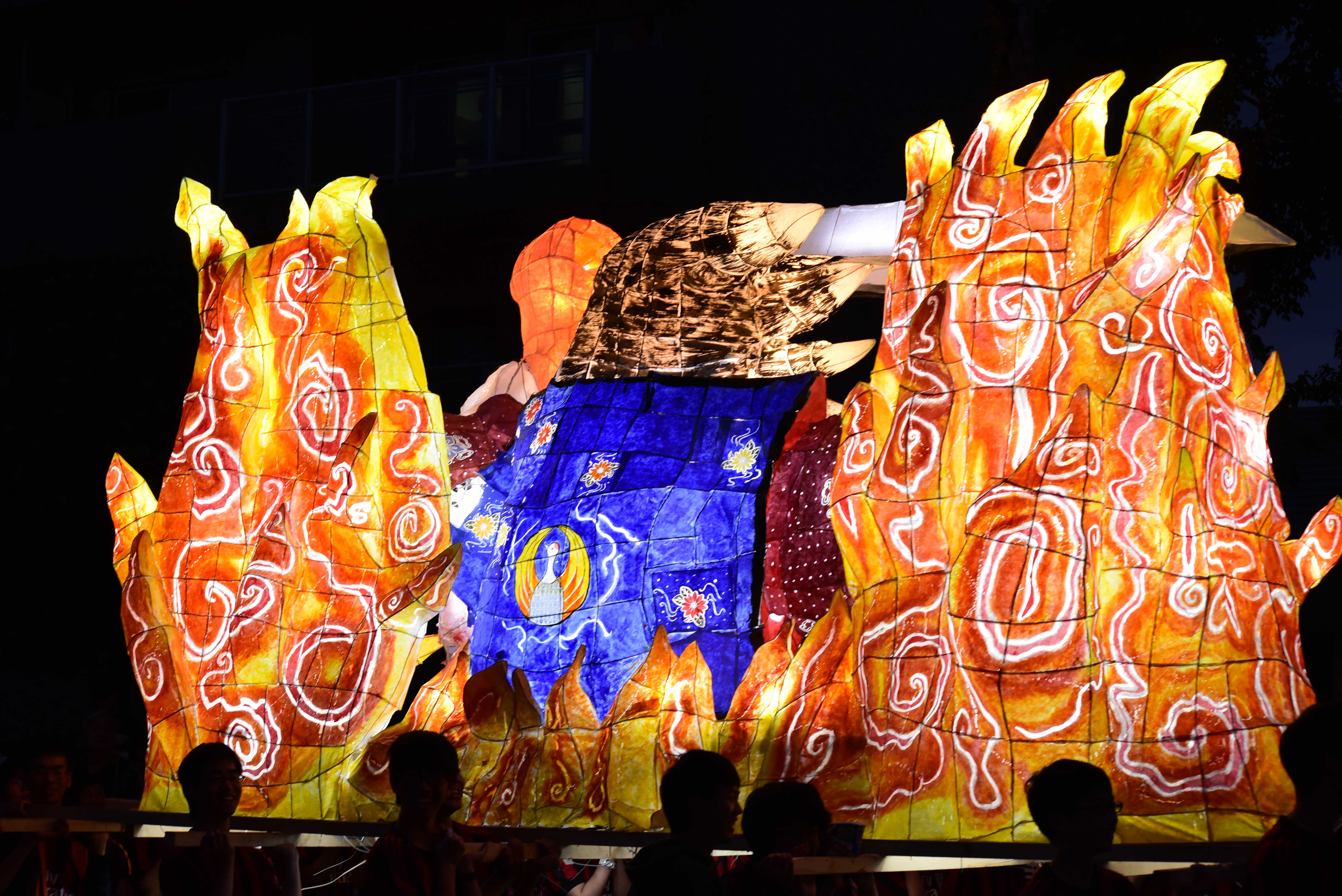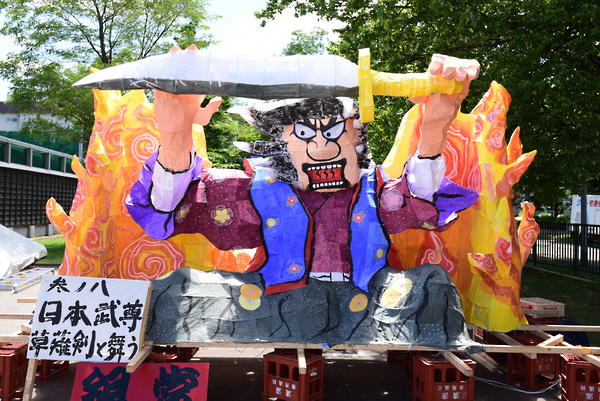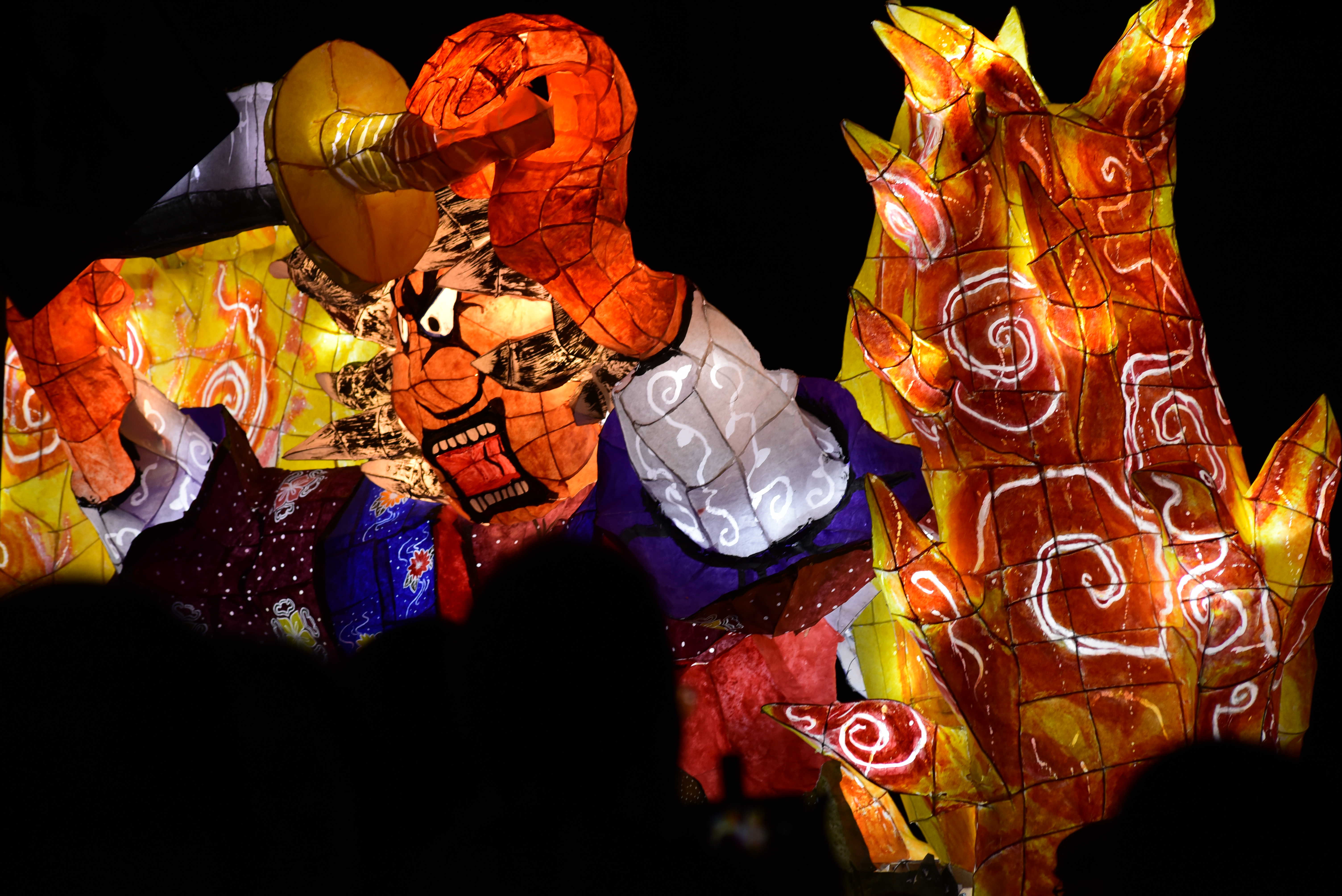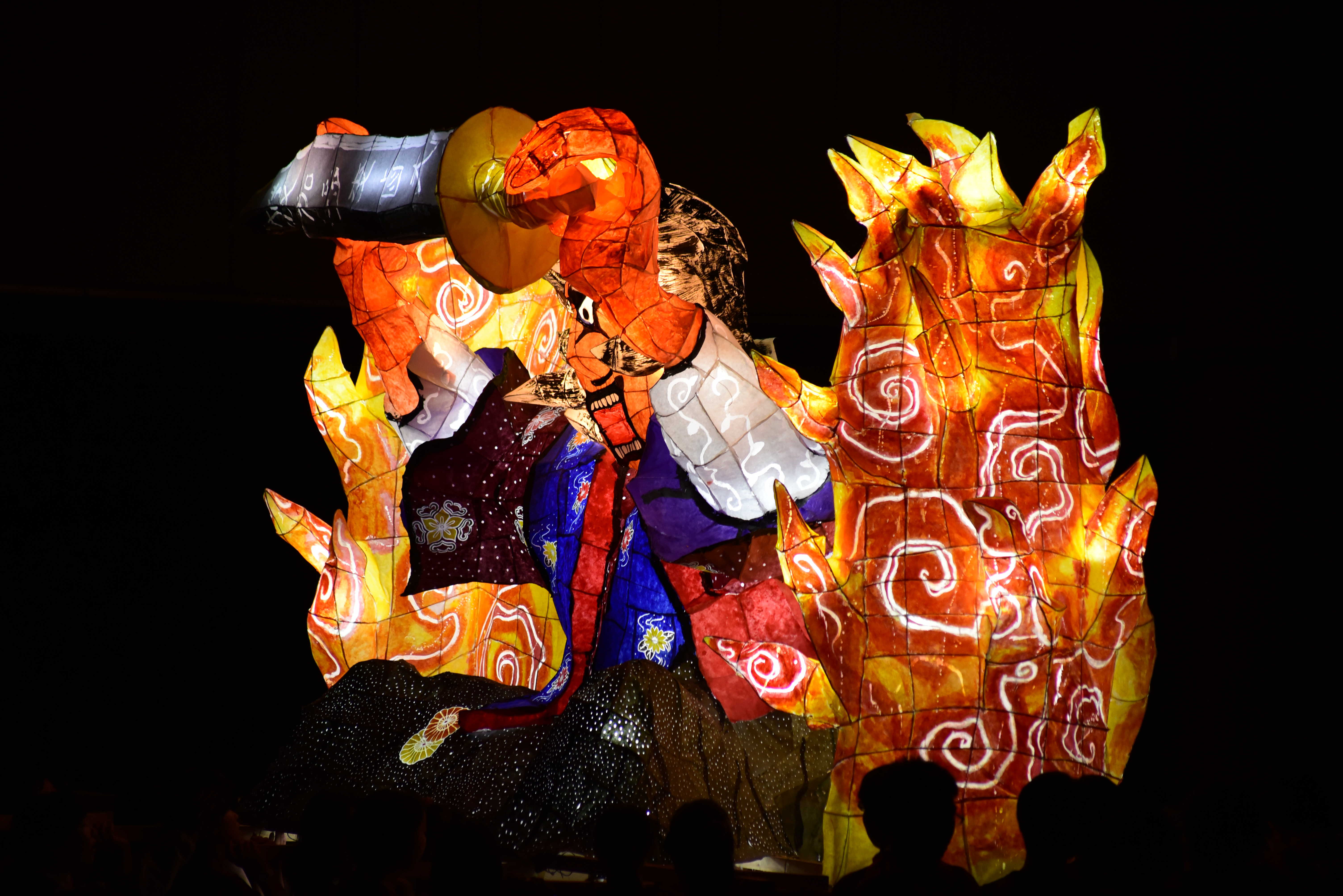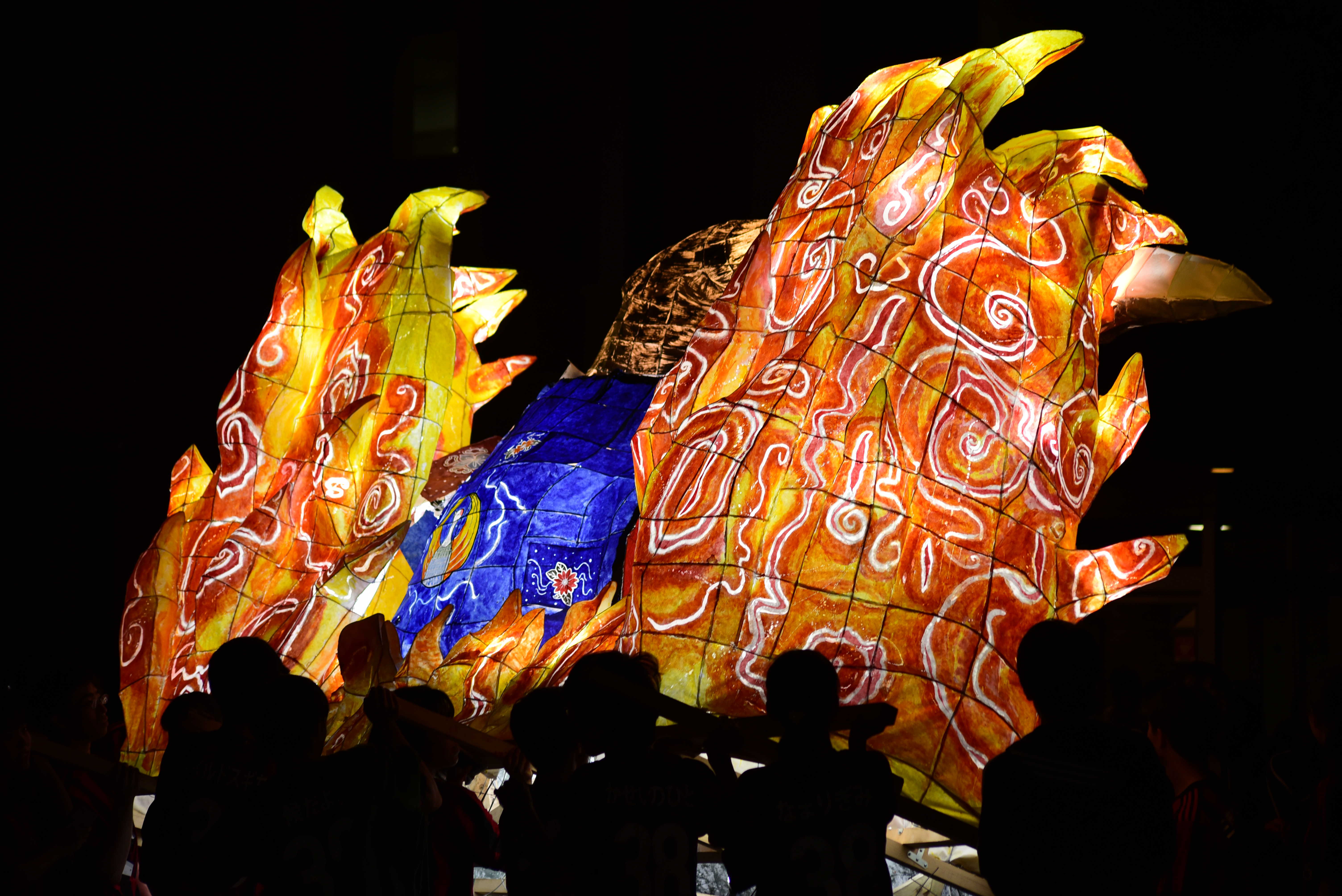 特に配色が素晴らしいと思っていて、内側には暗い寒色系の色、外側に明るい暖色系の色を持ってきているので、内側は引き締めつつも全体では大きく見せることに成功しています。 暗い色もただ暗くするだけでは形がわからなくなってしまうので、きちんとロウ点を打っていたり明るい柄を入れていたりとよく工夫されています。さらに炎がバックにあるので体の輪郭もよくわかります。 針金も不自然なところはないですし、電飾もよく光っていました。 あともう一つ「おお」と思ったのが、ギャラリーの写真を見るとわかりますが、このクラスは審査員席で前に傾けていて、審査員に対して覆いかぶさるような演出をしていました。青森ねぶた祭りを観に行くとよくわかりますが前に傾けられると迫力が倍増するんですよね。あとは北高行灯の奥行き足りなさすぎ問題に対してこの手を使うと高さを奥行きとして使うことができるので、よさそうです。 ただ、これけっこう危ない (最悪角材が折れたりパーツが外れたりして審査員席に落ちる) と思うので後輩のみなさんはやらないほうがいいと思います。現段階では禁止されていない?かもしれませんがもしかしたら今後禁止されるかも。