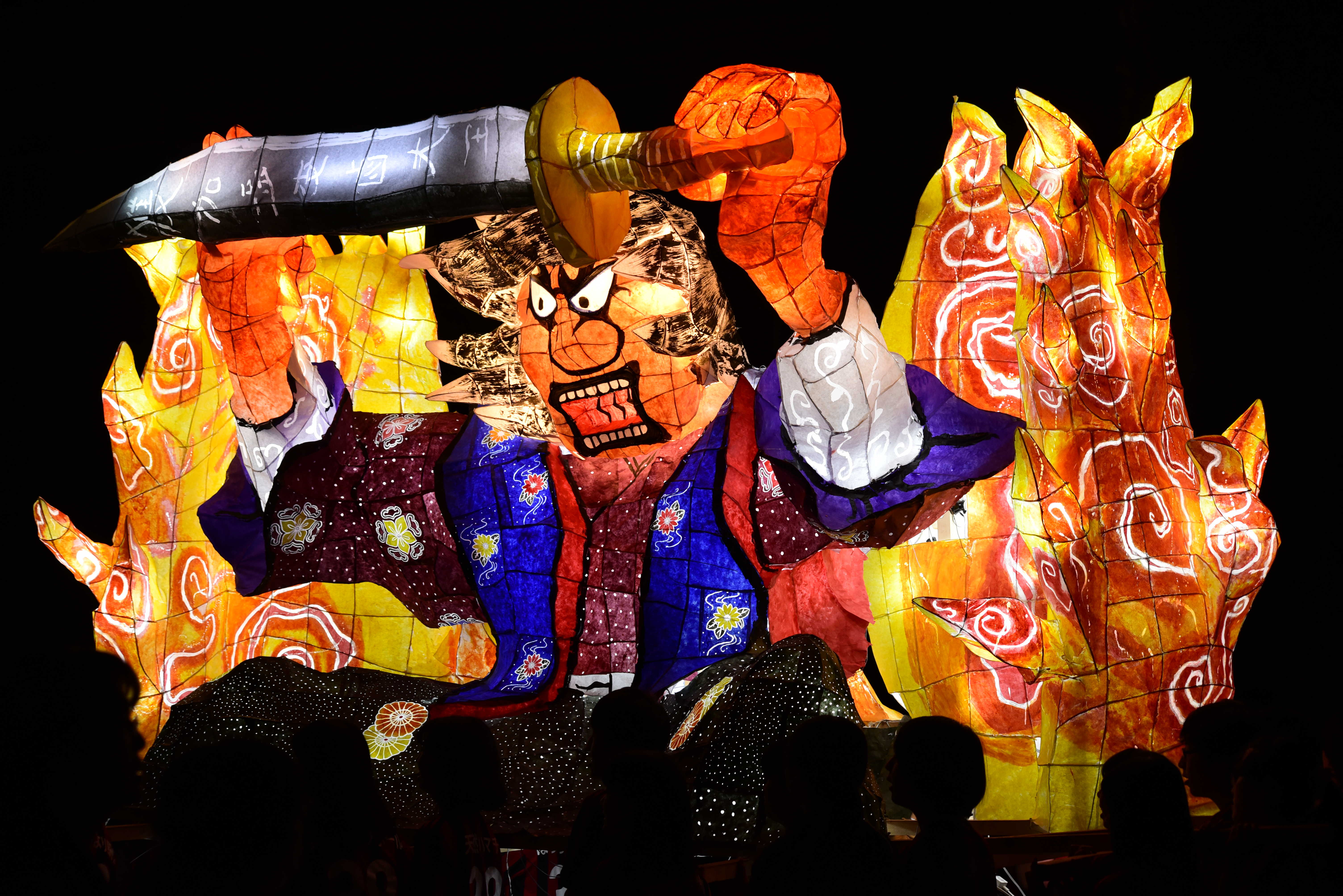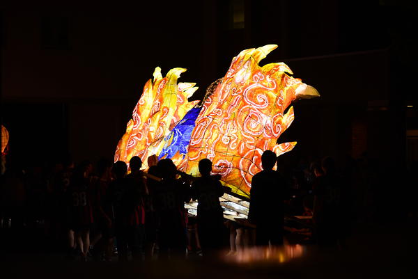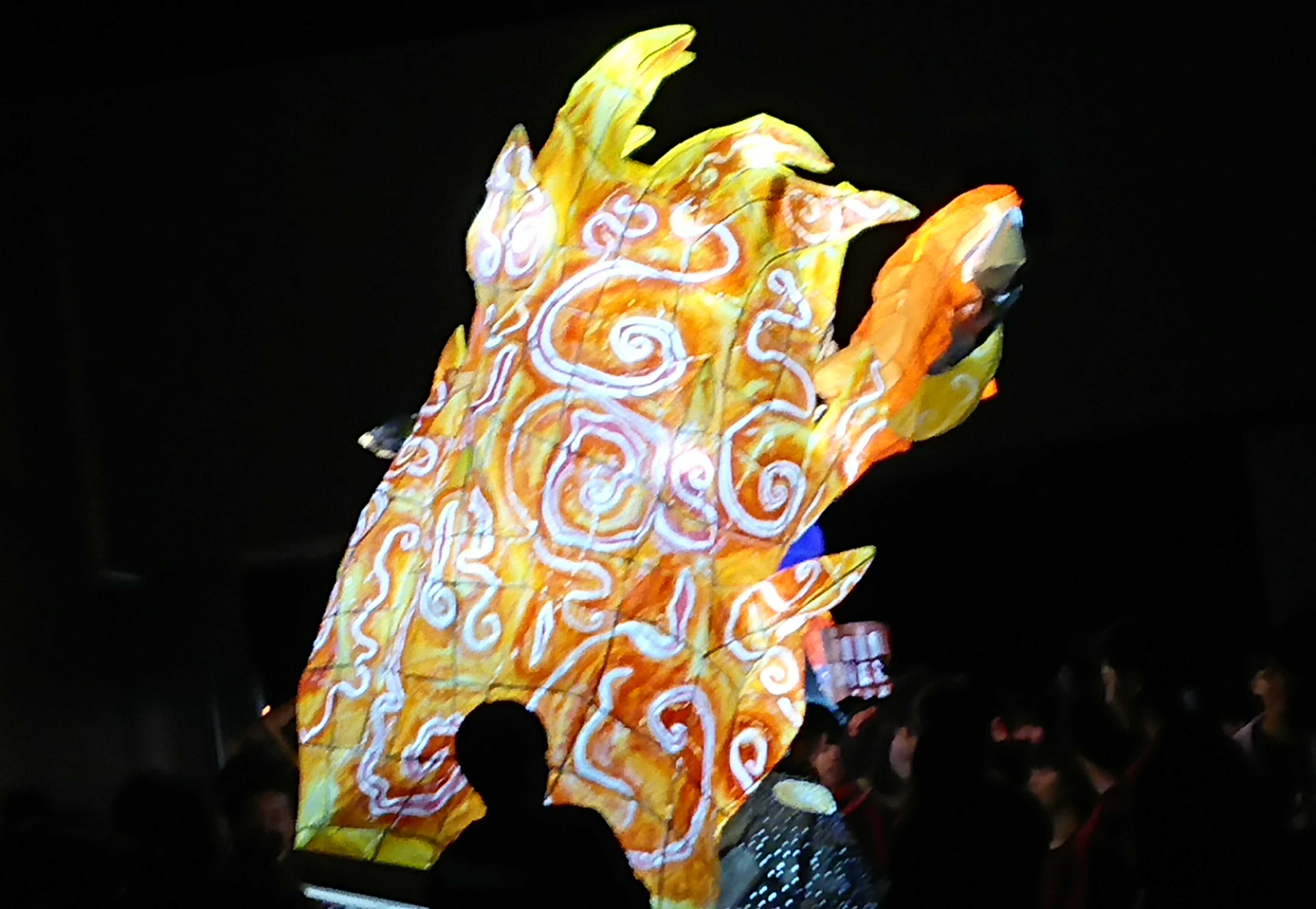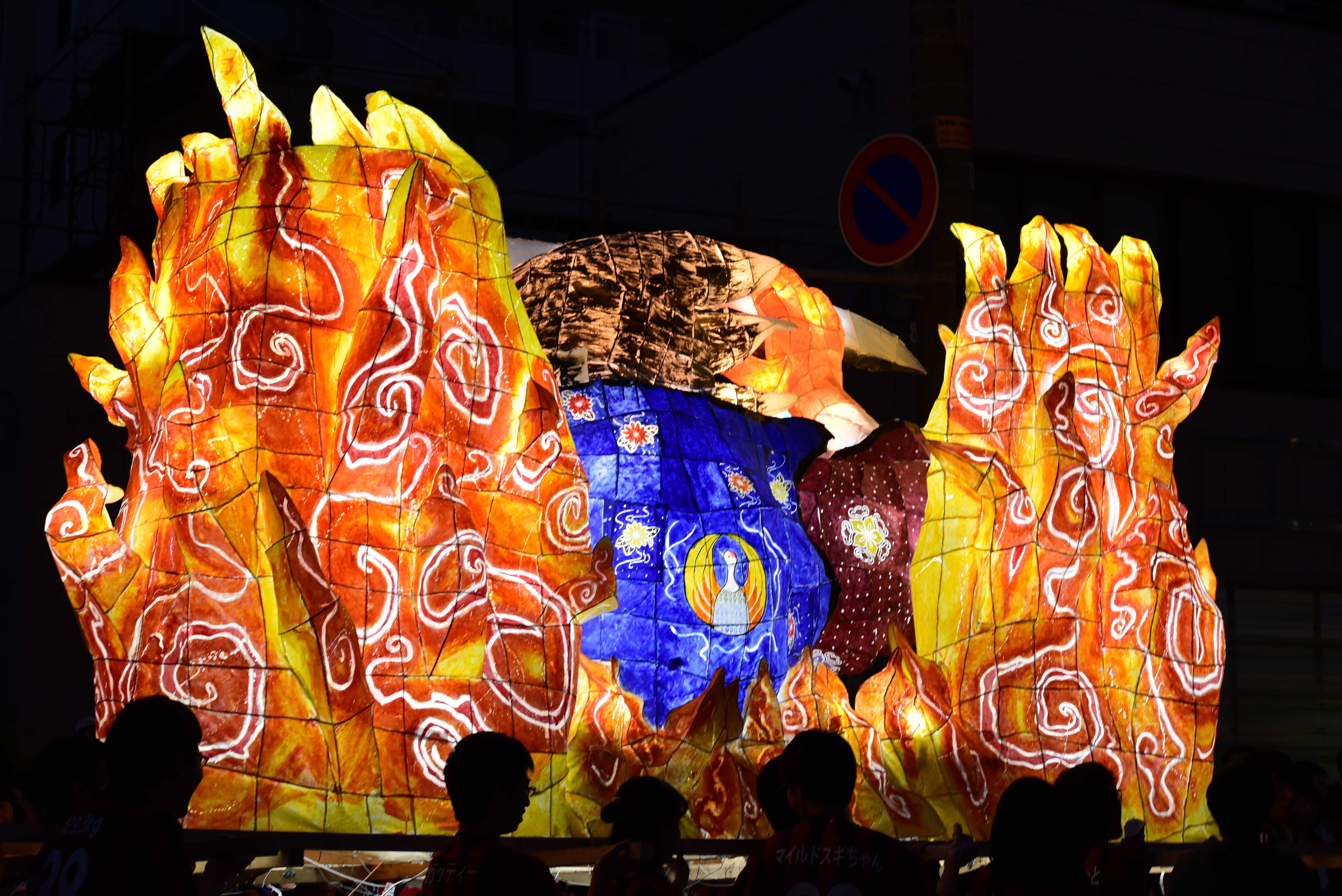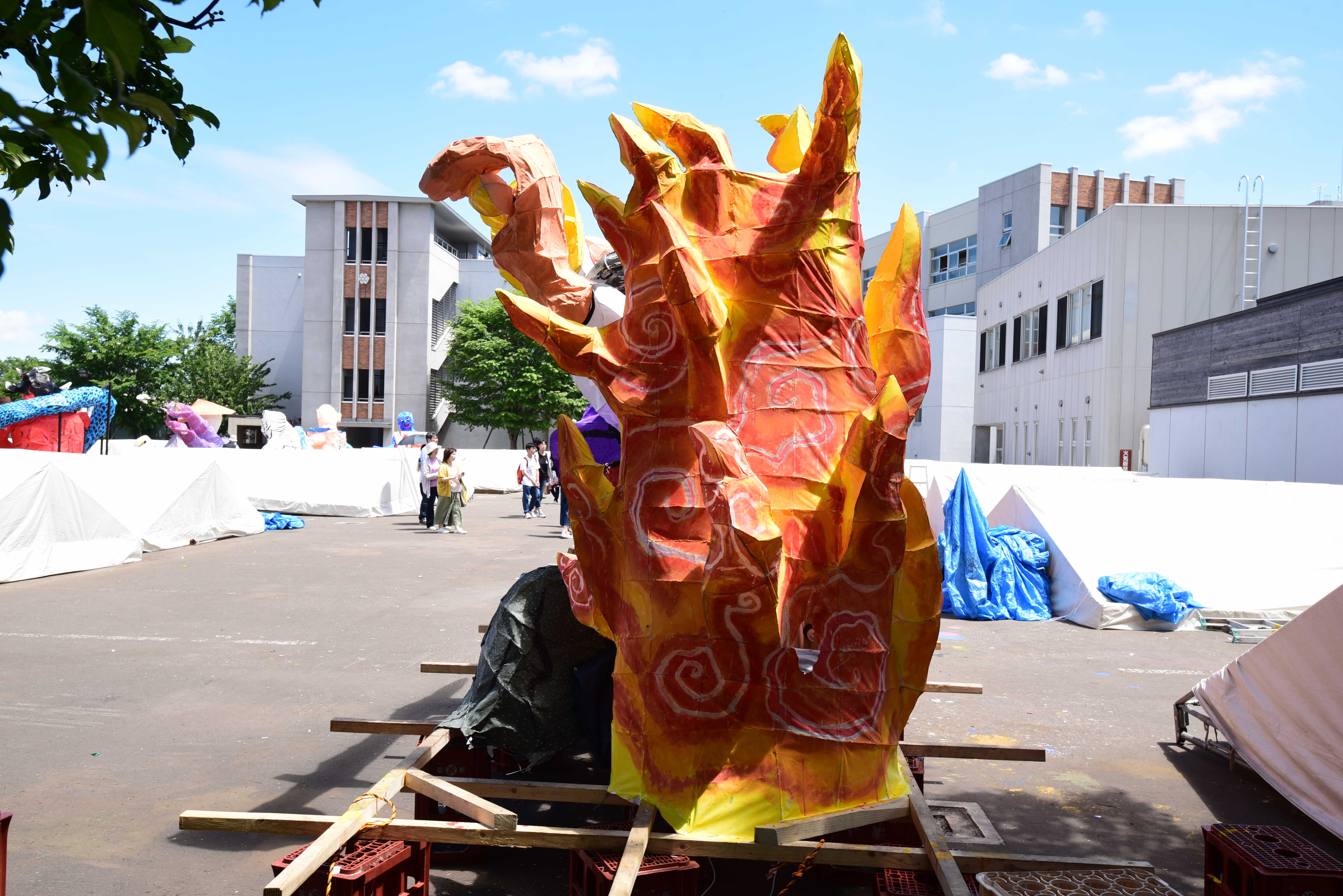 特に配色が素晴らしいと思っていて、内側には暗い寒色系の色、外側に明るい暖色系の色を持ってきているので、内側は引き締めつつも全体では大きく見せることに成功しています。 暗い色もただ暗くするだけでは形がわからなくなってしまうので、きちんとロウ点を打っていたり明るい柄を入れていたりとよく工夫されています。さらに炎がバックにあるので体の輪郭もよくわかります。 針金も不自然なところはないですし、電飾もよく光っていました。 あともう一つ「おお」と思ったのが、ギャラリーの写真を見るとわかりますが、このクラスは審査員席で前に傾けていて、審査員に対して覆いかぶさるような演出をしていました。青森ねぶた祭りを観に行くとよくわかりますが前に傾けられると迫力が倍増するんですよね。あとは北高行灯の奥行き足りなさすぎ問題に対してこの手を使うと高さを奥行きとして使うことができるので、よさそうです。 ただ、これけっこう危ない (最悪角材が折れたりパーツが外れたりして審査員席に落ちる) と思うので後輩のみなさんはやらないほうがいいと思います。現段階では禁止されていない?かもしれませんがもしかしたら今後禁止されるかも。