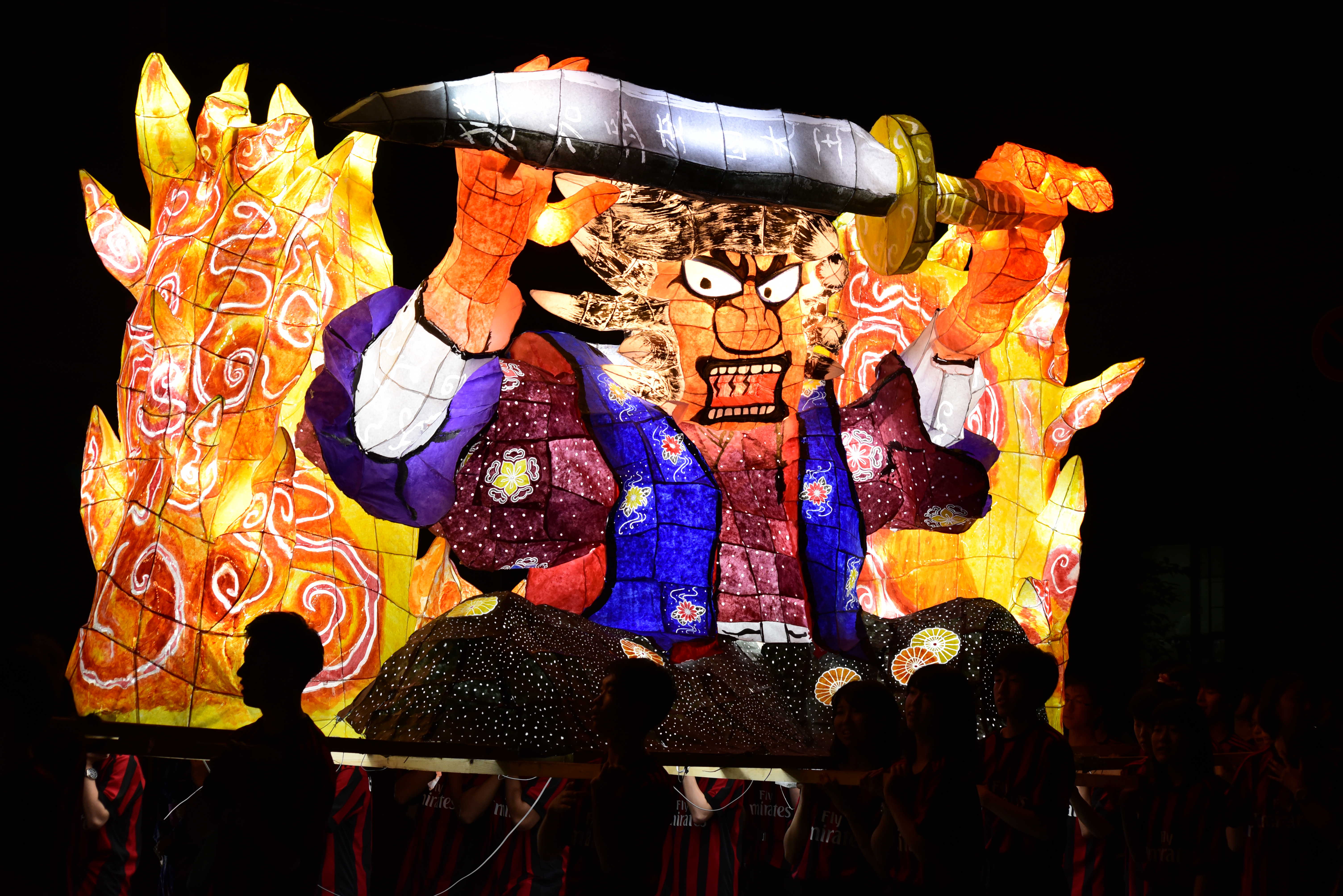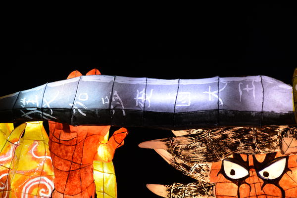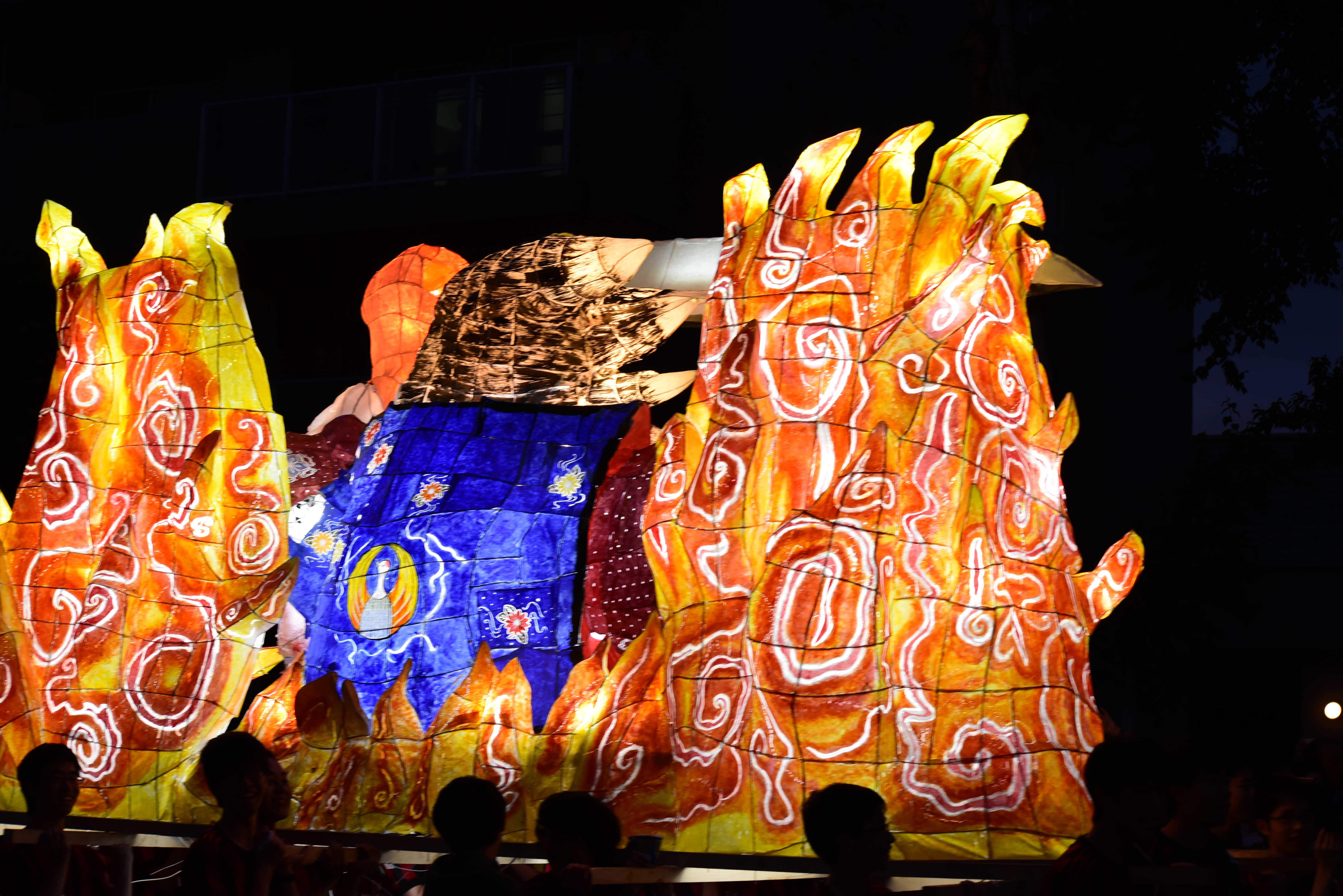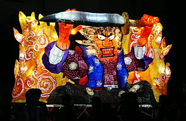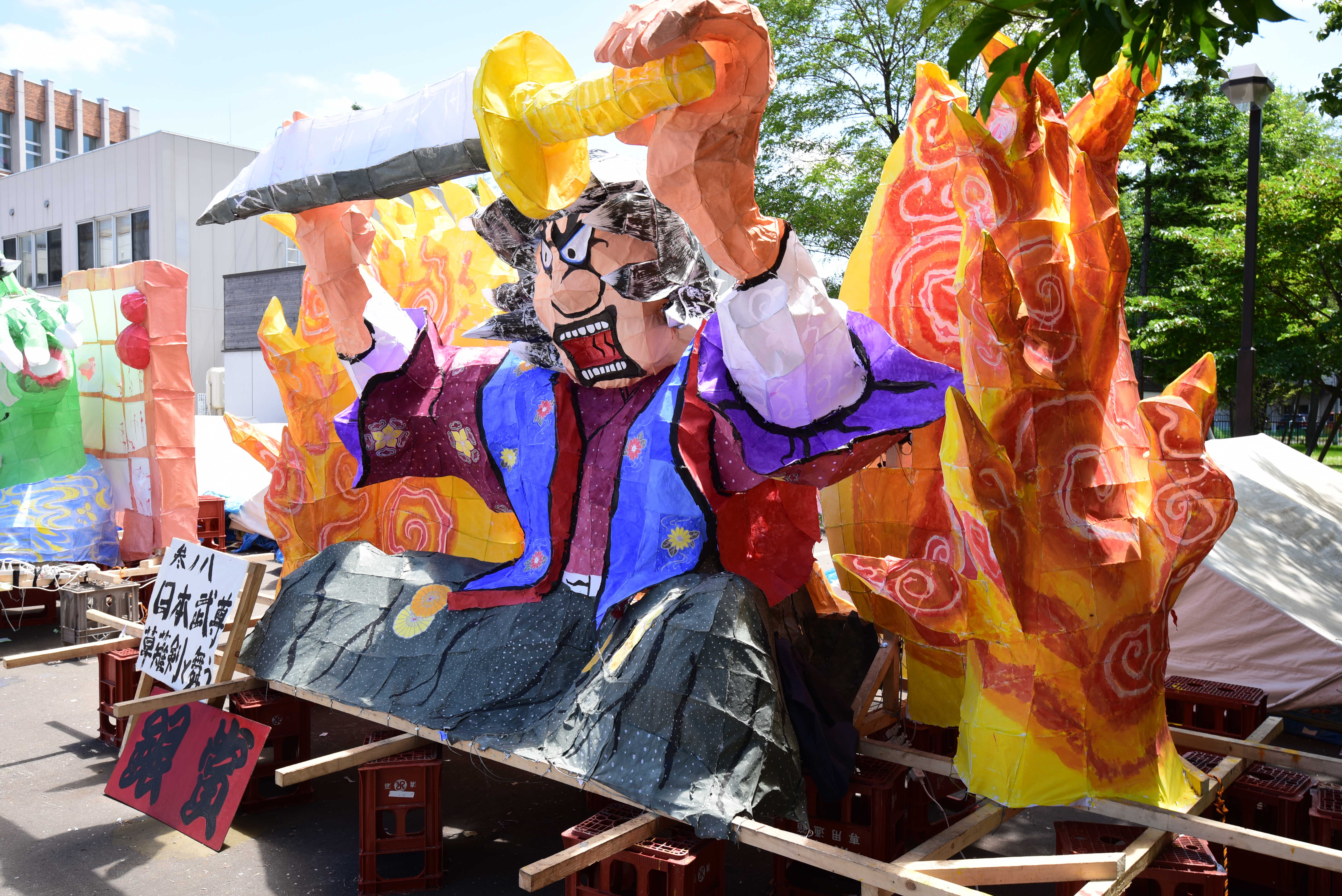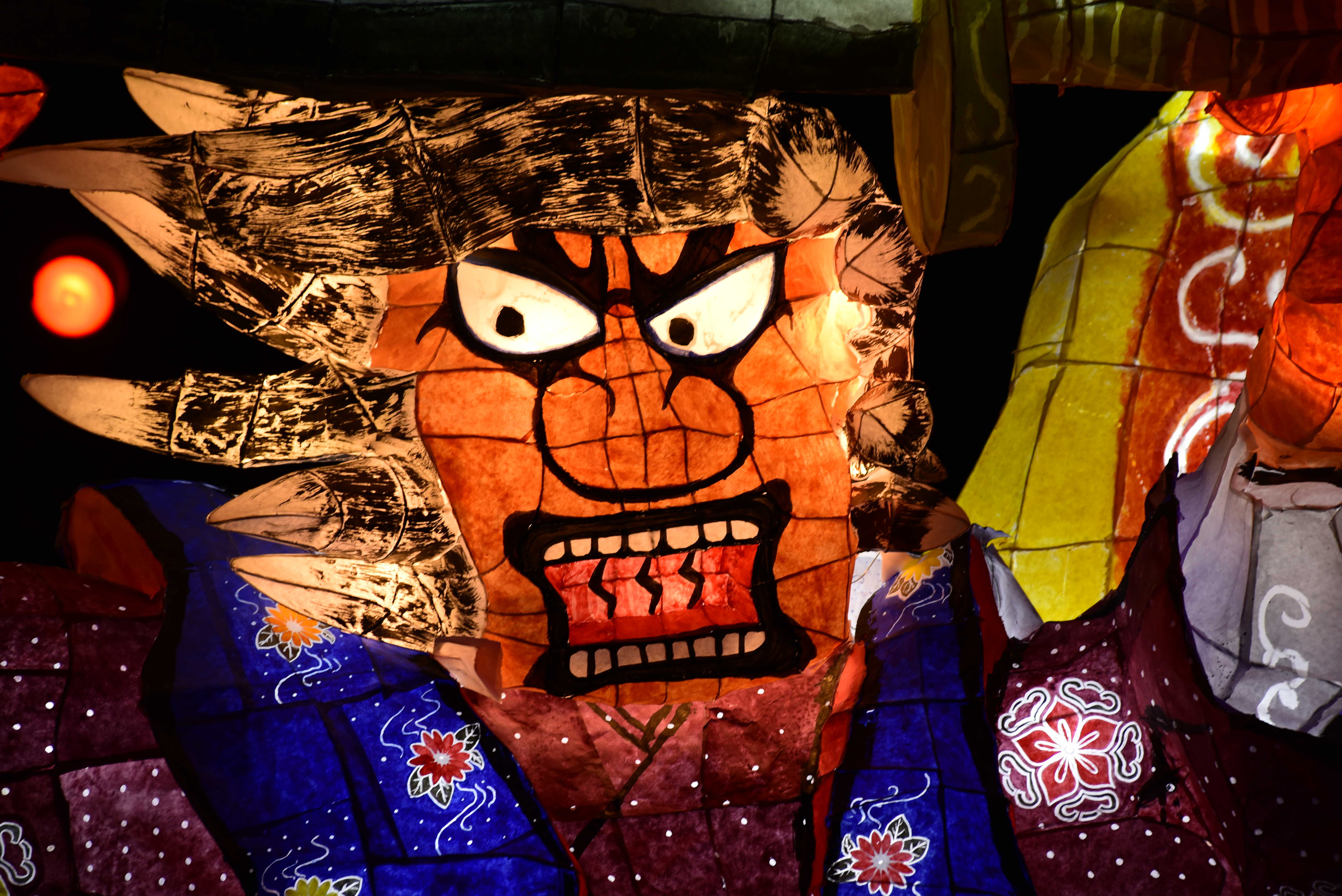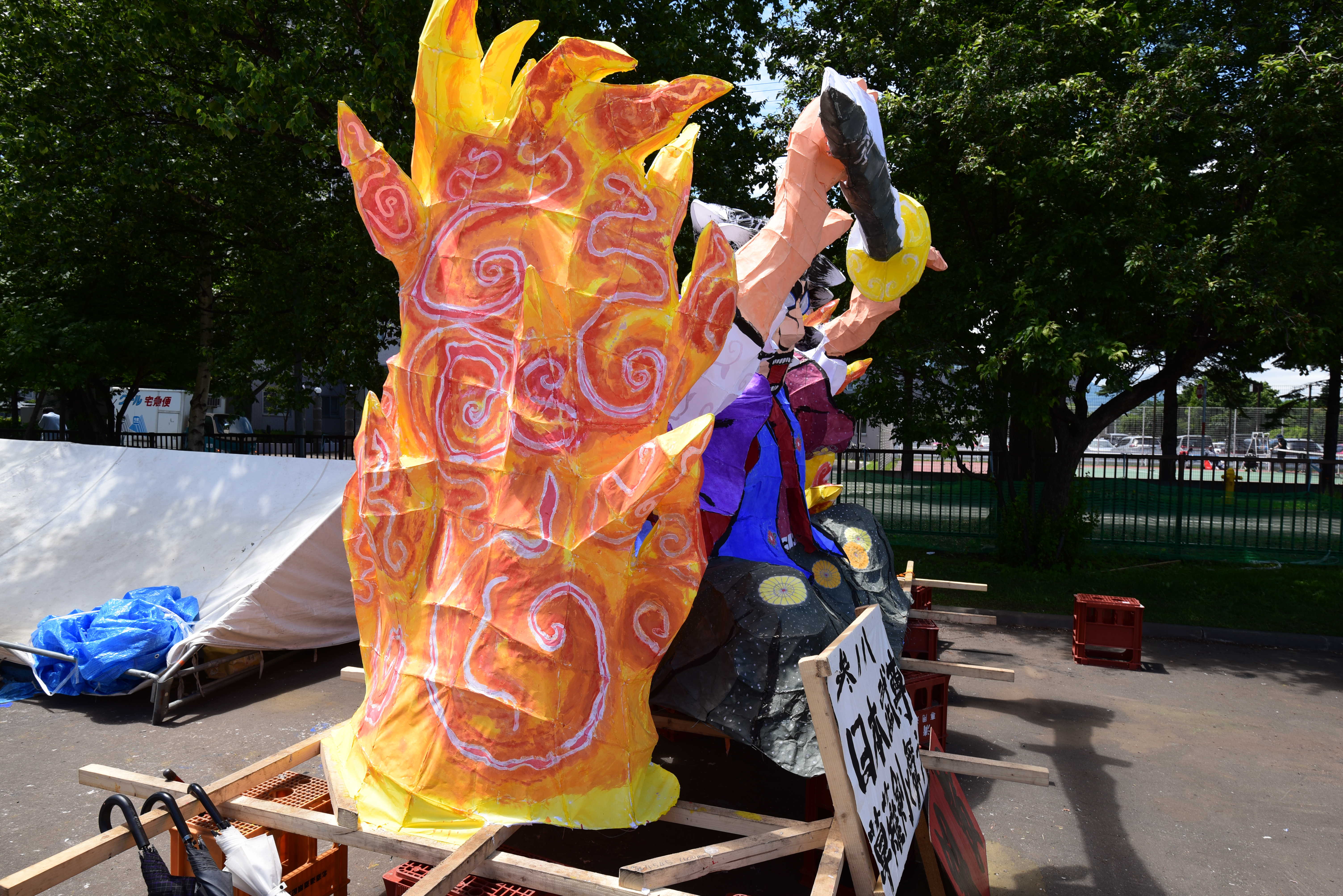 特に配色が素晴らしいと思っていて、内側には暗い寒色系の色、外側に明るい暖色系の色を持ってきているので、内側は引き締めつつも全体では大きく見せることに成功しています。 暗い色もただ暗くするだけでは形がわからなくなってしまうので、きちんとロウ点を打っていたり明るい柄を入れていたりとよく工夫されています。さらに炎がバックにあるので体の輪郭もよくわかります。 針金も不自然なところはないですし、電飾もよく光っていました。 あともう一つ「おお」と思ったのが、ギャラリーの写真を見るとわかりますが、このクラスは審査員席で前に傾けていて、審査員に対して覆いかぶさるような演出をしていました。青森ねぶた祭りを観に行くとよくわかりますが前に傾けられると迫力が倍増するんですよね。あとは北高行灯の奥行き足りなさすぎ問題に対してこの手を使うと高さを奥行きとして使うことができるので、よさそうです。 ただ、これけっこう危ない (最悪角材が折れたりパーツが外れたりして審査員席に落ちる) と思うので後輩のみなさんはやらないほうがいいと思います。現段階では禁止されていない?かもしれませんがもしかしたら今後禁止されるかも。