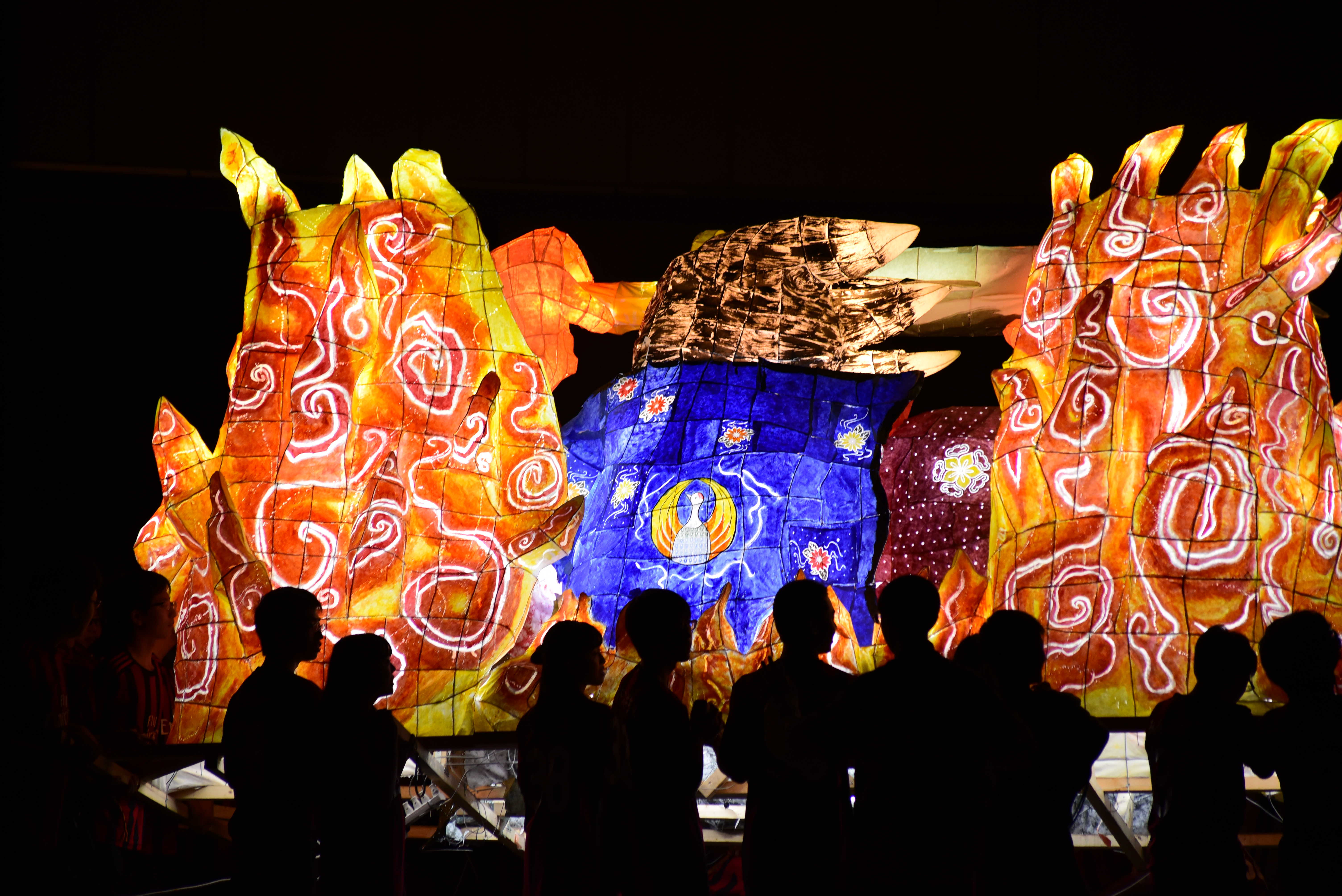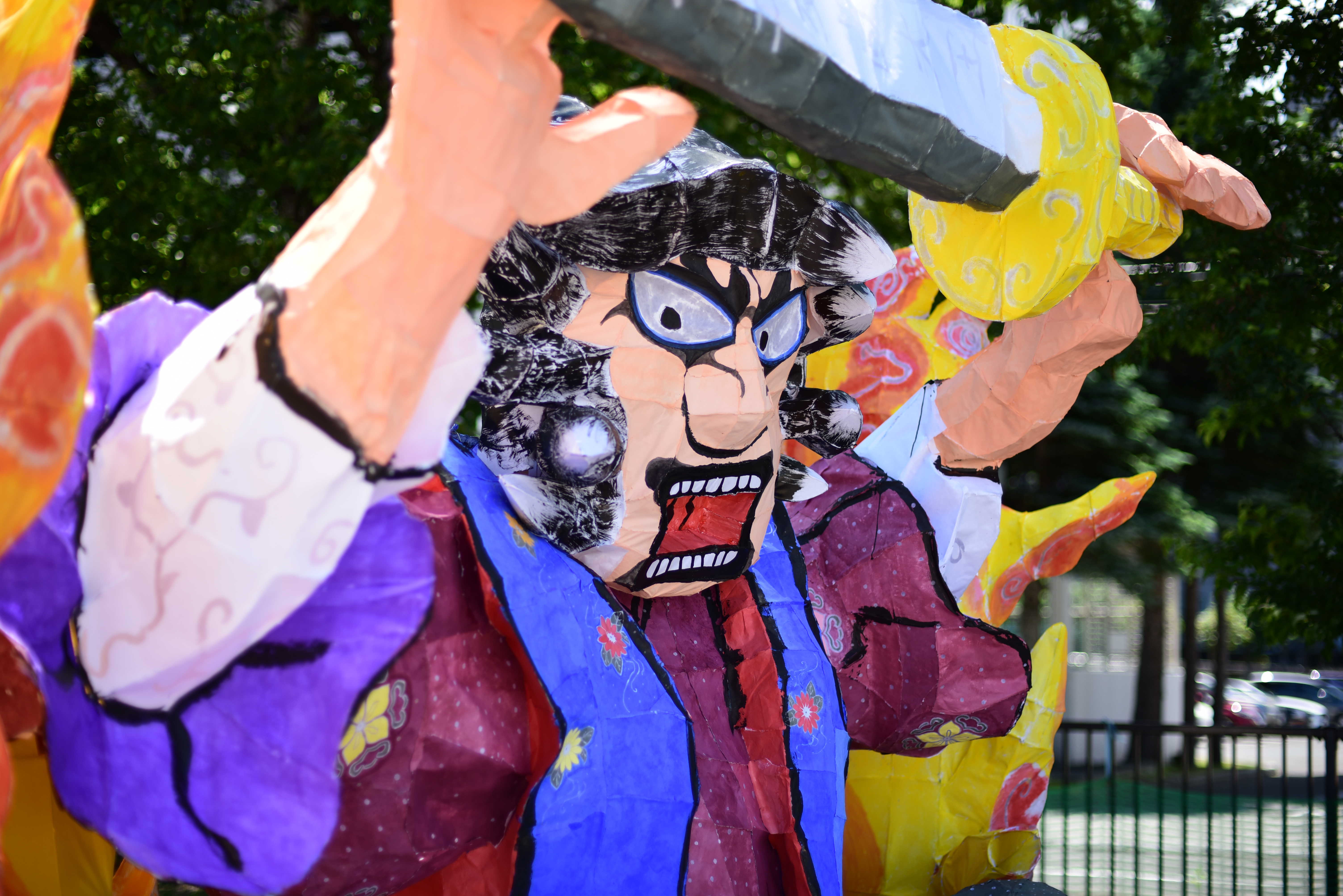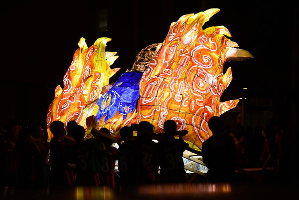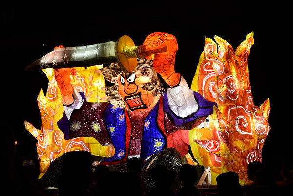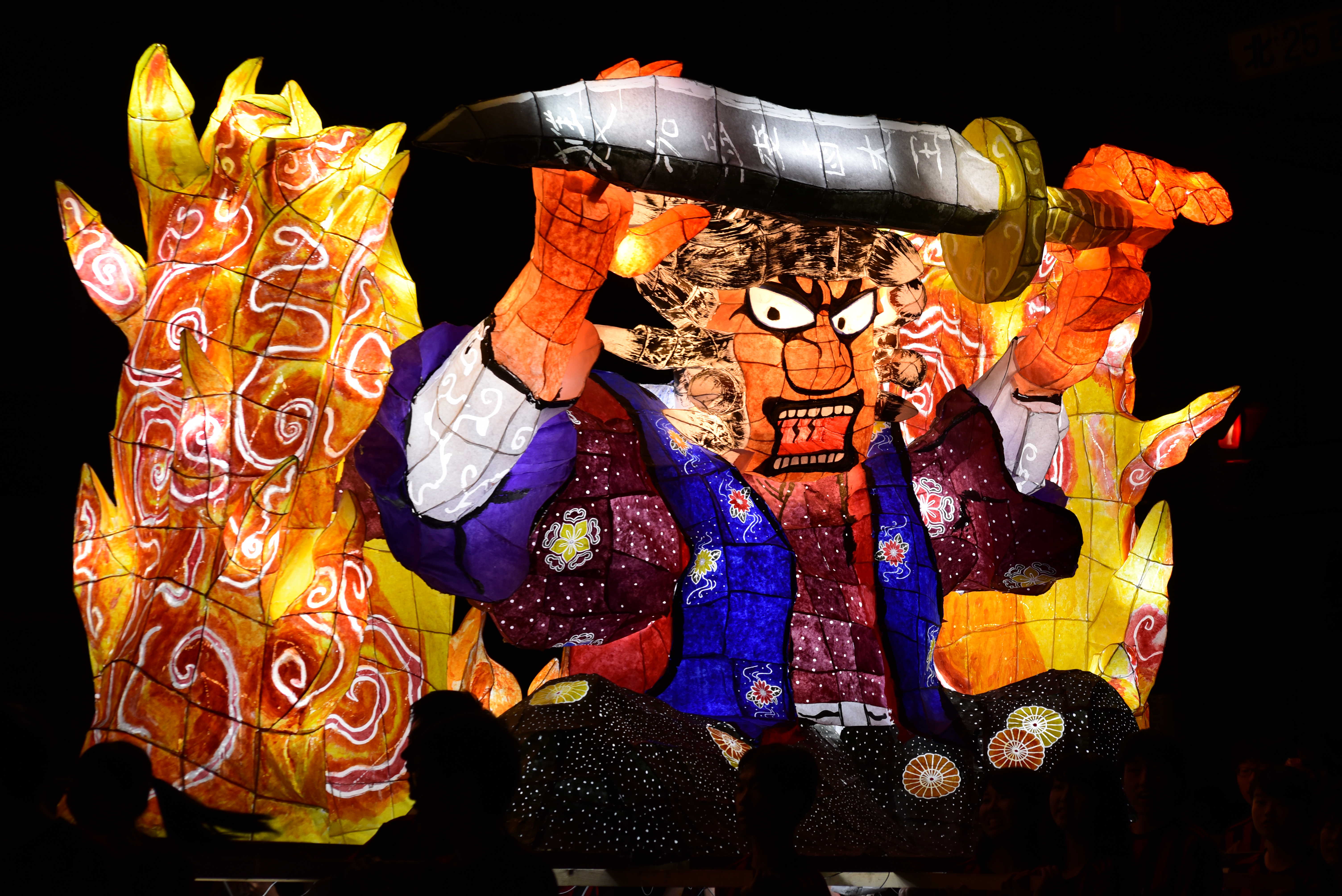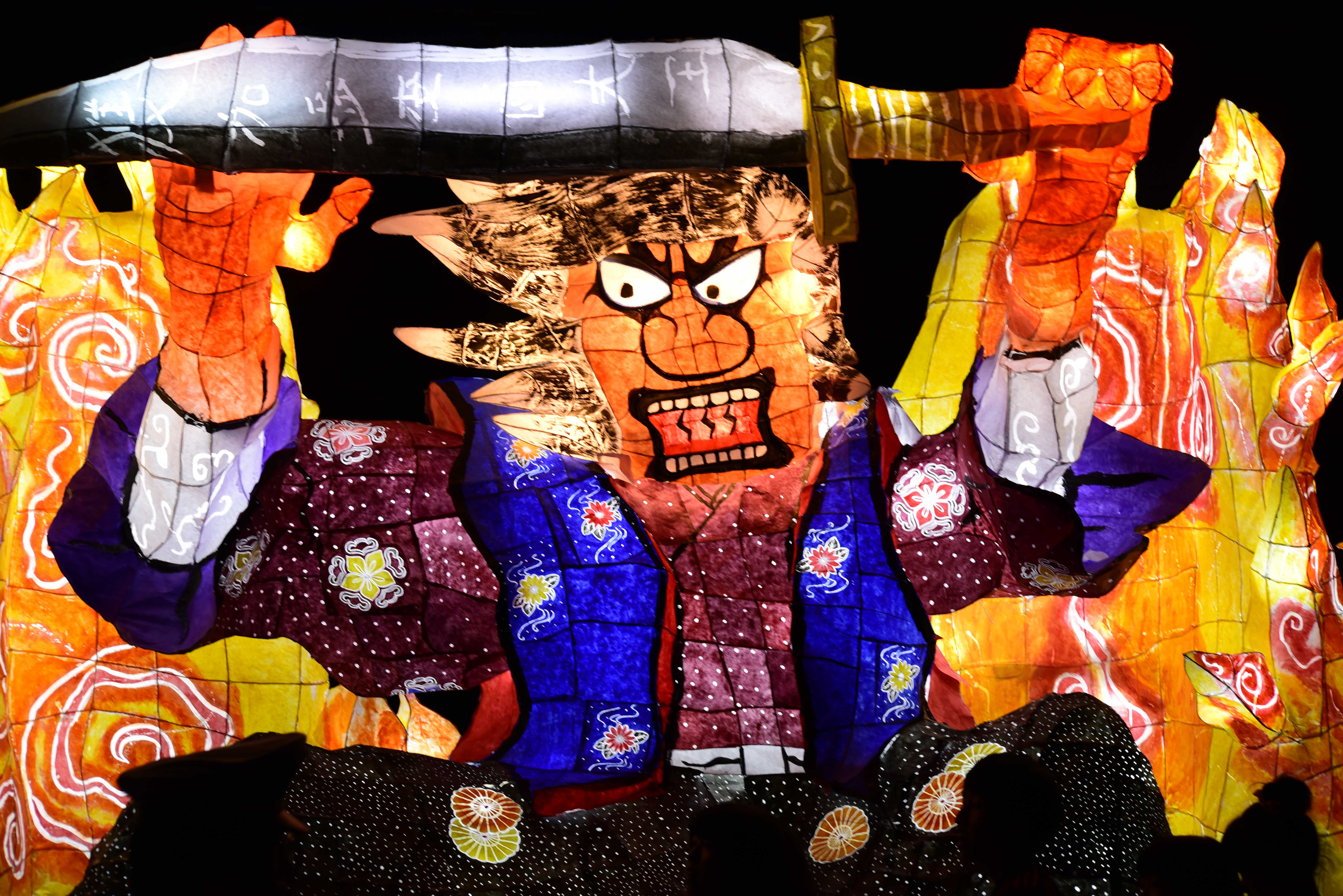 特に配色が素晴らしいと思っていて、内側には暗い寒色系の色、外側に明るい暖色系の色を持ってきているので、内側は引き締めつつも全体では大きく見せることに成功しています。 暗い色もただ暗くするだけでは形がわからなくなってしまうので、きちんとロウ点を打っていたり明るい柄を入れていたりとよく工夫されています。さらに炎がバックにあるので体の輪郭もよくわかります。 針金も不自然なところはないですし、電飾もよく光っていました。 あともう一つ「おお」と思ったのが、ギャラリーの写真を見るとわかりますが、このクラスは審査員席で前に傾けていて、審査員に対して覆いかぶさるような演出をしていました。青森ねぶた祭りを観に行くとよくわかりますが前に傾けられると迫力が倍増するんですよね。あとは北高行灯の奥行き足りなさすぎ問題に対してこの手を使うと高さを奥行きとして使うことができるので、よさそうです。 ただ、これけっこう危ない (最悪角材が折れたりパーツが外れたりして審査員席に落ちる) と思うので後輩のみなさんはやらないほうがいいと思います。現段階では禁止されていない?かもしれませんがもしかしたら今後禁止されるかも。
